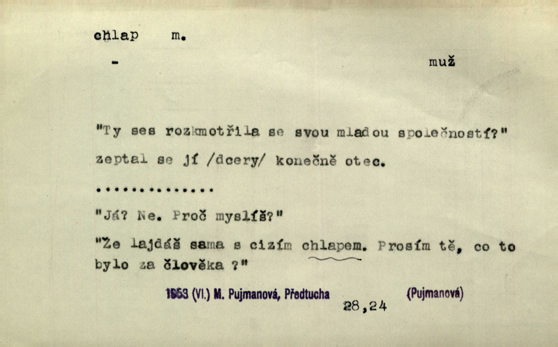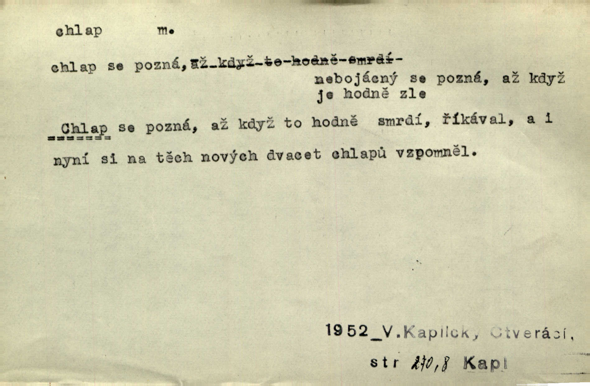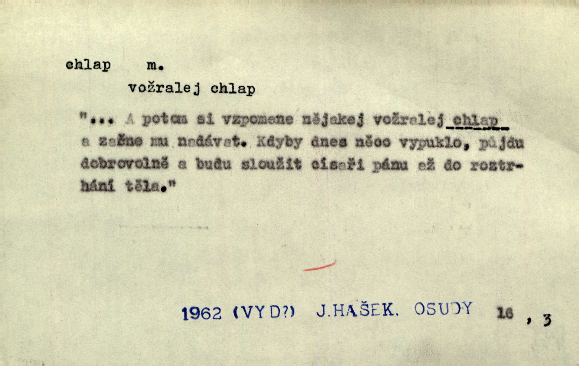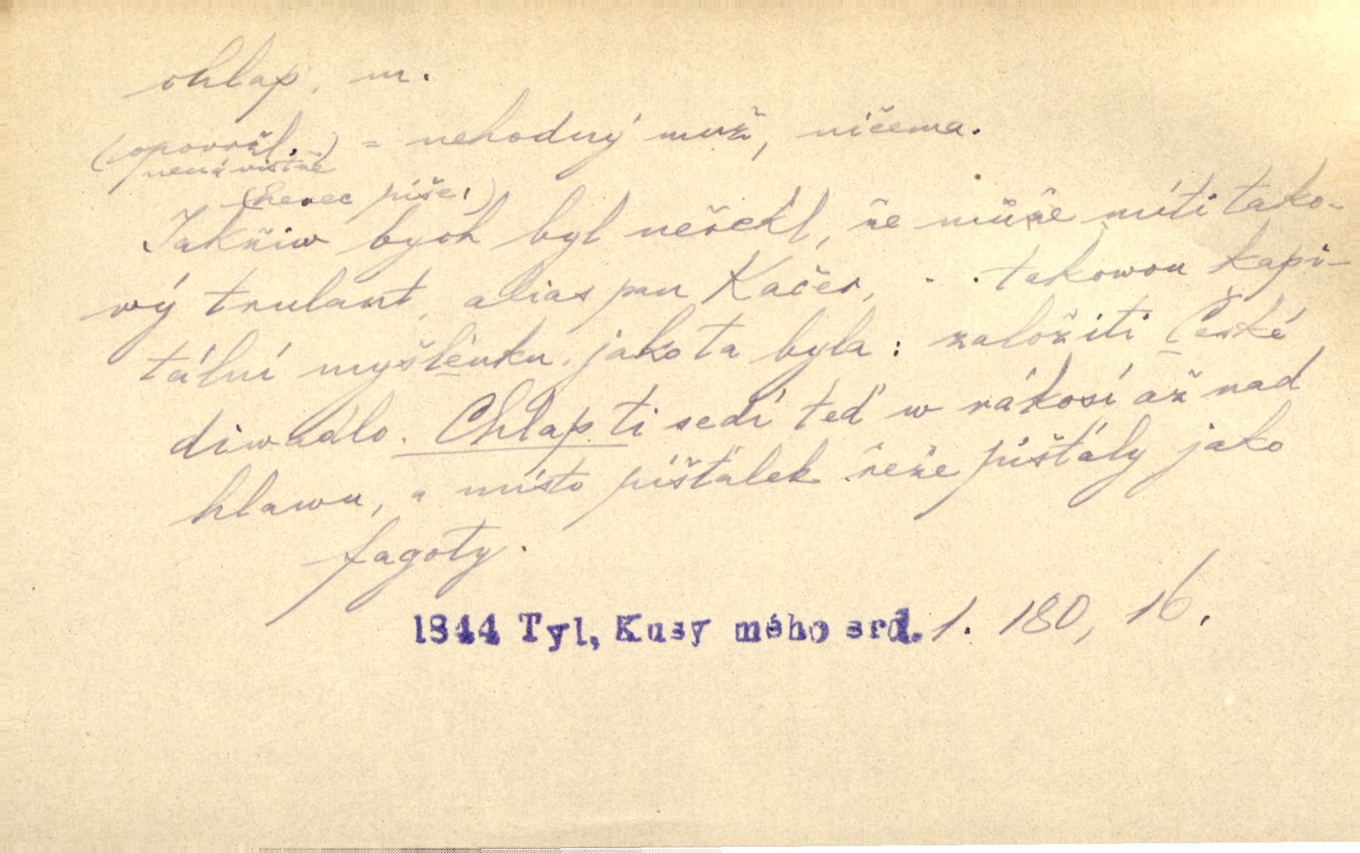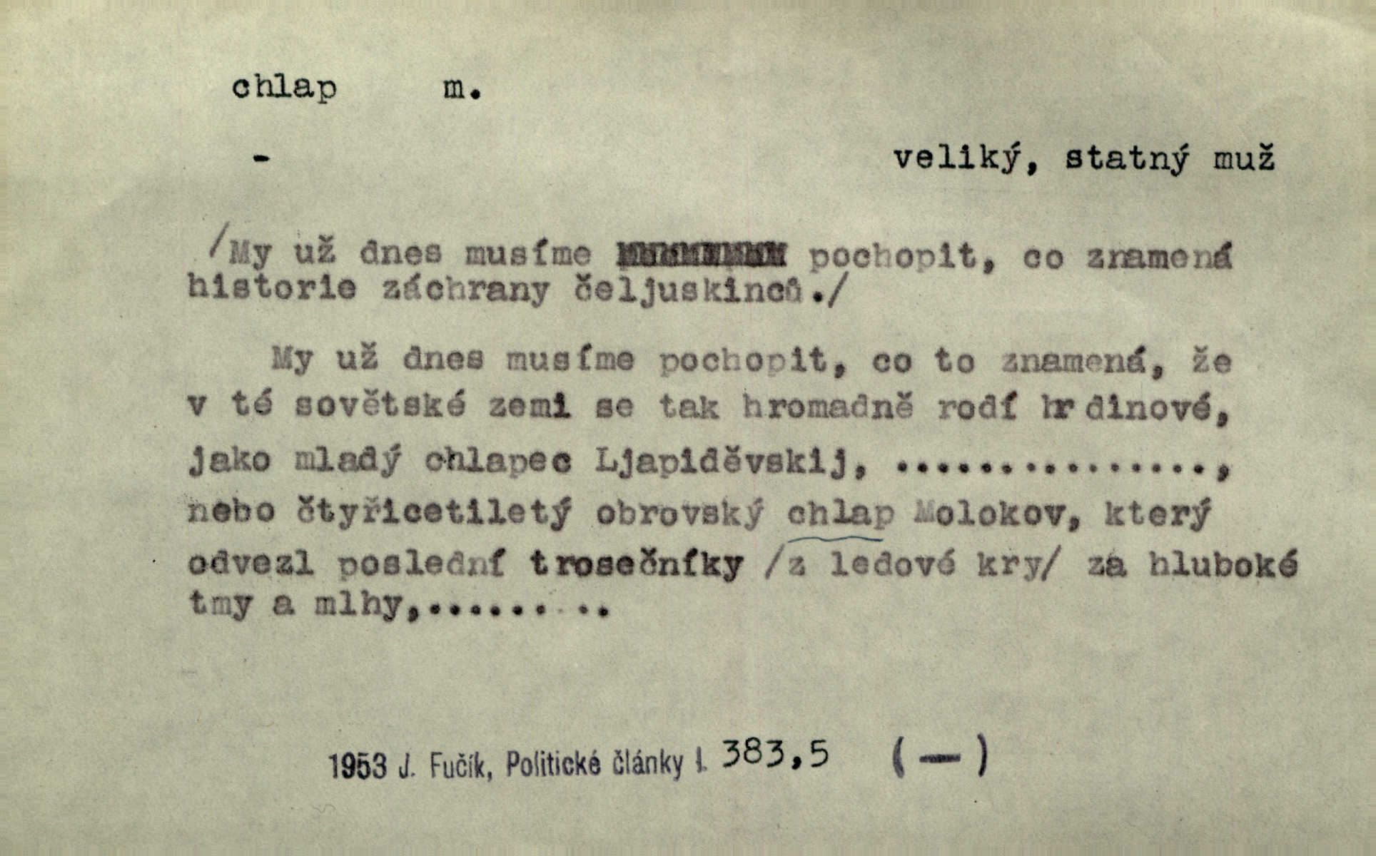 - chlap, -a m. lid. dospělý muž. Dívám se na tebe [Janošík na Ilčíka] a vidím, že už nejsi chlapec, ale chlap. Mah. „Za chlapa má síly,“ říkali o ní, když viděli, jak do vozů zvedá těžké kostky kamenné. Baar. Do světnice přihnala se bosá děvečka velká jako chlap. Jir. D Expr. buď pejor. (dareba, ničema a p.) n. hypok. (statný, velký n. řádný, hodný člověk; žert. i o zvířatech). Vem čert už trochu toho paše, ale to mě zlobí, jak ten chlap [pašerák] moh’ zmizet. Jir. Aspoň mně k vůli měl bys, pane nadporučíku, tohohle chlapa [neposlušného vojáka] jednou přivázat. Šrám. Kdopak by byl takový dareba chlap! Hál. Thámová pořád ještě má v hlavě toho panáka, Amlinga, slabého herce, mizerného chlapa. Jir. Truhlář stavby a nábytku, chlap jako hora a při tom cvičitel „Sokola“. Kam. Není už zrovna hošek [ženich], ale fešák, dobrý chlap. Já jsem chlap dobrá, ale umím bejt taky neřád. Čap. Ch. To mne těší, že někomu se po mně, starém chlapu, stýská! Šmil. Chlap je to řádný [chycený sumec] — do centnýře nebude mnoho scházet. Leg. Ten [špaček] je pitvora, ale jináč dobrý chlap, nasměju se mu. D Expr. mužský. Do kavárny jsi chodila tančit, jen aby ses tam mohla slízat s chlapy. Nor. D Dial. ženatý muž. Chlapi postávali pohromadě, neboť měli namířeno do hospody, svobodní laškovali stranou. Herb. D Arch. poddaný, nevolník. Národ dělil se vůbec na svobody a chlapy, čili pány a parobky. Pal. Blýská po jhu zašlém oko chtivé zpět, po nevolné zemi s pány, chlapy. Čech.