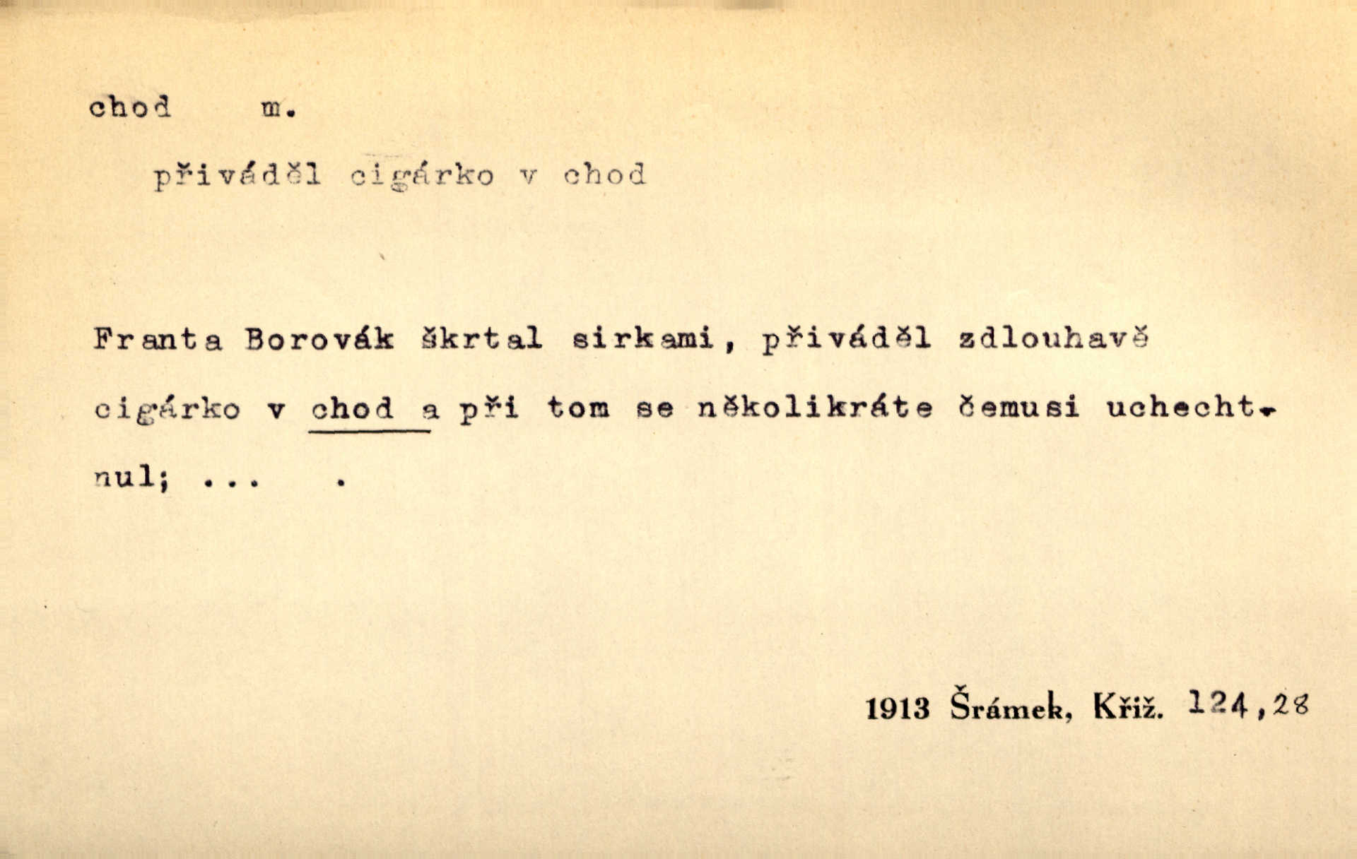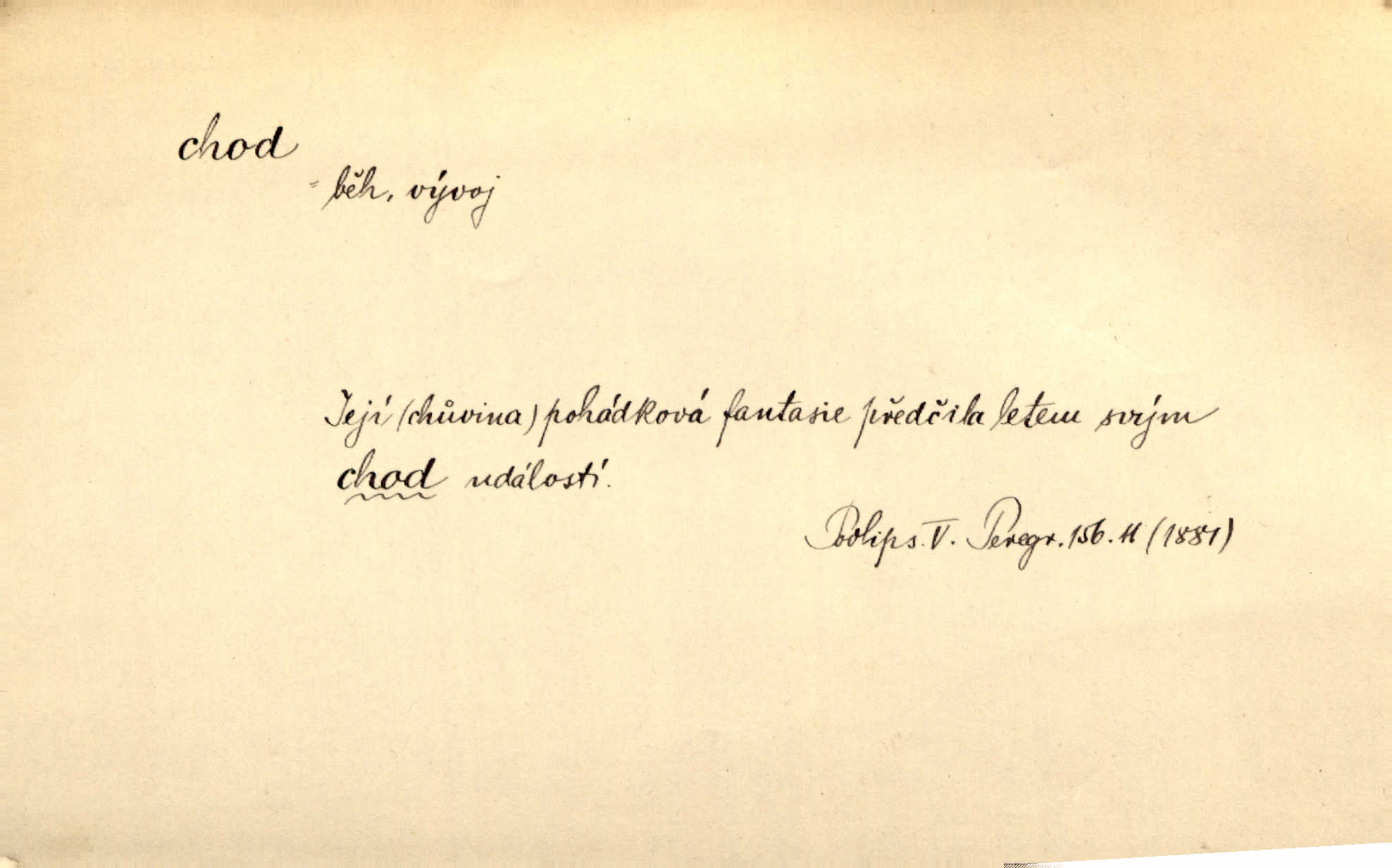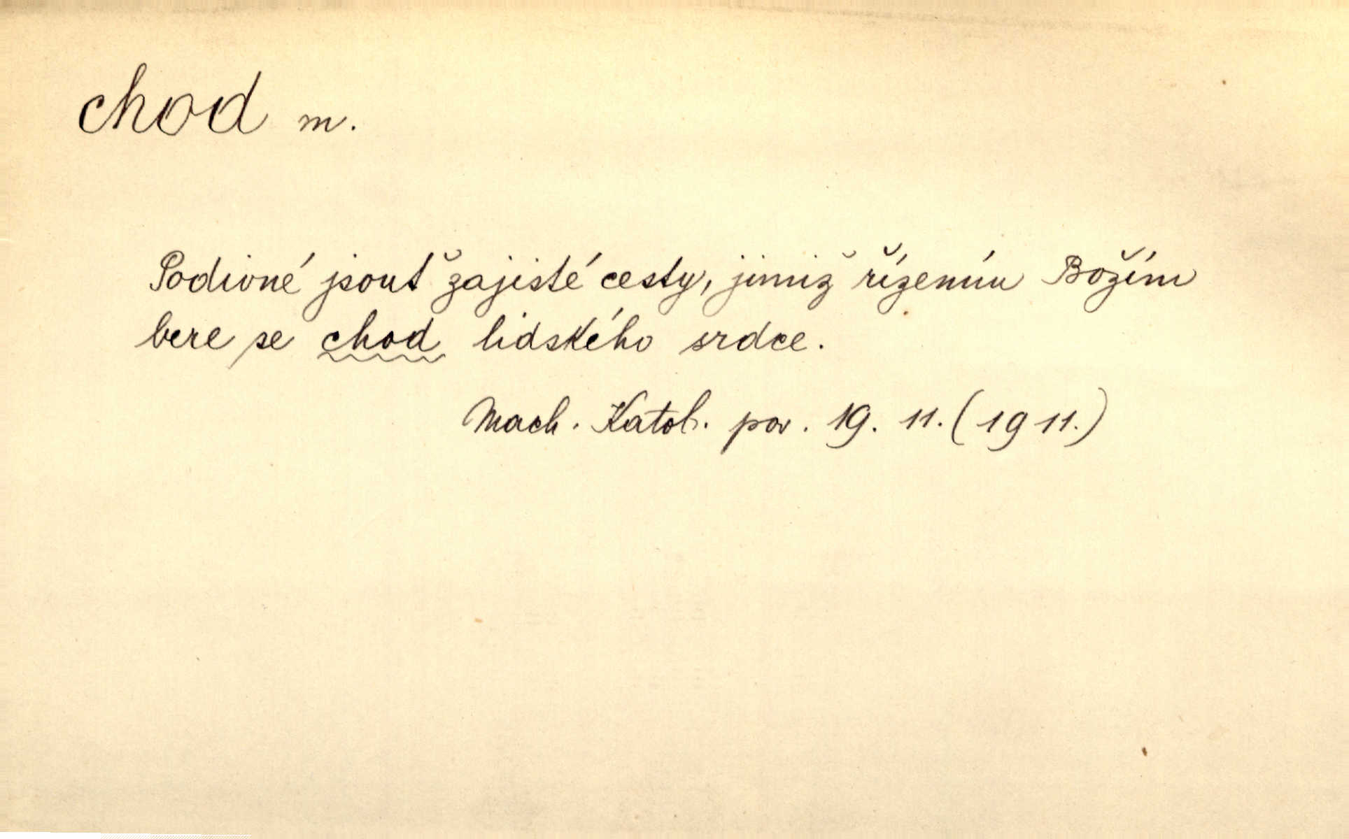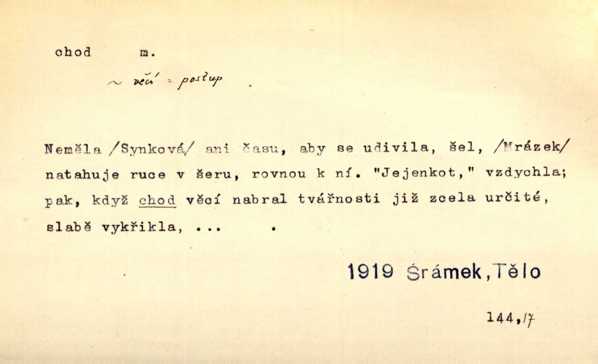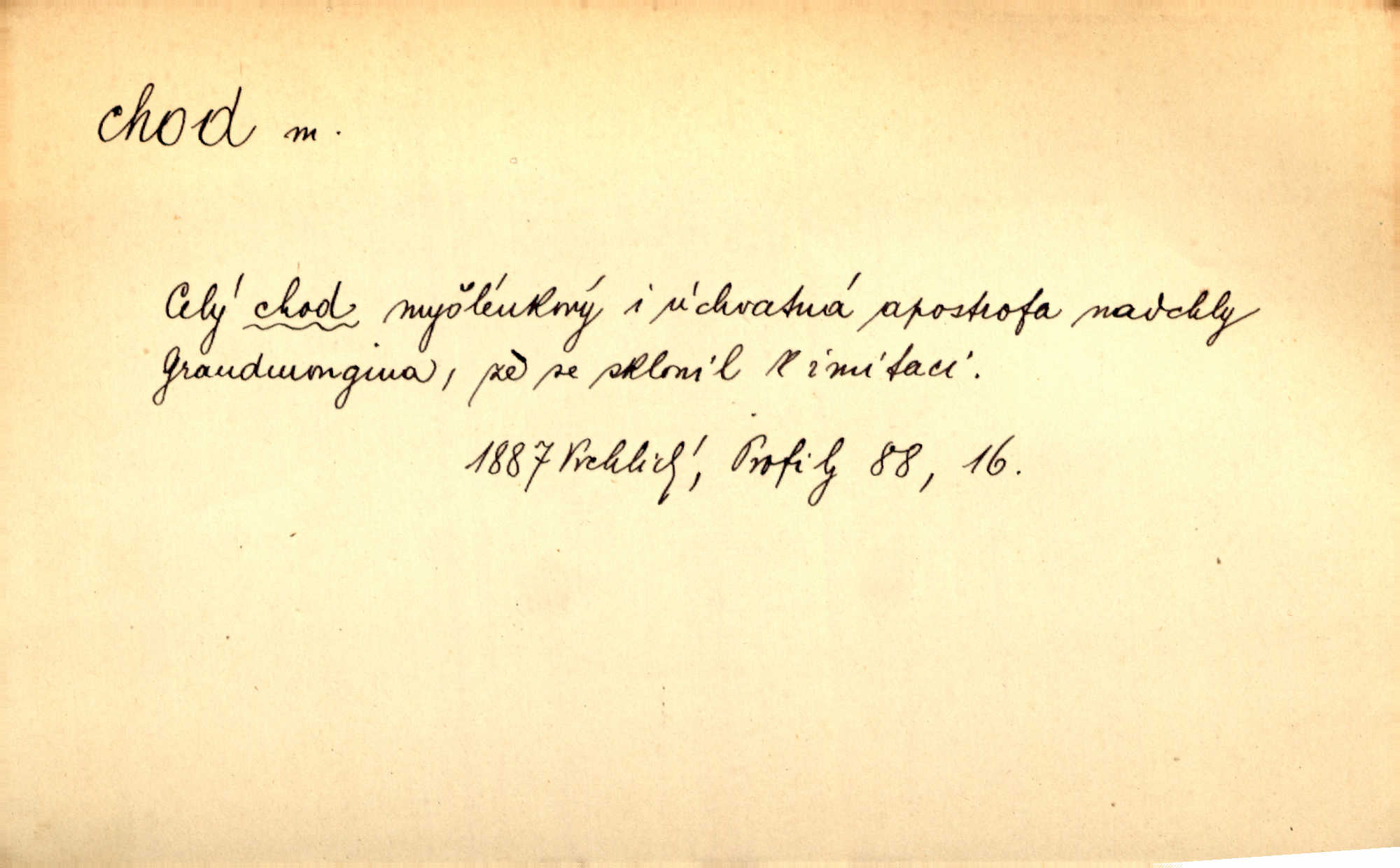 - chod, -u m. dělání kroků při pohybu s místa na místo, chůze. Potácivý chod. V. Mrš. Všichni v tomto sanatoriu mají neslyšný chod. Lang. Klátivé ruce jeho houpaly se při chodu kolem těla. Ner. Po chodu a po řeči poznáš člověka. Přísl. D Mysl. chody pl. cestičky zvěře, ochozy, spády. D jinaký pohyb s místa na místo. Rozmyslný a opatrný „chod“ [štiky]‚ její mžouravé oko, upřené na kořist. Mah. Sedě ve voze, kolébán jsa lehkým chodem, zamyslil se na chvíli. Šal. Bloudil s místa na místo, proklínaje lenivý chod slunce. Pfleg. D pohyb věci na místě, činnost, běh. Staré hodiny šly svým rozvážným chodem jako člověk kráčející ne za povinností, ale moudrou procházkou. Mach. Precisnost stavby [velocipédu] — chod — jistota — velkolepé! Štech. Chod motoru, vozidla, kulometu a p. Stroj je v chodu. Uvésti do chodu. Chod vysoké pece. D průběh, postup, vývoj n. i stav něčeho. [Obhájce] se ohrazuje proti suggestivním vlivům pana zástupce na chod přelíčení. Čap. Ch. Za okolností vybočujících z obvyklého chodu života. Herrm. Když chod věcí nabral tvářnosti již zcela určité, slabě vykřikla. Šrám. Věc je v chodu. Šrám. Pátral po truhlářské dílně, která by byla v dobrém chodu. Baar. Meteor. chod srážek. Tech. chod závitu (šroubu) počet ovinutí závitovitých profilů na jedno stoupání. D jeden člen, jedna část z nějakého postupu, z řady věcí po sobě. Naše milé obecenstvo je jako posvícenský host, jenom hodně mnoho chodů. Klost. Jídelní lístek o pěti chodech. Kun.