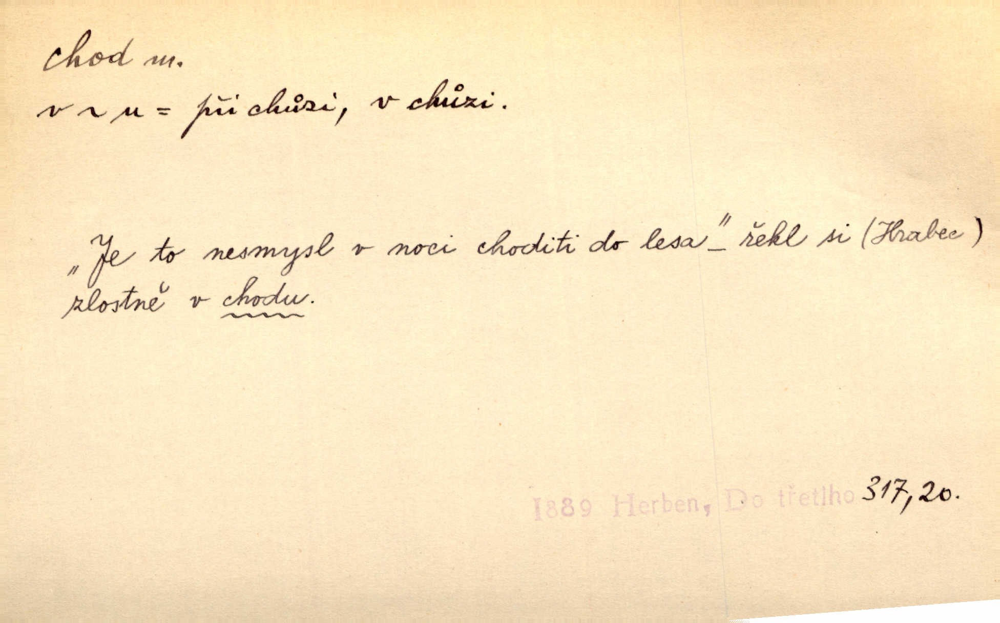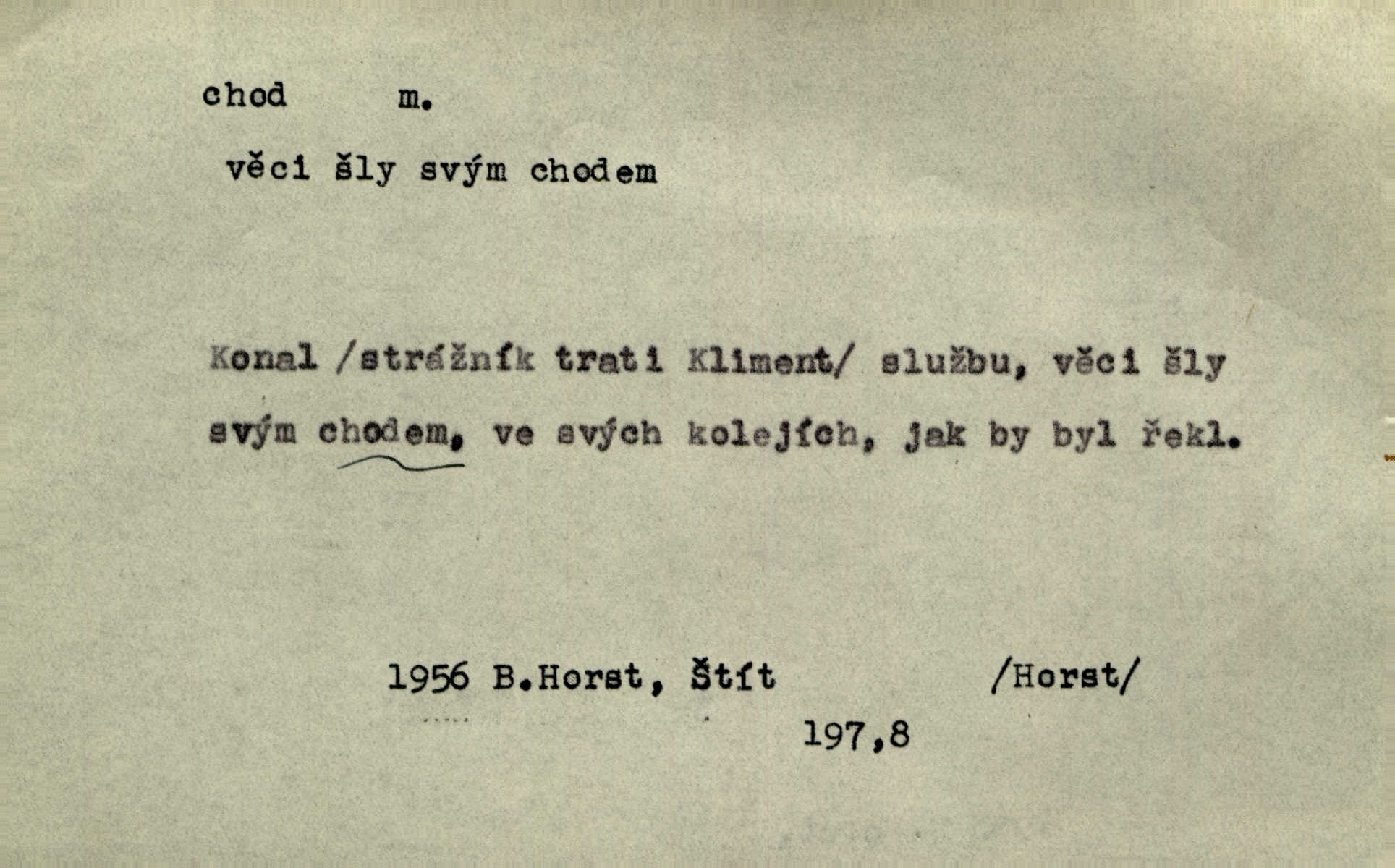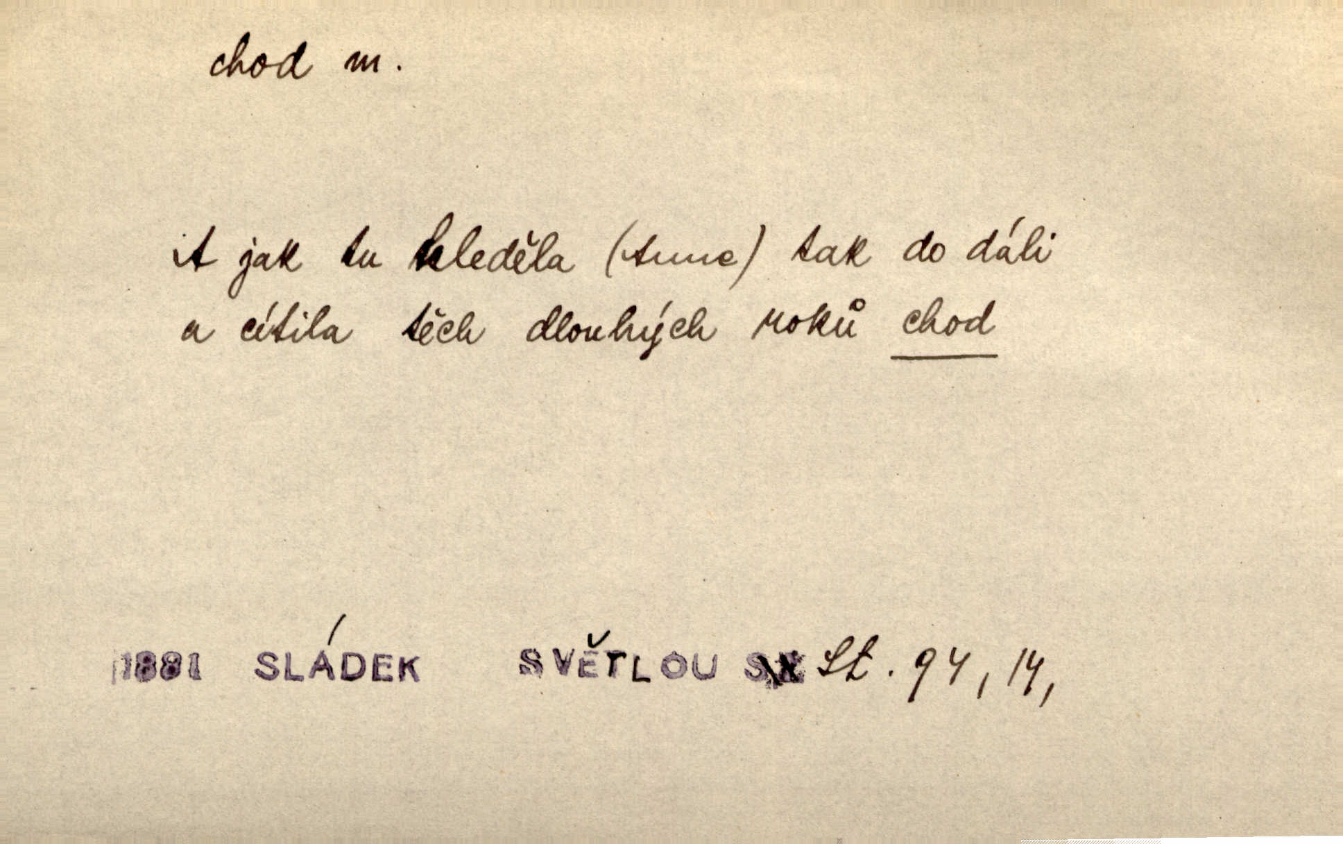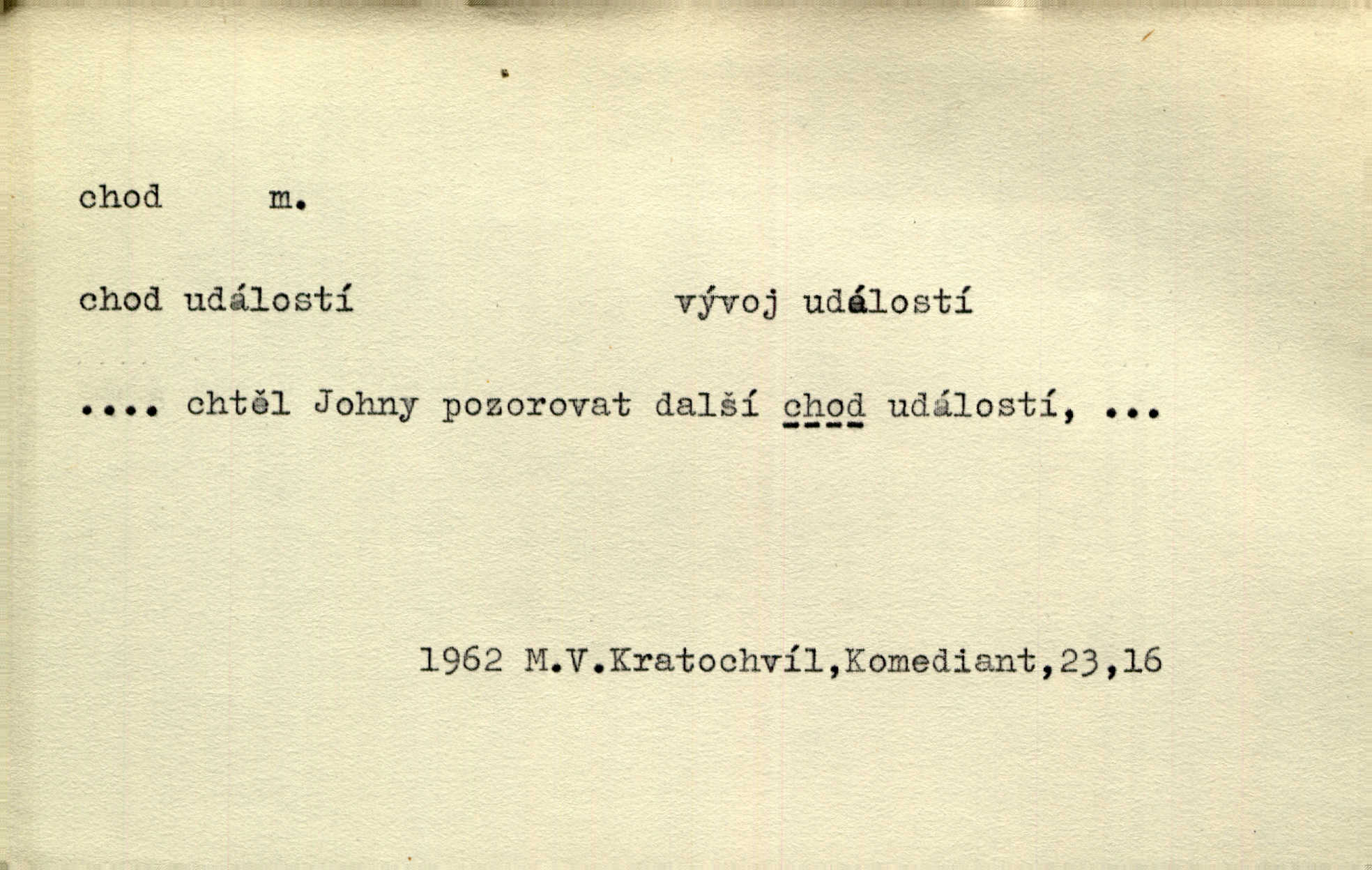 - chod, -u m. dělání kroků při pohybu s místa na místo, chůze. Potácivý chod. V. Mrš. Všichni v tomto sanatoriu mají neslyšný chod. Lang. Klátivé ruce jeho houpaly se při chodu kolem těla. Ner. Po chodu a po řeči poznáš člověka. Přísl. D Mysl. chody pl. cestičky zvěře, ochozy, spády. D jinaký pohyb s místa na místo. Rozmyslný a opatrný „chod“ [štiky]‚ její mžouravé oko, upřené na kořist. Mah. Sedě ve voze, kolébán jsa lehkým chodem, zamyslil se na chvíli. Šal. Bloudil s místa na místo, proklínaje lenivý chod slunce. Pfleg. D pohyb věci na místě, činnost, běh. Staré hodiny šly svým rozvážným chodem jako člověk kráčející ne za povinností, ale moudrou procházkou. Mach. Precisnost stavby [velocipédu] — chod — jistota — velkolepé! Štech. Chod motoru, vozidla, kulometu a p. Stroj je v chodu. Uvésti do chodu. Chod vysoké pece. D průběh, postup, vývoj n. i stav něčeho. [Obhájce] se ohrazuje proti suggestivním vlivům pana zástupce na chod přelíčení. Čap. Ch. Za okolností vybočujících z obvyklého chodu života. Herrm. Když chod věcí nabral tvářnosti již zcela určité, slabě vykřikla. Šrám. Věc je v chodu. Šrám. Pátral po truhlářské dílně, která by byla v dobrém chodu. Baar. Meteor. chod srážek. Tech. chod závitu (šroubu) počet ovinutí závitovitých profilů na jedno stoupání. D jeden člen, jedna část z nějakého postupu, z řady věcí po sobě. Naše milé obecenstvo je jako posvícenský host, jenom hodně mnoho chodů. Klost. Jídelní lístek o pěti chodech. Kun.