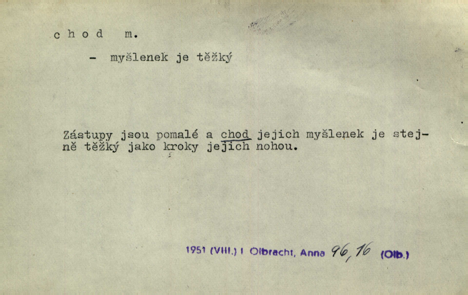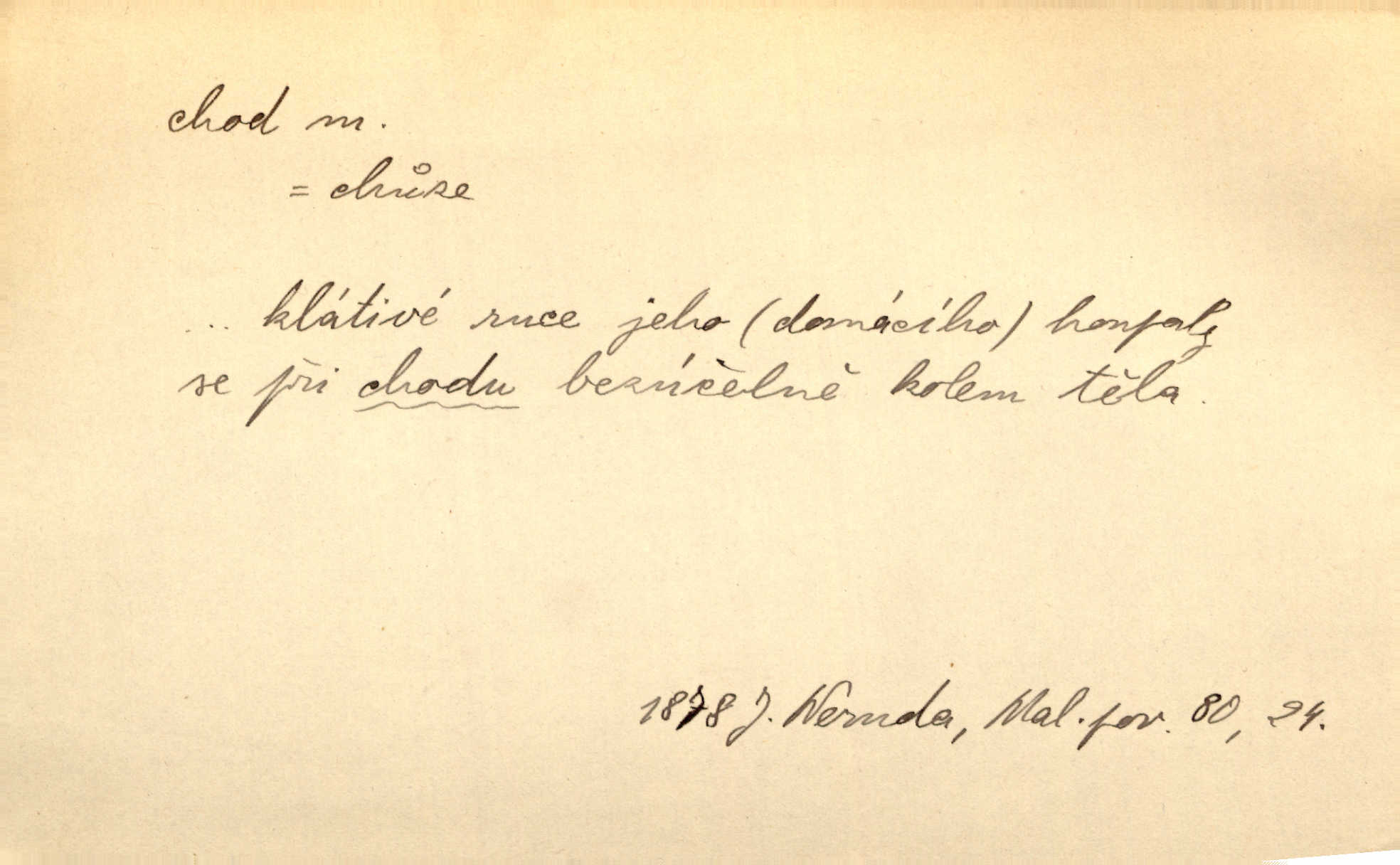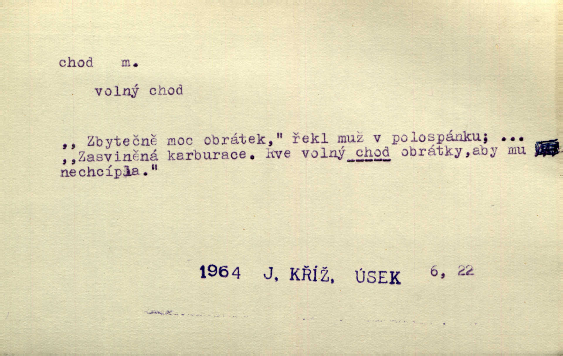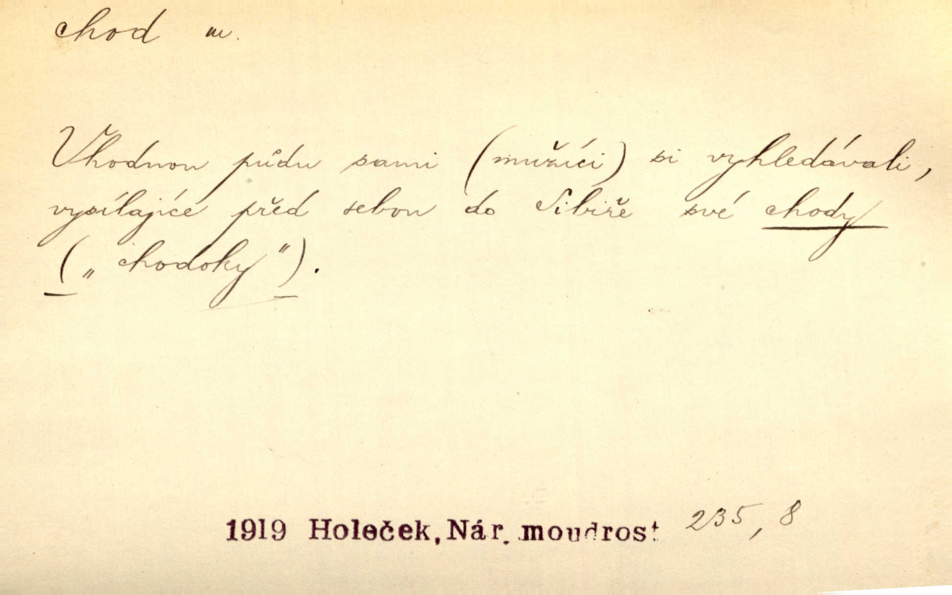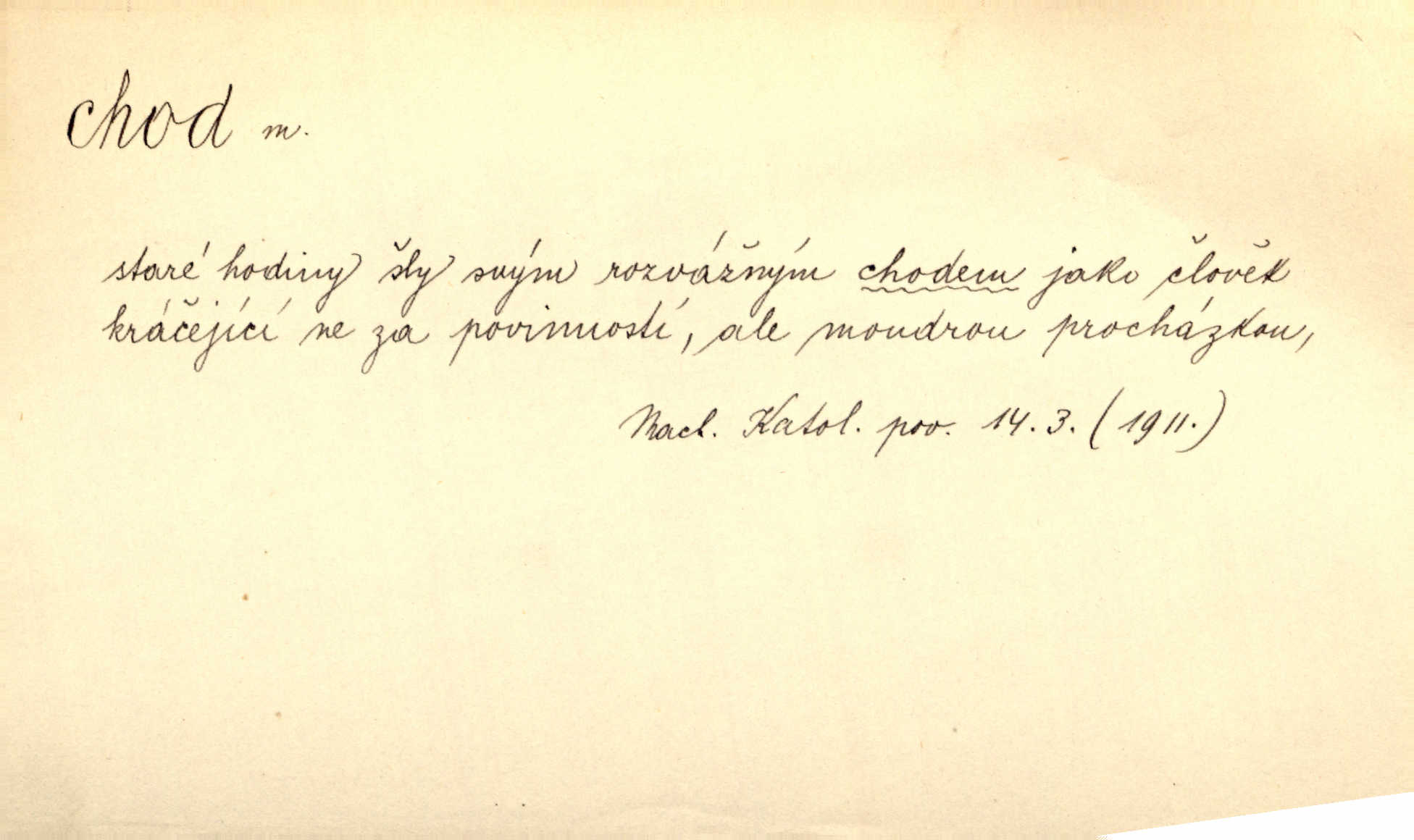 - chod, -u m. dělání kroků při pohybu s místa na místo, chůze. Potácivý chod. V. Mrš. Všichni v tomto sanatoriu mají neslyšný chod. Lang. Klátivé ruce jeho houpaly se při chodu kolem těla. Ner. Po chodu a po řeči poznáš člověka. Přísl. D Mysl. chody pl. cestičky zvěře, ochozy, spády. D jinaký pohyb s místa na místo. Rozmyslný a opatrný „chod“ [štiky]‚ její mžouravé oko, upřené na kořist. Mah. Sedě ve voze, kolébán jsa lehkým chodem, zamyslil se na chvíli. Šal. Bloudil s místa na místo, proklínaje lenivý chod slunce. Pfleg. D pohyb věci na místě, činnost, běh. Staré hodiny šly svým rozvážným chodem jako člověk kráčející ne za povinností, ale moudrou procházkou. Mach. Precisnost stavby [velocipédu] — chod — jistota — velkolepé! Štech. Chod motoru, vozidla, kulometu a p. Stroj je v chodu. Uvésti do chodu. Chod vysoké pece. D průběh, postup, vývoj n. i stav něčeho. [Obhájce] se ohrazuje proti suggestivním vlivům pana zástupce na chod přelíčení. Čap. Ch. Za okolností vybočujících z obvyklého chodu života. Herrm. Když chod věcí nabral tvářnosti již zcela určité, slabě vykřikla. Šrám. Věc je v chodu. Šrám. Pátral po truhlářské dílně, která by byla v dobrém chodu. Baar. Meteor. chod srážek. Tech. chod závitu (šroubu) počet ovinutí závitovitých profilů na jedno stoupání. D jeden člen, jedna část z nějakého postupu, z řady věcí po sobě. Naše milé obecenstvo je jako posvícenský host, jenom hodně mnoho chodů. Klost. Jídelní lístek o pěti chodech. Kun.
