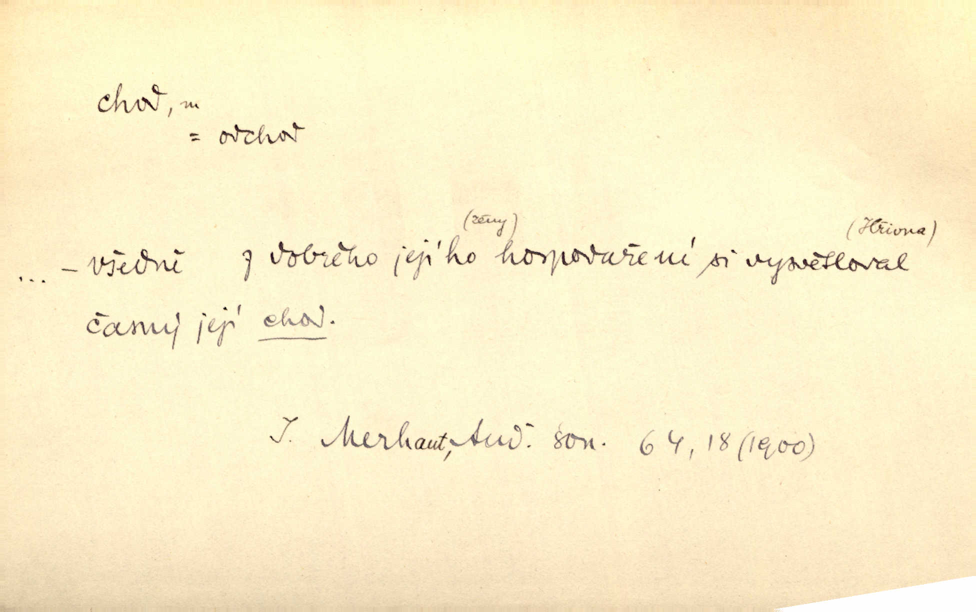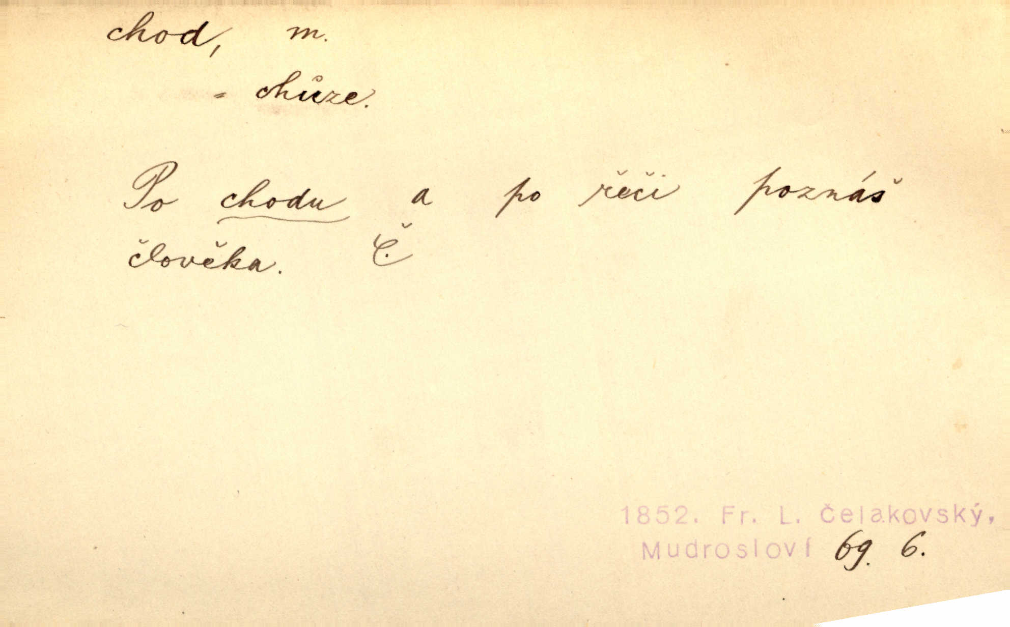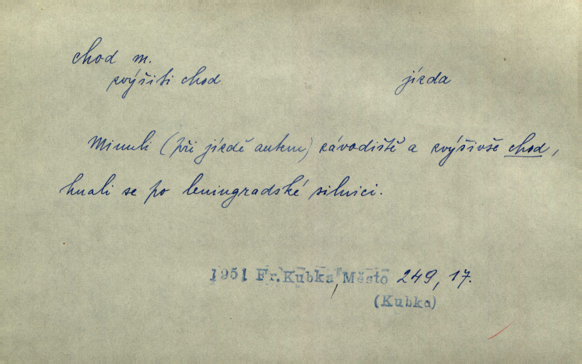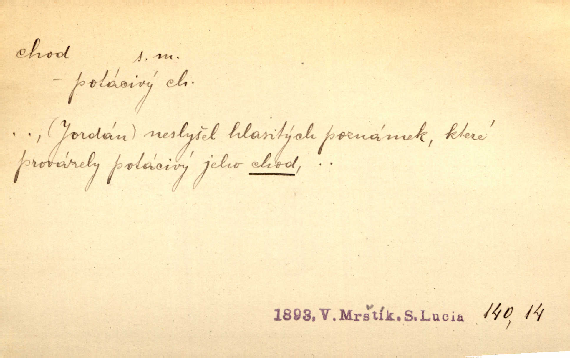- chod, -u m. dělání kroků při pohybu s místa na místo, chůze. Potácivý chod. V. Mrš. Všichni v tomto sanatoriu mají neslyšný chod. Lang. Klátivé ruce jeho houpaly se při chodu kolem těla. Ner. Po chodu a po řeči poznáš člověka. Přísl. D Mysl. chody pl. cestičky zvěře, ochozy, spády. D jinaký pohyb s místa na místo. Rozmyslný a opatrný „chod“ [štiky]‚ její mžouravé oko, upřené na kořist. Mah. Sedě ve voze, kolébán jsa lehkým chodem, zamyslil se na chvíli. Šal. Bloudil s místa na místo, proklínaje lenivý chod slunce. Pfleg. D pohyb věci na místě, činnost, běh. Staré hodiny šly svým rozvážným chodem jako člověk kráčející ne za povinností, ale moudrou procházkou. Mach. Precisnost stavby [velocipédu] — chod — jistota — velkolepé! Štech. Chod motoru, vozidla, kulometu a p. Stroj je v chodu. Uvésti do chodu. Chod vysoké pece. D průběh, postup, vývoj n. i stav něčeho. [Obhájce] se ohrazuje proti suggestivním vlivům pana zástupce na chod přelíčení. Čap. Ch. Za okolností vybočujících z obvyklého chodu života. Herrm. Když chod věcí nabral tvářnosti již zcela určité, slabě vykřikla. Šrám. Věc je v chodu. Šrám. Pátral po truhlářské dílně, která by byla v dobrém chodu. Baar. Meteor. chod srážek. Tech. chod závitu (šroubu) počet ovinutí závitovitých profilů na jedno stoupání. D jeden člen, jedna část z nějakého postupu, z řady věcí po sobě. Naše milé obecenstvo je jako posvícenský host, jenom hodně mnoho chodů. Klost. Jídelní lístek o pěti chodech. Kun.