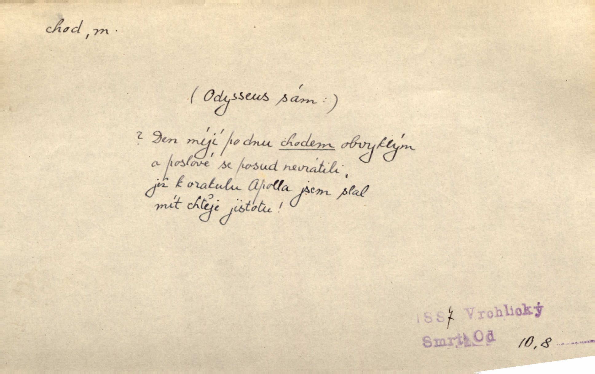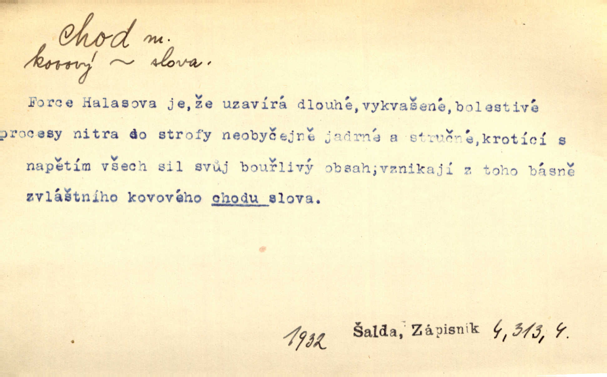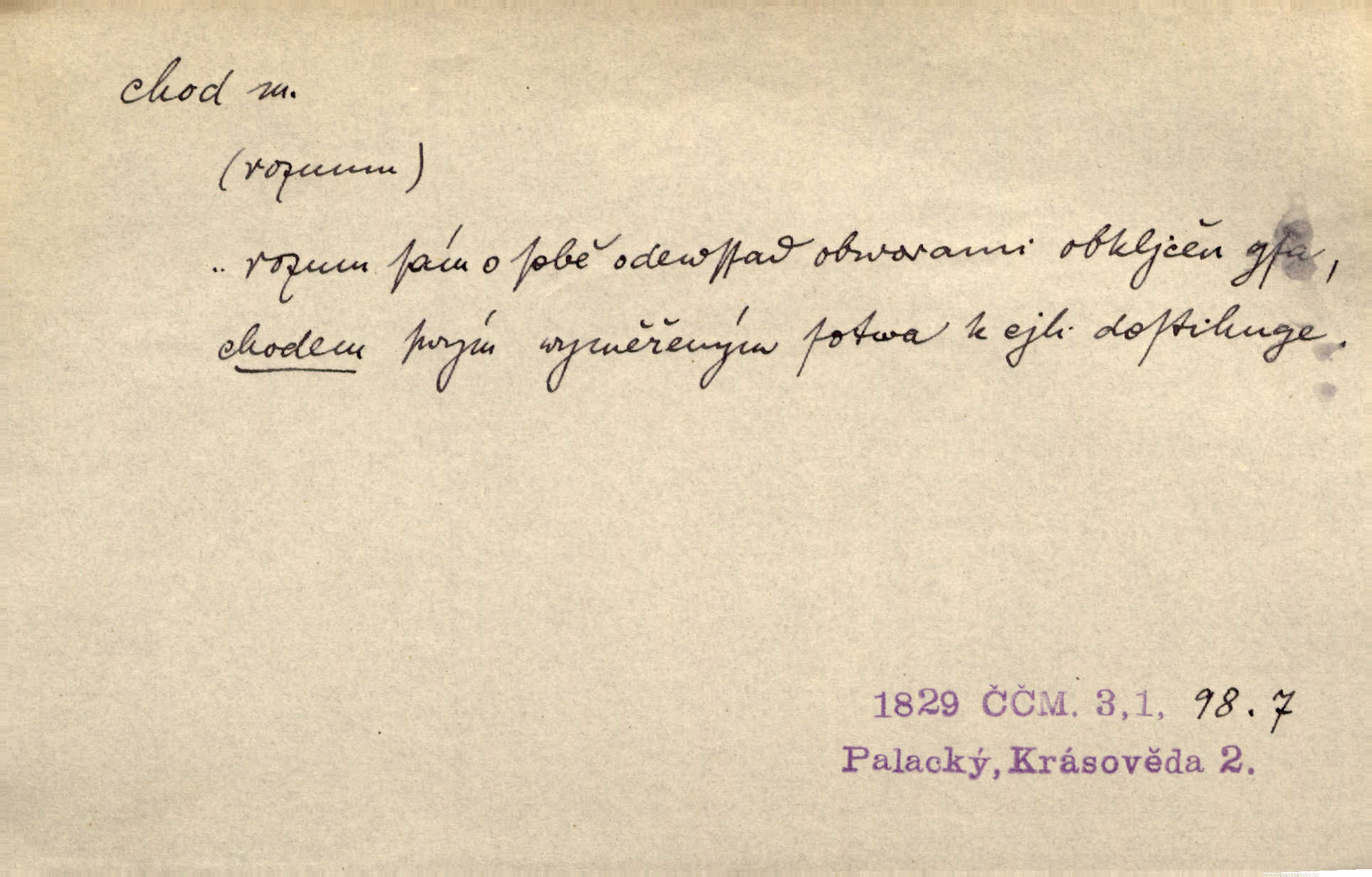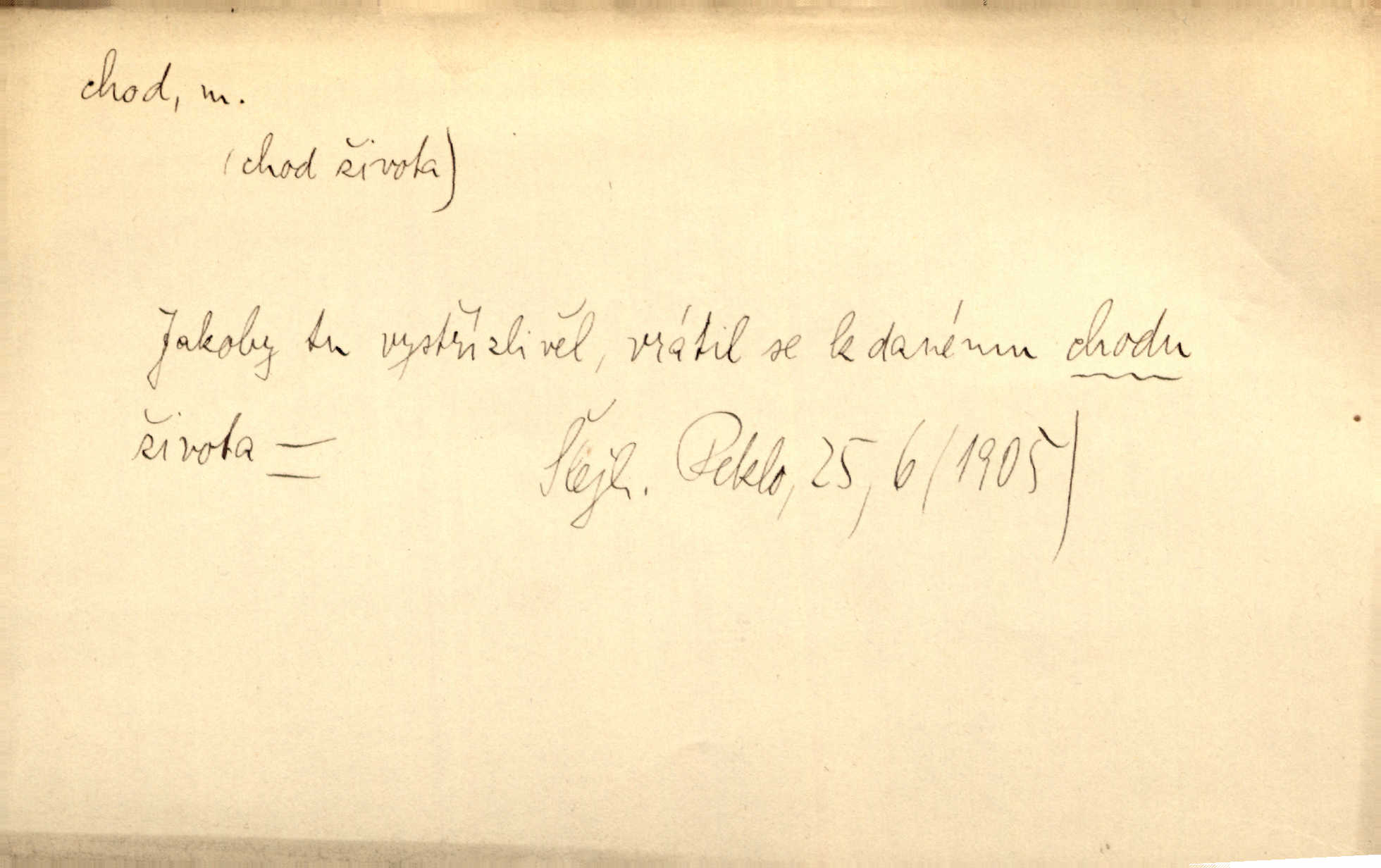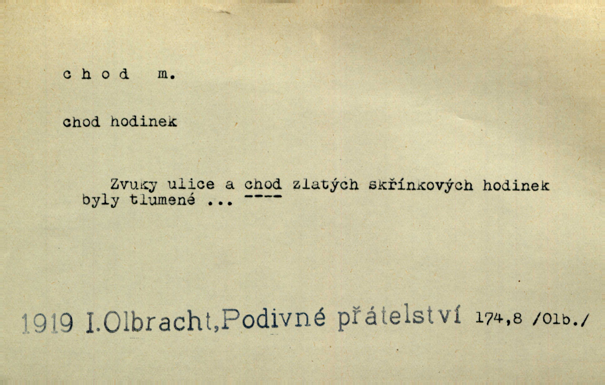 - chod, -u m. dělání kroků při pohybu s místa na místo, chůze. Potácivý chod. V. Mrš. Všichni v tomto sanatoriu mají neslyšný chod. Lang. Klátivé ruce jeho houpaly se při chodu kolem těla. Ner. Po chodu a po řeči poznáš člověka. Přísl. D Mysl. chody pl. cestičky zvěře, ochozy, spády. D jinaký pohyb s místa na místo. Rozmyslný a opatrný „chod“ [štiky]‚ její mžouravé oko, upřené na kořist. Mah. Sedě ve voze, kolébán jsa lehkým chodem, zamyslil se na chvíli. Šal. Bloudil s místa na místo, proklínaje lenivý chod slunce. Pfleg. D pohyb věci na místě, činnost, běh. Staré hodiny šly svým rozvážným chodem jako člověk kráčející ne za povinností, ale moudrou procházkou. Mach. Precisnost stavby [velocipédu] — chod — jistota — velkolepé! Štech. Chod motoru, vozidla, kulometu a p. Stroj je v chodu. Uvésti do chodu. Chod vysoké pece. D průběh, postup, vývoj n. i stav něčeho. [Obhájce] se ohrazuje proti suggestivním vlivům pana zástupce na chod přelíčení. Čap. Ch. Za okolností vybočujících z obvyklého chodu života. Herrm. Když chod věcí nabral tvářnosti již zcela určité, slabě vykřikla. Šrám. Věc je v chodu. Šrám. Pátral po truhlářské dílně, která by byla v dobrém chodu. Baar. Meteor. chod srážek. Tech. chod závitu (šroubu) počet ovinutí závitovitých profilů na jedno stoupání. D jeden člen, jedna část z nějakého postupu, z řady věcí po sobě. Naše milé obecenstvo je jako posvícenský host, jenom hodně mnoho chodů. Klost. Jídelní lístek o pěti chodech. Kun.