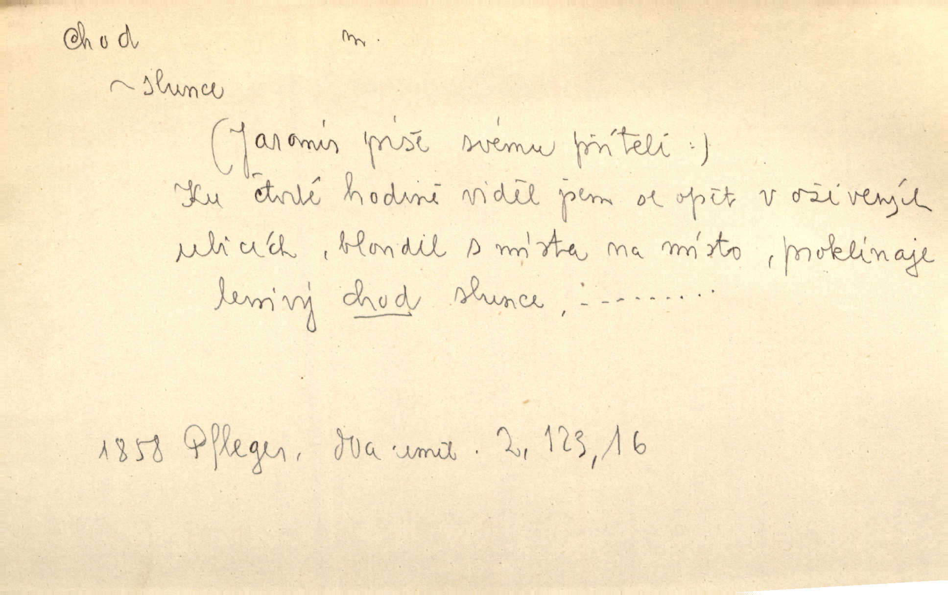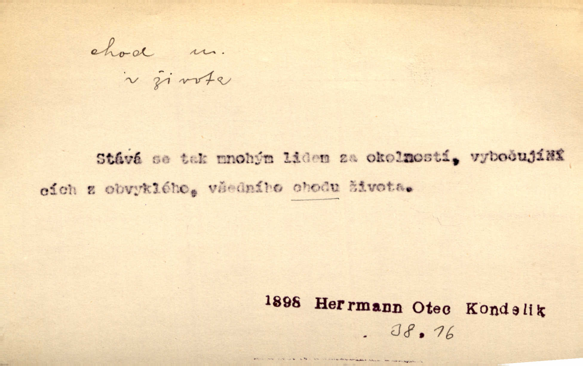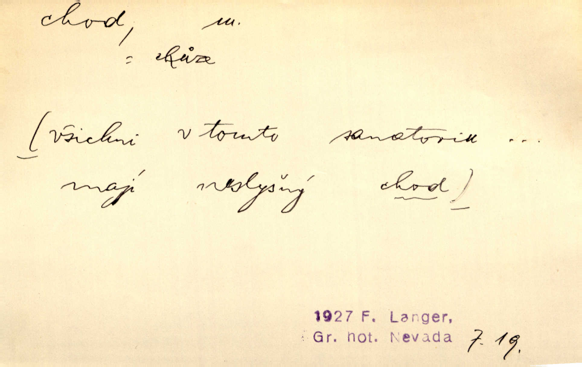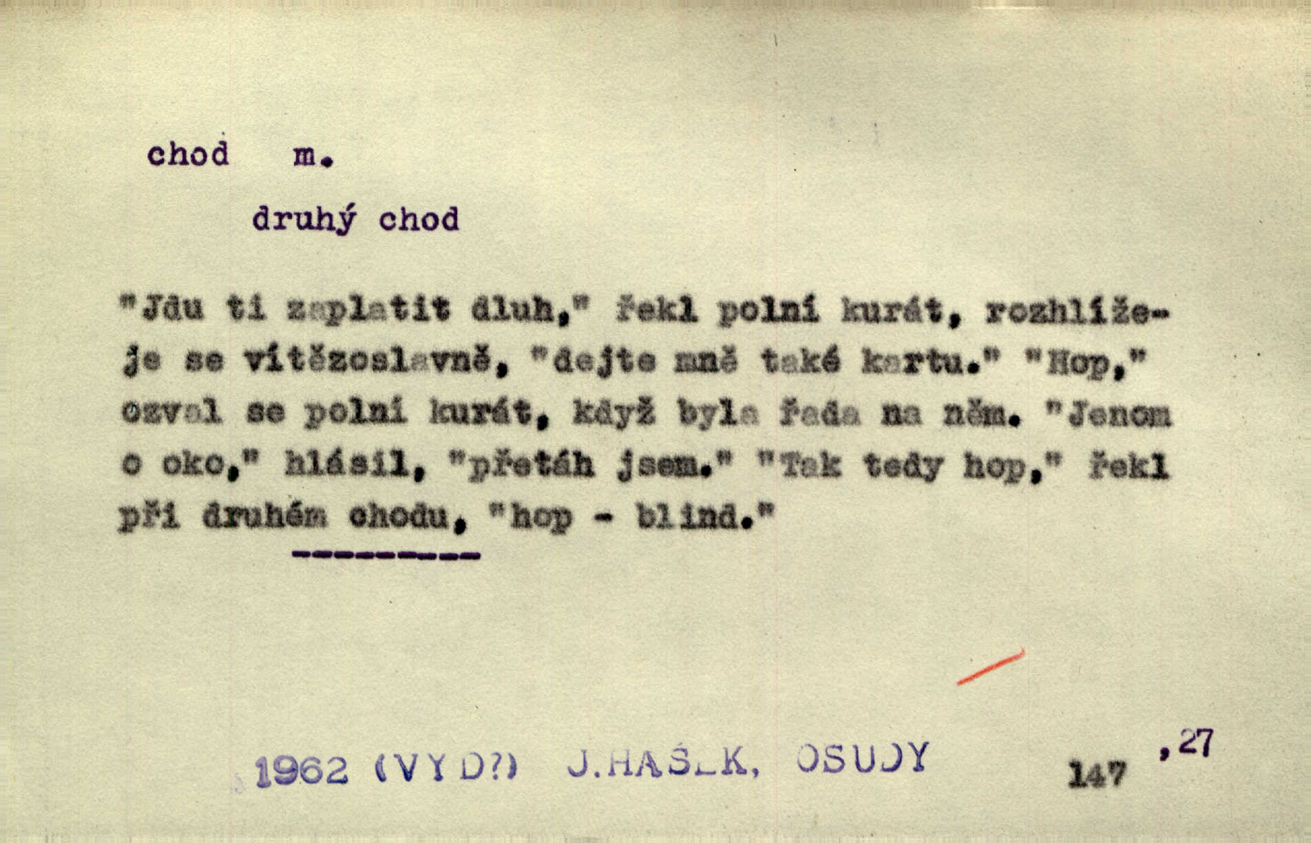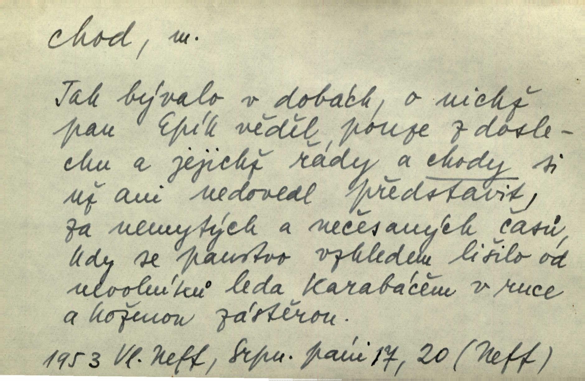 - chod, -u m. dělání kroků při pohybu s místa na místo, chůze. Potácivý chod. V. Mrš. Všichni v tomto sanatoriu mají neslyšný chod. Lang. Klátivé ruce jeho houpaly se při chodu kolem těla. Ner. Po chodu a po řeči poznáš člověka. Přísl. D Mysl. chody pl. cestičky zvěře, ochozy, spády. D jinaký pohyb s místa na místo. Rozmyslný a opatrný „chod“ [štiky]‚ její mžouravé oko, upřené na kořist. Mah. Sedě ve voze, kolébán jsa lehkým chodem, zamyslil se na chvíli. Šal. Bloudil s místa na místo, proklínaje lenivý chod slunce. Pfleg. D pohyb věci na místě, činnost, běh. Staré hodiny šly svým rozvážným chodem jako člověk kráčející ne za povinností, ale moudrou procházkou. Mach. Precisnost stavby [velocipédu] — chod — jistota — velkolepé! Štech. Chod motoru, vozidla, kulometu a p. Stroj je v chodu. Uvésti do chodu. Chod vysoké pece. D průběh, postup, vývoj n. i stav něčeho. [Obhájce] se ohrazuje proti suggestivním vlivům pana zástupce na chod přelíčení. Čap. Ch. Za okolností vybočujících z obvyklého chodu života. Herrm. Když chod věcí nabral tvářnosti již zcela určité, slabě vykřikla. Šrám. Věc je v chodu. Šrám. Pátral po truhlářské dílně, která by byla v dobrém chodu. Baar. Meteor. chod srážek. Tech. chod závitu (šroubu) počet ovinutí závitovitých profilů na jedno stoupání. D jeden člen, jedna část z nějakého postupu, z řady věcí po sobě. Naše milé obecenstvo je jako posvícenský host, jenom hodně mnoho chodů. Klost. Jídelní lístek o pěti chodech. Kun.