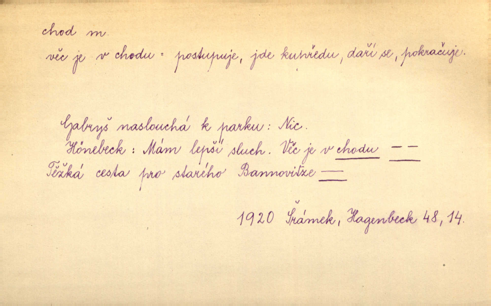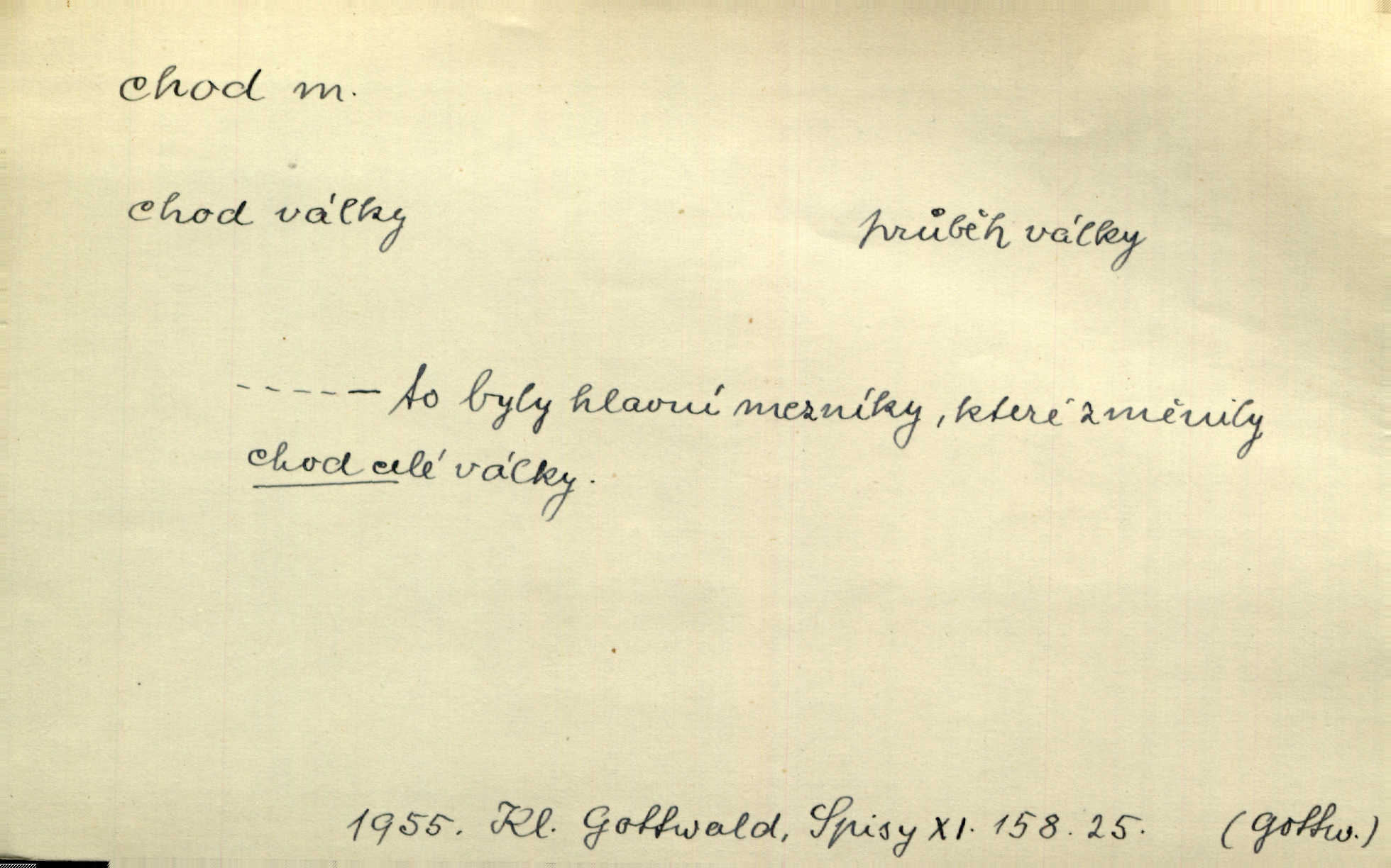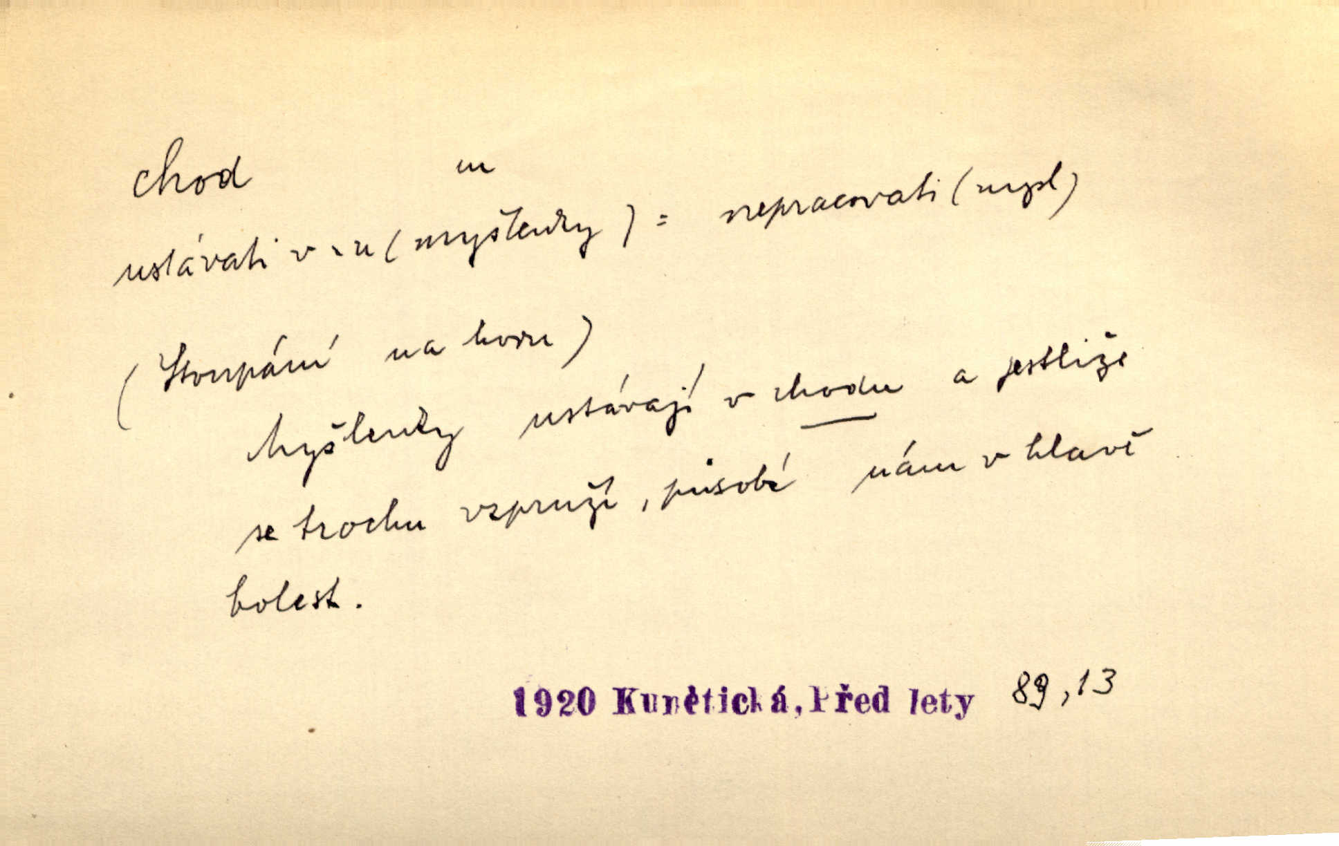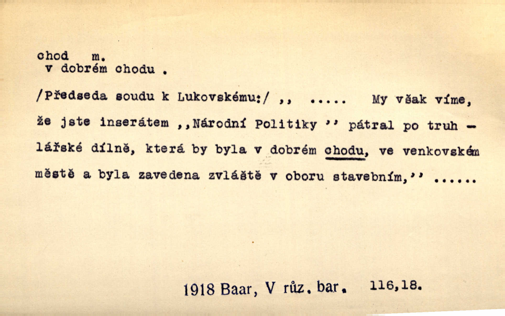 - chod, -u m. dělání kroků při pohybu s místa na místo, chůze. Potácivý chod. V. Mrš. Všichni v tomto sanatoriu mají neslyšný chod. Lang. Klátivé ruce jeho houpaly se při chodu kolem těla. Ner. Po chodu a po řeči poznáš člověka. Přísl. D Mysl. chody pl. cestičky zvěře, ochozy, spády. D jinaký pohyb s místa na místo. Rozmyslný a opatrný „chod“ [štiky]‚ její mžouravé oko, upřené na kořist. Mah. Sedě ve voze, kolébán jsa lehkým chodem, zamyslil se na chvíli. Šal. Bloudil s místa na místo, proklínaje lenivý chod slunce. Pfleg. D pohyb věci na místě, činnost, běh. Staré hodiny šly svým rozvážným chodem jako člověk kráčející ne za povinností, ale moudrou procházkou. Mach. Precisnost stavby [velocipédu] — chod — jistota — velkolepé! Štech. Chod motoru, vozidla, kulometu a p. Stroj je v chodu. Uvésti do chodu. Chod vysoké pece. D průběh, postup, vývoj n. i stav něčeho. [Obhájce] se ohrazuje proti suggestivním vlivům pana zástupce na chod přelíčení. Čap. Ch. Za okolností vybočujících z obvyklého chodu života. Herrm. Když chod věcí nabral tvářnosti již zcela určité, slabě vykřikla. Šrám. Věc je v chodu. Šrám. Pátral po truhlářské dílně, která by byla v dobrém chodu. Baar. Meteor. chod srážek. Tech. chod závitu (šroubu) počet ovinutí závitovitých profilů na jedno stoupání. D jeden člen, jedna část z nějakého postupu, z řady věcí po sobě. Naše milé obecenstvo je jako posvícenský host, jenom hodně mnoho chodů. Klost. Jídelní lístek o pěti chodech. Kun.