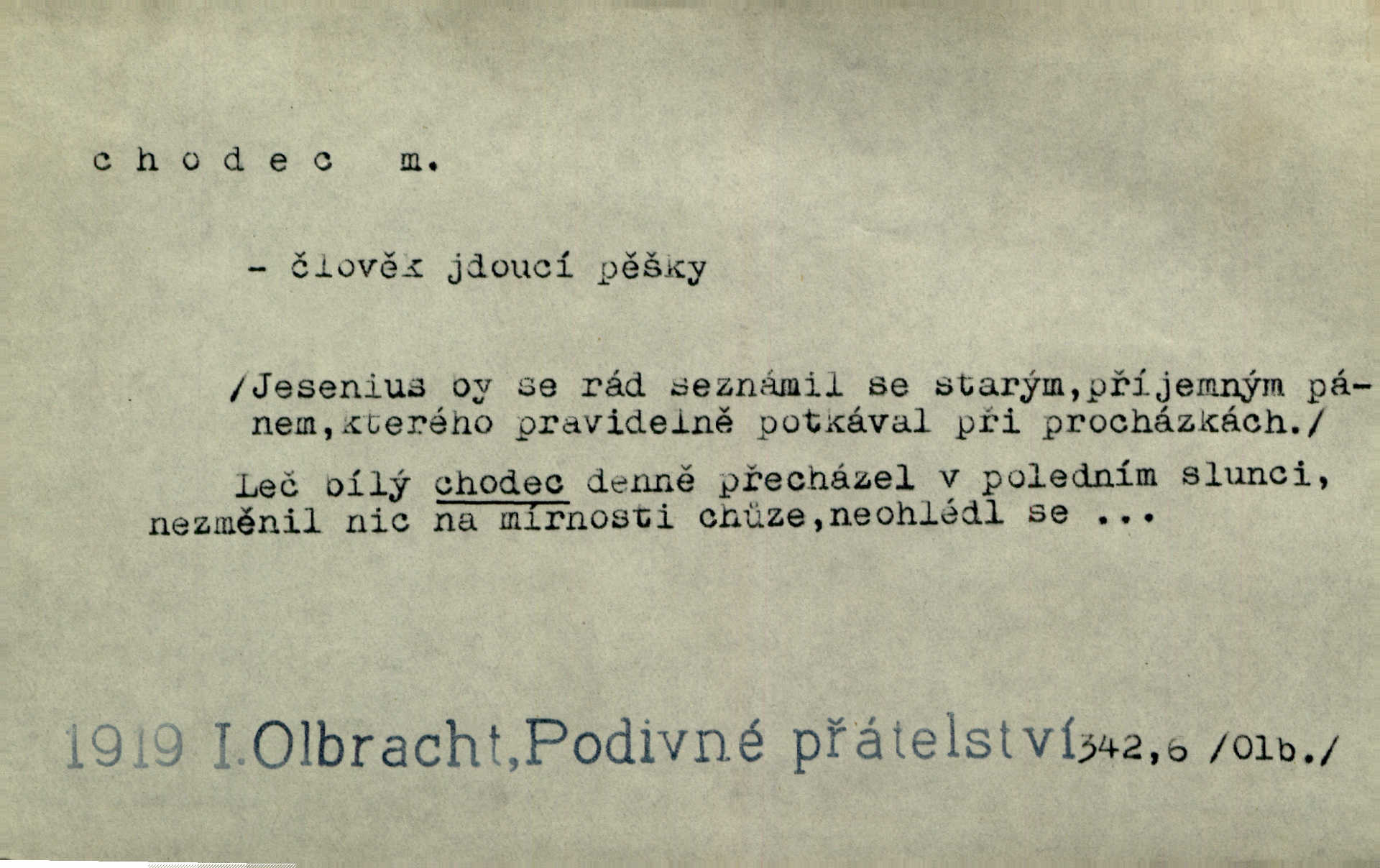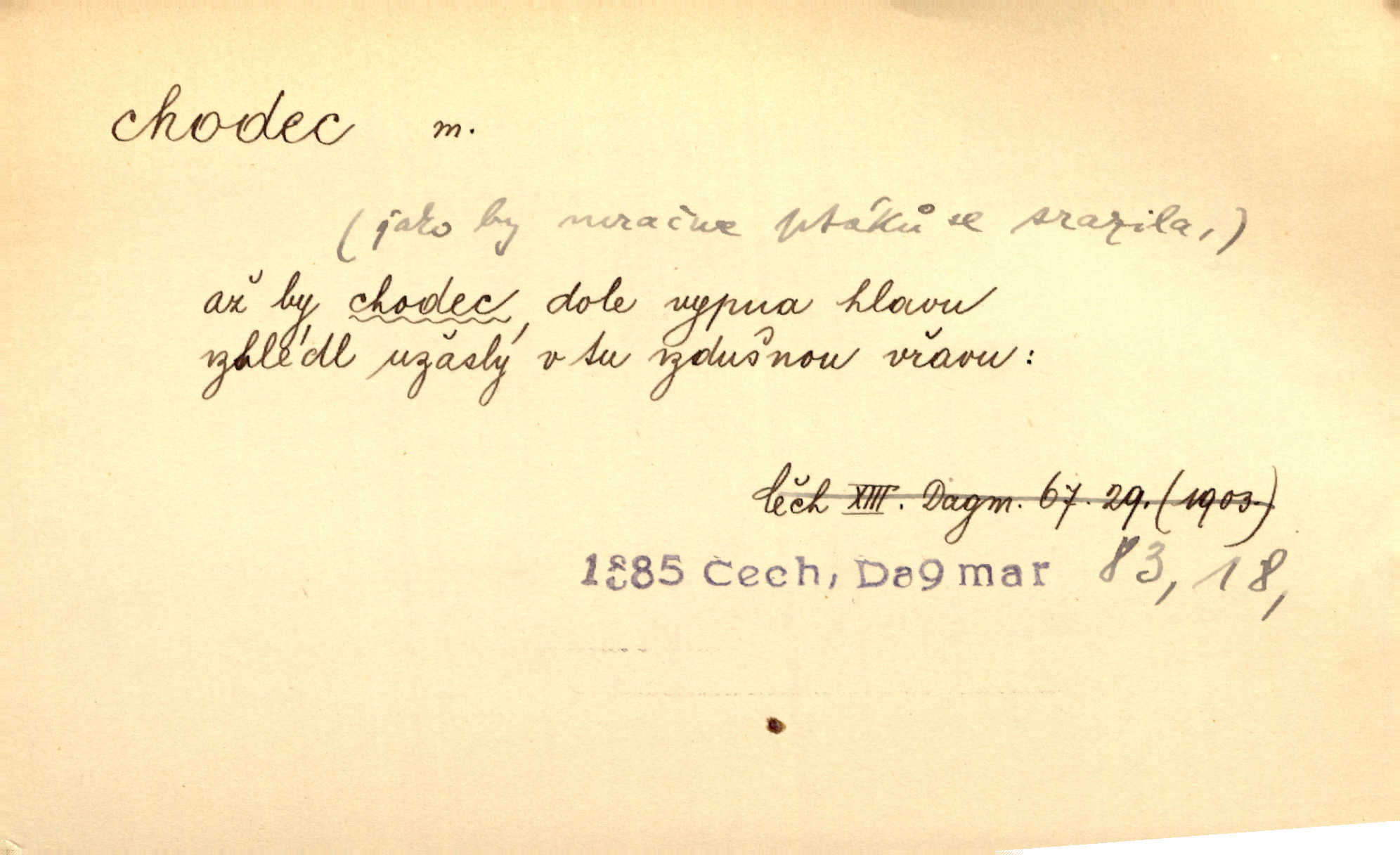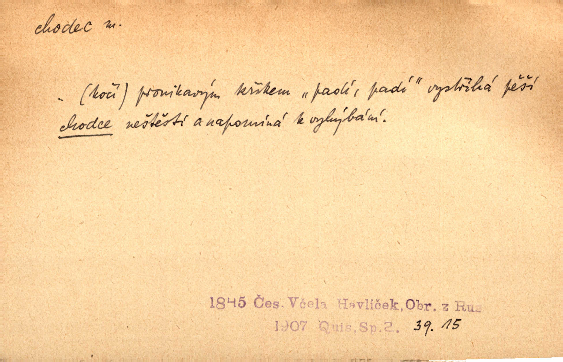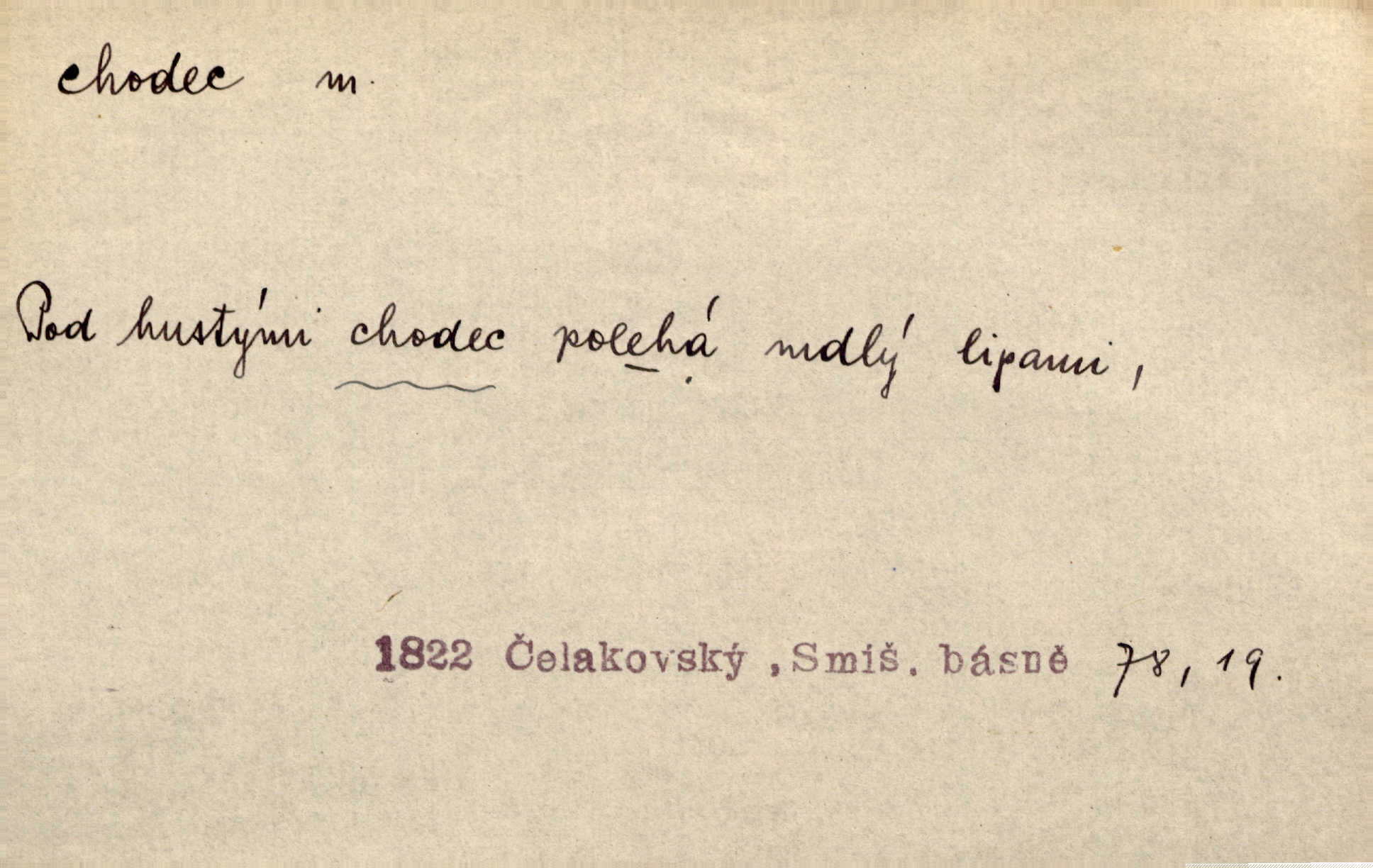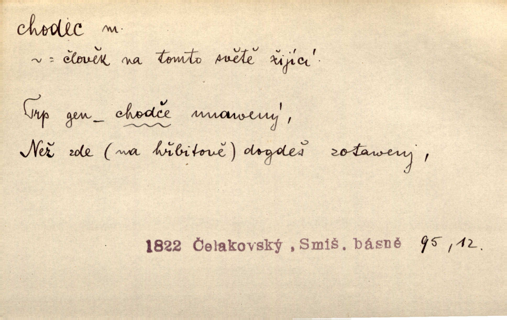 - chodec, -dce m. jdoucí, chodící n. cestu konající člověk, poutník, pocestný. Slyším kroky, ale nezradí chodce zrakům štíhlé kapradí. Krás. Zraky všech utkvěly jaksi s podivením na nočních chodcích. Zey. Muž vysoký, znamenitý chodec. Jir. Měli jsme v naší četě jednoho chodce po provaze. Lang.