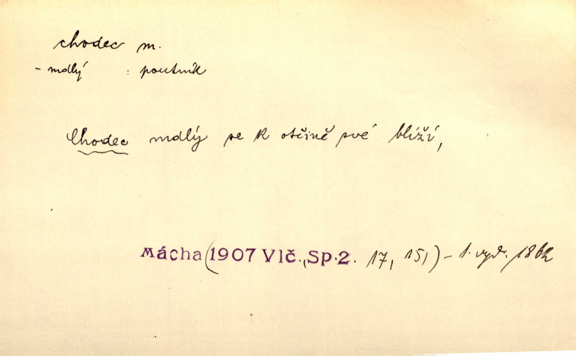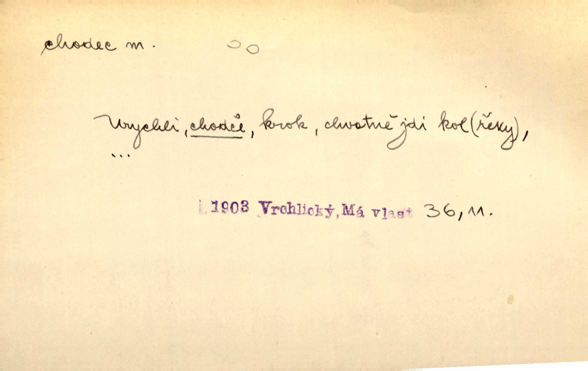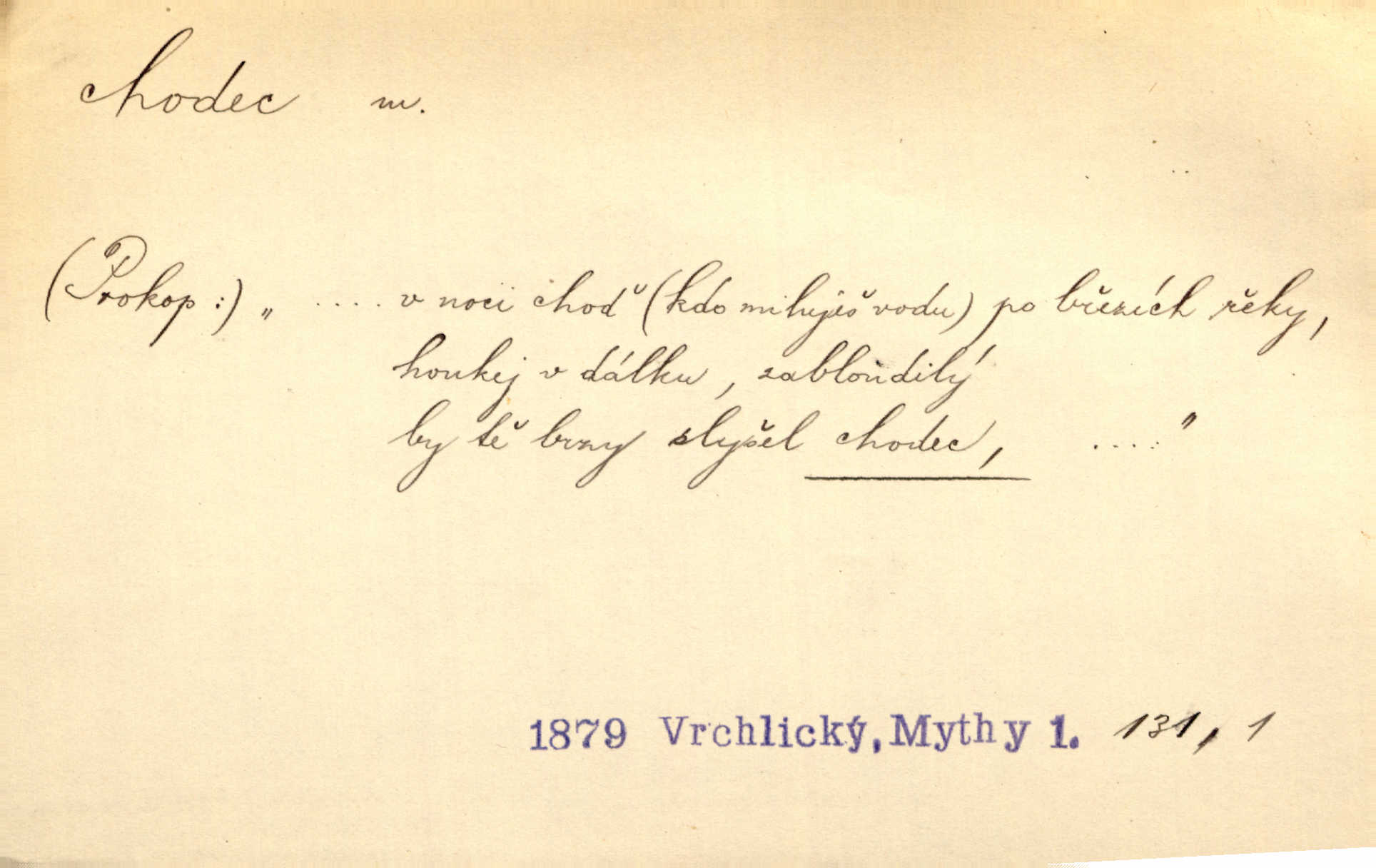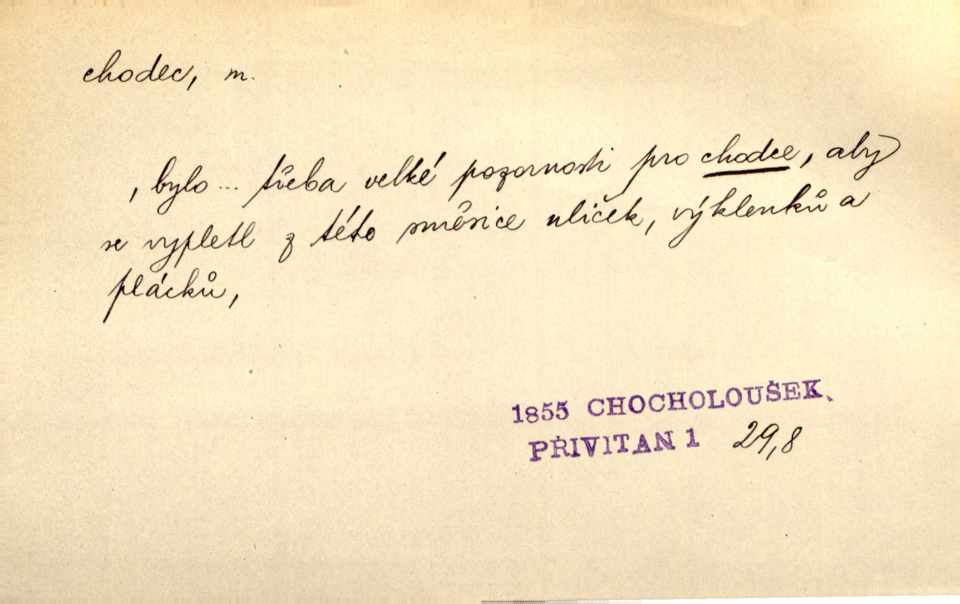 - chodec, -dce m. jdoucí, chodící n. cestu konající člověk, poutník, pocestný. Slyším kroky, ale nezradí chodce zrakům štíhlé kapradí. Krás. Zraky všech utkvěly jaksi s podivením na nočních chodcích. Zey. Muž vysoký, znamenitý chodec. Jir. Měli jsme v naší četě jednoho chodce po provaze. Lang.