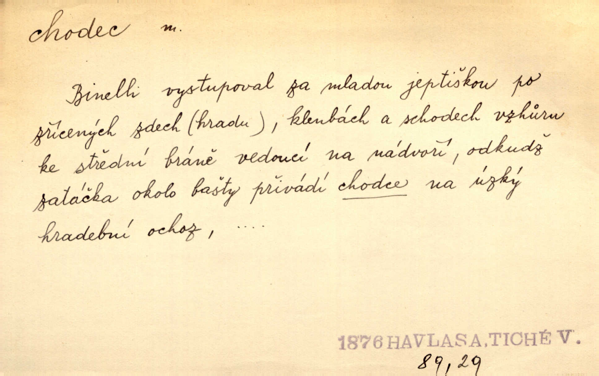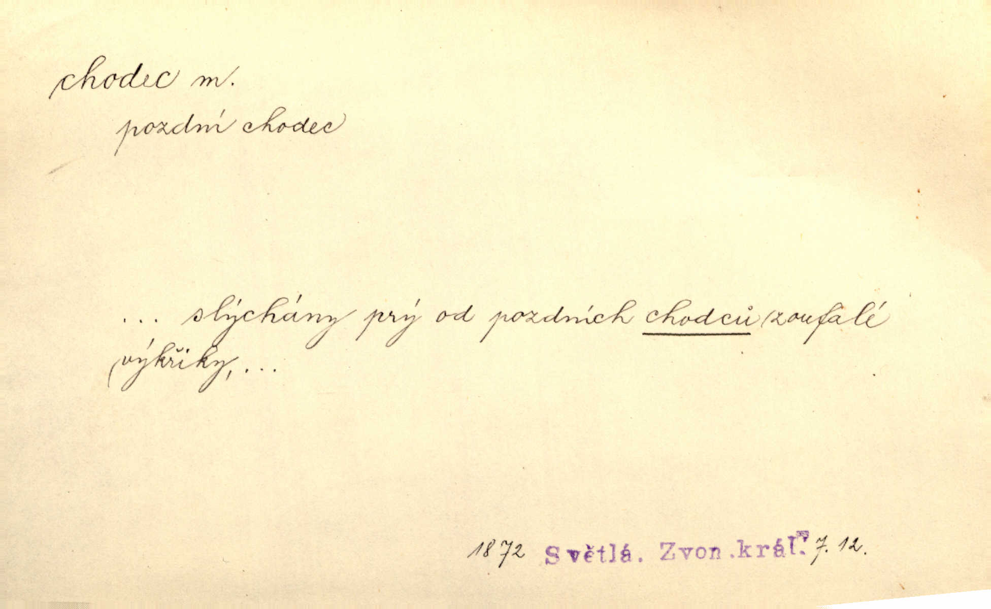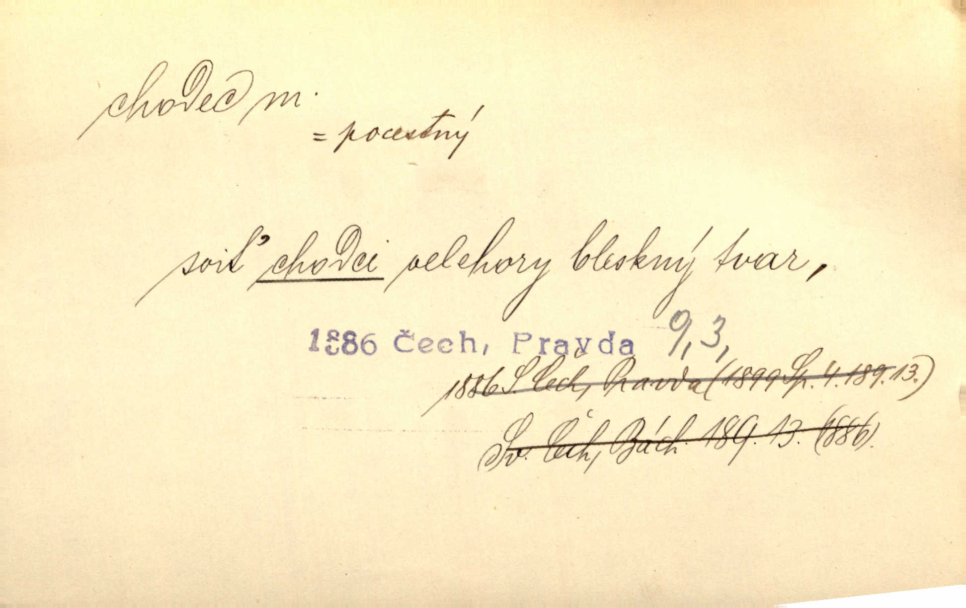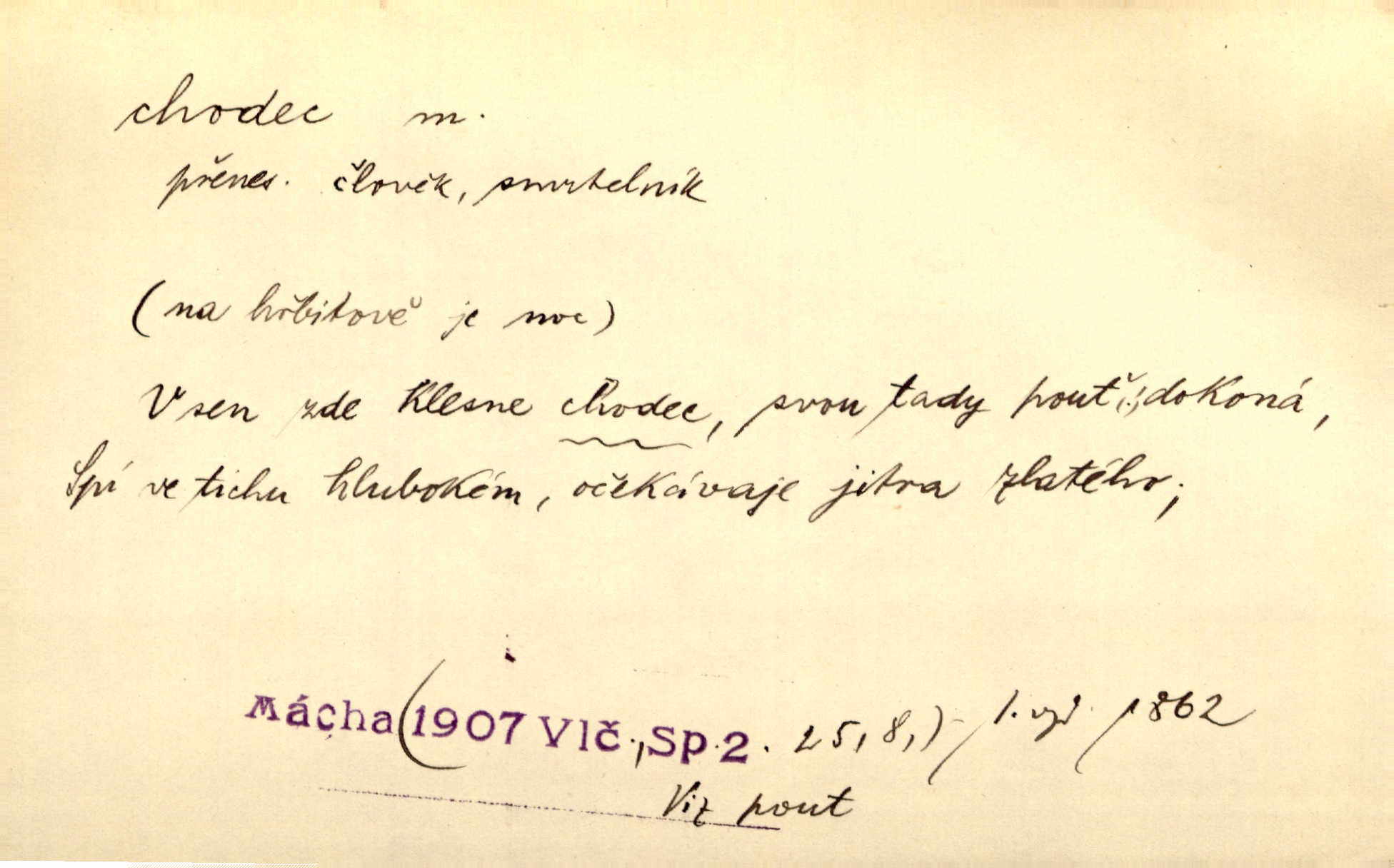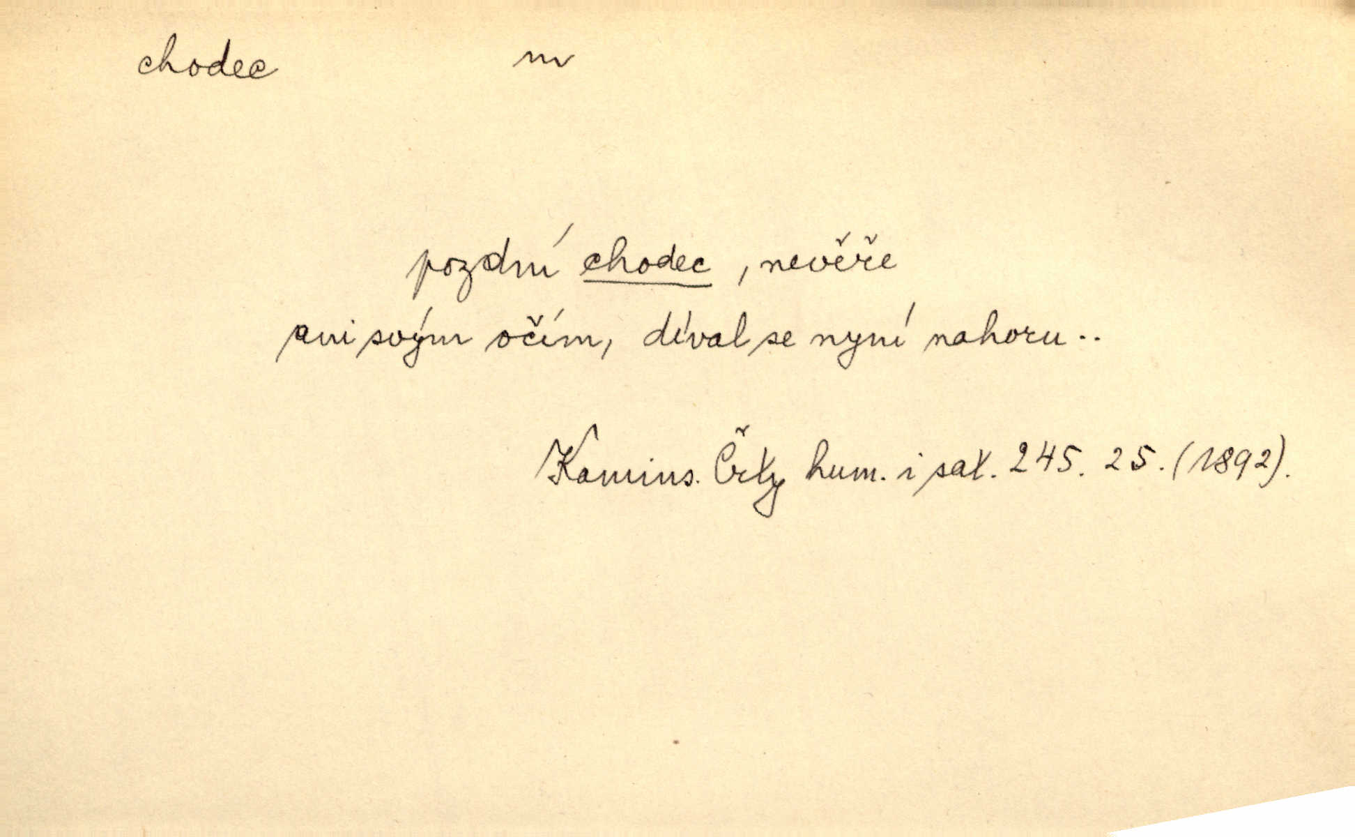 - chodec, -dce m. jdoucí, chodící n. cestu konající člověk, poutník, pocestný. Slyším kroky, ale nezradí chodce zrakům štíhlé kapradí. Krás. Zraky všech utkvěly jaksi s podivením na nočních chodcích. Zey. Muž vysoký, znamenitý chodec. Jir. Měli jsme v naší četě jednoho chodce po provaze. Lang.