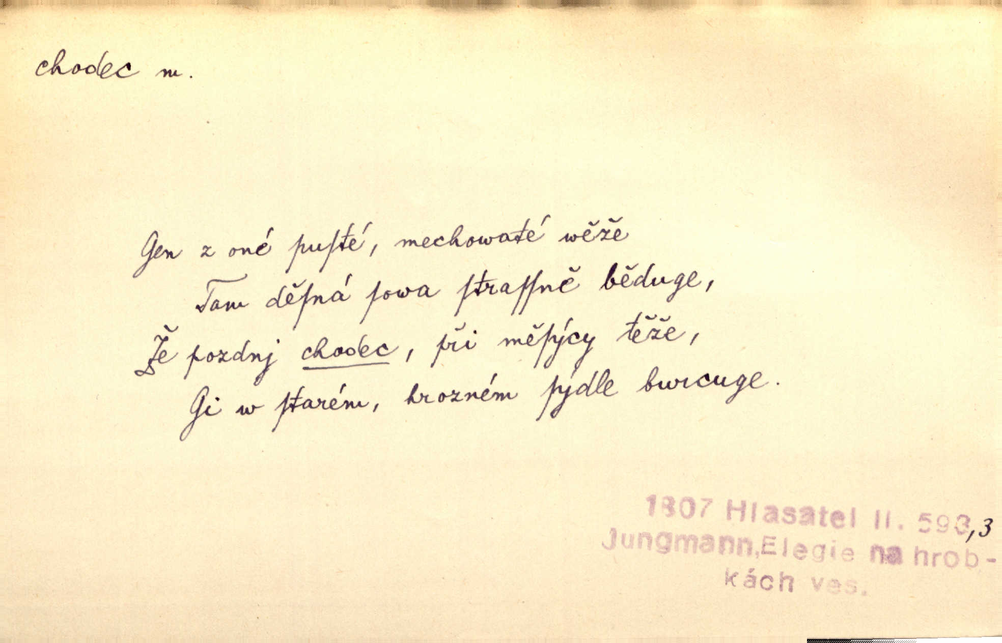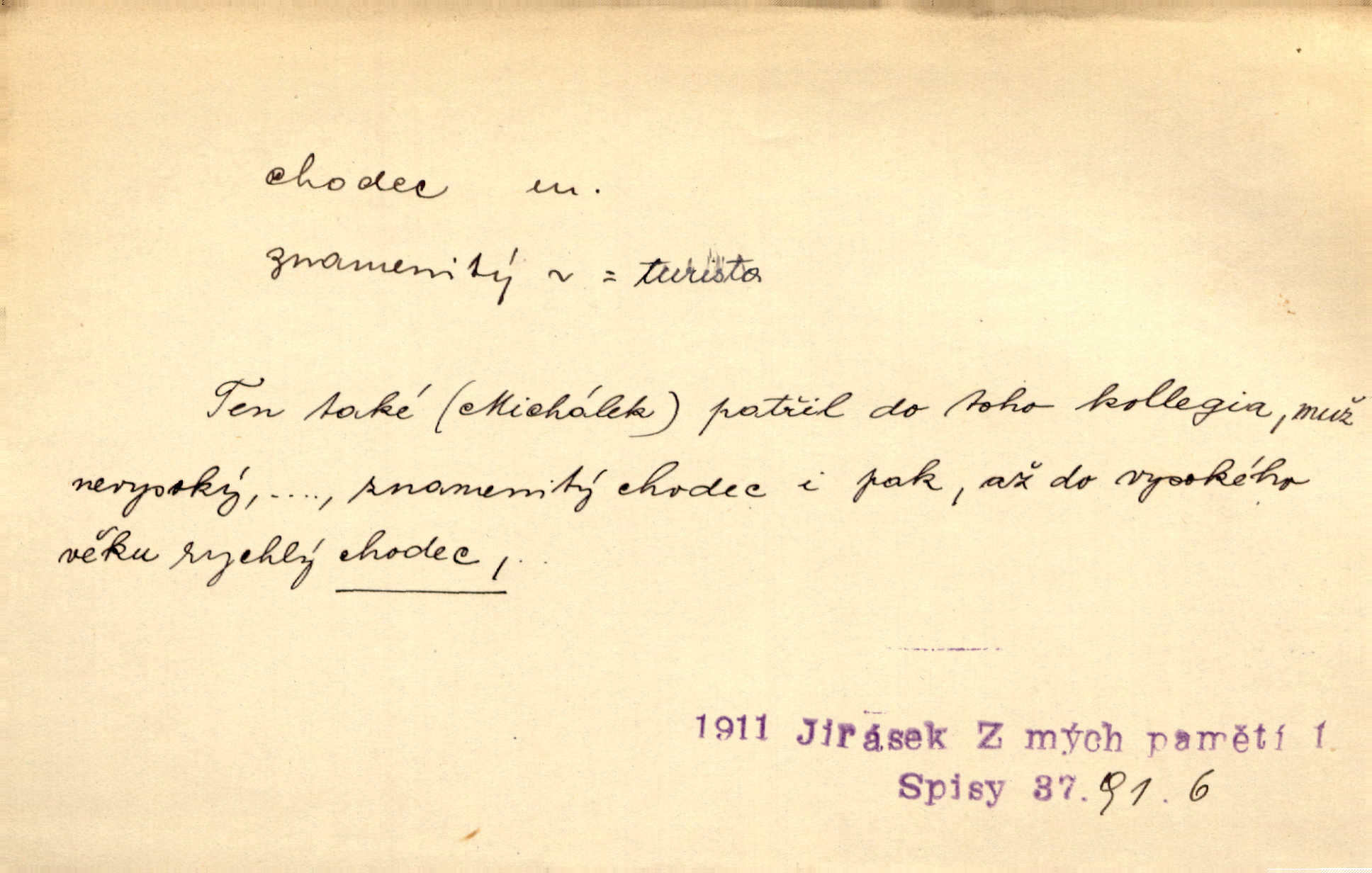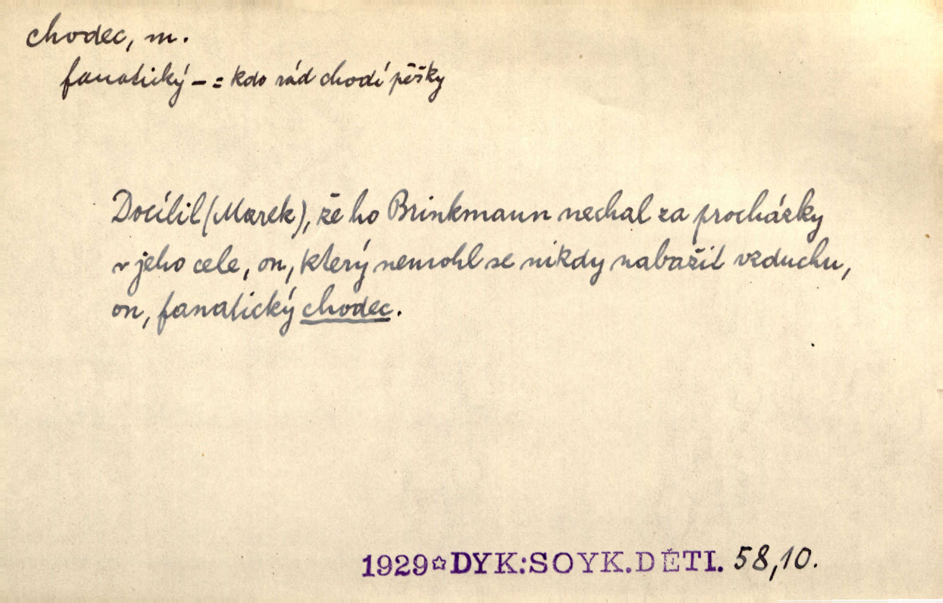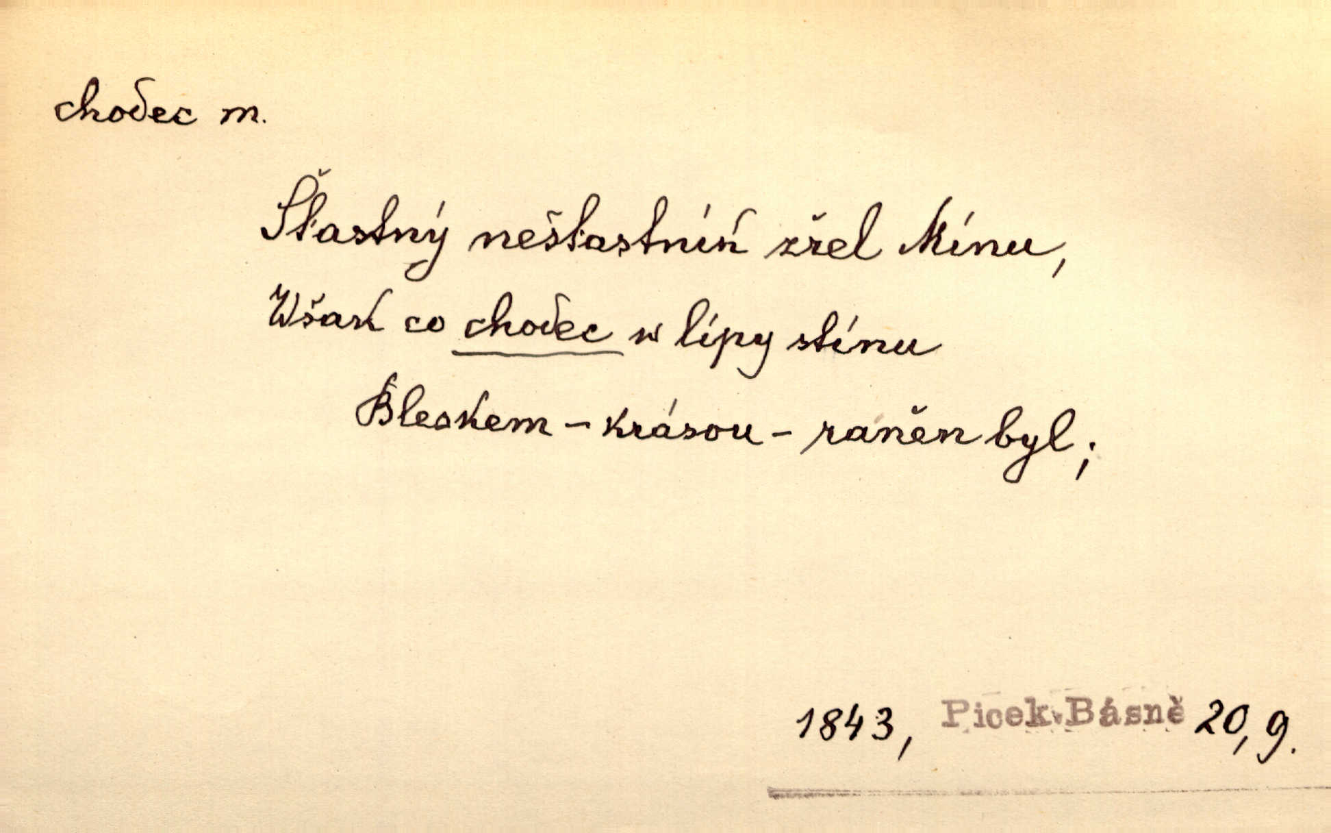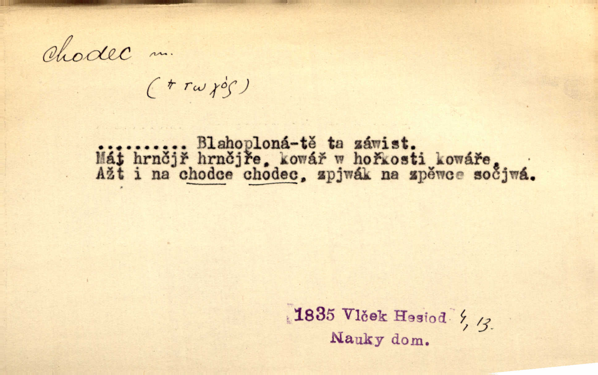 - chodec, -dce m. jdoucí, chodící n. cestu konající člověk, poutník, pocestný. Slyším kroky, ale nezradí chodce zrakům štíhlé kapradí. Krás. Zraky všech utkvěly jaksi s podivením na nočních chodcích. Zey. Muž vysoký, znamenitý chodec. Jir. Měli jsme v naší četě jednoho chodce po provaze. Lang.