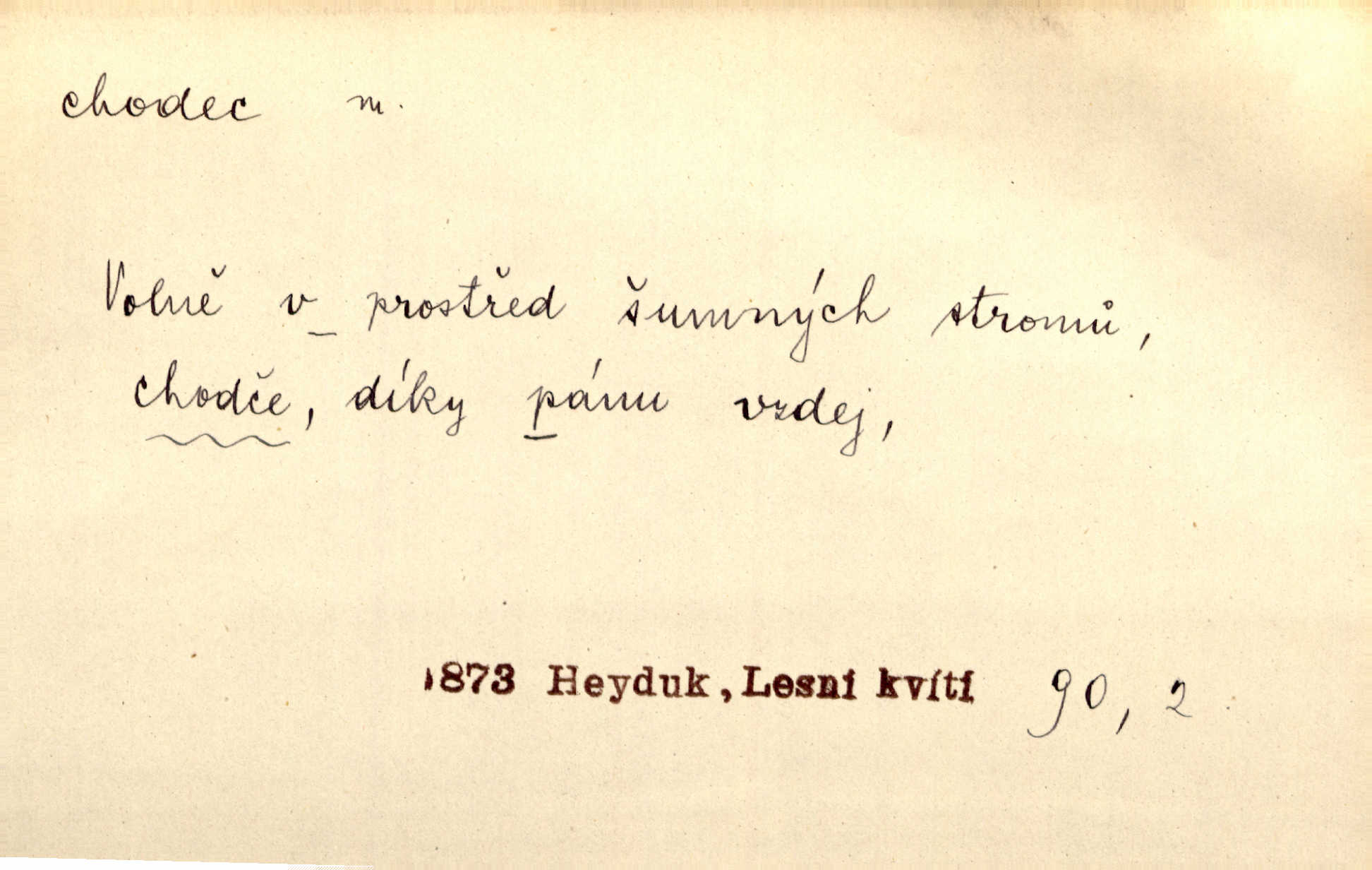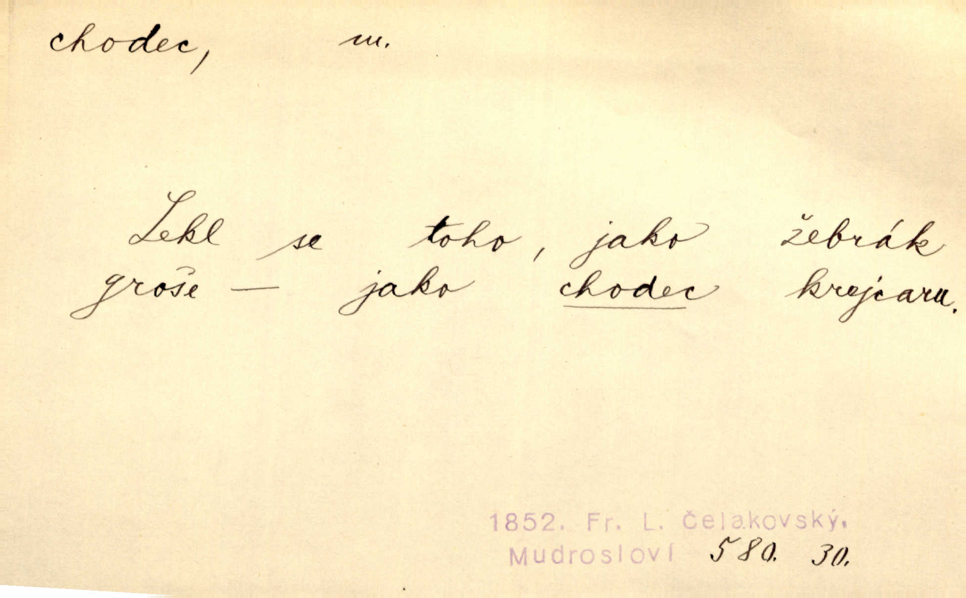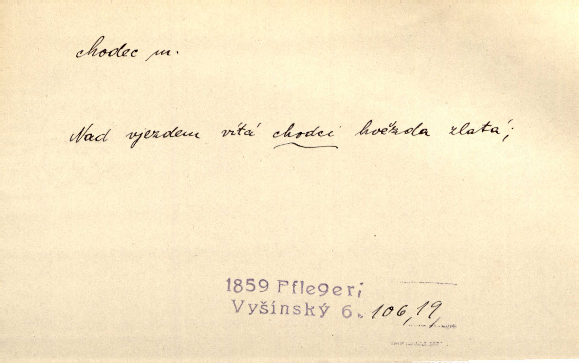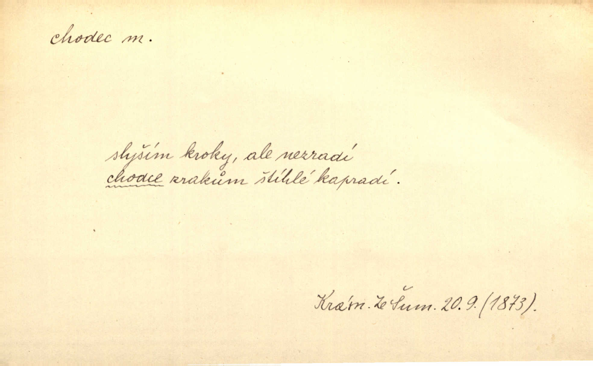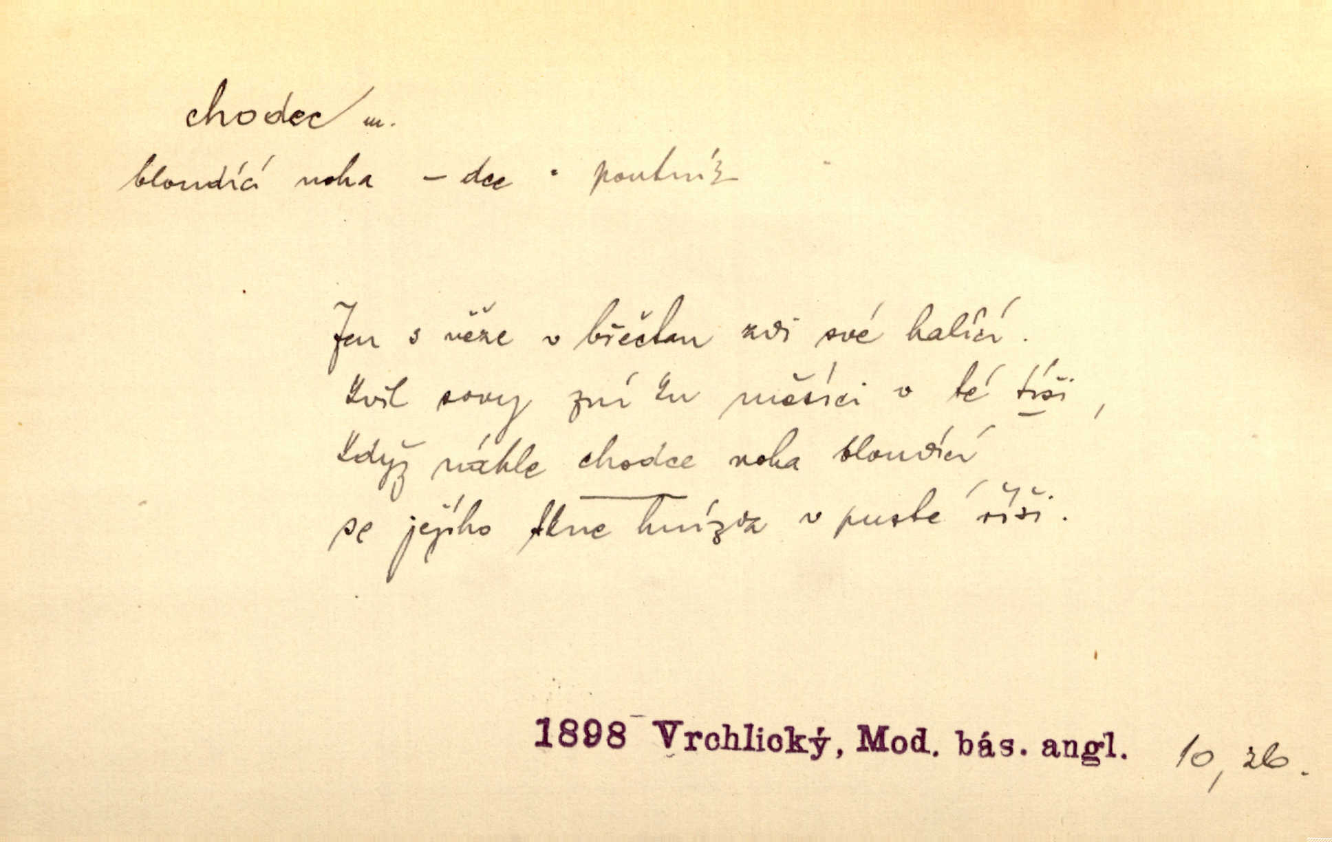 - chodec, -dce m. jdoucí, chodící n. cestu konající člověk, poutník, pocestný. Slyším kroky, ale nezradí chodce zrakům štíhlé kapradí. Krás. Zraky všech utkvěly jaksi s podivením na nočních chodcích. Zey. Muž vysoký, znamenitý chodec. Jir. Měli jsme v naší četě jednoho chodce po provaze. Lang.