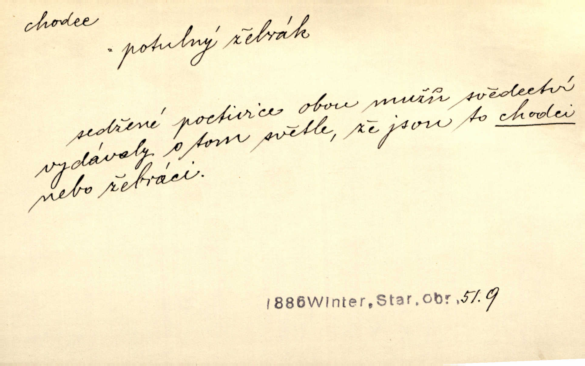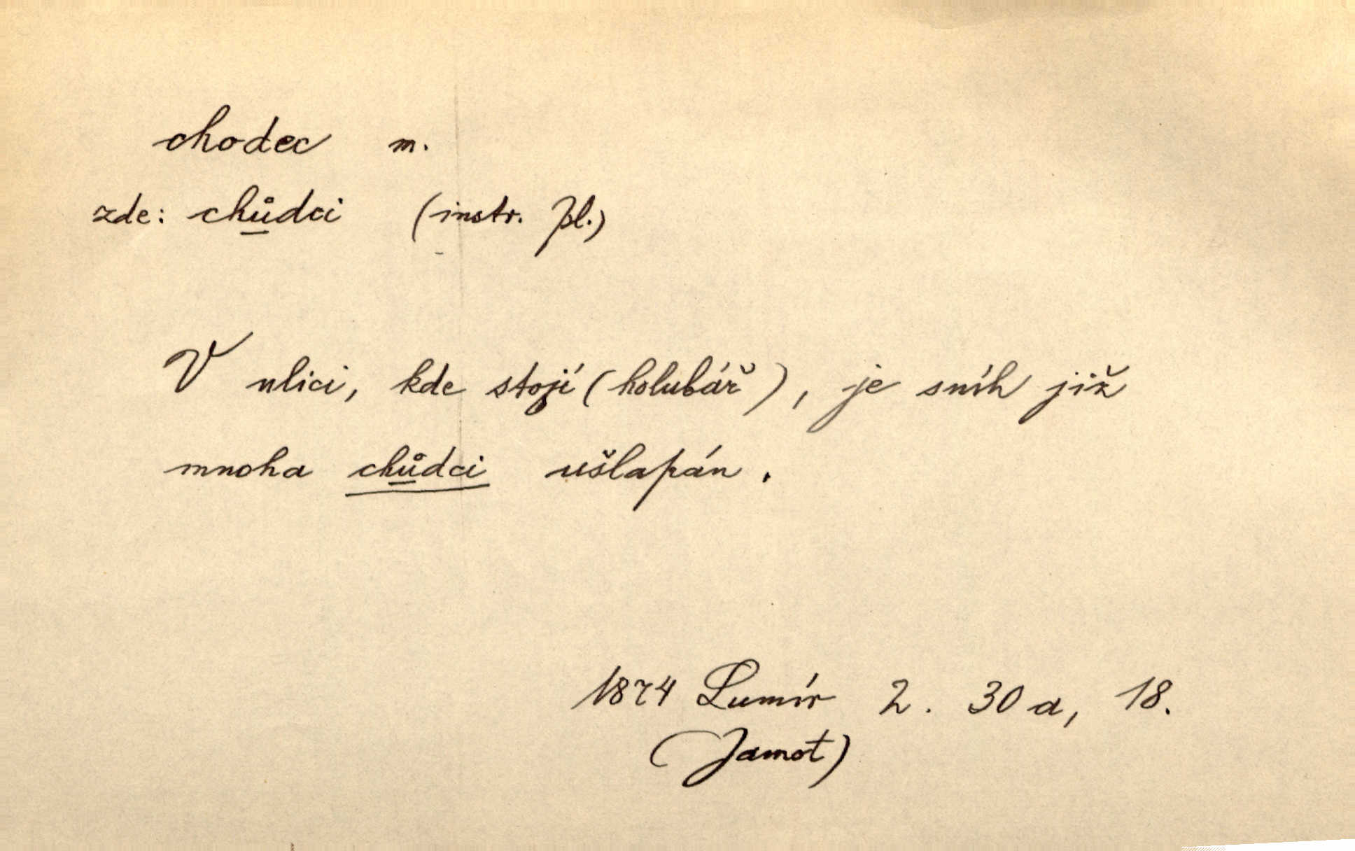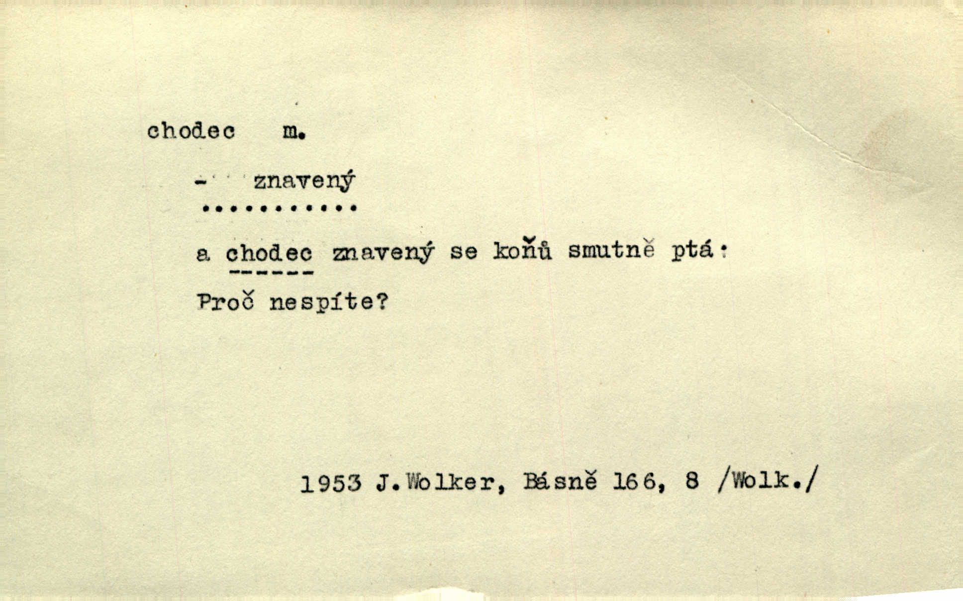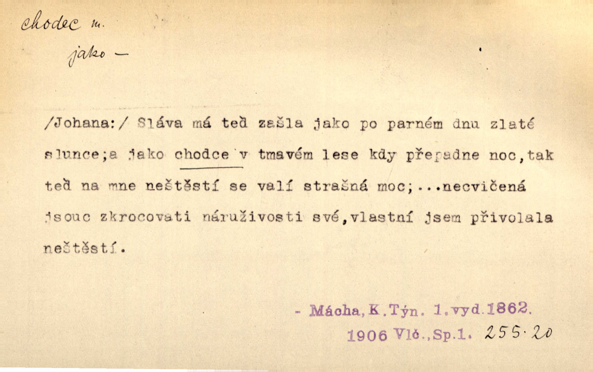 - chodec, -dce m. jdoucí, chodící n. cestu konající člověk, poutník, pocestný. Slyším kroky, ale nezradí chodce zrakům štíhlé kapradí. Krás. Zraky všech utkvěly jaksi s podivením na nočních chodcích. Zey. Muž vysoký, znamenitý chodec. Jir. Měli jsme v naší četě jednoho chodce po provaze. Lang.