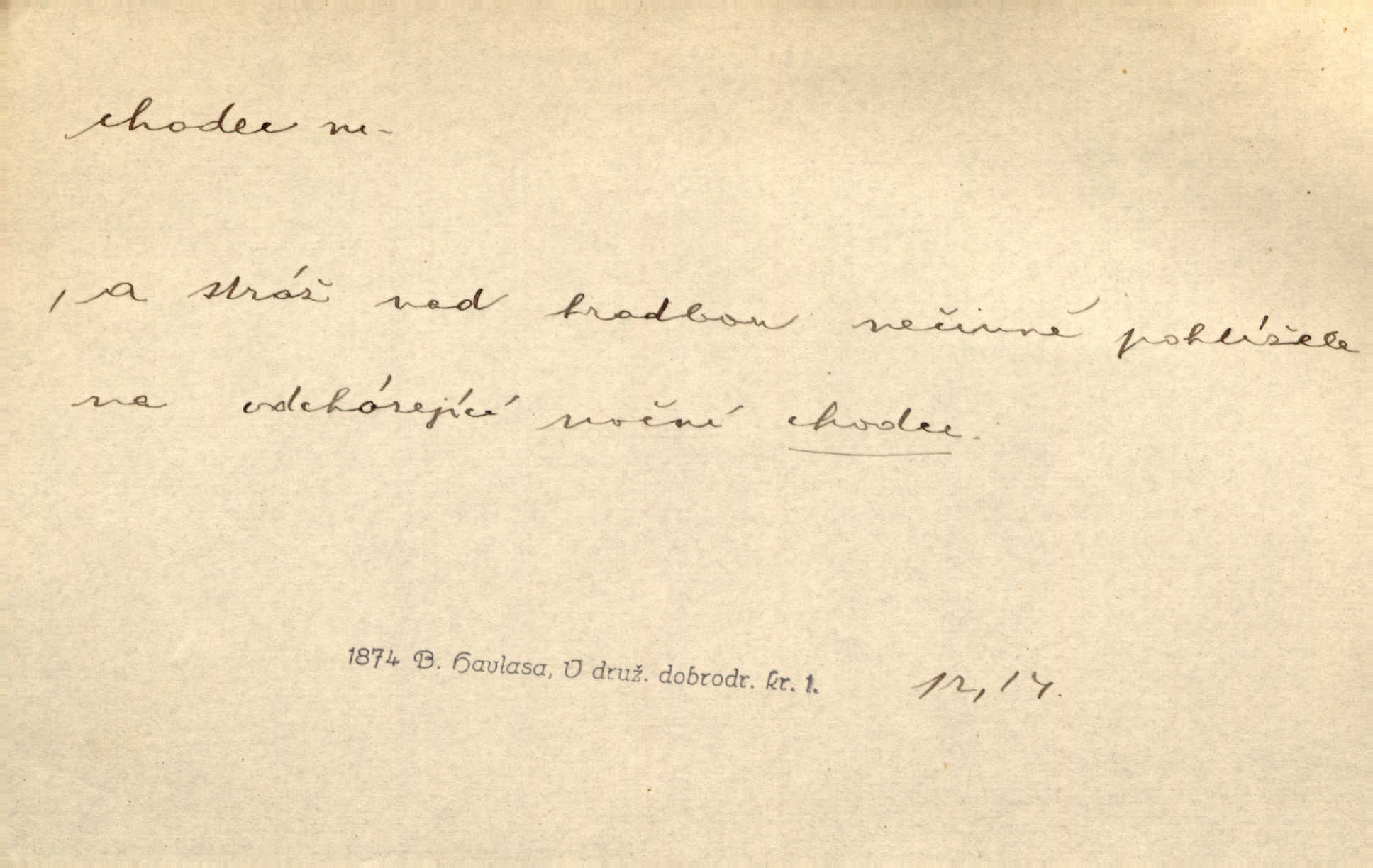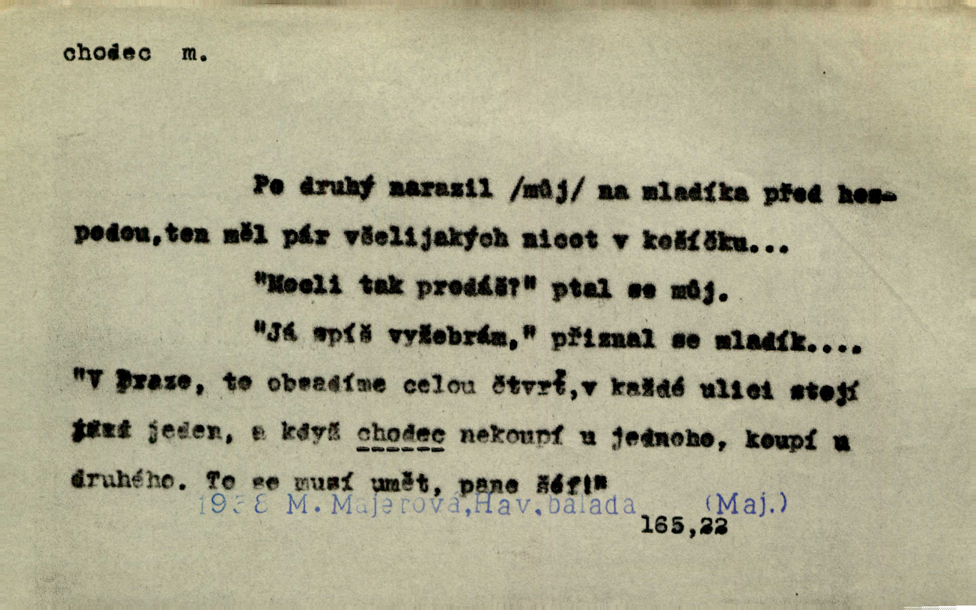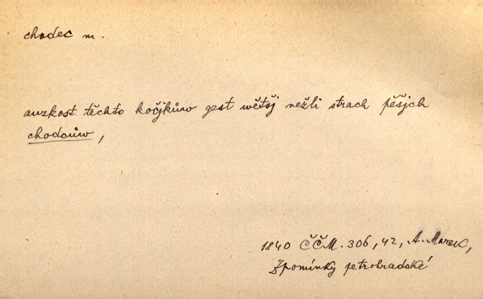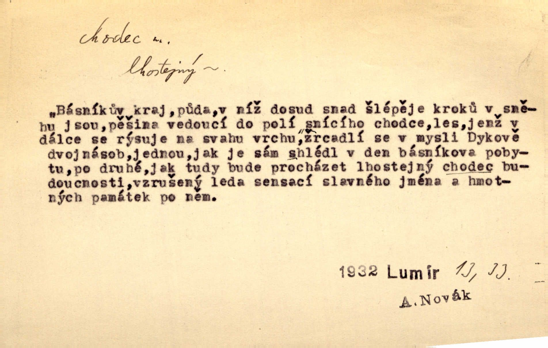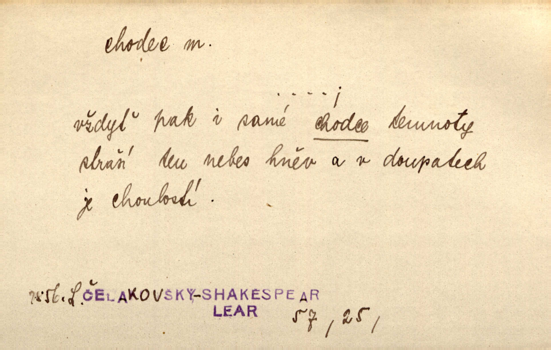 - chodec, -dce m. jdoucí, chodící n. cestu konající člověk, poutník, pocestný. Slyším kroky, ale nezradí chodce zrakům štíhlé kapradí. Krás. Zraky všech utkvěly jaksi s podivením na nočních chodcích. Zey. Muž vysoký, znamenitý chodec. Jir. Měli jsme v naší četě jednoho chodce po provaze. Lang.