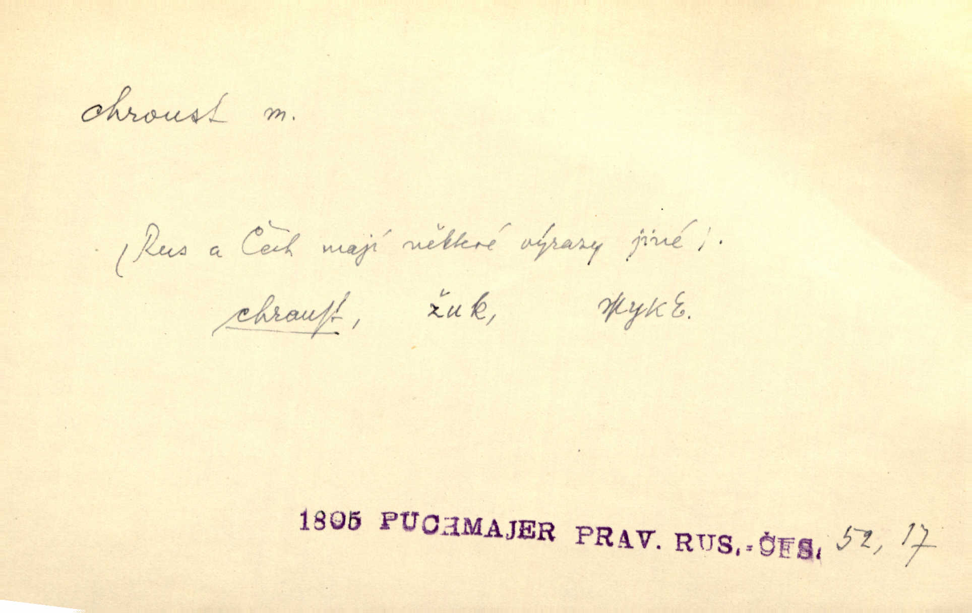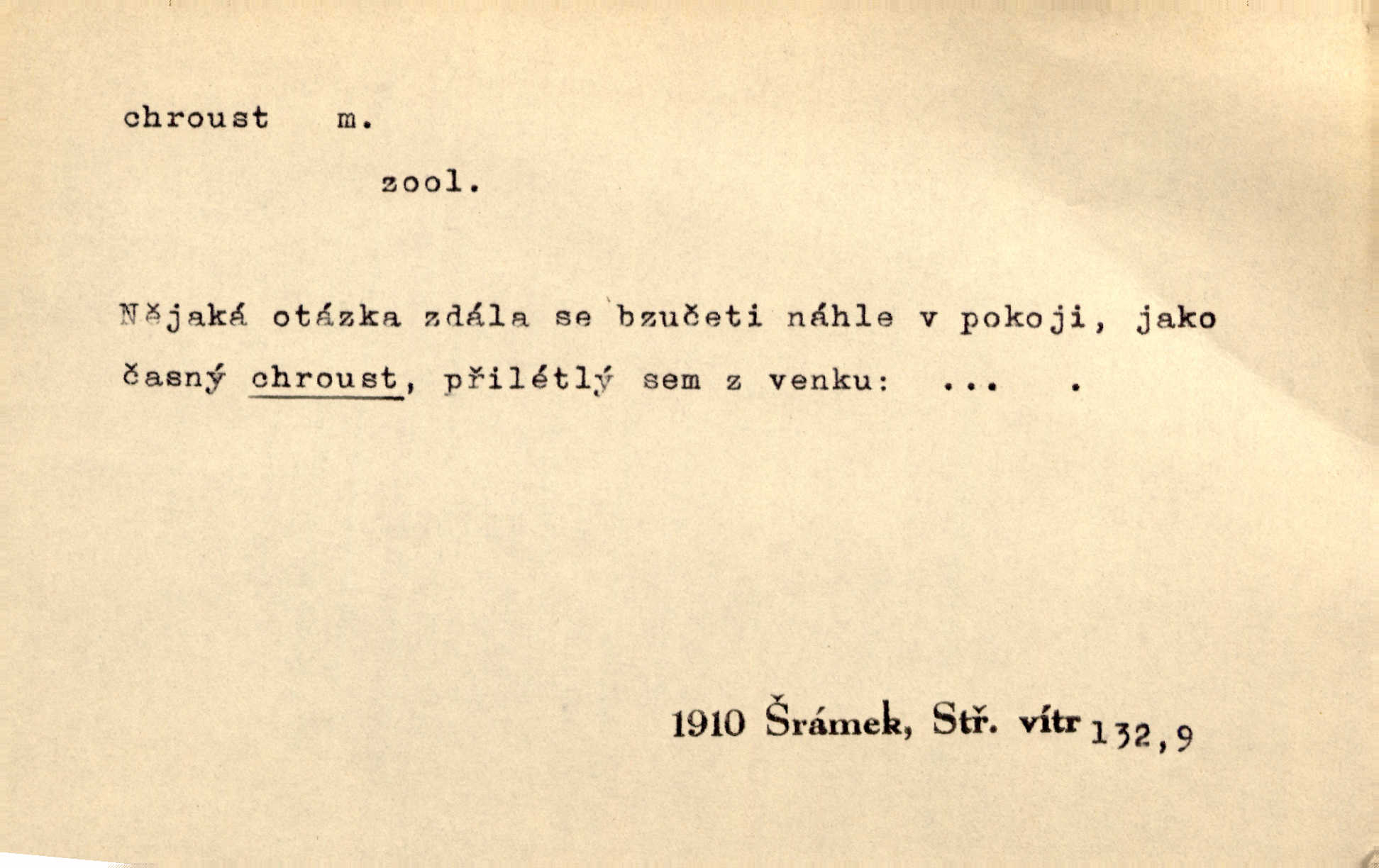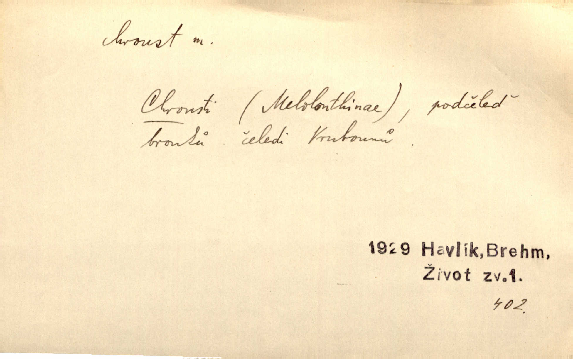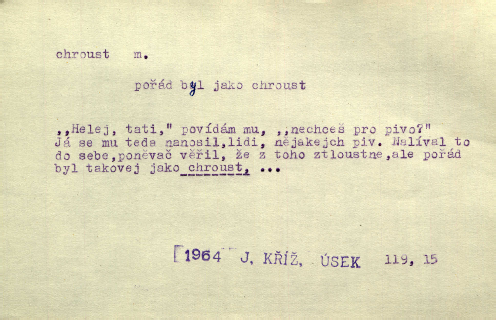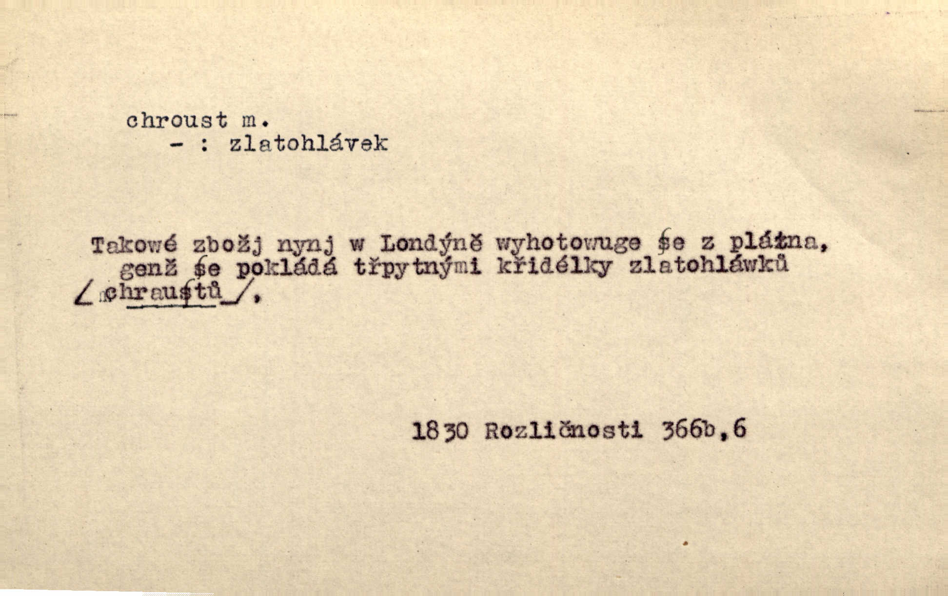 - chroust, -a m. zool. brouk z čeledi chrobáků. Chroust obecný čili babka (Melolontha vulgaris). Čápka sama jako chroust. Kdyby jedla třebas tisíckrát za den, přece jí to nic není platný; pořád jako puntík. V. Mrš. D člověk hubený n. slabý. Ten toho zmůže, ten chroust! Klost.