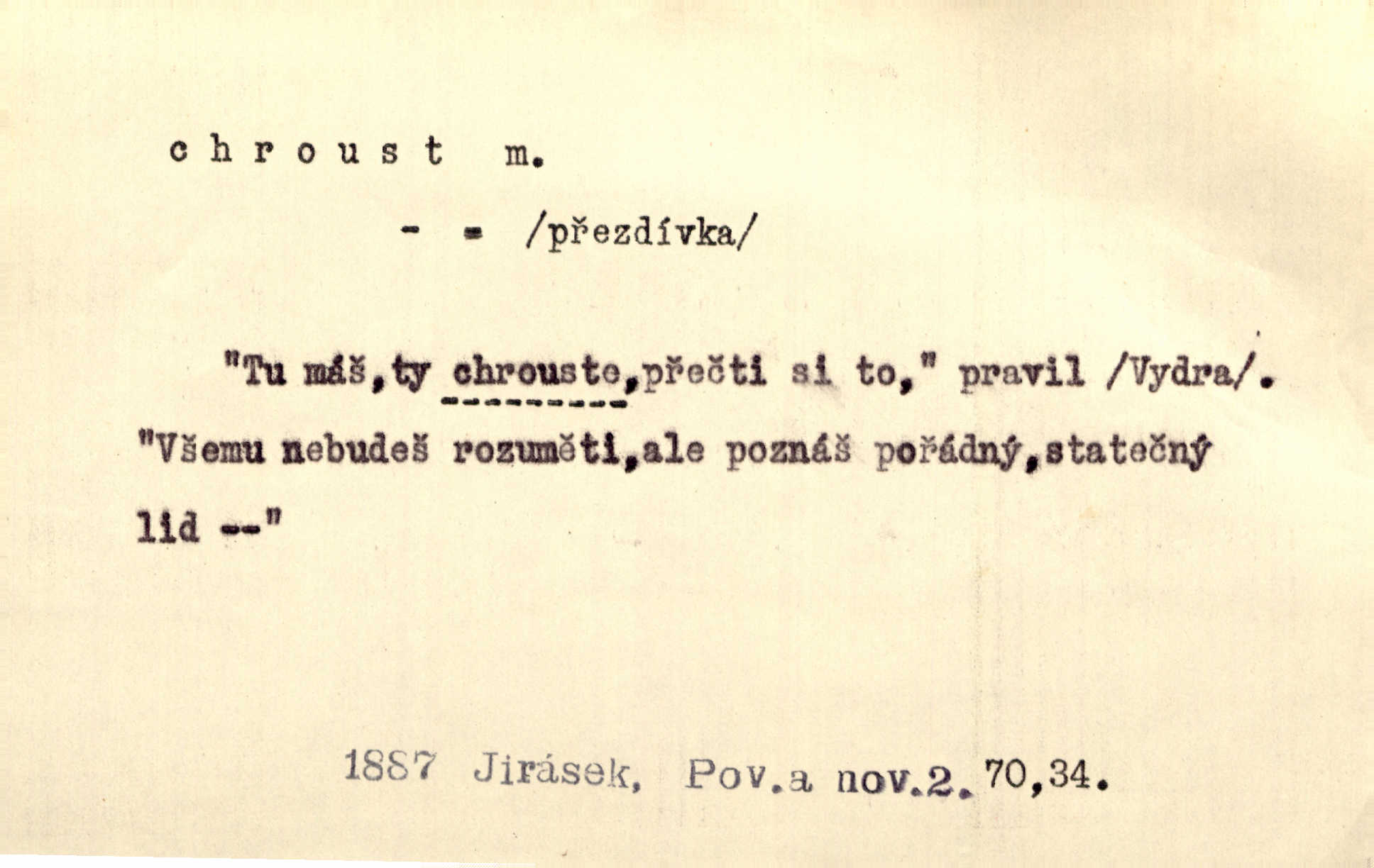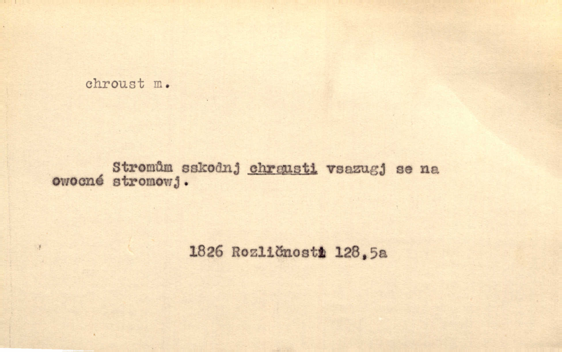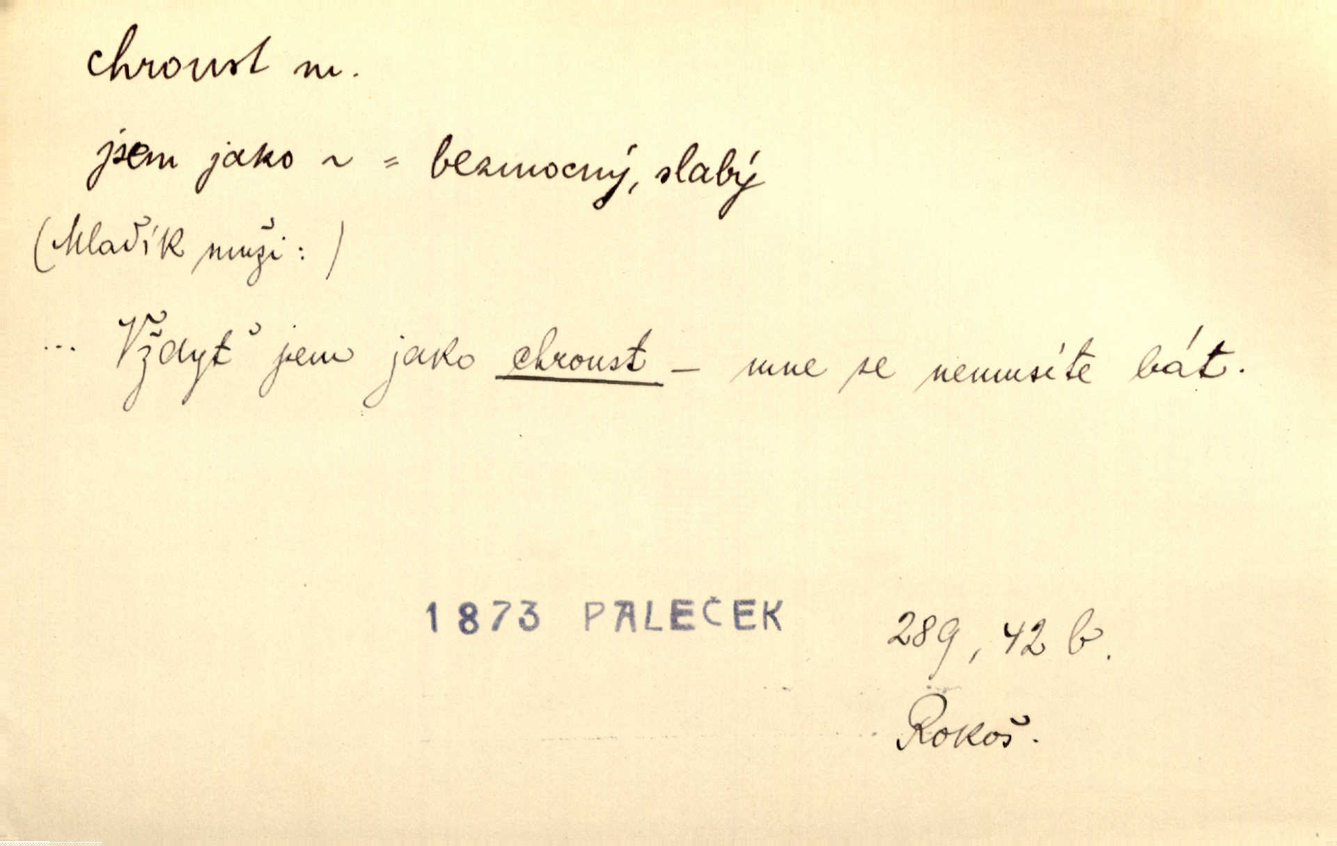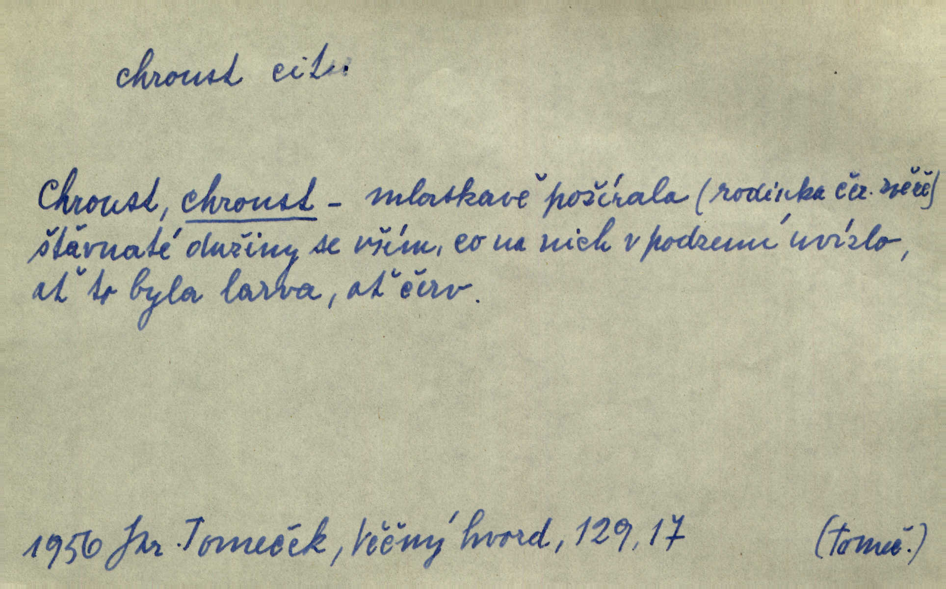 - chroust, -a m. zool. brouk z čeledi chrobáků. Chroust obecný čili babka (Melolontha vulgaris). Čápka sama jako chroust. Kdyby jedla třebas tisíckrát za den, přece jí to nic není platný; pořád jako puntík. V. Mrš. D člověk hubený n. slabý. Ten toho zmůže, ten chroust! Klost.