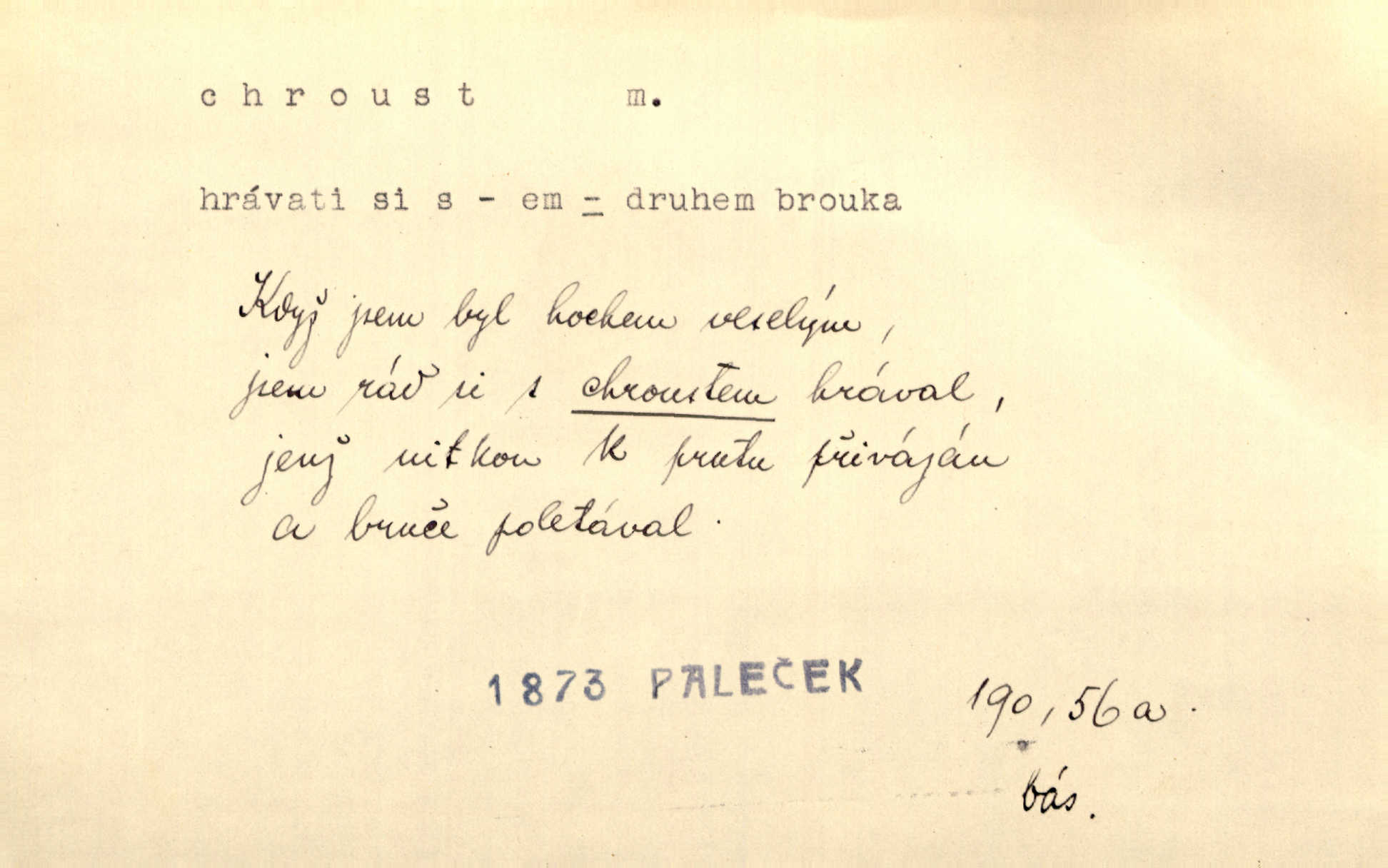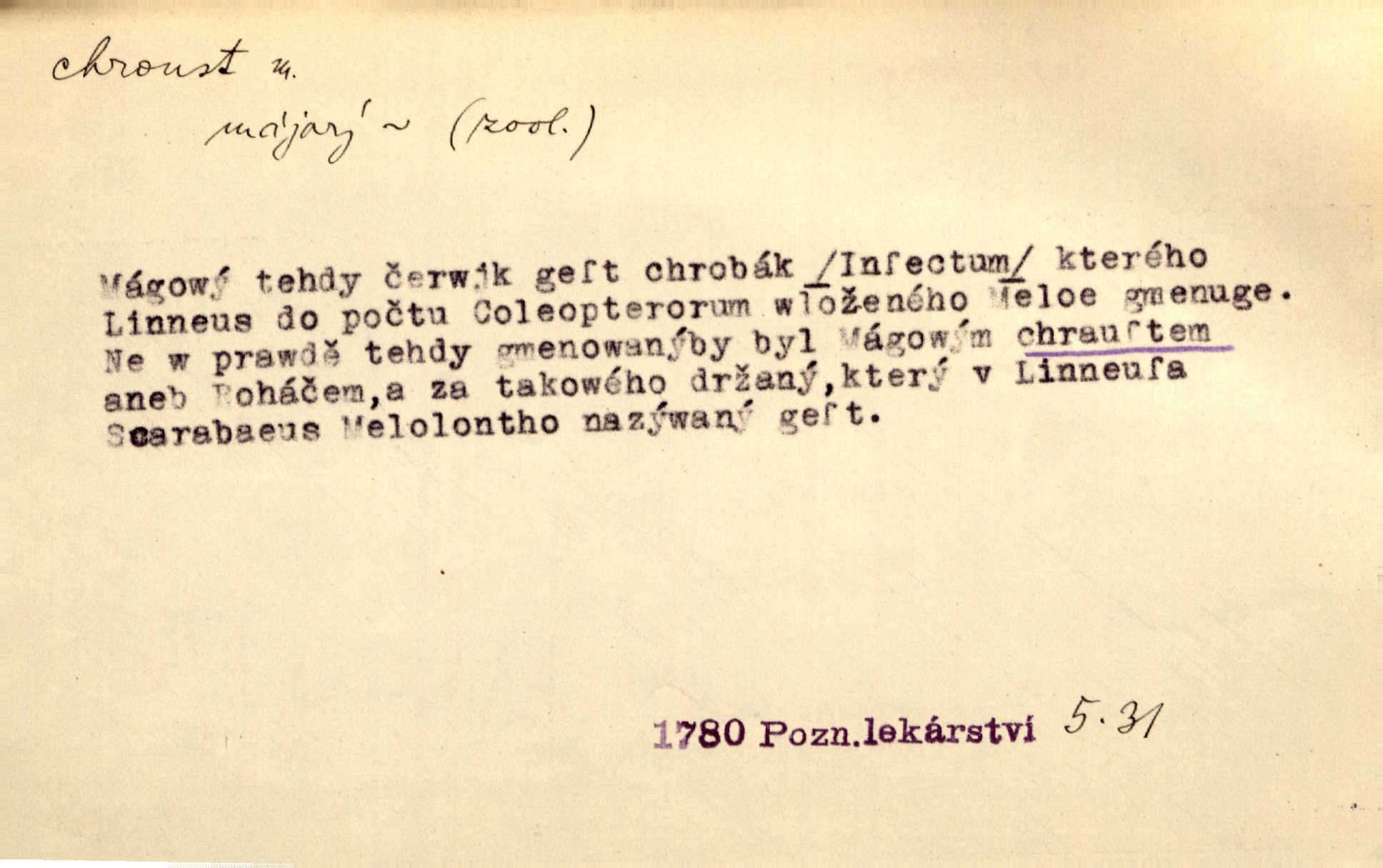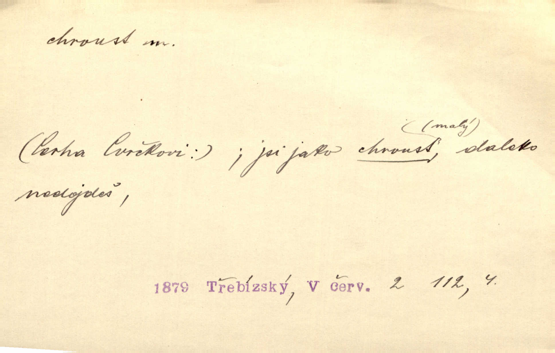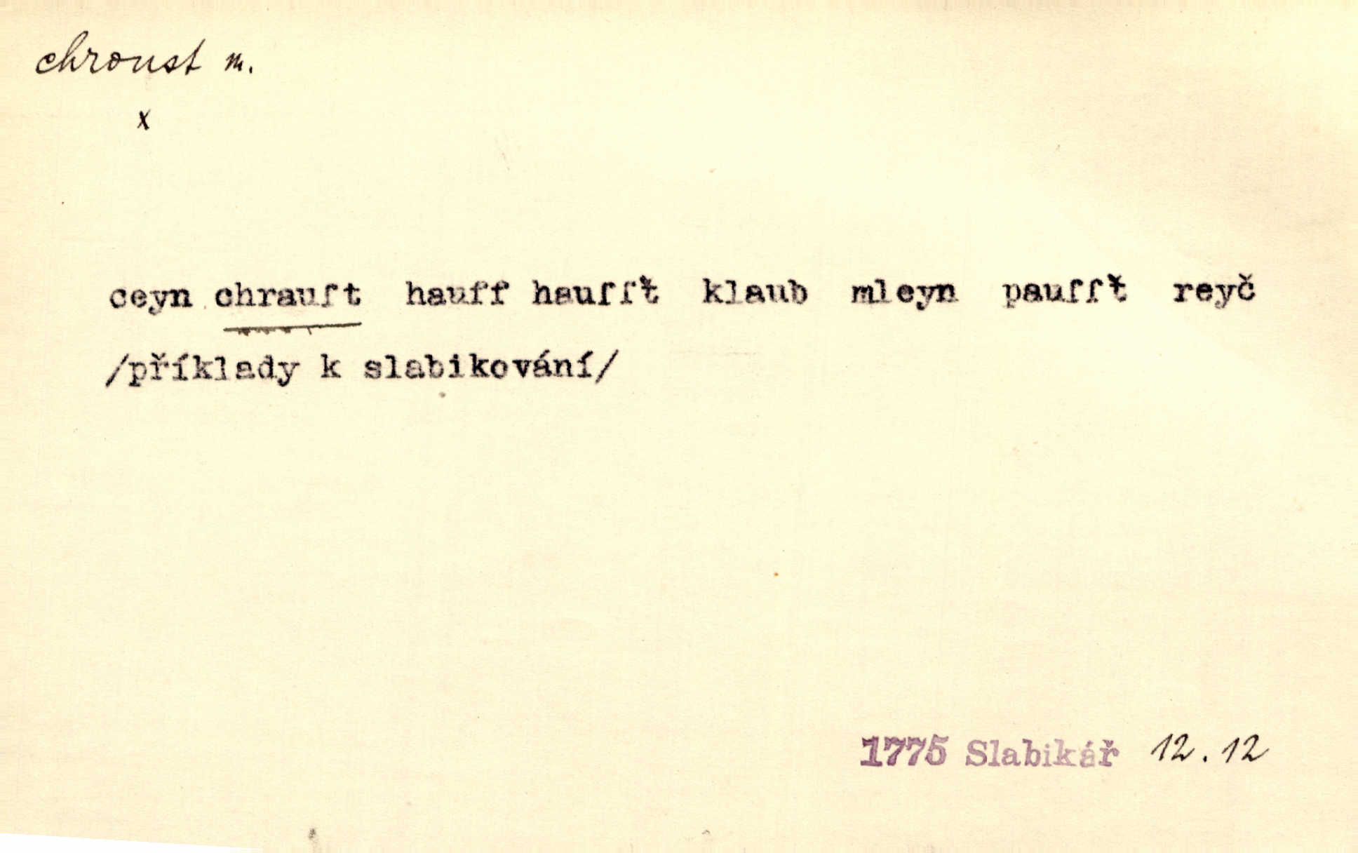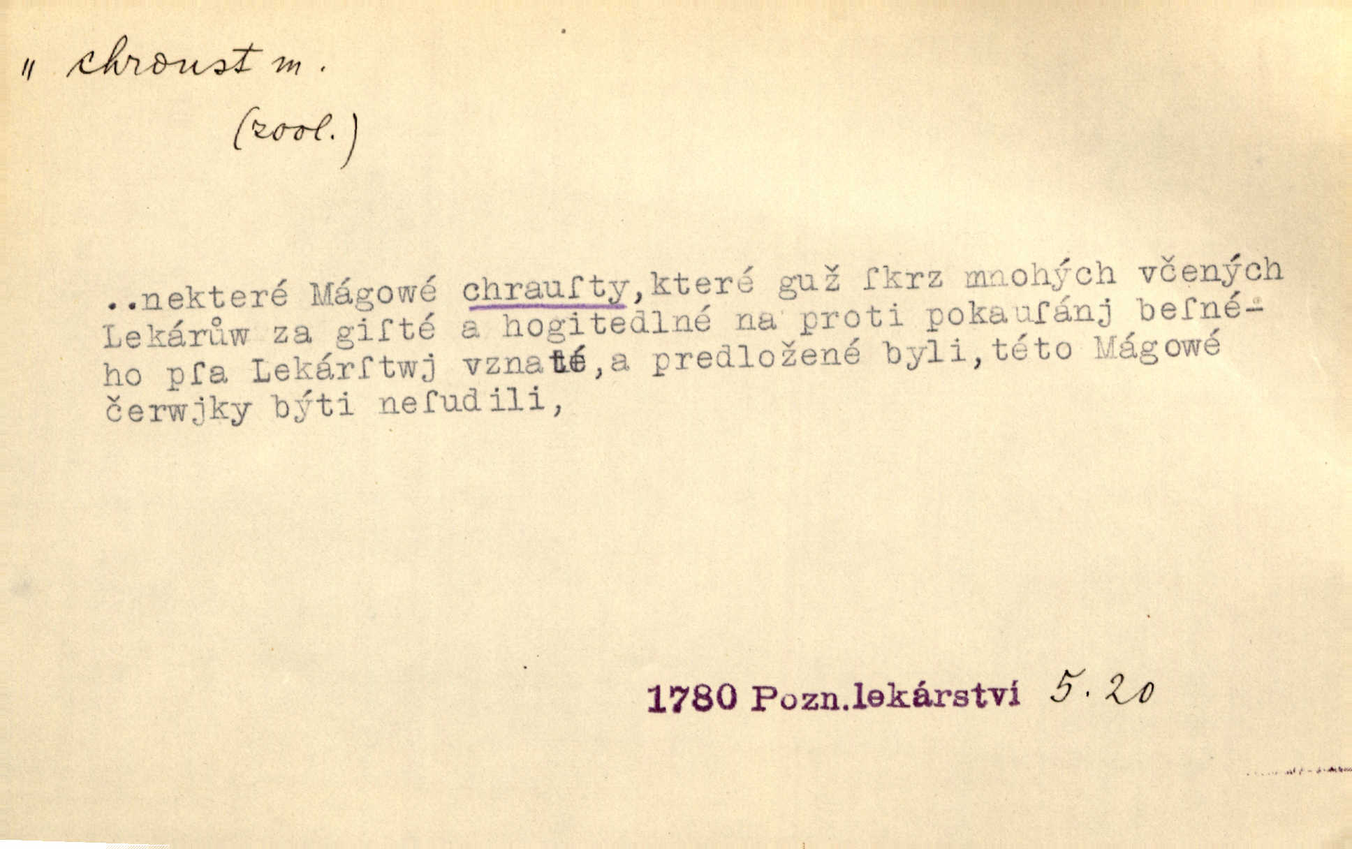 - chroust, -a m. zool. brouk z čeledi chrobáků. Chroust obecný čili babka (Melolontha vulgaris). Čápka sama jako chroust. Kdyby jedla třebas tisíckrát za den, přece jí to nic není platný; pořád jako puntík. V. Mrš. D člověk hubený n. slabý. Ten toho zmůže, ten chroust! Klost.