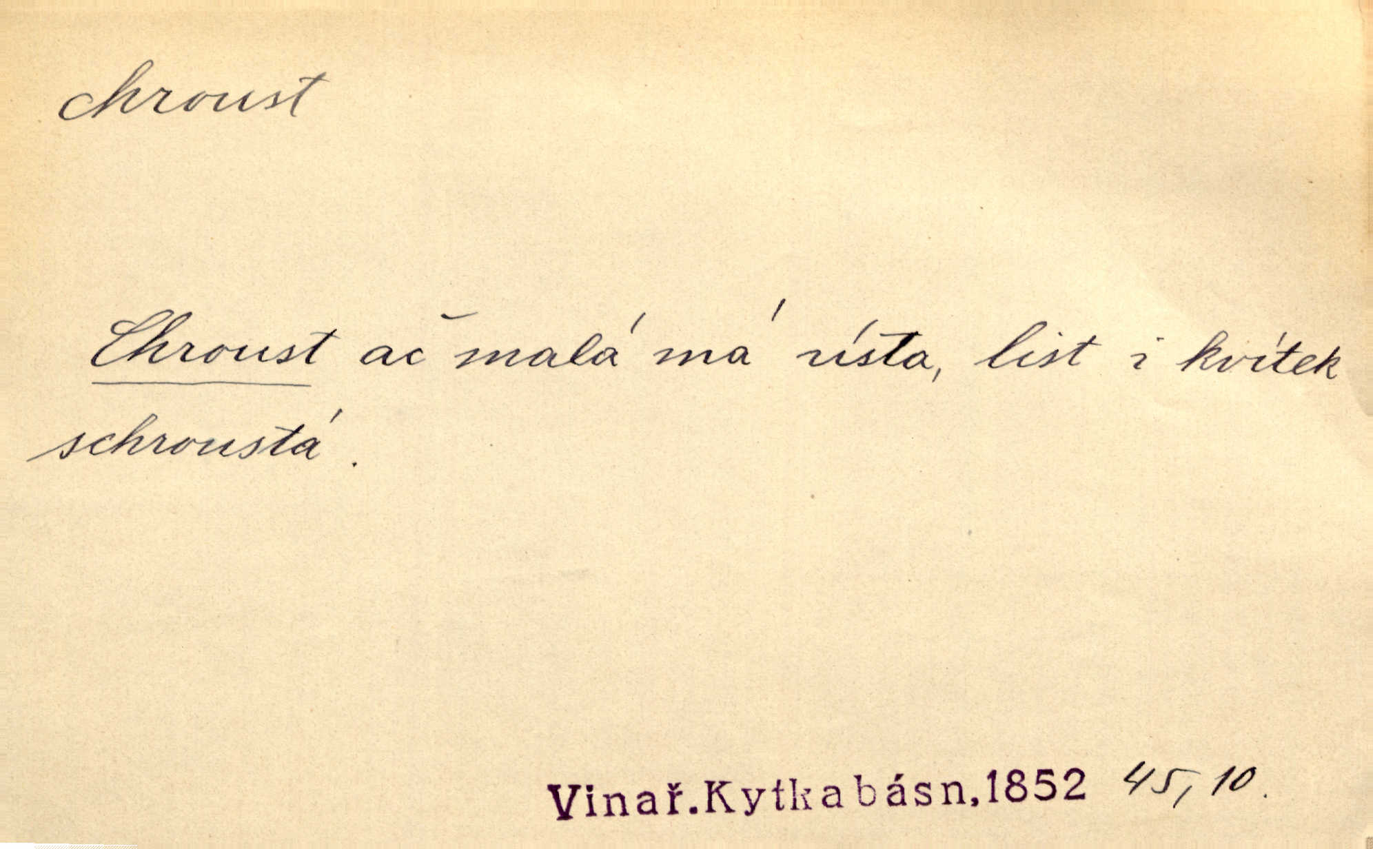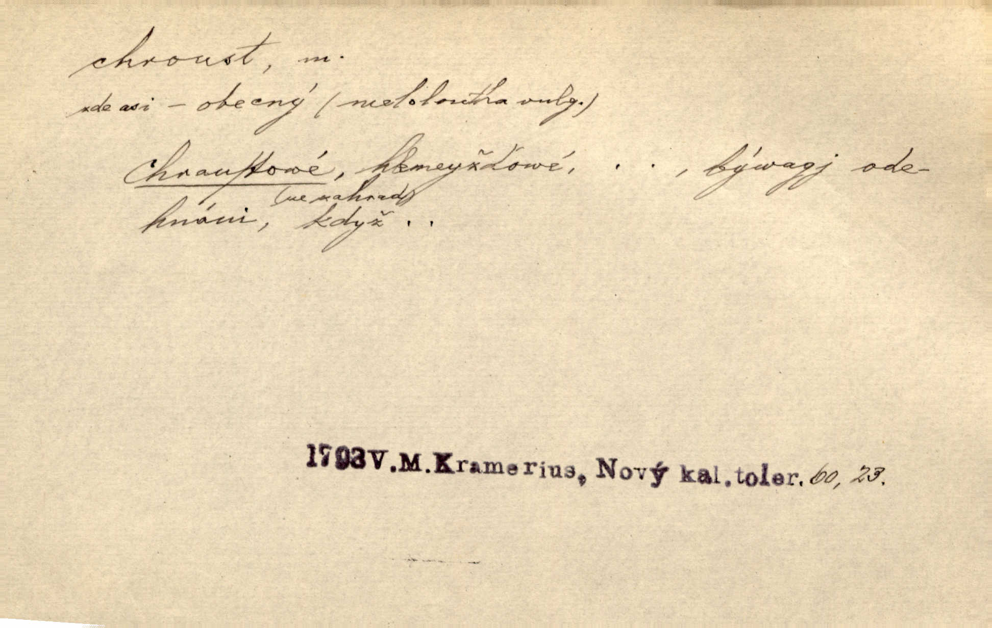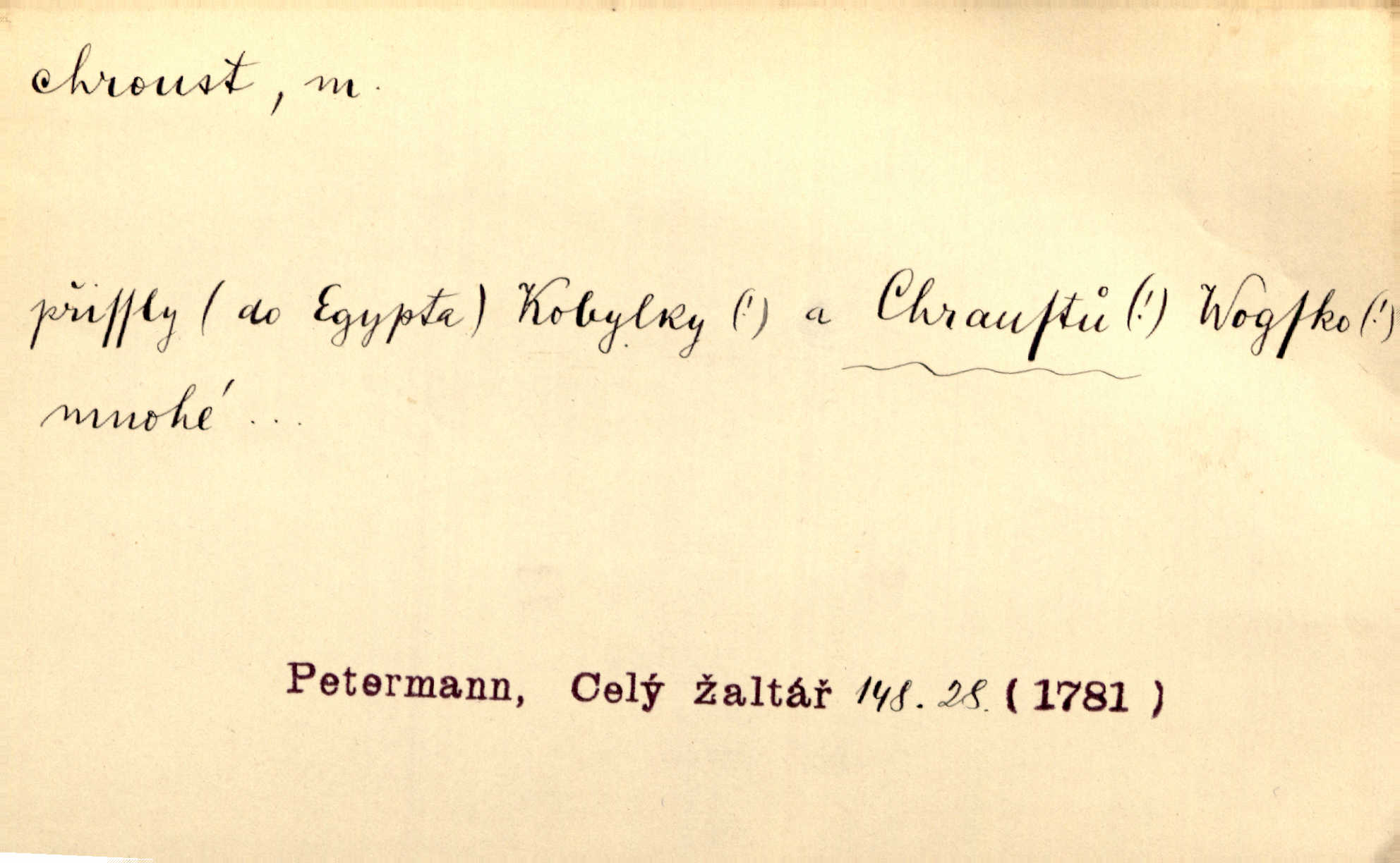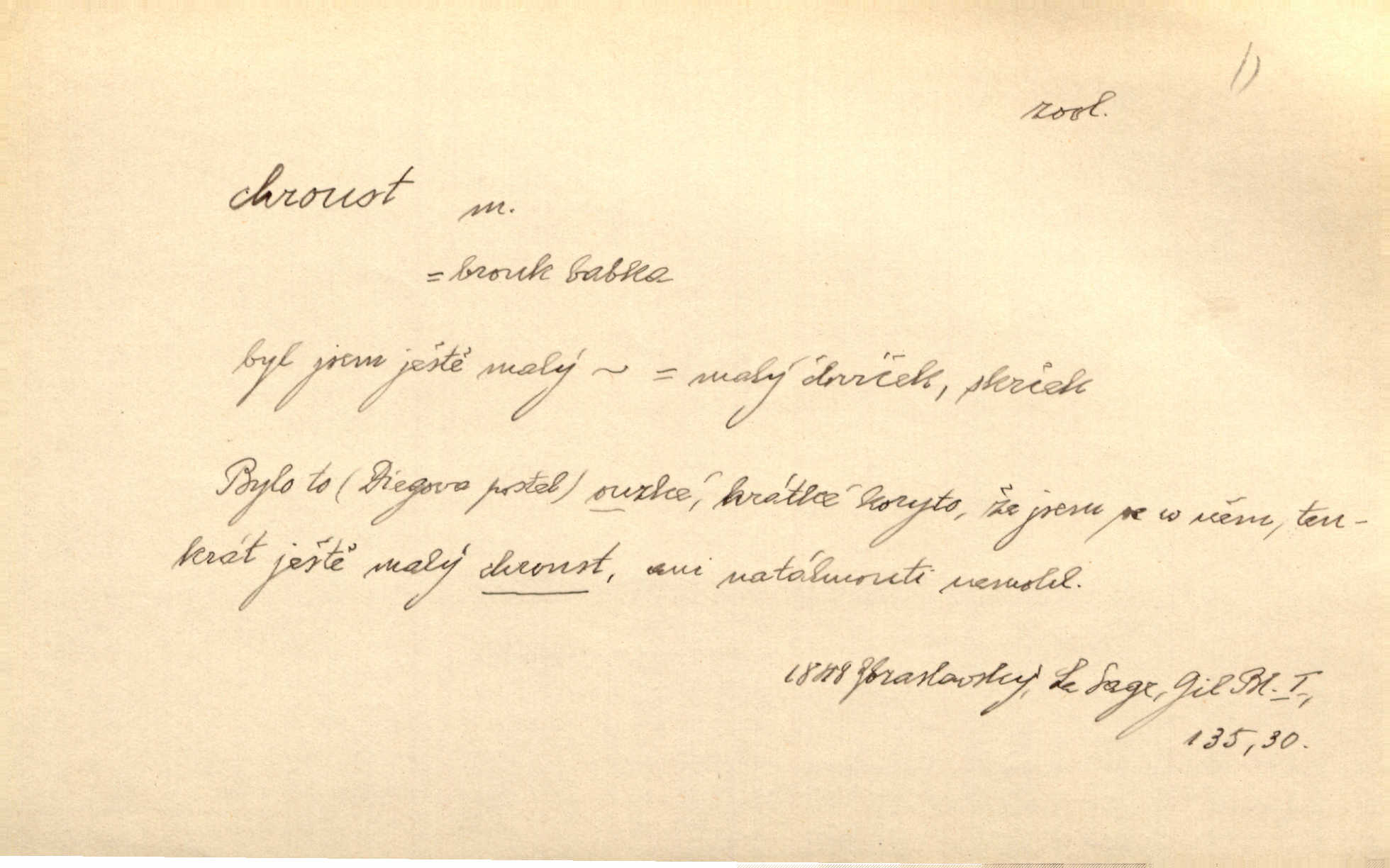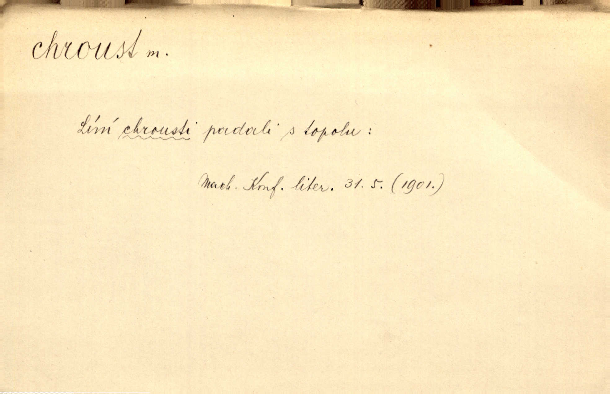 - chroust, -a m. zool. brouk z čeledi chrobáků. Chroust obecný čili babka (Melolontha vulgaris). Čápka sama jako chroust. Kdyby jedla třebas tisíckrát za den, přece jí to nic není platný; pořád jako puntík. V. Mrš. D člověk hubený n. slabý. Ten toho zmůže, ten chroust! Klost.