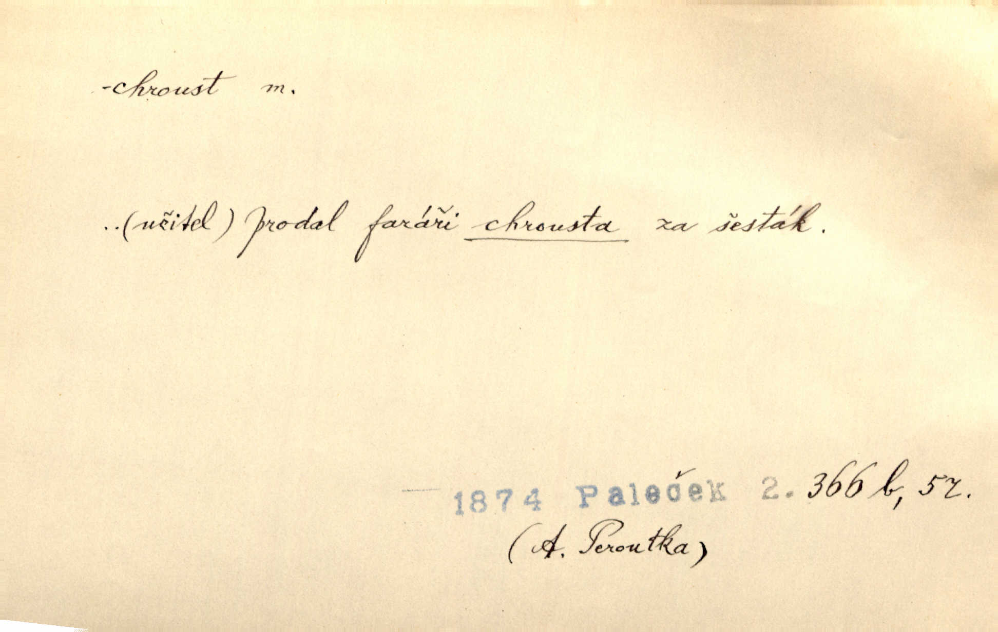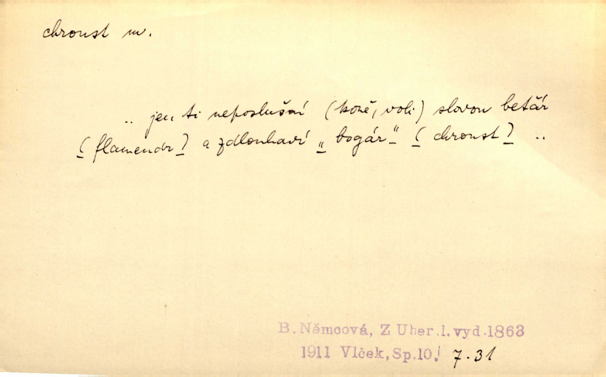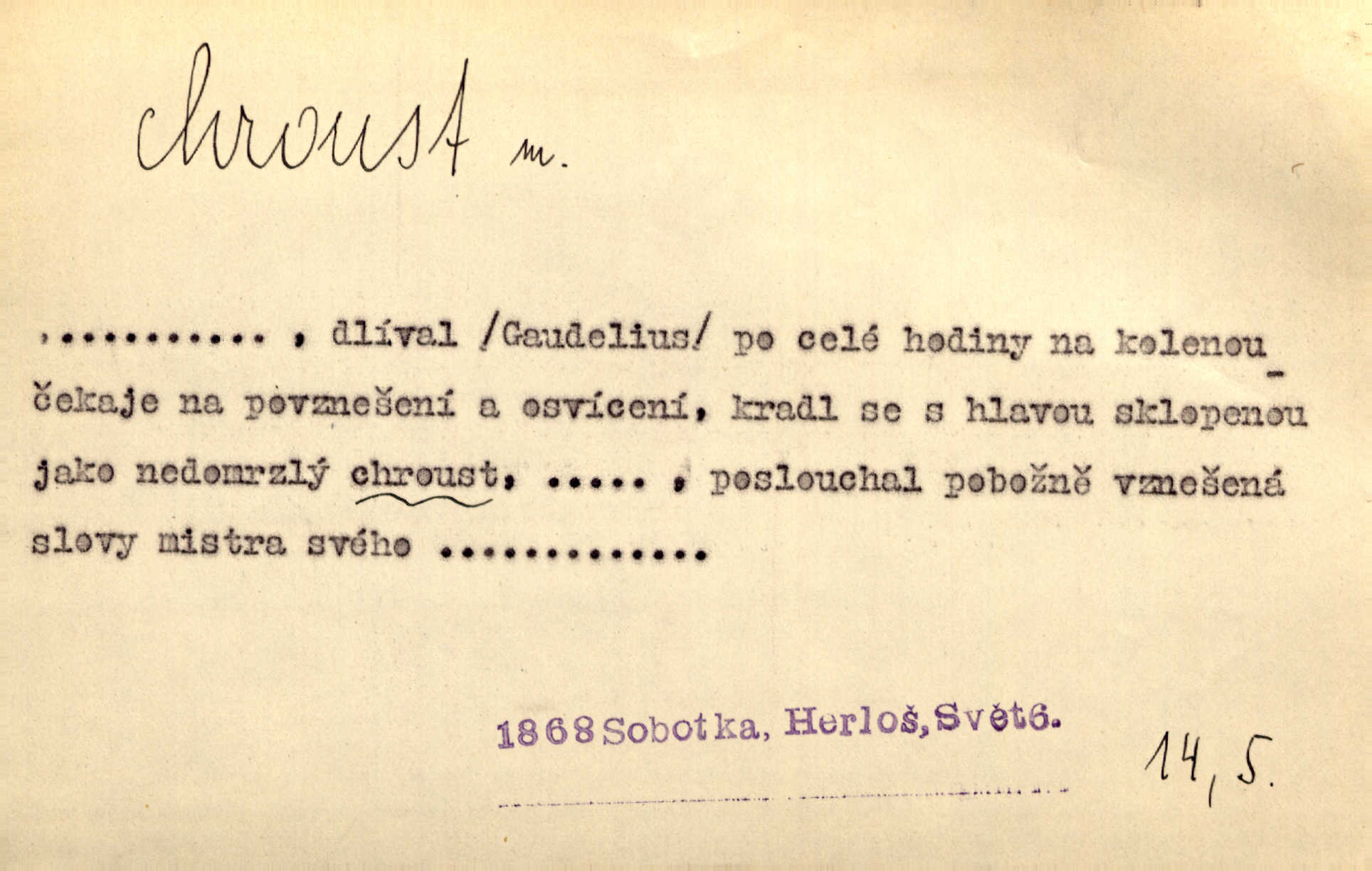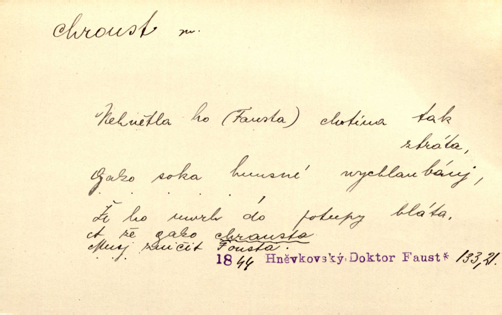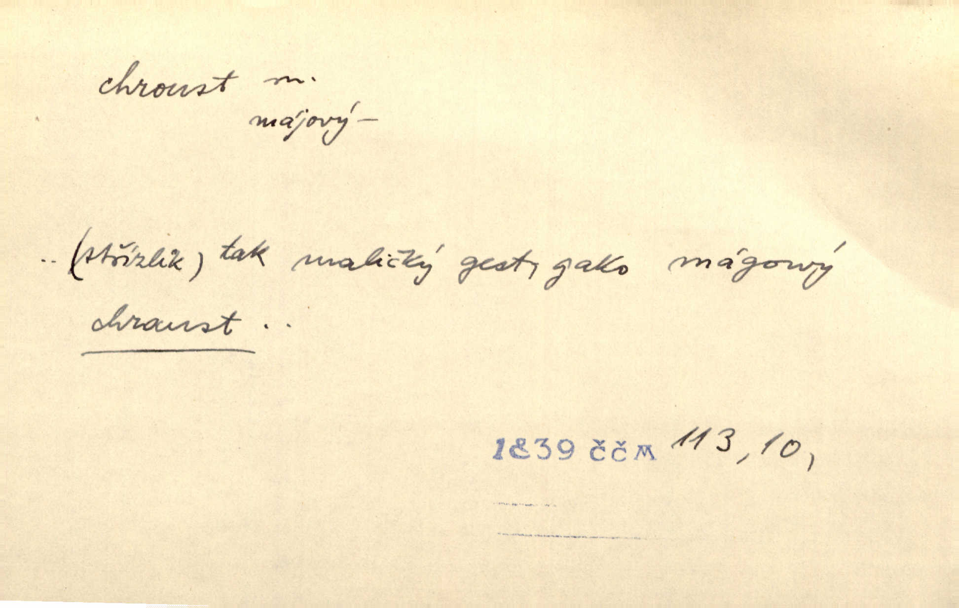 - chroust, -a m. zool. brouk z čeledi chrobáků. Chroust obecný čili babka (Melolontha vulgaris). Čápka sama jako chroust. Kdyby jedla třebas tisíckrát za den, přece jí to nic není platný; pořád jako puntík. V. Mrš. D člověk hubený n. slabý. Ten toho zmůže, ten chroust! Klost.