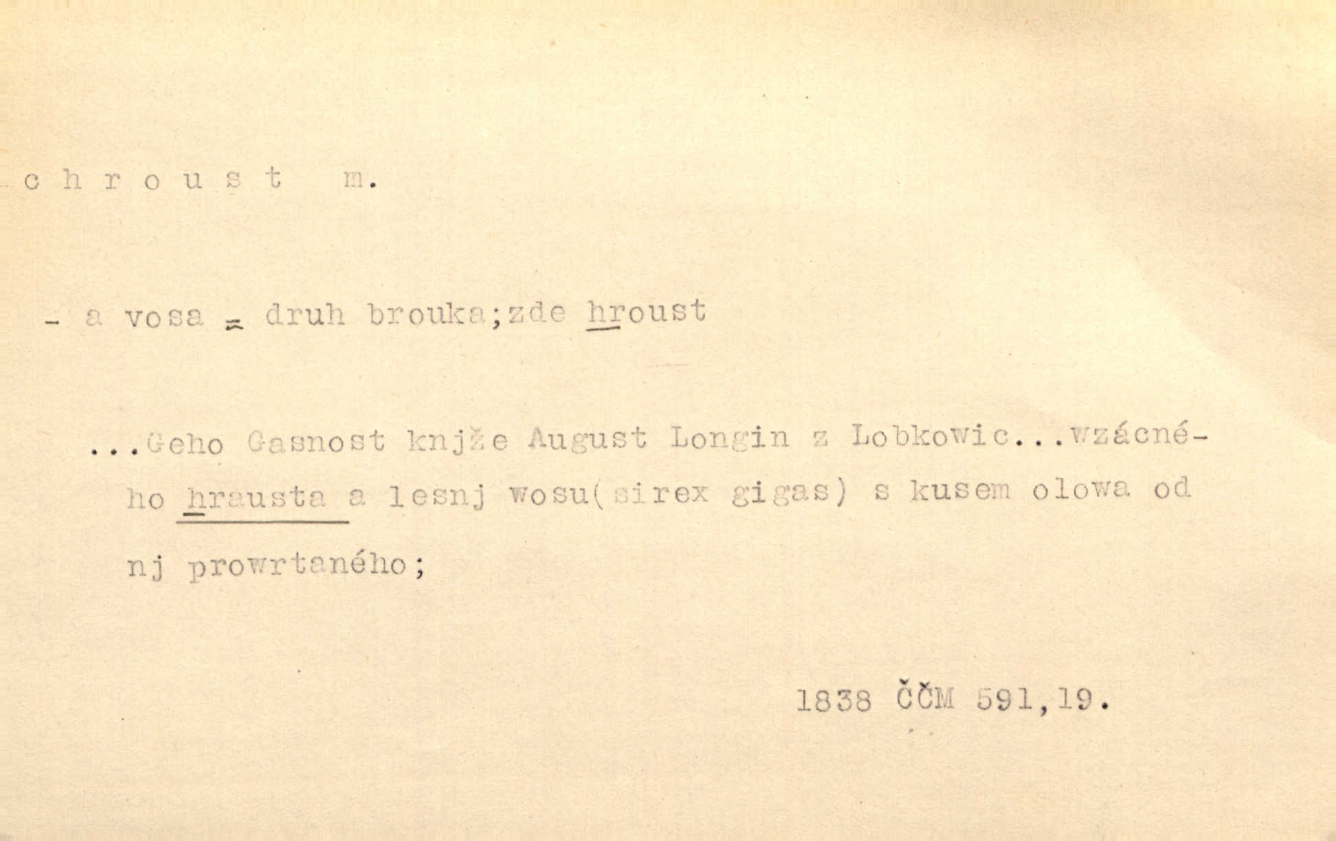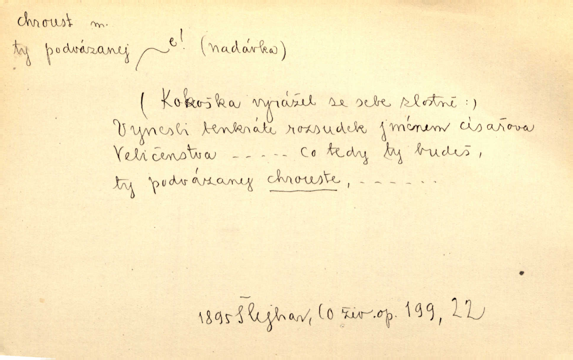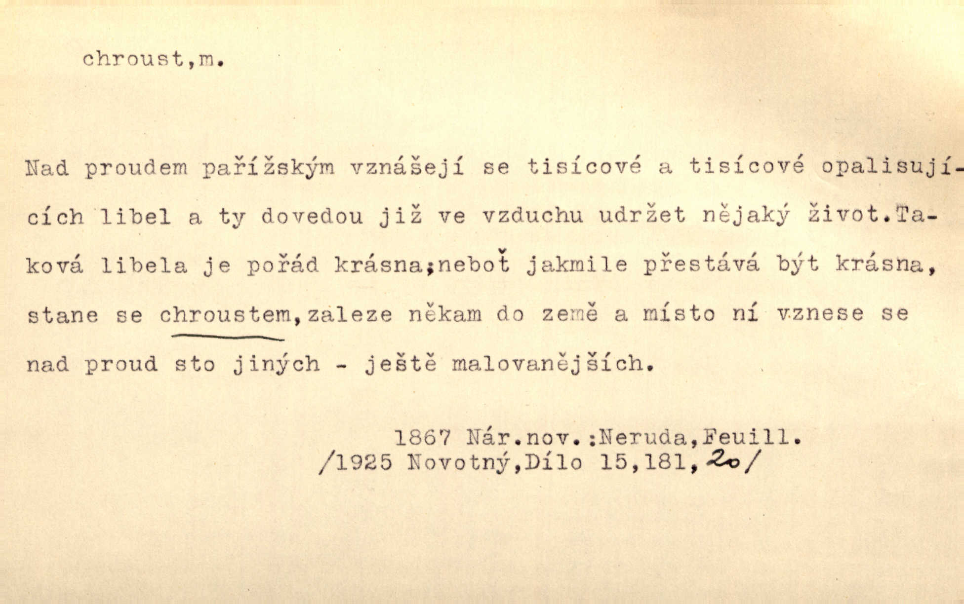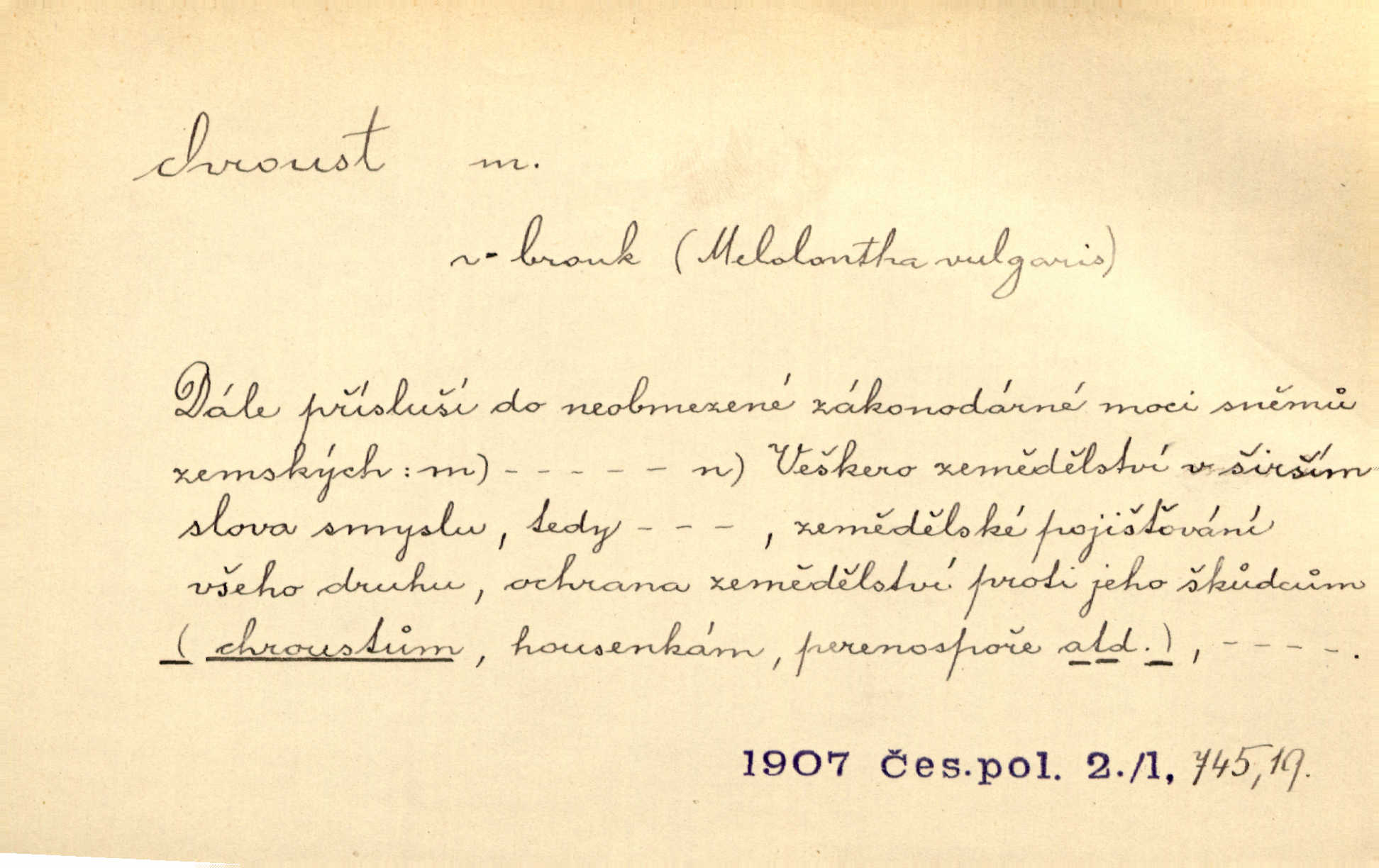 - chroust, -a m. zool. brouk z čeledi chrobáků. Chroust obecný čili babka (Melolontha vulgaris). Čápka sama jako chroust. Kdyby jedla třebas tisíckrát za den, přece jí to nic není platný; pořád jako puntík. V. Mrš. D člověk hubený n. slabý. Ten toho zmůže, ten chroust! Klost.
