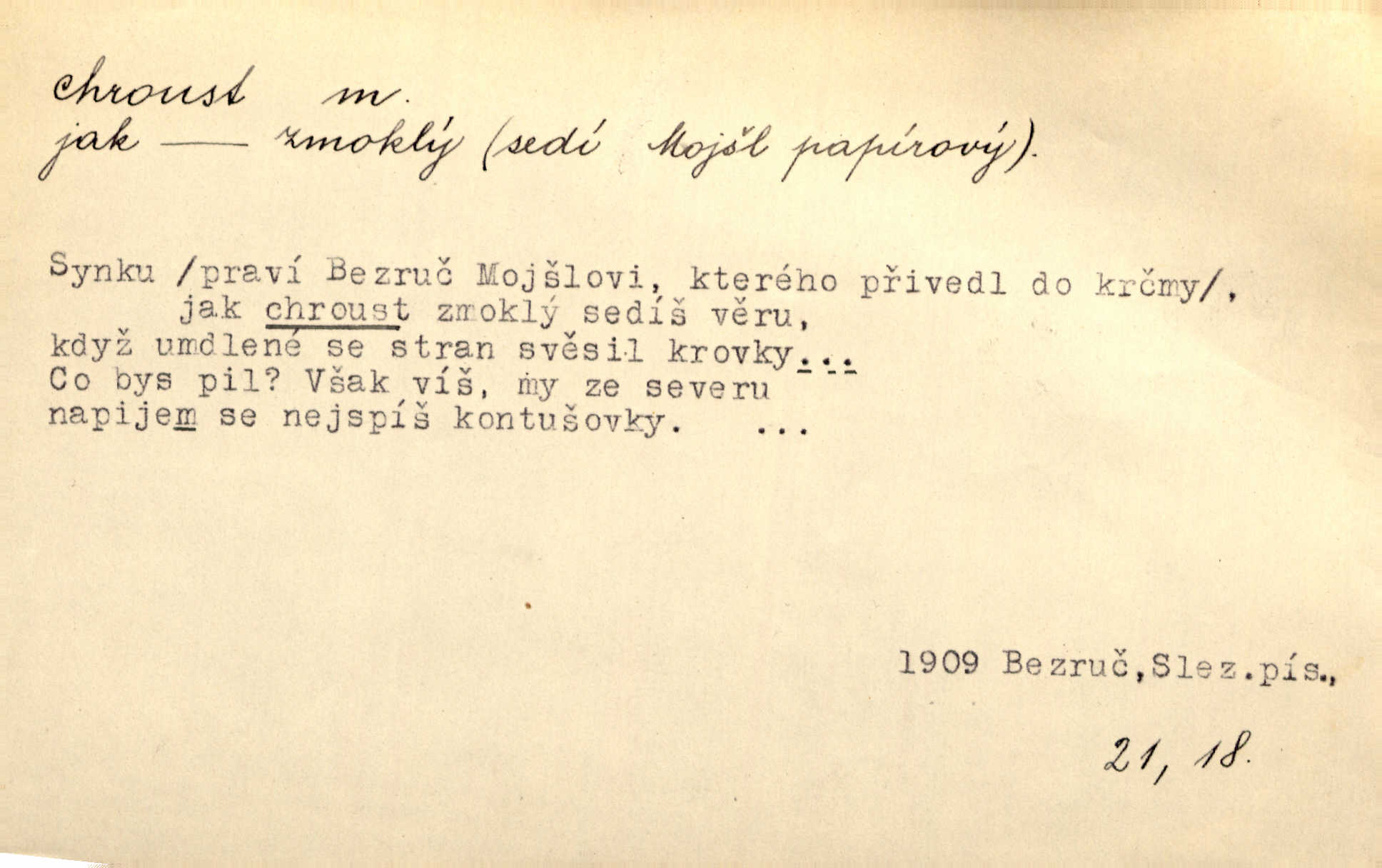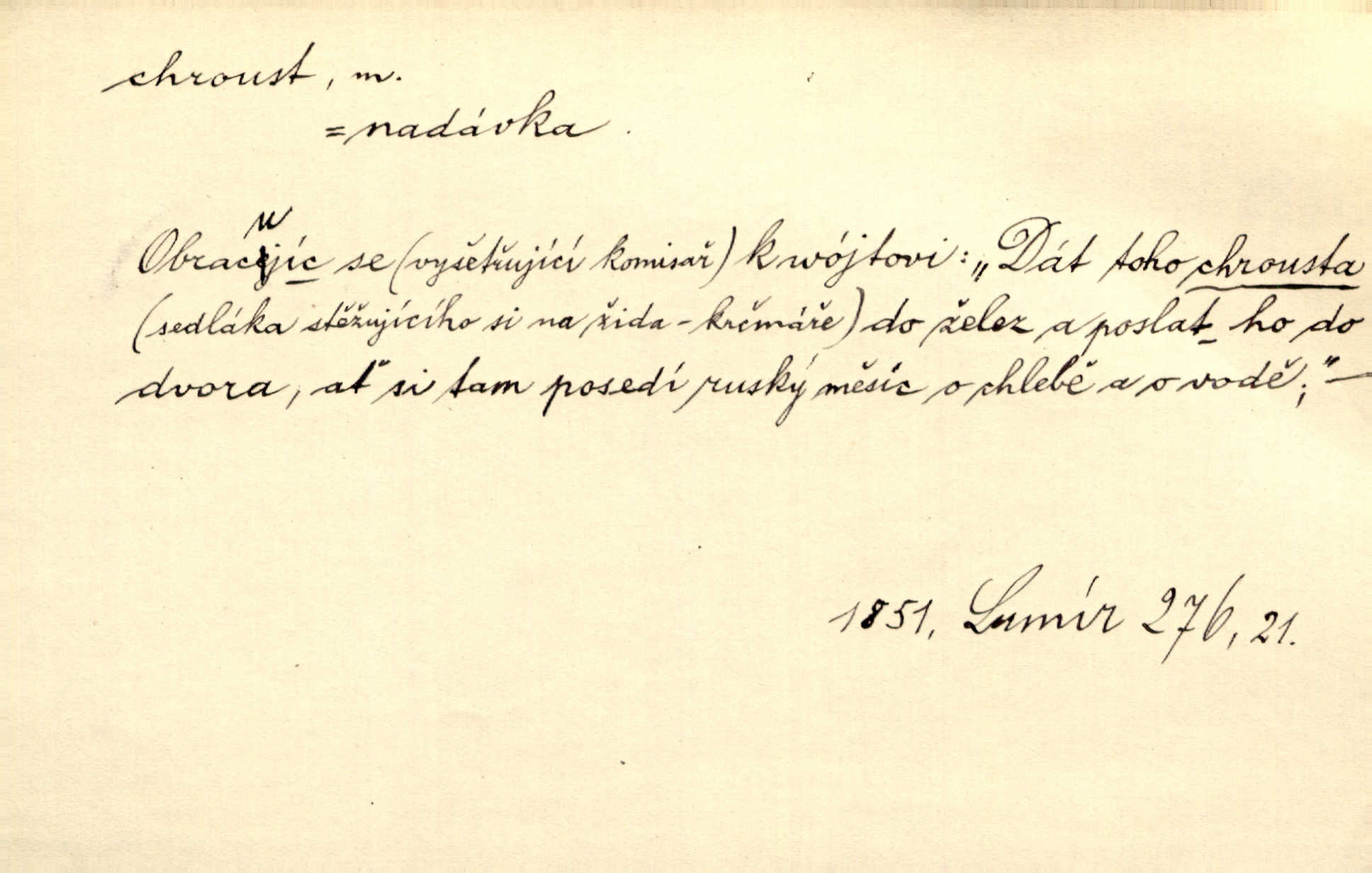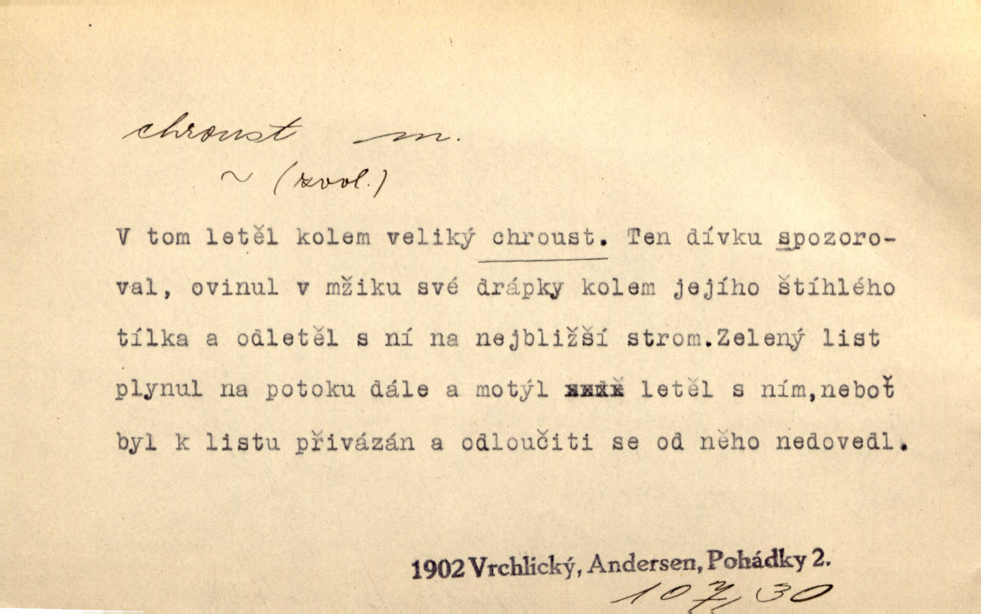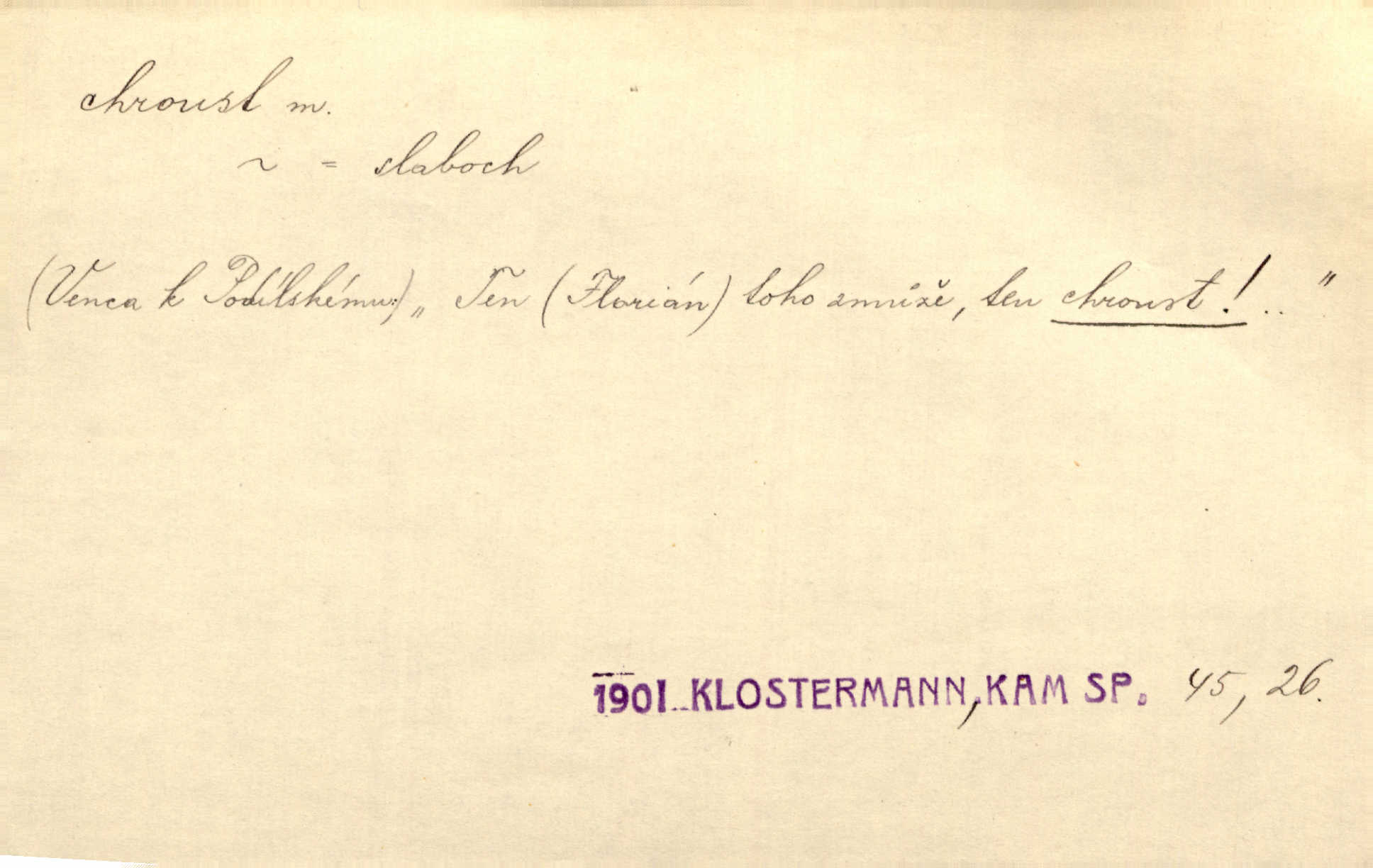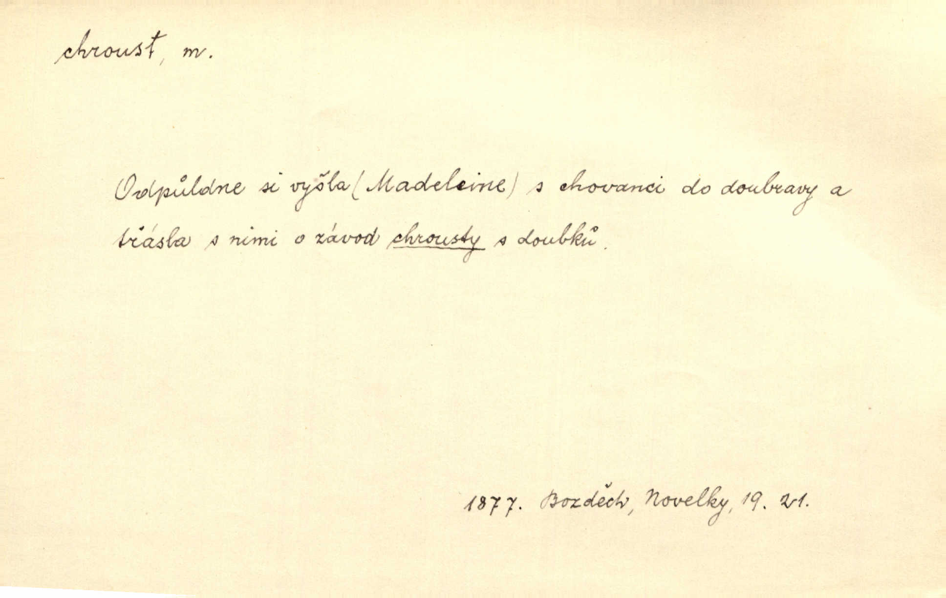 - chroust, -a m. zool. brouk z čeledi chrobáků. Chroust obecný čili babka (Melolontha vulgaris). Čápka sama jako chroust. Kdyby jedla třebas tisíckrát za den, přece jí to nic není platný; pořád jako puntík. V. Mrš. D člověk hubený n. slabý. Ten toho zmůže, ten chroust! Klost.
