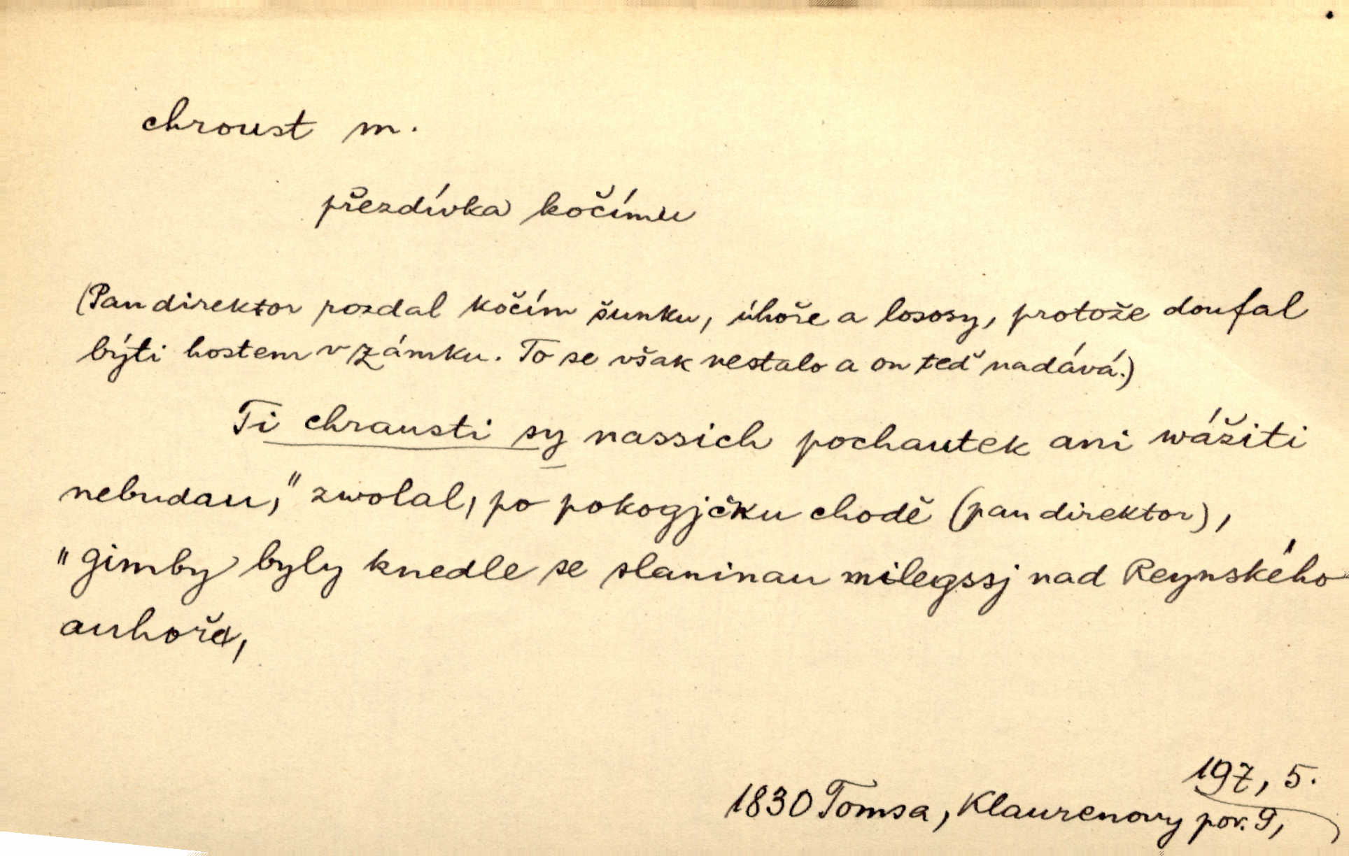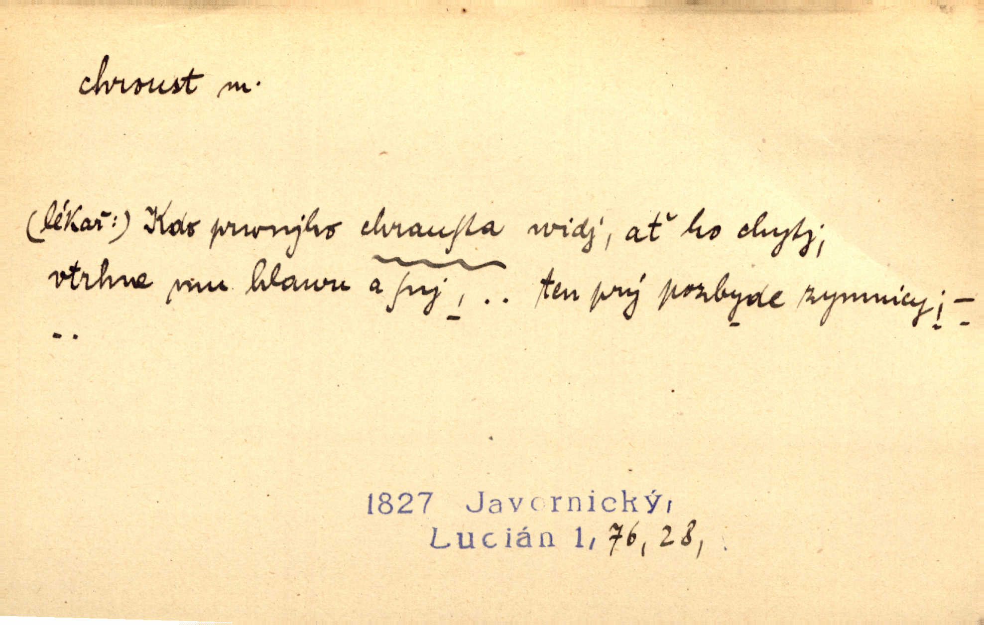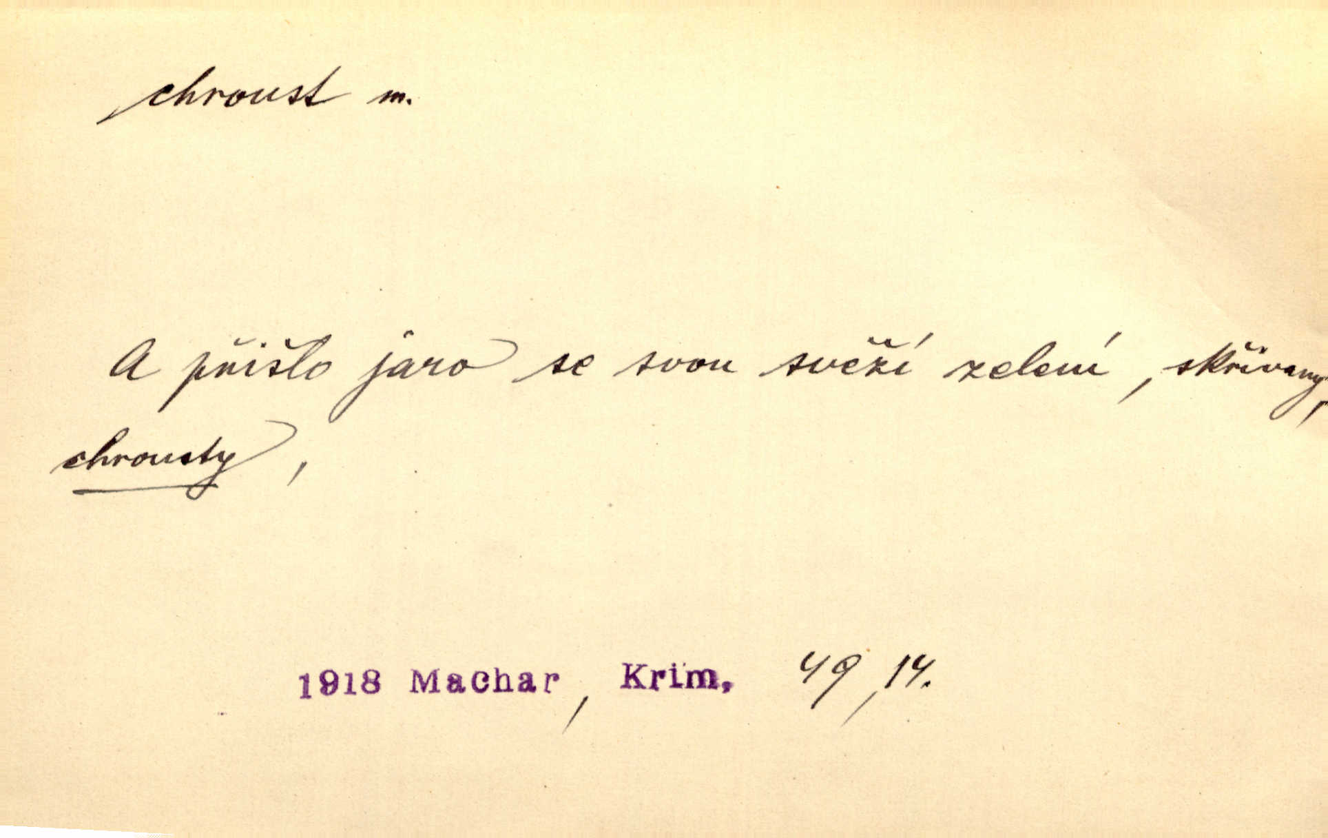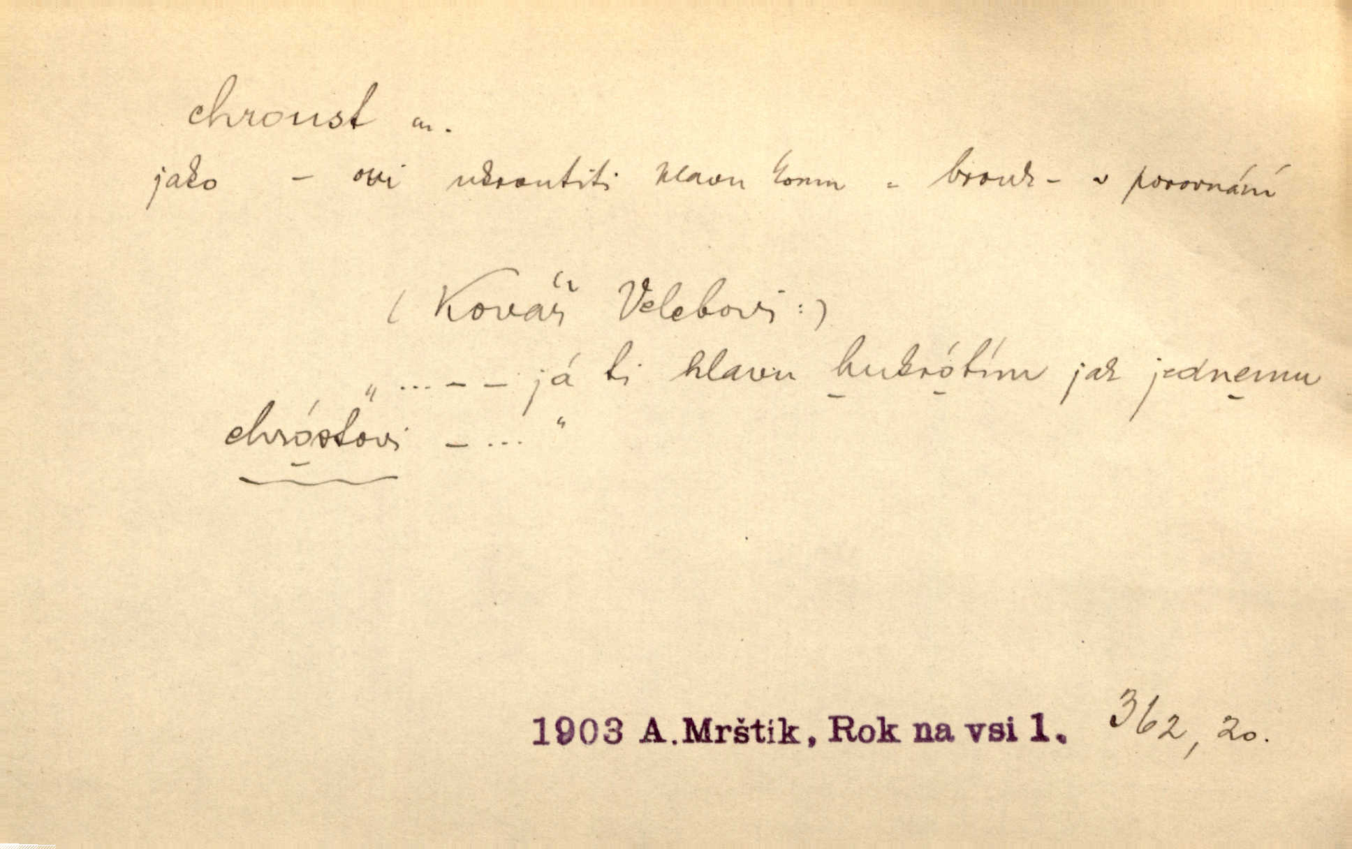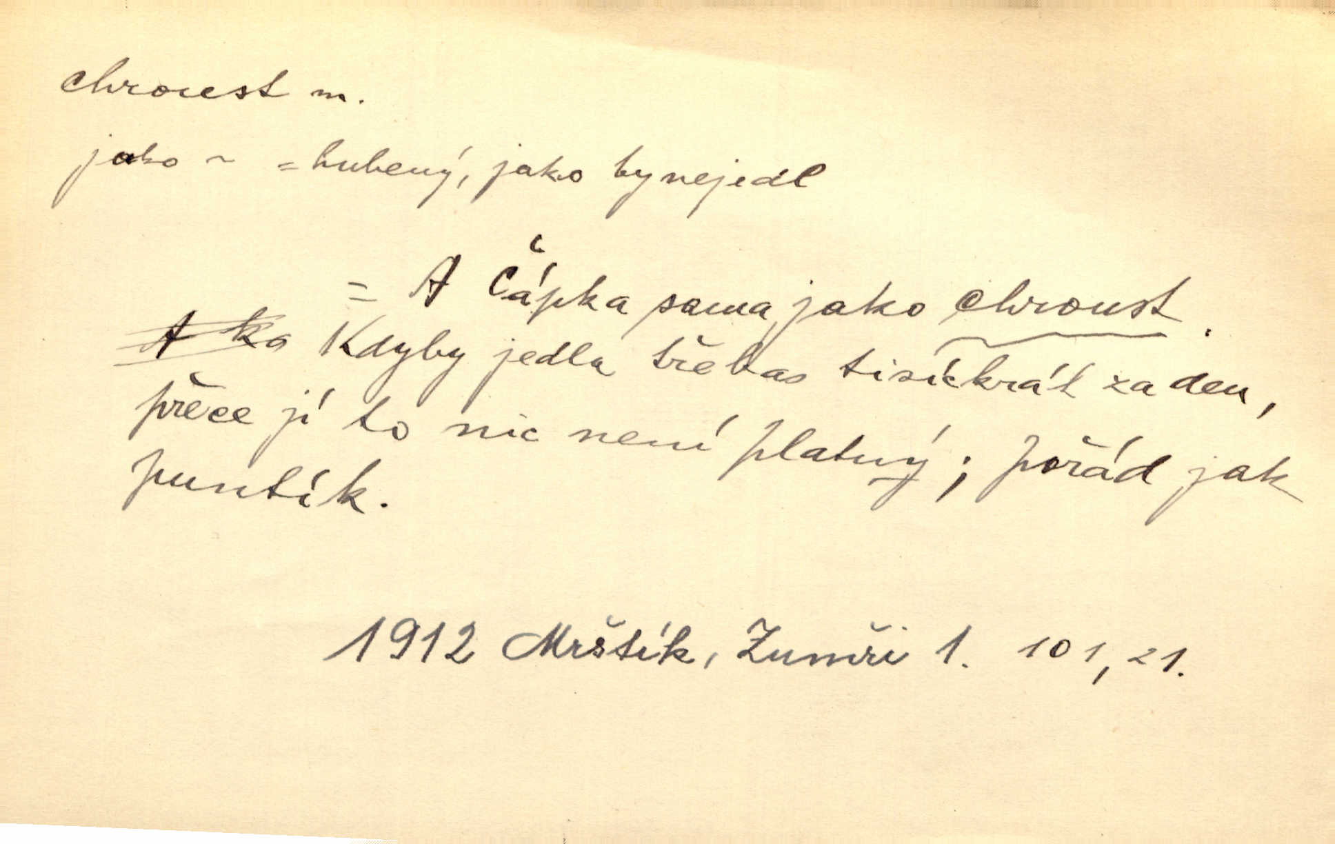 - chroust, -a m. zool. brouk z čeledi chrobáků. Chroust obecný čili babka (Melolontha vulgaris). Čápka sama jako chroust. Kdyby jedla třebas tisíckrát za den, přece jí to nic není platný; pořád jako puntík. V. Mrš. D člověk hubený n. slabý. Ten toho zmůže, ten chroust! Klost.