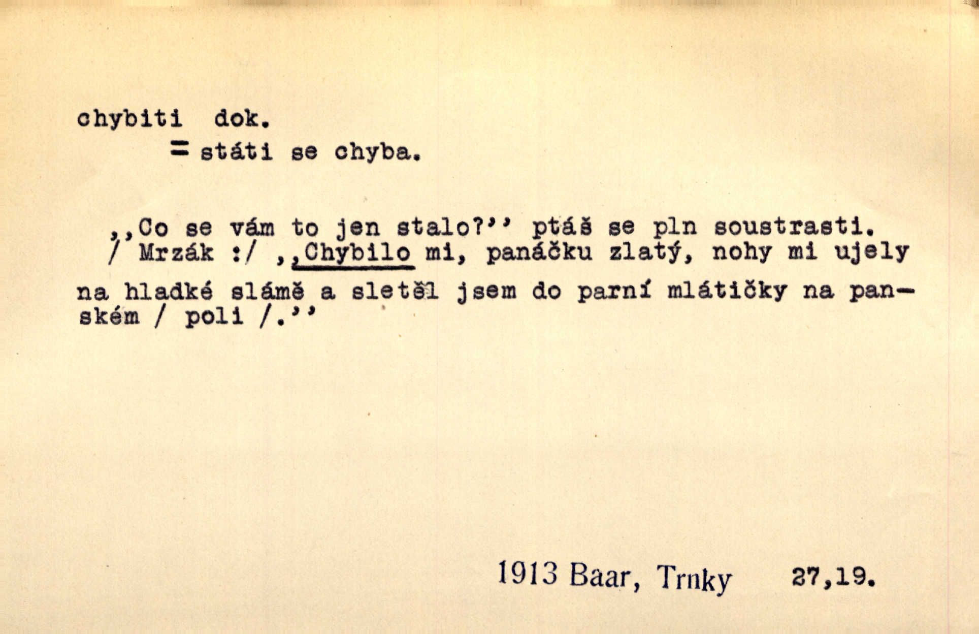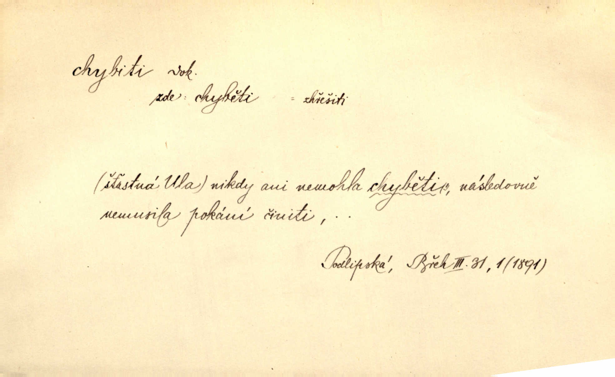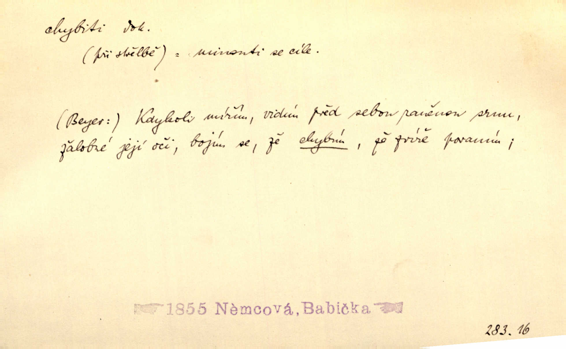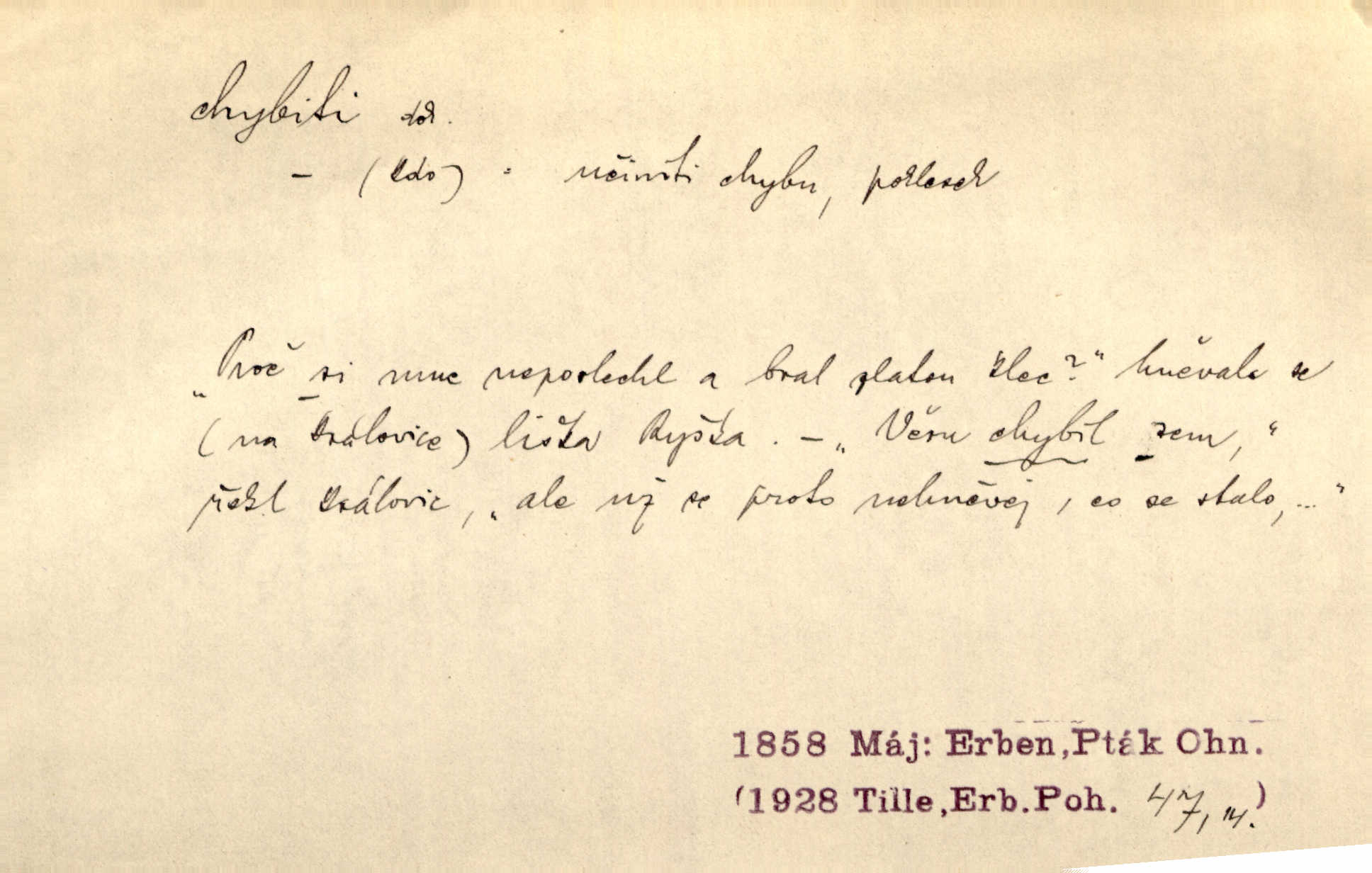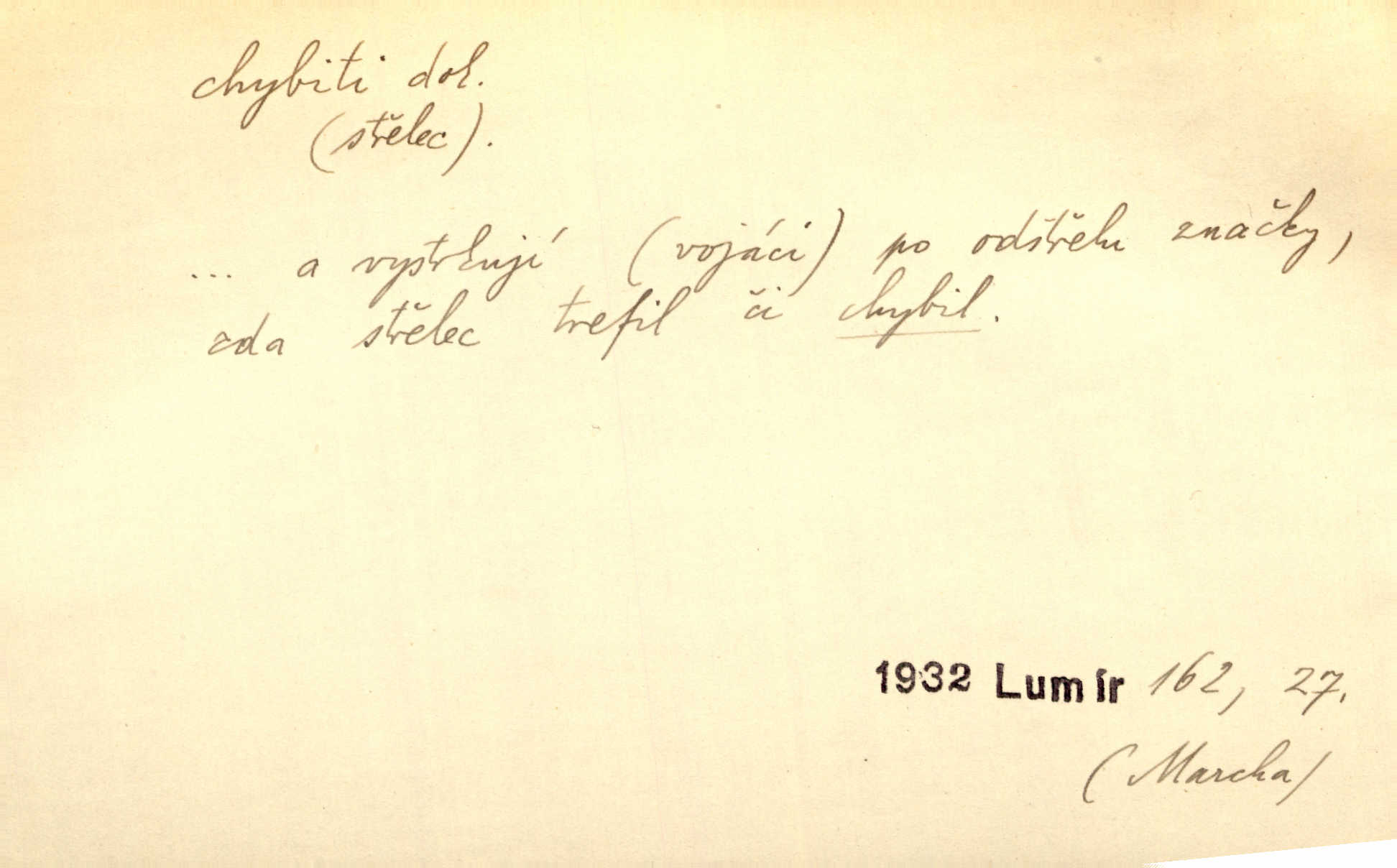 - chybiti dok. udělati chybu, zmýliti se. Chybil jsem, ale chci chybu svou napravit. Rad. I spravedlivý chybí denně sedmkrát. Ner. „Když chybí učený, chybí hodně!“ řekl pan Franc. Rub. Začala, že s tou holkou, myslím, chybila, že je způsobna, ochotna. Jir. D (co) minouti, nezasáhnouti, netrefiti něco. [Vojáci] vystrkují po odstřelu značky, zda střelec trefil či chybil. Marcha. Škoda každé rány, která chybí! Třeb. Srna píská, srnec říje: vystřelili, chybili je. Heyd. Výstřel houkl, ale chybená liška uháněla do selských lesů. Stráž mysl. Kdo může říc’, žes chybil cíle? F. S. Proch. D s cesty sejíti, zblouditi: (koho, co) minouti se s někým, s něčím. Řekloť se nám, že nemůžeme chybiti — a vskutku stáli jsme asi za dvě hodiny u temného vchodu jeskyně. Tyl. Aby sme ho pak byli chybili minuli se s ním. Kram. Chybila jsem cestičku, kde se křižovala. Krás. D Dial. chybilo mi uklouzl jsem. Chybilo mi, nohy mi ujely na hladké slámě a sletěl jsem do parní mlátičky. Baar. D chybiti se (koho, čeho) nezasáhnouti, netrefiti. Chybil se [myslivec] kachny o celý barák Něm. A jak šikovně hází [brambory], nechybil se ani jednou nádoby Baar. D (čeho, s čím, nespr. čím) minouti se. Vždy se cesty chybí, kdo bludičkou je zaveden Krás. Štolba chybil se brodu. Zey. Takovéto nakládání s muži někdy v národu váženými chybilo se dokonce s cílem svým. Pal. Řeči takové nechybily se s oučinkem. Pal. Zřejmě se tento lékař chybil svým povoláním. Nor.
