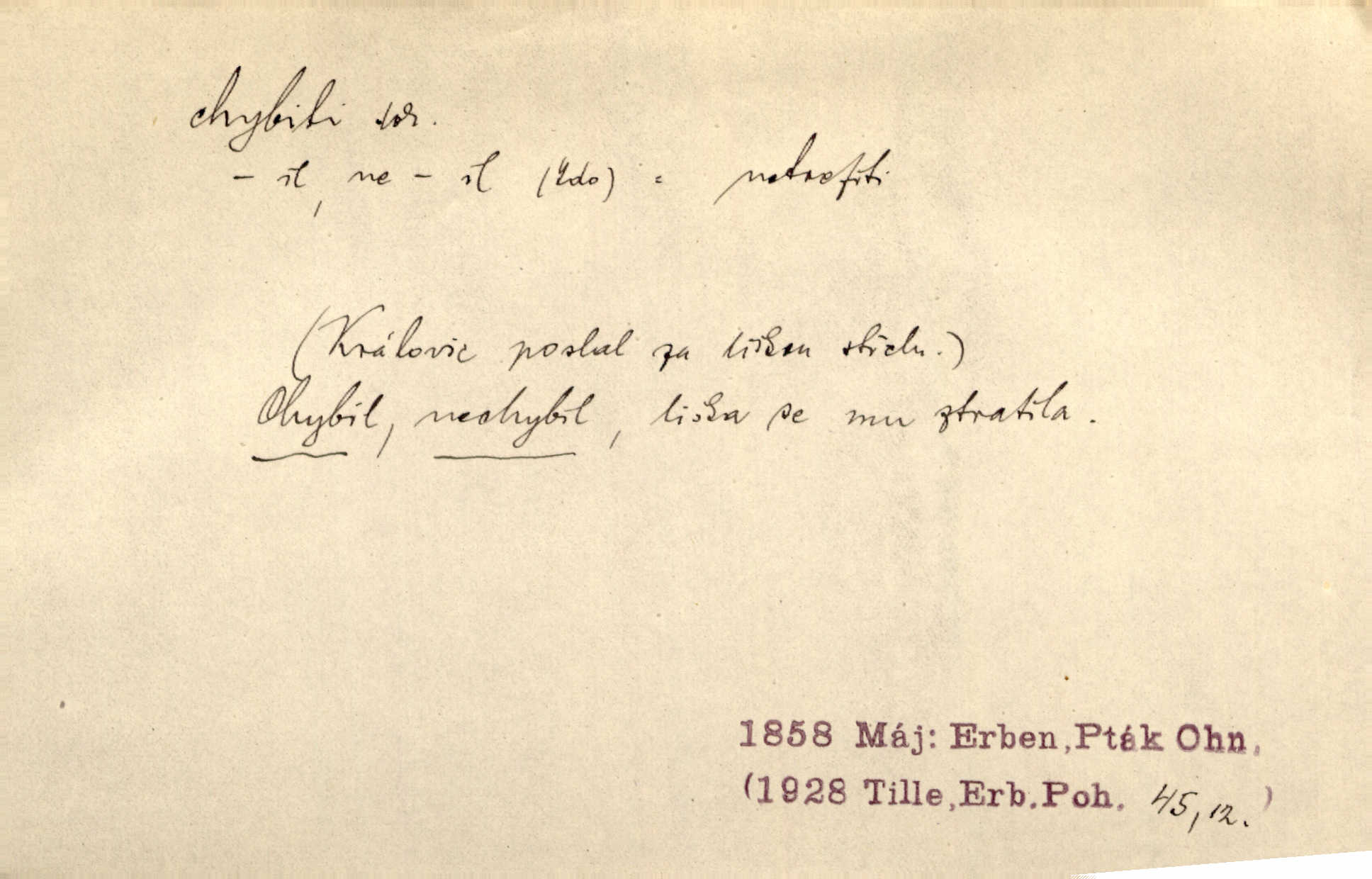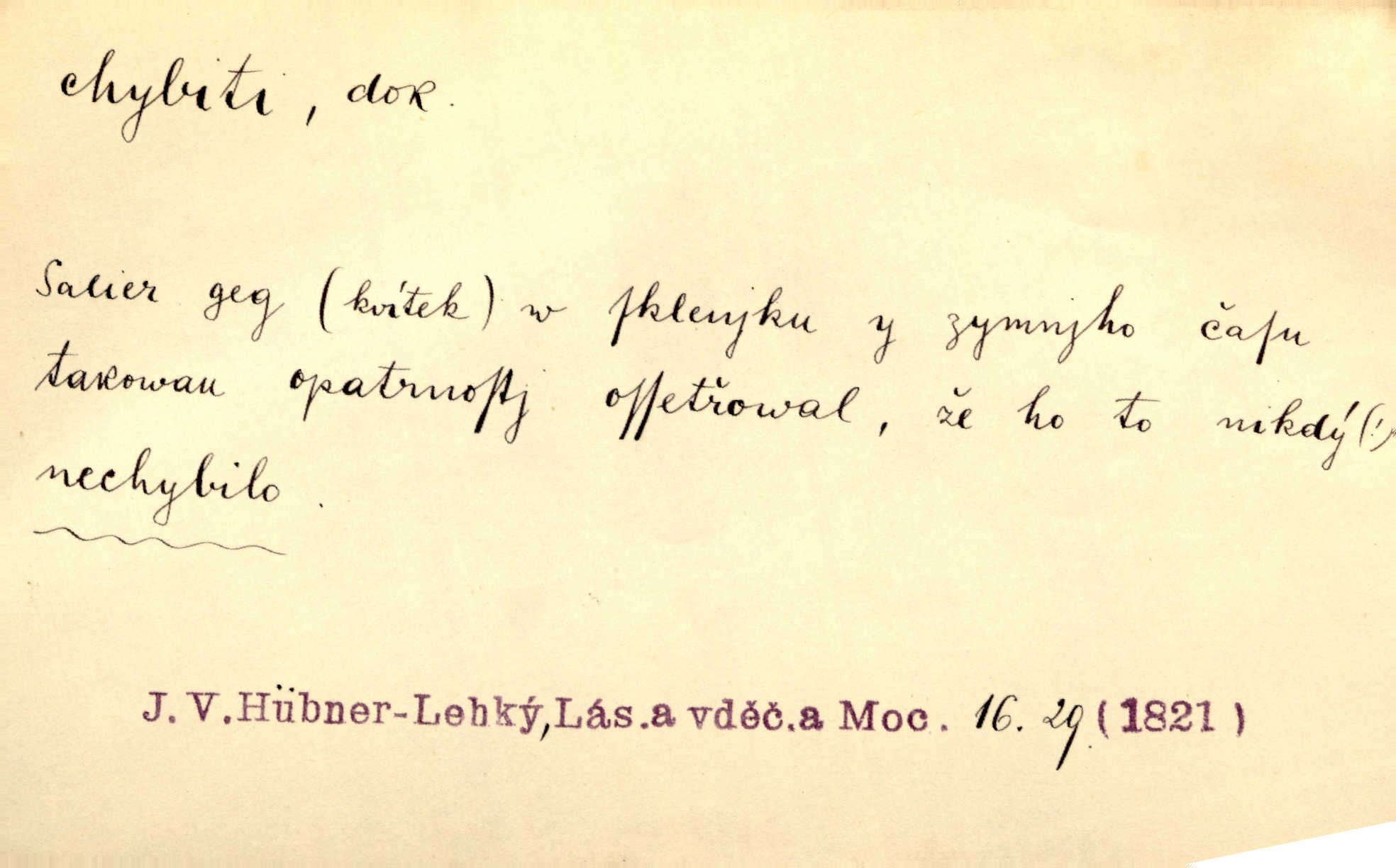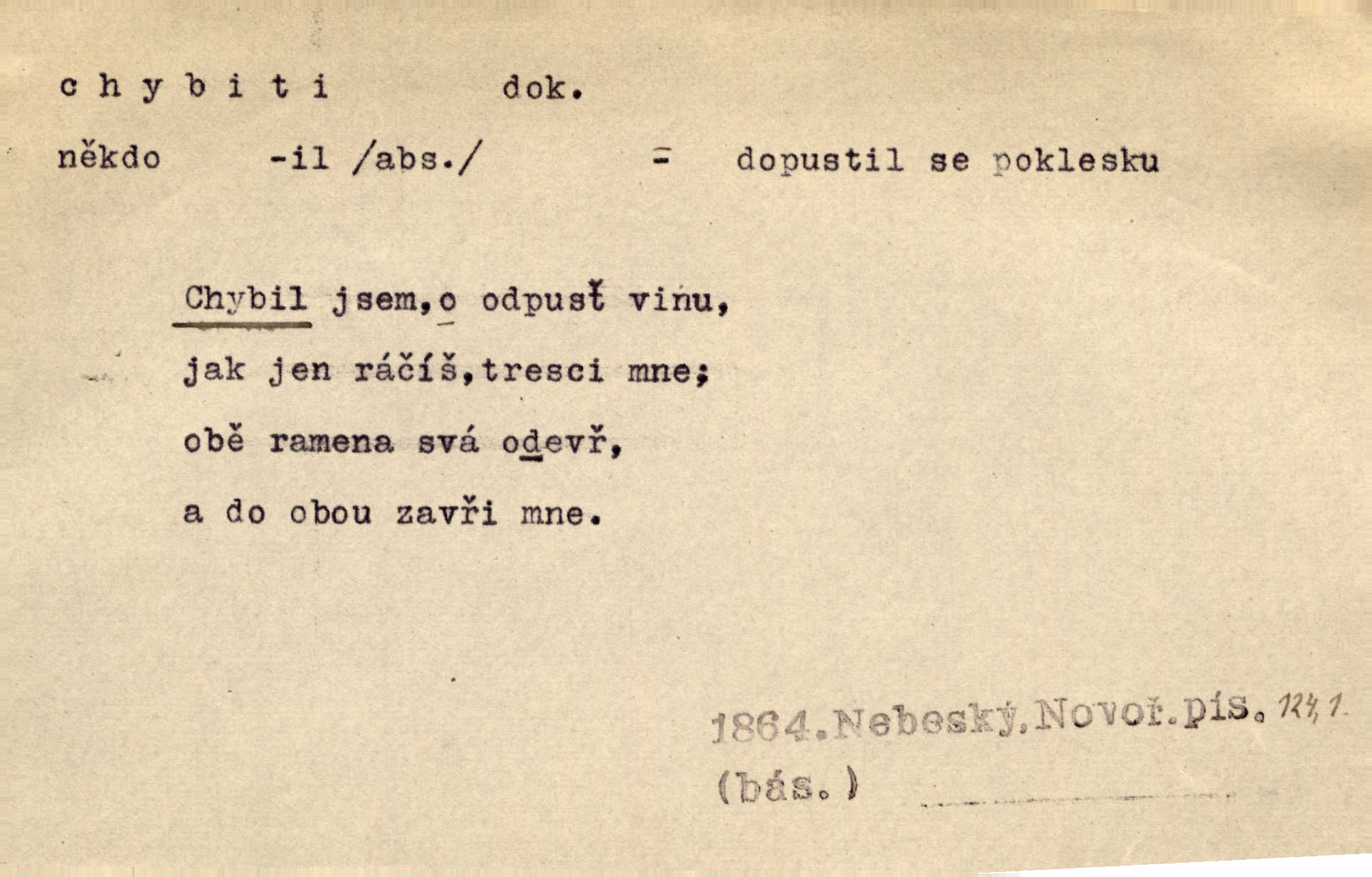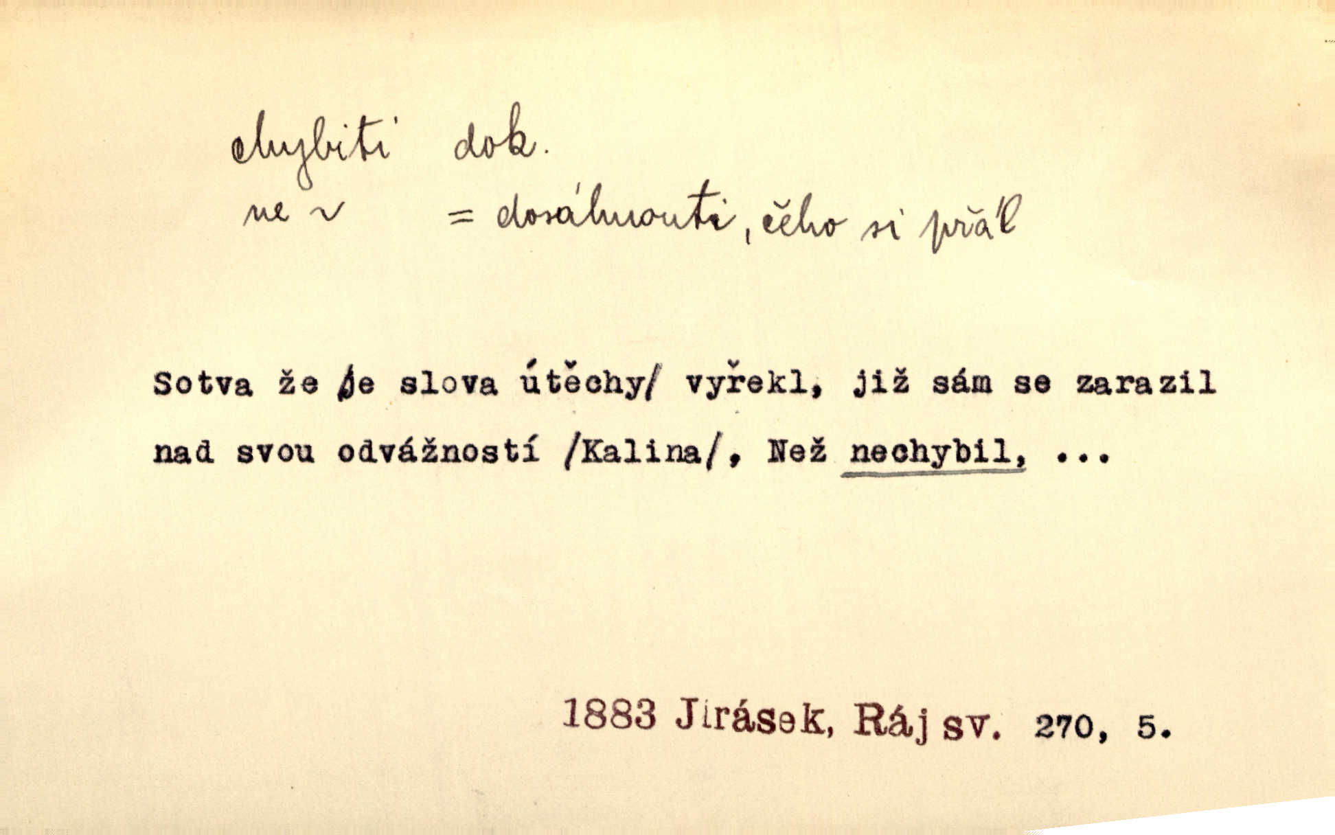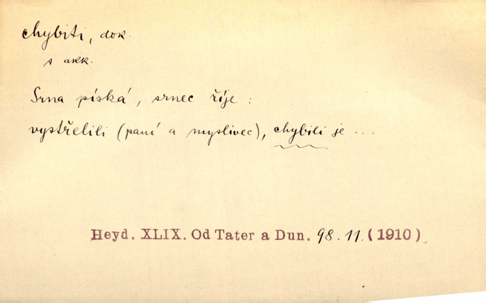 - chybiti dok. udělati chybu, zmýliti se. Chybil jsem, ale chci chybu svou napravit. Rad. I spravedlivý chybí denně sedmkrát. Ner. „Když chybí učený, chybí hodně!“ řekl pan Franc. Rub. Začala, že s tou holkou, myslím, chybila, že je způsobna, ochotna. Jir. D (co) minouti, nezasáhnouti, netrefiti něco. [Vojáci] vystrkují po odstřelu značky, zda střelec trefil či chybil. Marcha. Škoda každé rány, která chybí! Třeb. Srna píská, srnec říje: vystřelili, chybili je. Heyd. Výstřel houkl, ale chybená liška uháněla do selských lesů. Stráž mysl. Kdo může říc’, žes chybil cíle? F. S. Proch. D s cesty sejíti, zblouditi: (koho, co) minouti se s někým, s něčím. Řekloť se nám, že nemůžeme chybiti — a vskutku stáli jsme asi za dvě hodiny u temného vchodu jeskyně. Tyl. Aby sme ho pak byli chybili minuli se s ním. Kram. Chybila jsem cestičku, kde se křižovala. Krás. D Dial. chybilo mi uklouzl jsem. Chybilo mi, nohy mi ujely na hladké slámě a sletěl jsem do parní mlátičky. Baar. D chybiti se (koho, čeho) nezasáhnouti, netrefiti. Chybil se [myslivec] kachny o celý barák Něm. A jak šikovně hází [brambory], nechybil se ani jednou nádoby Baar. D (čeho, s čím, nespr. čím) minouti se. Vždy se cesty chybí, kdo bludičkou je zaveden Krás. Štolba chybil se brodu. Zey. Takovéto nakládání s muži někdy v národu váženými chybilo se dokonce s cílem svým. Pal. Řeči takové nechybily se s oučinkem. Pal. Zřejmě se tento lékař chybil svým povoláním. Nor.