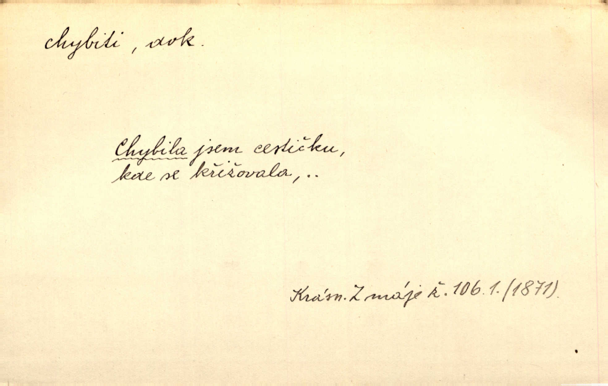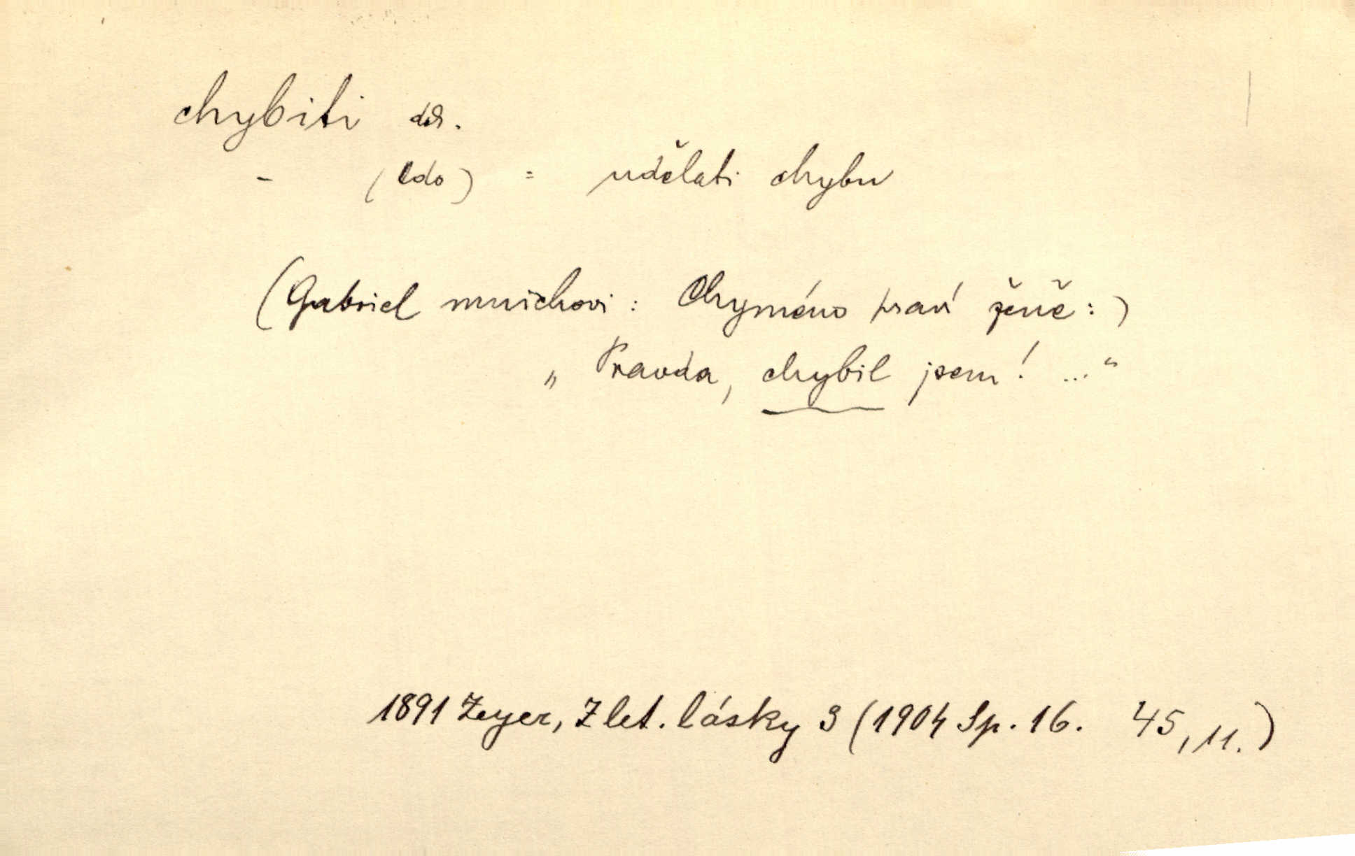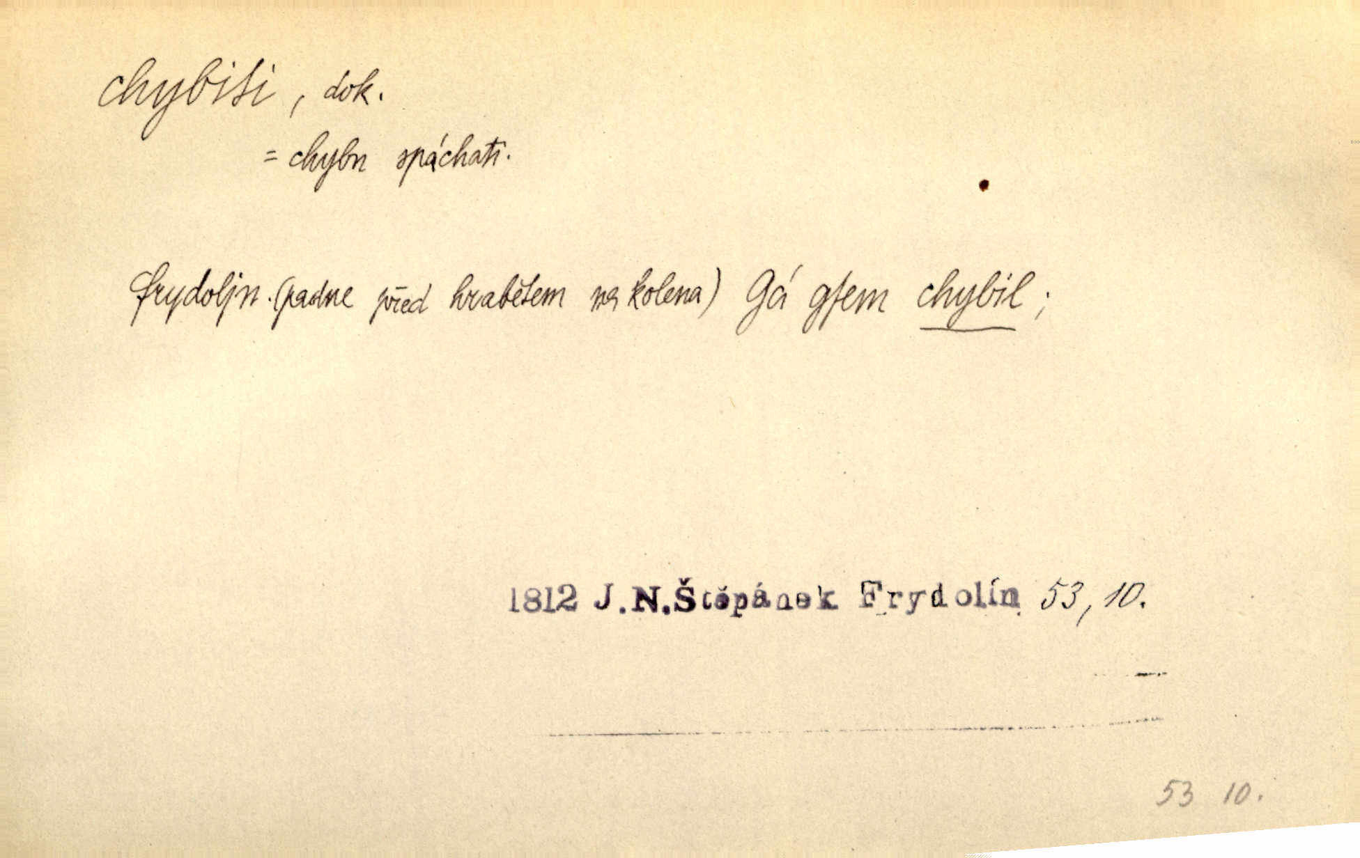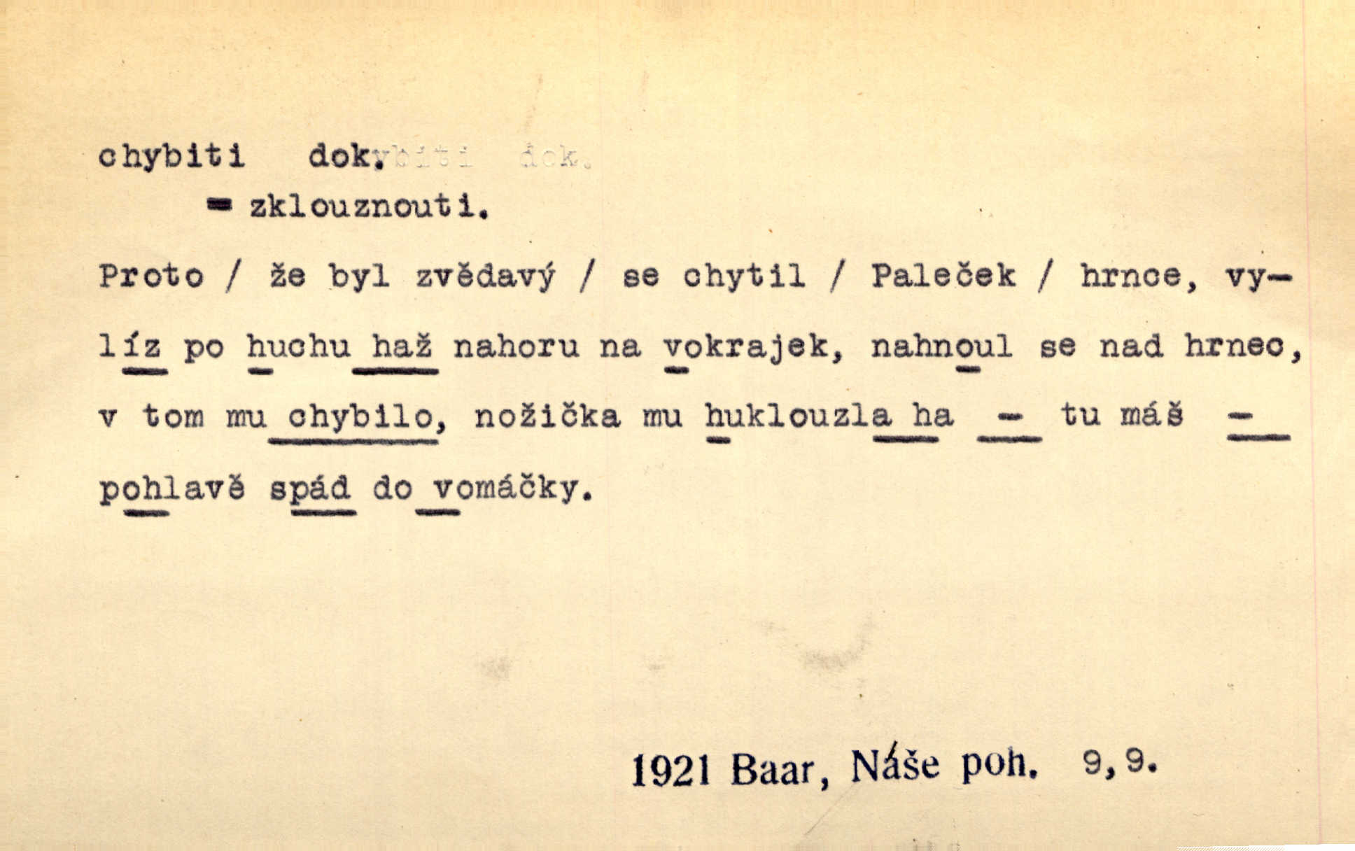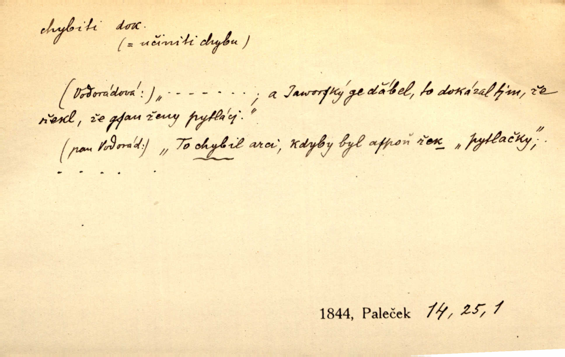 - chybiti dok. udělati chybu, zmýliti se. Chybil jsem, ale chci chybu svou napravit. Rad. I spravedlivý chybí denně sedmkrát. Ner. „Když chybí učený, chybí hodně!“ řekl pan Franc. Rub. Začala, že s tou holkou, myslím, chybila, že je způsobna, ochotna. Jir. D (co) minouti, nezasáhnouti, netrefiti něco. [Vojáci] vystrkují po odstřelu značky, zda střelec trefil či chybil. Marcha. Škoda každé rány, která chybí! Třeb. Srna píská, srnec říje: vystřelili, chybili je. Heyd. Výstřel houkl, ale chybená liška uháněla do selských lesů. Stráž mysl. Kdo může říc’, žes chybil cíle? F. S. Proch. D s cesty sejíti, zblouditi: (koho, co) minouti se s někým, s něčím. Řekloť se nám, že nemůžeme chybiti — a vskutku stáli jsme asi za dvě hodiny u temného vchodu jeskyně. Tyl. Aby sme ho pak byli chybili minuli se s ním. Kram. Chybila jsem cestičku, kde se křižovala. Krás. D Dial. chybilo mi uklouzl jsem. Chybilo mi, nohy mi ujely na hladké slámě a sletěl jsem do parní mlátičky. Baar. D chybiti se (koho, čeho) nezasáhnouti, netrefiti. Chybil se [myslivec] kachny o celý barák Něm. A jak šikovně hází [brambory], nechybil se ani jednou nádoby Baar. D (čeho, s čím, nespr. čím) minouti se. Vždy se cesty chybí, kdo bludičkou je zaveden Krás. Štolba chybil se brodu. Zey. Takovéto nakládání s muži někdy v národu váženými chybilo se dokonce s cílem svým. Pal. Řeči takové nechybily se s oučinkem. Pal. Zřejmě se tento lékař chybil svým povoláním. Nor.