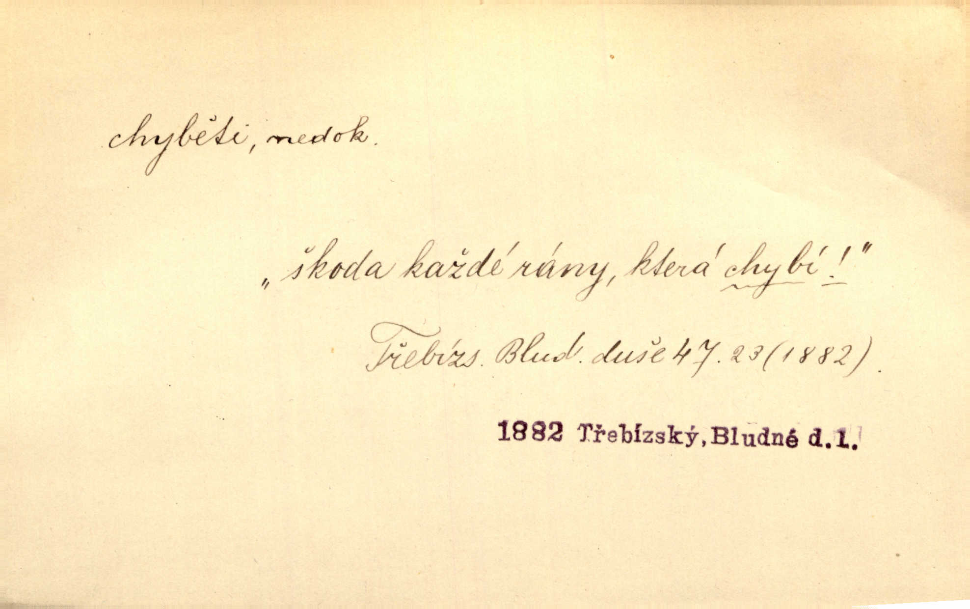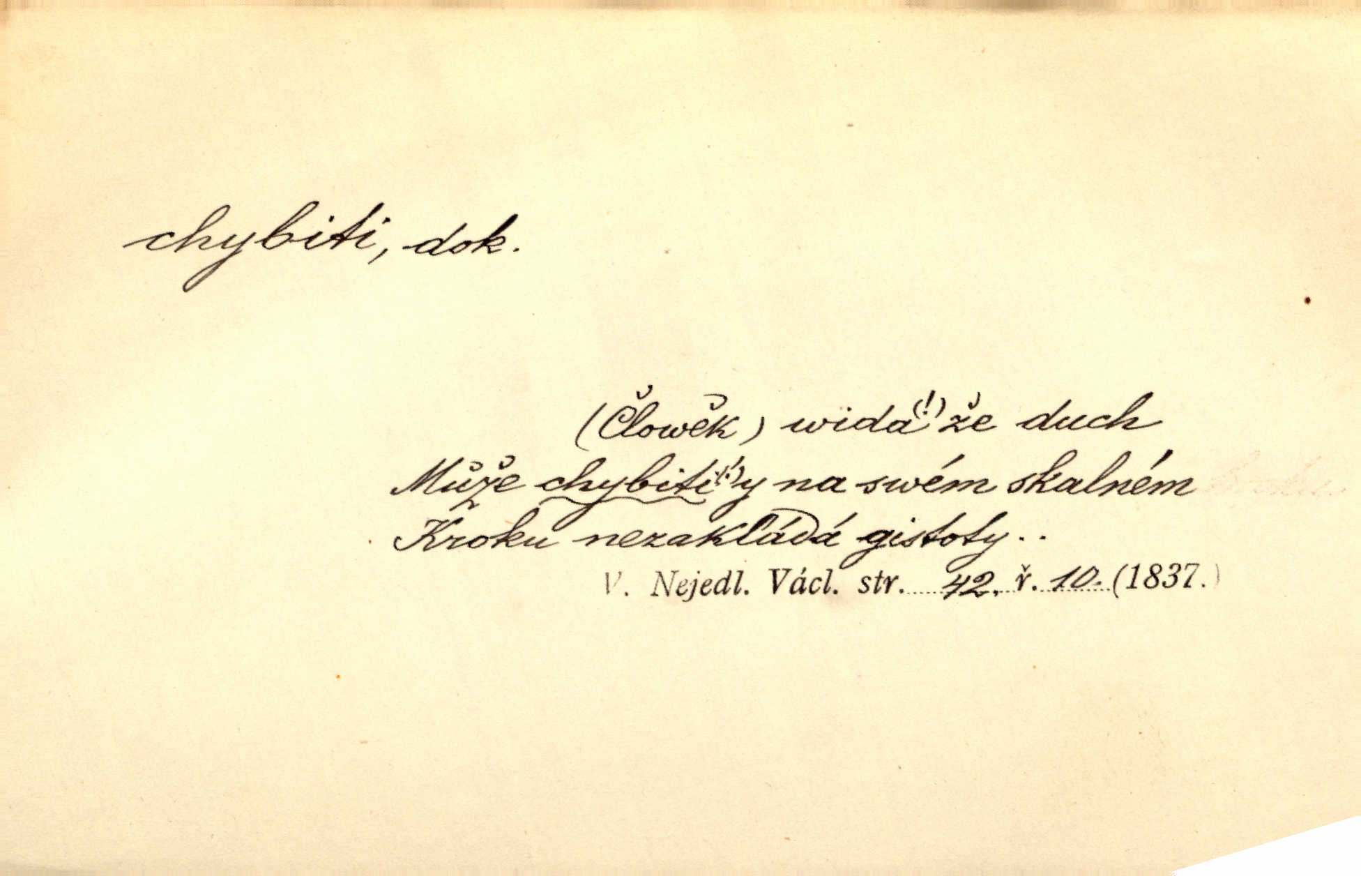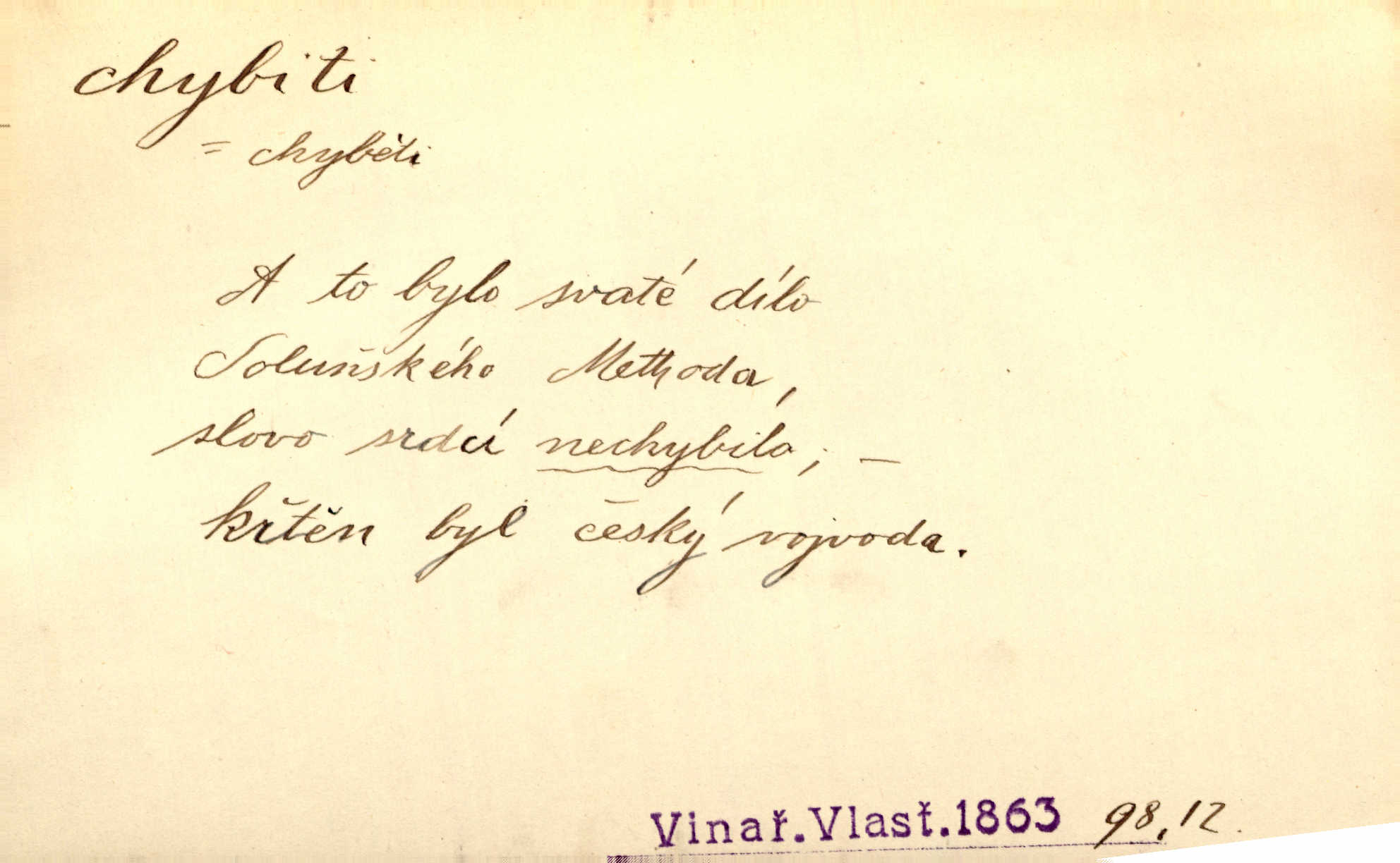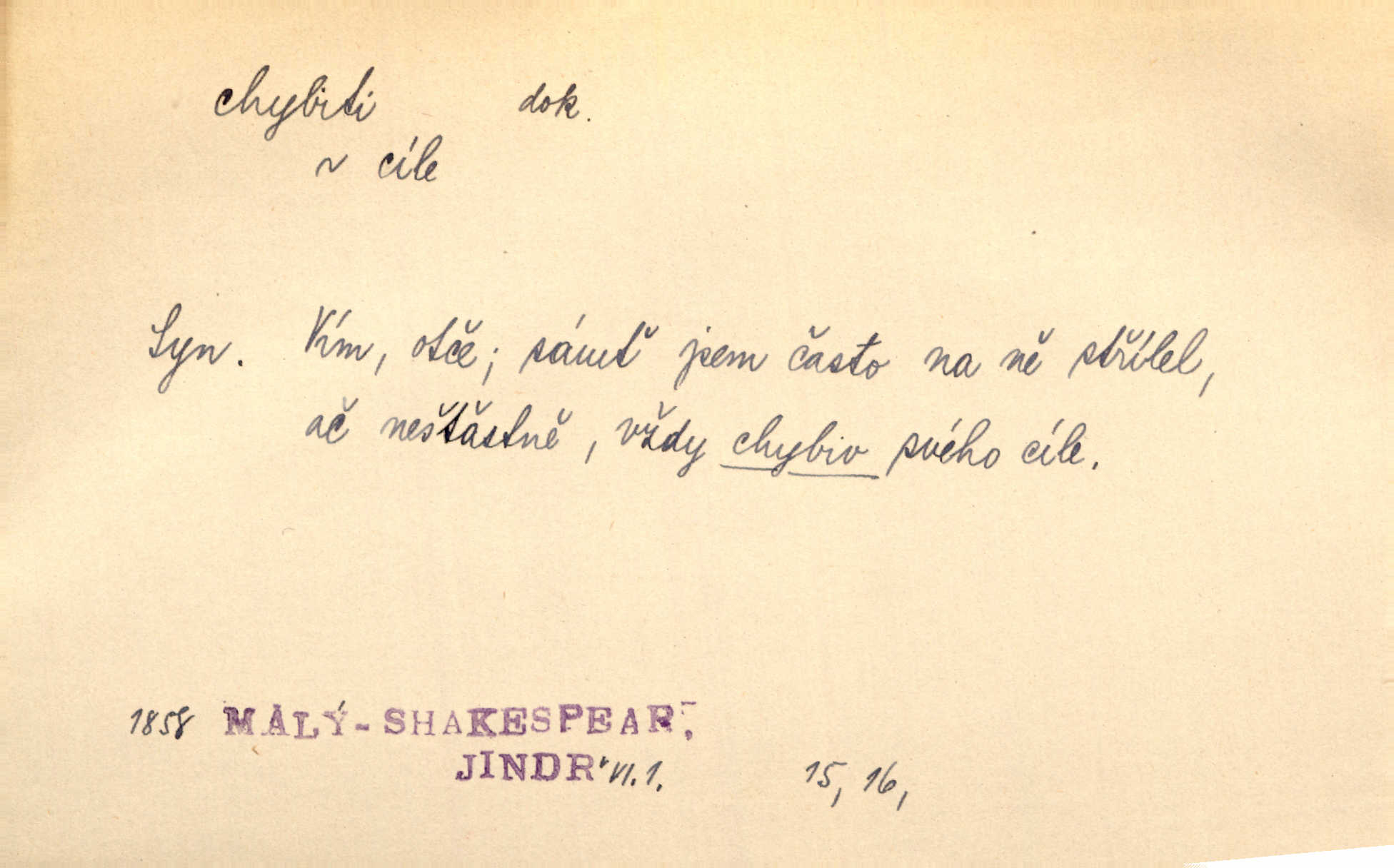 - chybiti dok. udělati chybu, zmýliti se. Chybil jsem, ale chci chybu svou napravit. Rad. I spravedlivý chybí denně sedmkrát. Ner. „Když chybí učený, chybí hodně!“ řekl pan Franc. Rub. Začala, že s tou holkou, myslím, chybila, že je způsobna, ochotna. Jir. D (co) minouti, nezasáhnouti, netrefiti něco. [Vojáci] vystrkují po odstřelu značky, zda střelec trefil či chybil. Marcha. Škoda každé rány, která chybí! Třeb. Srna píská, srnec říje: vystřelili, chybili je. Heyd. Výstřel houkl, ale chybená liška uháněla do selských lesů. Stráž mysl. Kdo může říc’, žes chybil cíle? F. S. Proch. D s cesty sejíti, zblouditi: (koho, co) minouti se s někým, s něčím. Řekloť se nám, že nemůžeme chybiti — a vskutku stáli jsme asi za dvě hodiny u temného vchodu jeskyně. Tyl. Aby sme ho pak byli chybili minuli se s ním. Kram. Chybila jsem cestičku, kde se křižovala. Krás. D Dial. chybilo mi uklouzl jsem. Chybilo mi, nohy mi ujely na hladké slámě a sletěl jsem do parní mlátičky. Baar. D chybiti se (koho, čeho) nezasáhnouti, netrefiti. Chybil se [myslivec] kachny o celý barák Něm. A jak šikovně hází [brambory], nechybil se ani jednou nádoby Baar. D (čeho, s čím, nespr. čím) minouti se. Vždy se cesty chybí, kdo bludičkou je zaveden Krás. Štolba chybil se brodu. Zey. Takovéto nakládání s muži někdy v národu váženými chybilo se dokonce s cílem svým. Pal. Řeči takové nechybily se s oučinkem. Pal. Zřejmě se tento lékař chybil svým povoláním. Nor.