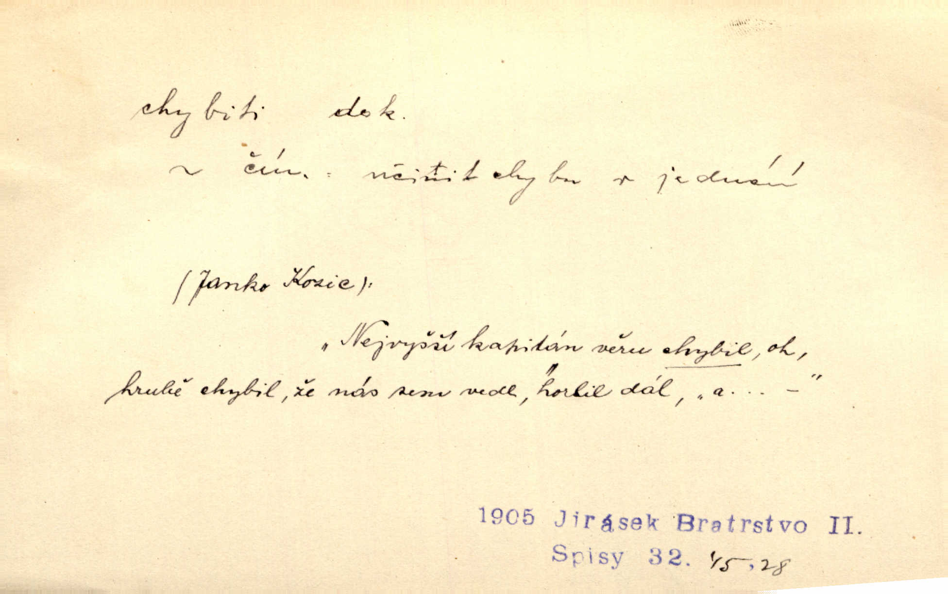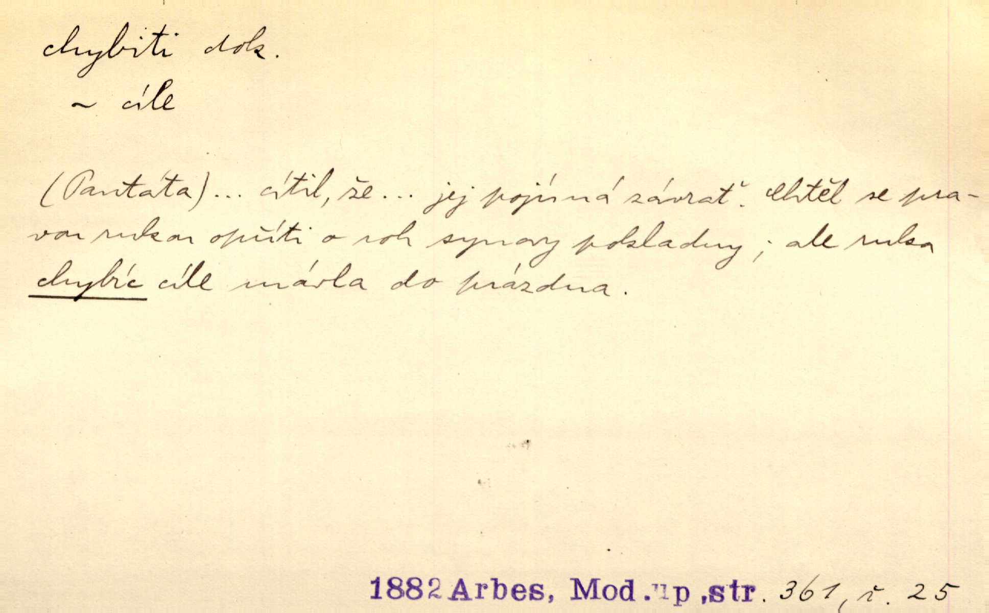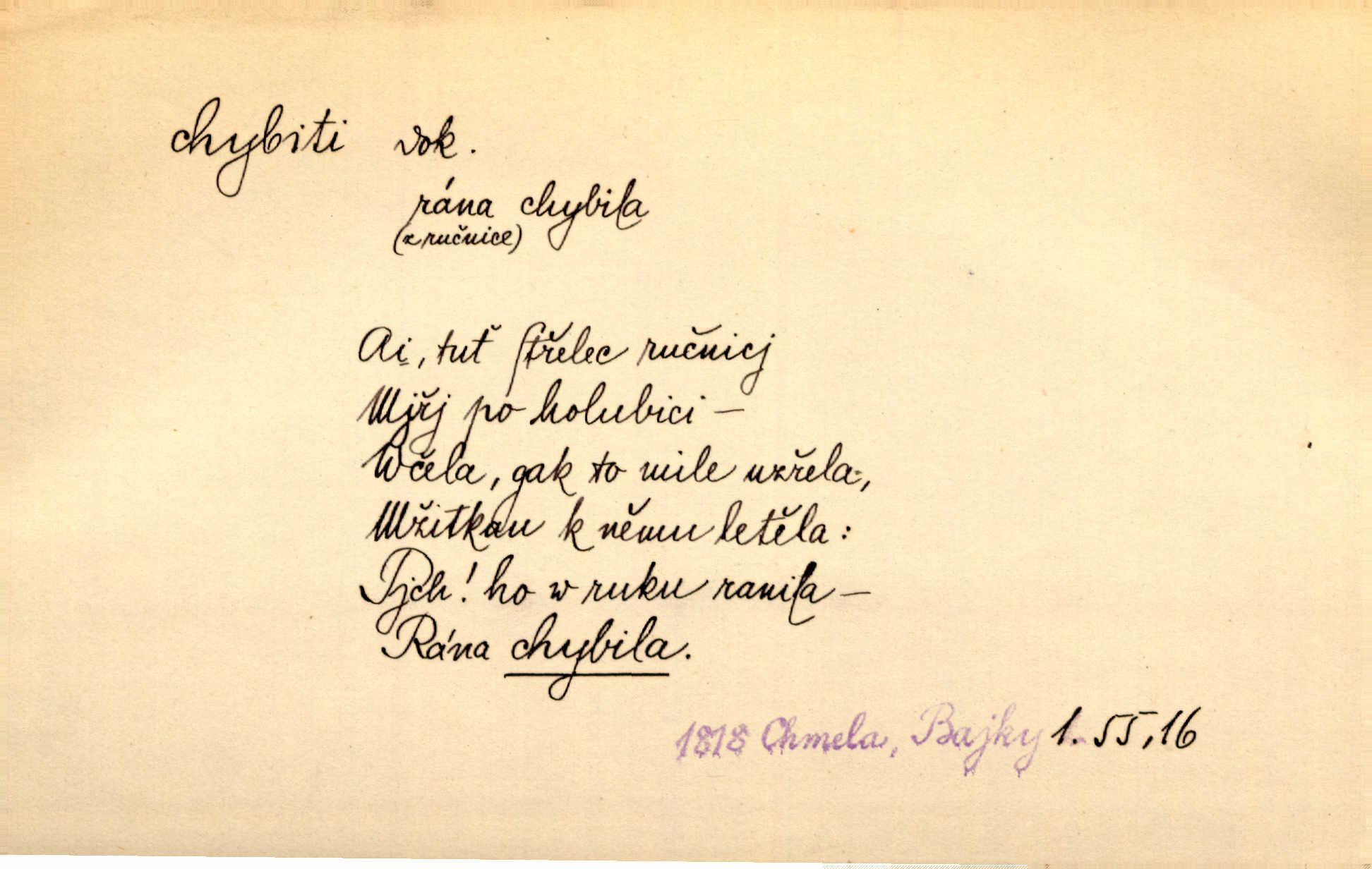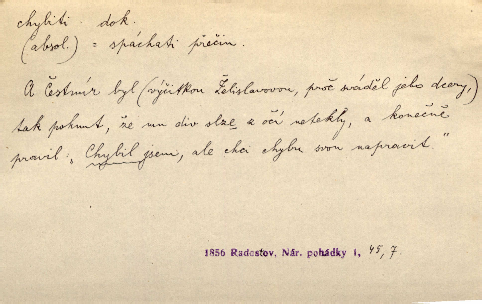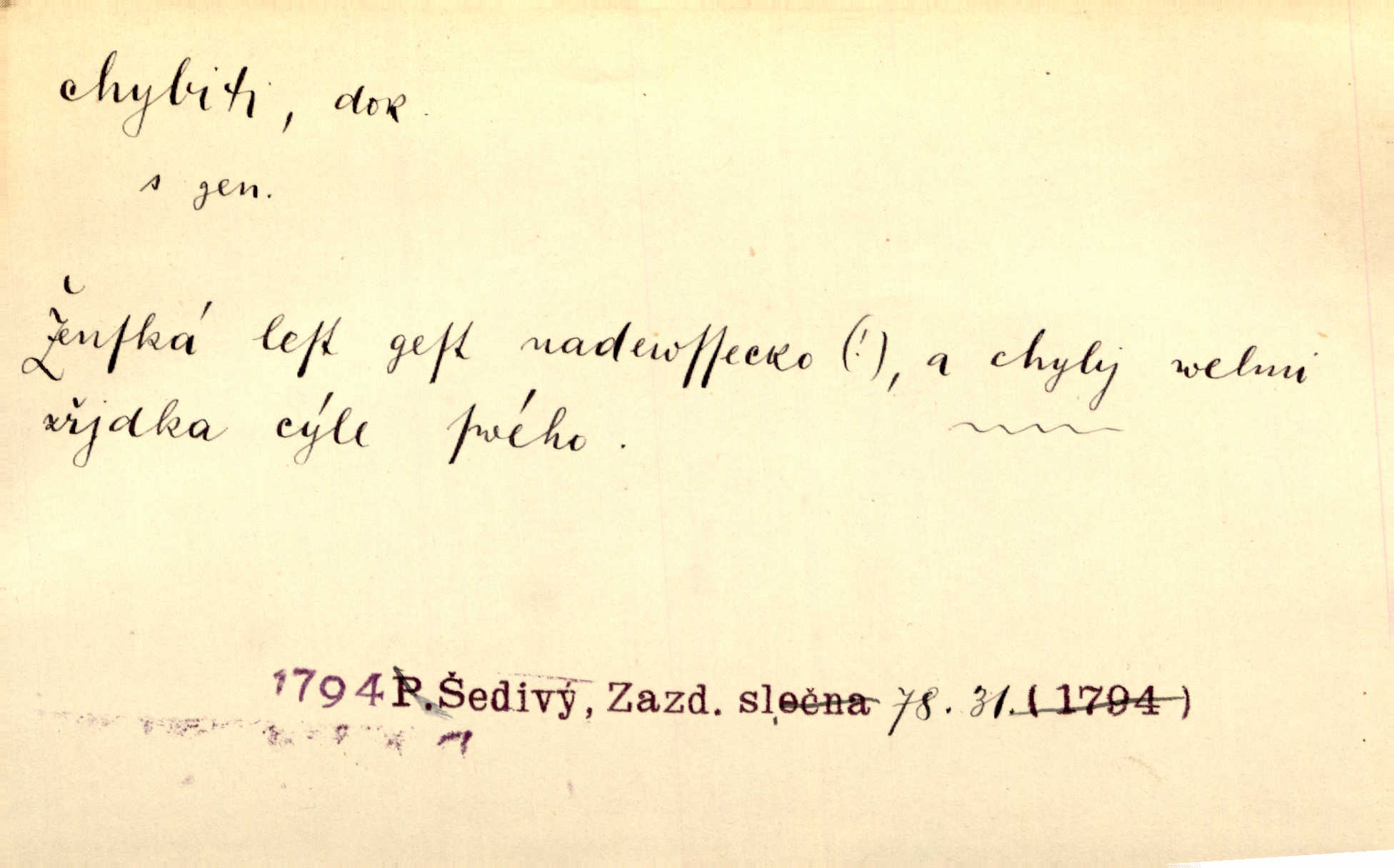 - chybiti dok. udělati chybu, zmýliti se. Chybil jsem, ale chci chybu svou napravit. Rad. I spravedlivý chybí denně sedmkrát. Ner. „Když chybí učený, chybí hodně!“ řekl pan Franc. Rub. Začala, že s tou holkou, myslím, chybila, že je způsobna, ochotna. Jir. D (co) minouti, nezasáhnouti, netrefiti něco. [Vojáci] vystrkují po odstřelu značky, zda střelec trefil či chybil. Marcha. Škoda každé rány, která chybí! Třeb. Srna píská, srnec říje: vystřelili, chybili je. Heyd. Výstřel houkl, ale chybená liška uháněla do selských lesů. Stráž mysl. Kdo může říc’, žes chybil cíle? F. S. Proch. D s cesty sejíti, zblouditi: (koho, co) minouti se s někým, s něčím. Řekloť se nám, že nemůžeme chybiti — a vskutku stáli jsme asi za dvě hodiny u temného vchodu jeskyně. Tyl. Aby sme ho pak byli chybili minuli se s ním. Kram. Chybila jsem cestičku, kde se křižovala. Krás. D Dial. chybilo mi uklouzl jsem. Chybilo mi, nohy mi ujely na hladké slámě a sletěl jsem do parní mlátičky. Baar. D chybiti se (koho, čeho) nezasáhnouti, netrefiti. Chybil se [myslivec] kachny o celý barák Něm. A jak šikovně hází [brambory], nechybil se ani jednou nádoby Baar. D (čeho, s čím, nespr. čím) minouti se. Vždy se cesty chybí, kdo bludičkou je zaveden Krás. Štolba chybil se brodu. Zey. Takovéto nakládání s muži někdy v národu váženými chybilo se dokonce s cílem svým. Pal. Řeči takové nechybily se s oučinkem. Pal. Zřejmě se tento lékař chybil svým povoláním. Nor.