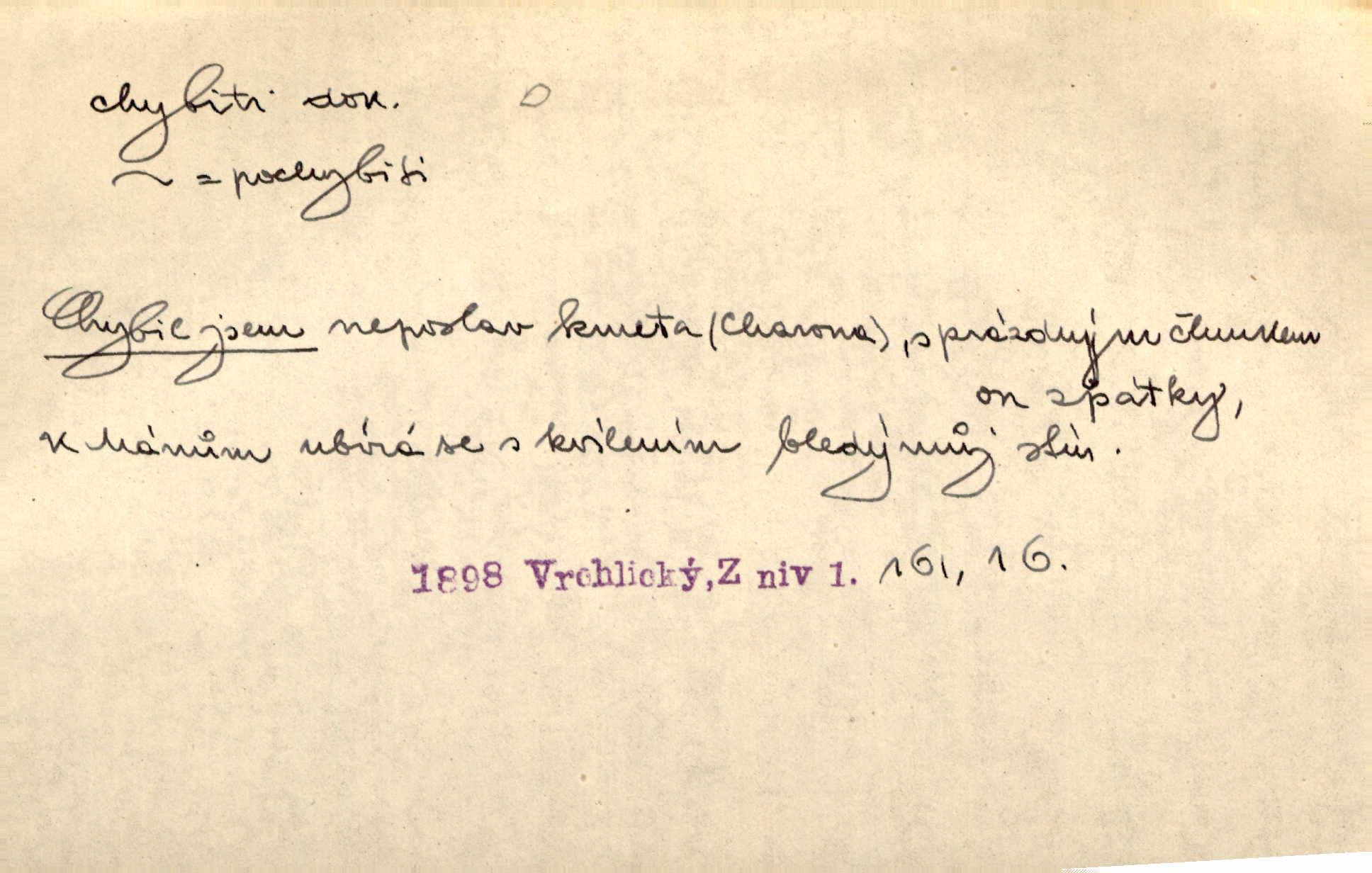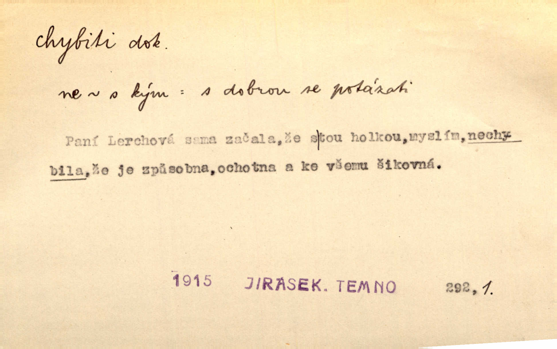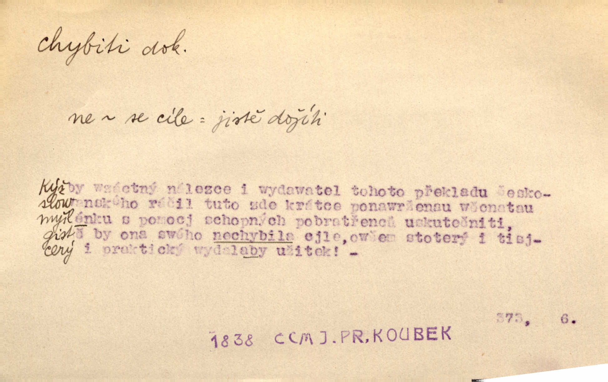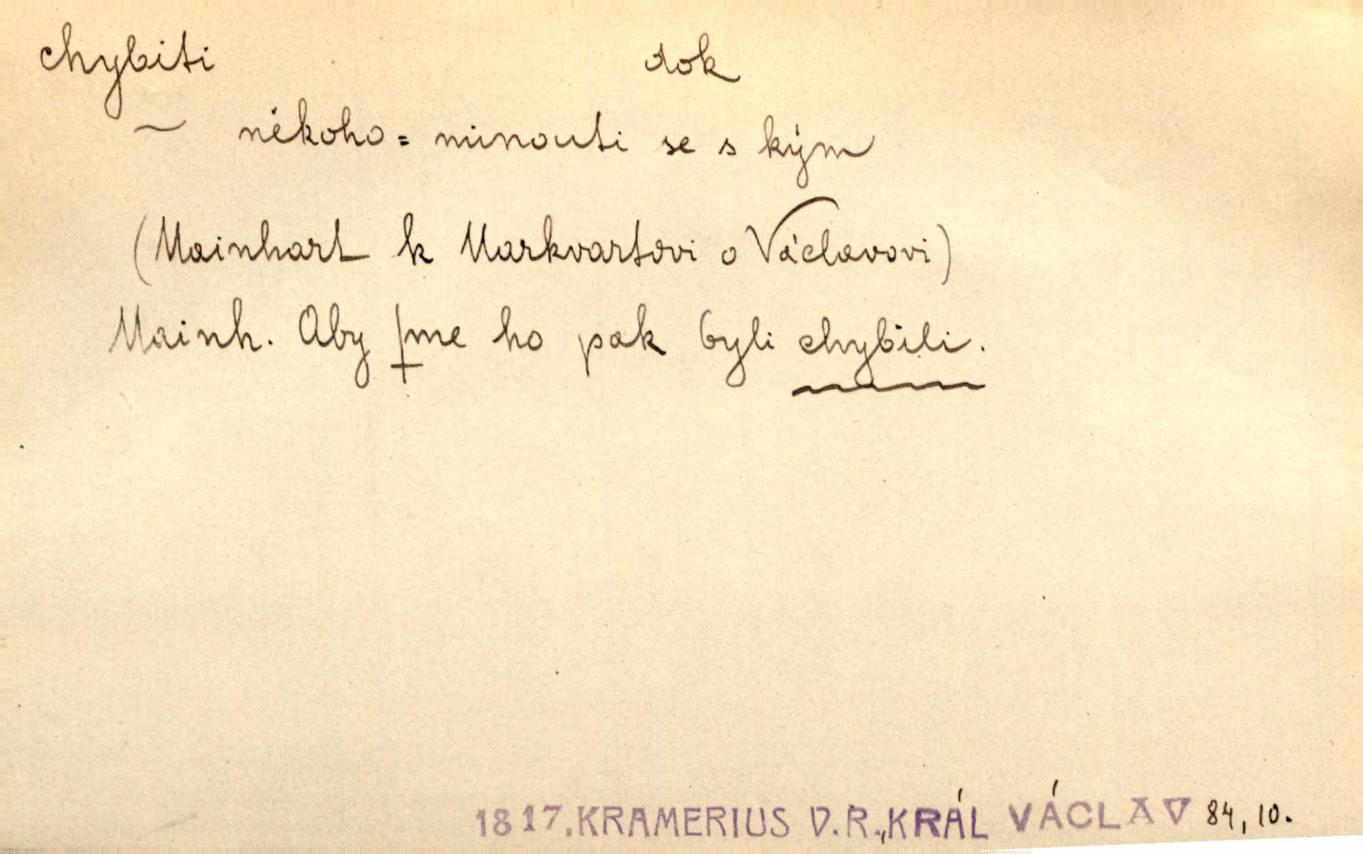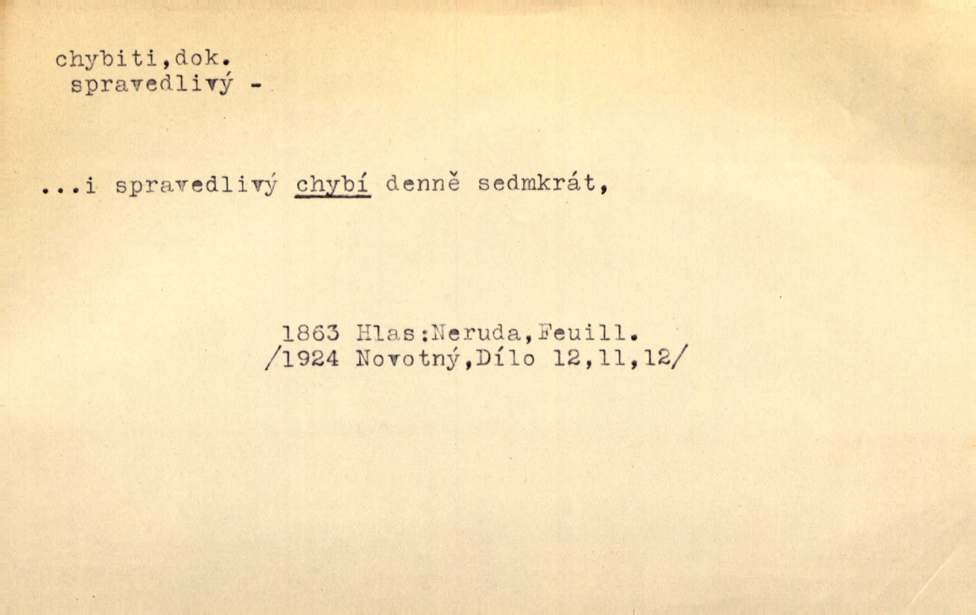 - chybiti dok. udělati chybu, zmýliti se. Chybil jsem, ale chci chybu svou napravit. Rad. I spravedlivý chybí denně sedmkrát. Ner. „Když chybí učený, chybí hodně!“ řekl pan Franc. Rub. Začala, že s tou holkou, myslím, chybila, že je způsobna, ochotna. Jir. D (co) minouti, nezasáhnouti, netrefiti něco. [Vojáci] vystrkují po odstřelu značky, zda střelec trefil či chybil. Marcha. Škoda každé rány, která chybí! Třeb. Srna píská, srnec říje: vystřelili, chybili je. Heyd. Výstřel houkl, ale chybená liška uháněla do selských lesů. Stráž mysl. Kdo může říc’, žes chybil cíle? F. S. Proch. D s cesty sejíti, zblouditi: (koho, co) minouti se s někým, s něčím. Řekloť se nám, že nemůžeme chybiti — a vskutku stáli jsme asi za dvě hodiny u temného vchodu jeskyně. Tyl. Aby sme ho pak byli chybili minuli se s ním. Kram. Chybila jsem cestičku, kde se křižovala. Krás. D Dial. chybilo mi uklouzl jsem. Chybilo mi, nohy mi ujely na hladké slámě a sletěl jsem do parní mlátičky. Baar. D chybiti se (koho, čeho) nezasáhnouti, netrefiti. Chybil se [myslivec] kachny o celý barák Něm. A jak šikovně hází [brambory], nechybil se ani jednou nádoby Baar. D (čeho, s čím, nespr. čím) minouti se. Vždy se cesty chybí, kdo bludičkou je zaveden Krás. Štolba chybil se brodu. Zey. Takovéto nakládání s muži někdy v národu váženými chybilo se dokonce s cílem svým. Pal. Řeči takové nechybily se s oučinkem. Pal. Zřejmě se tento lékař chybil svým povoláním. Nor.