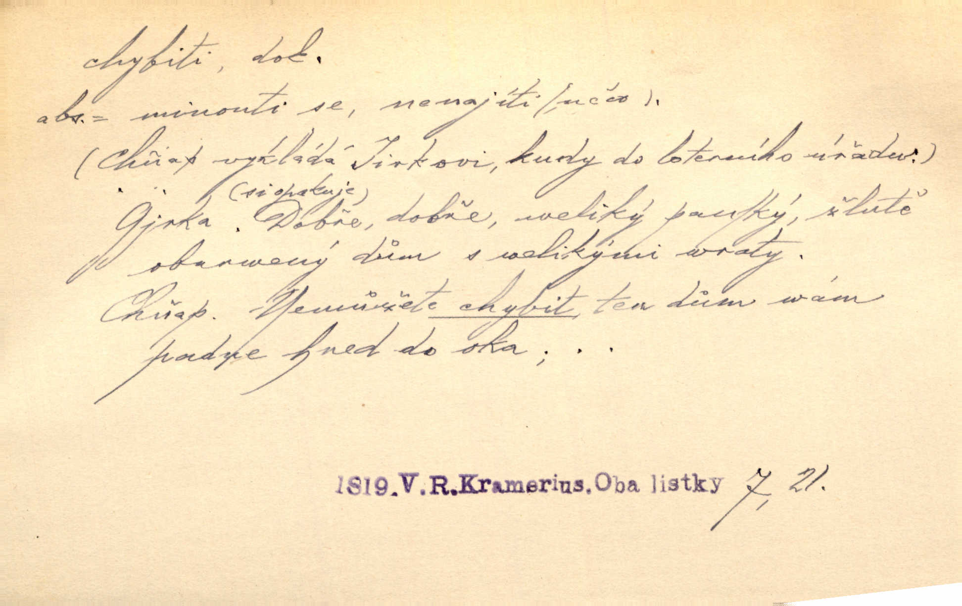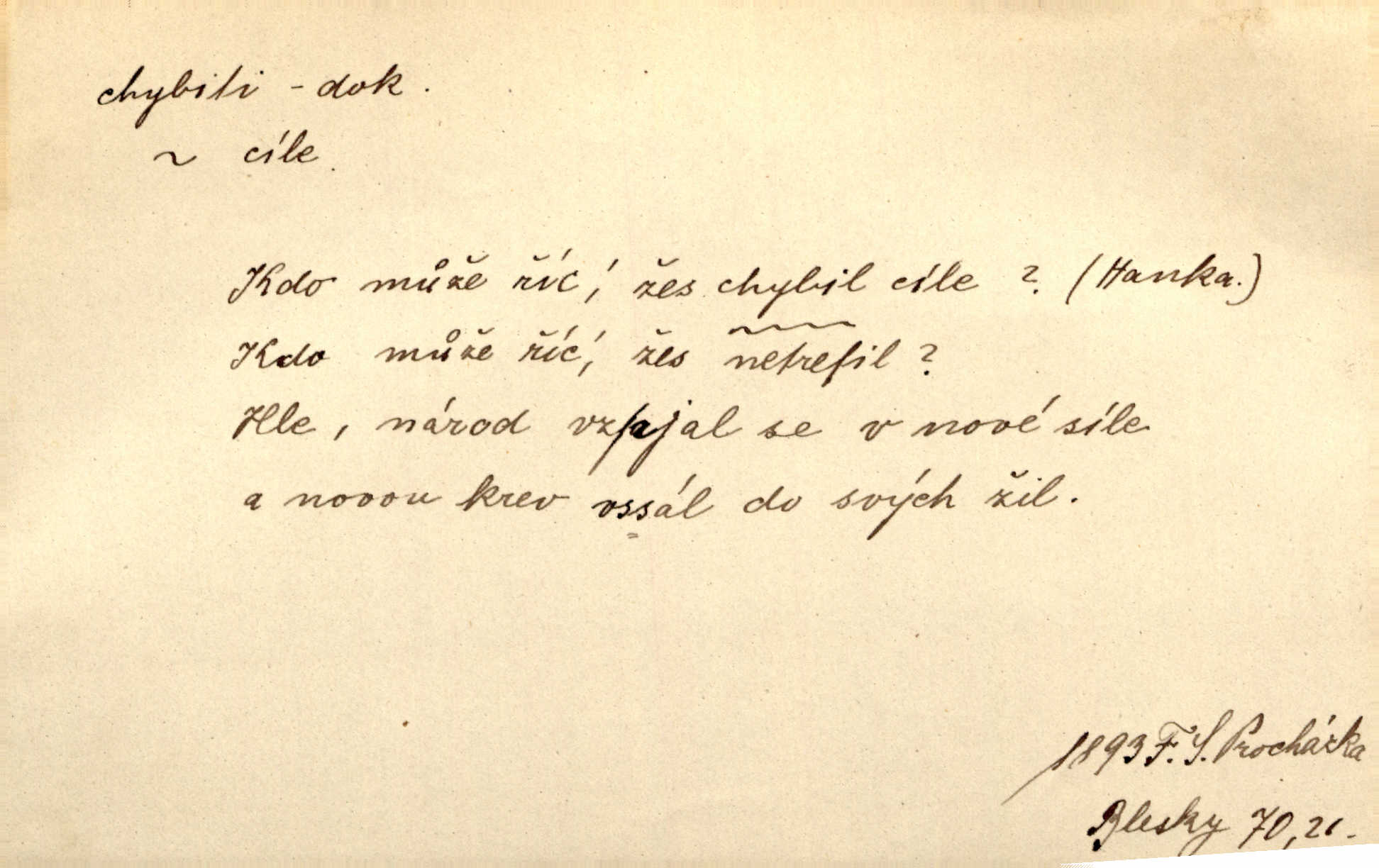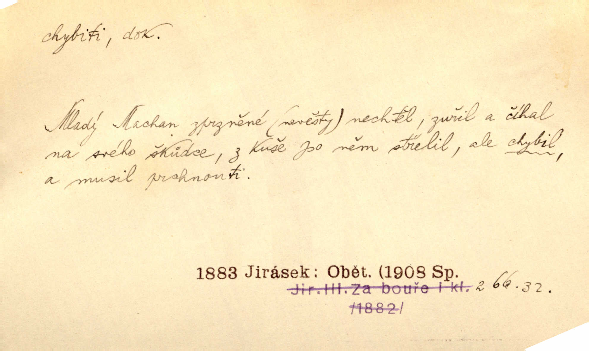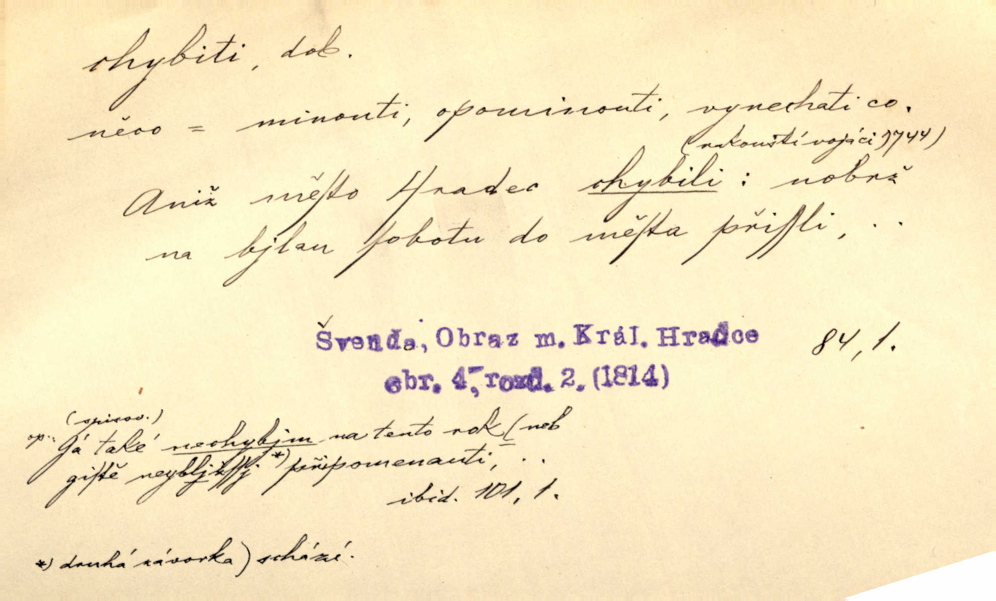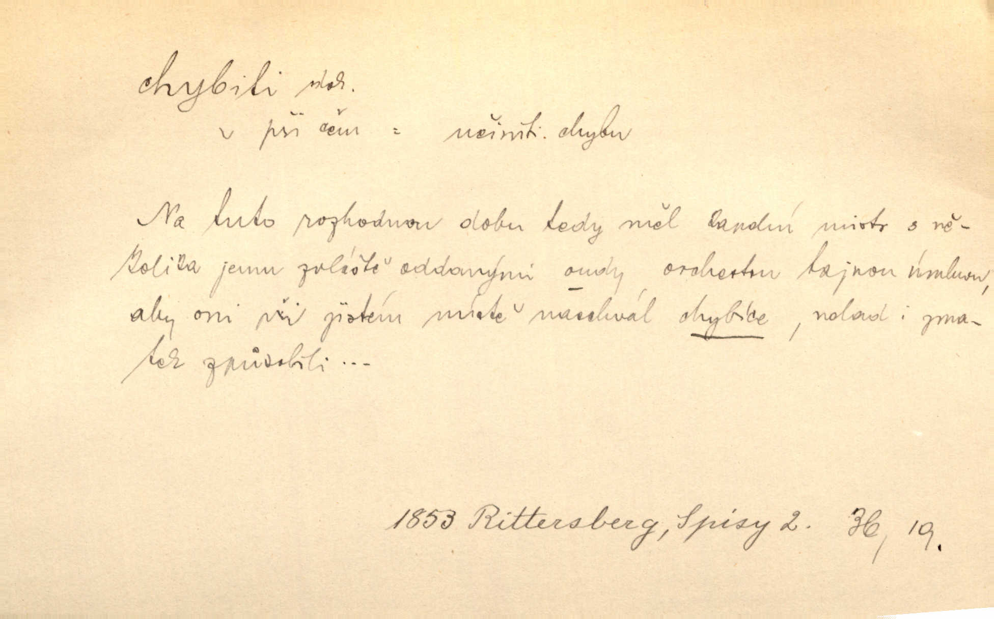 - chybiti dok. udělati chybu, zmýliti se. Chybil jsem, ale chci chybu svou napravit. Rad. I spravedlivý chybí denně sedmkrát. Ner. „Když chybí učený, chybí hodně!“ řekl pan Franc. Rub. Začala, že s tou holkou, myslím, chybila, že je způsobna, ochotna. Jir. D (co) minouti, nezasáhnouti, netrefiti něco. [Vojáci] vystrkují po odstřelu značky, zda střelec trefil či chybil. Marcha. Škoda každé rány, která chybí! Třeb. Srna píská, srnec říje: vystřelili, chybili je. Heyd. Výstřel houkl, ale chybená liška uháněla do selských lesů. Stráž mysl. Kdo může říc’, žes chybil cíle? F. S. Proch. D s cesty sejíti, zblouditi: (koho, co) minouti se s někým, s něčím. Řekloť se nám, že nemůžeme chybiti — a vskutku stáli jsme asi za dvě hodiny u temného vchodu jeskyně. Tyl. Aby sme ho pak byli chybili minuli se s ním. Kram. Chybila jsem cestičku, kde se křižovala. Krás. D Dial. chybilo mi uklouzl jsem. Chybilo mi, nohy mi ujely na hladké slámě a sletěl jsem do parní mlátičky. Baar. D chybiti se (koho, čeho) nezasáhnouti, netrefiti. Chybil se [myslivec] kachny o celý barák Něm. A jak šikovně hází [brambory], nechybil se ani jednou nádoby Baar. D (čeho, s čím, nespr. čím) minouti se. Vždy se cesty chybí, kdo bludičkou je zaveden Krás. Štolba chybil se brodu. Zey. Takovéto nakládání s muži někdy v národu váženými chybilo se dokonce s cílem svým. Pal. Řeči takové nechybily se s oučinkem. Pal. Zřejmě se tento lékař chybil svým povoláním. Nor.