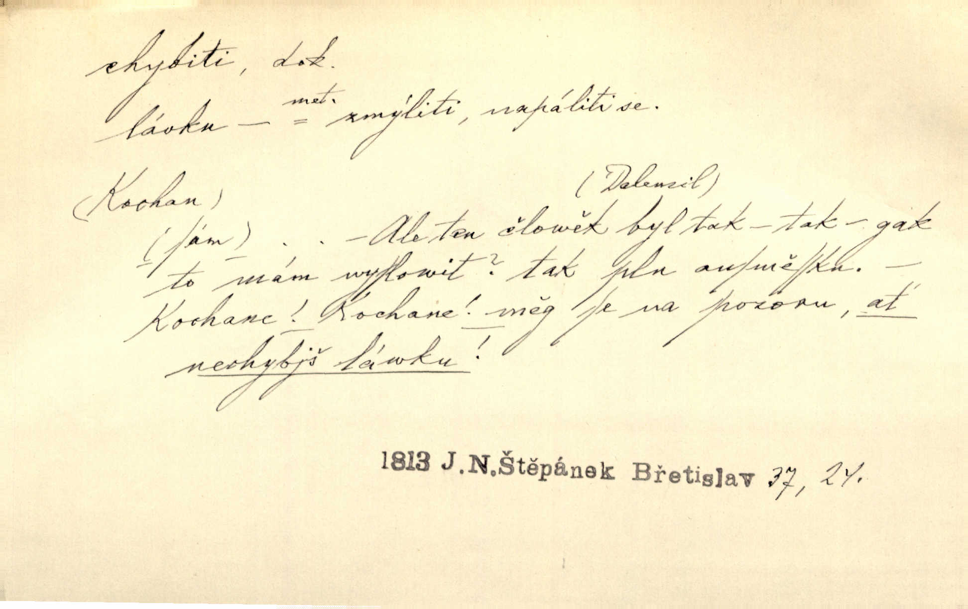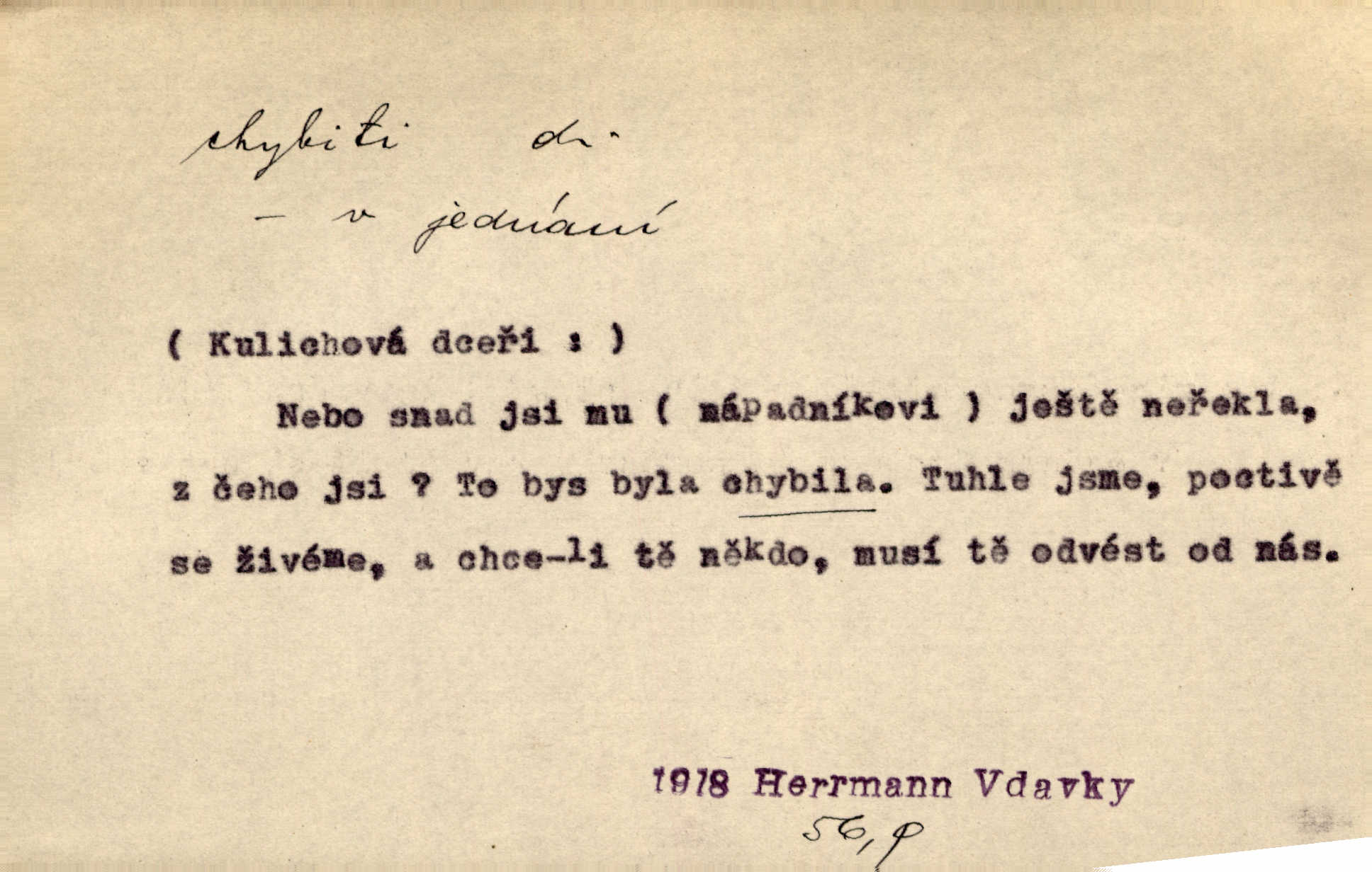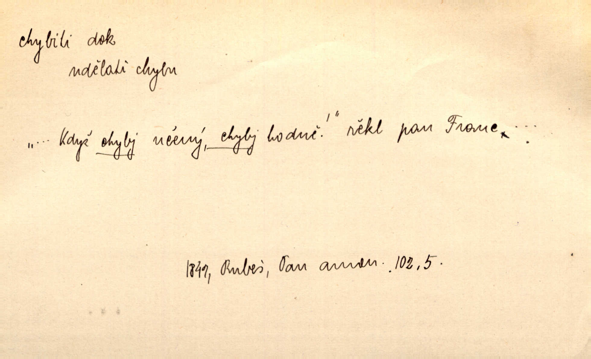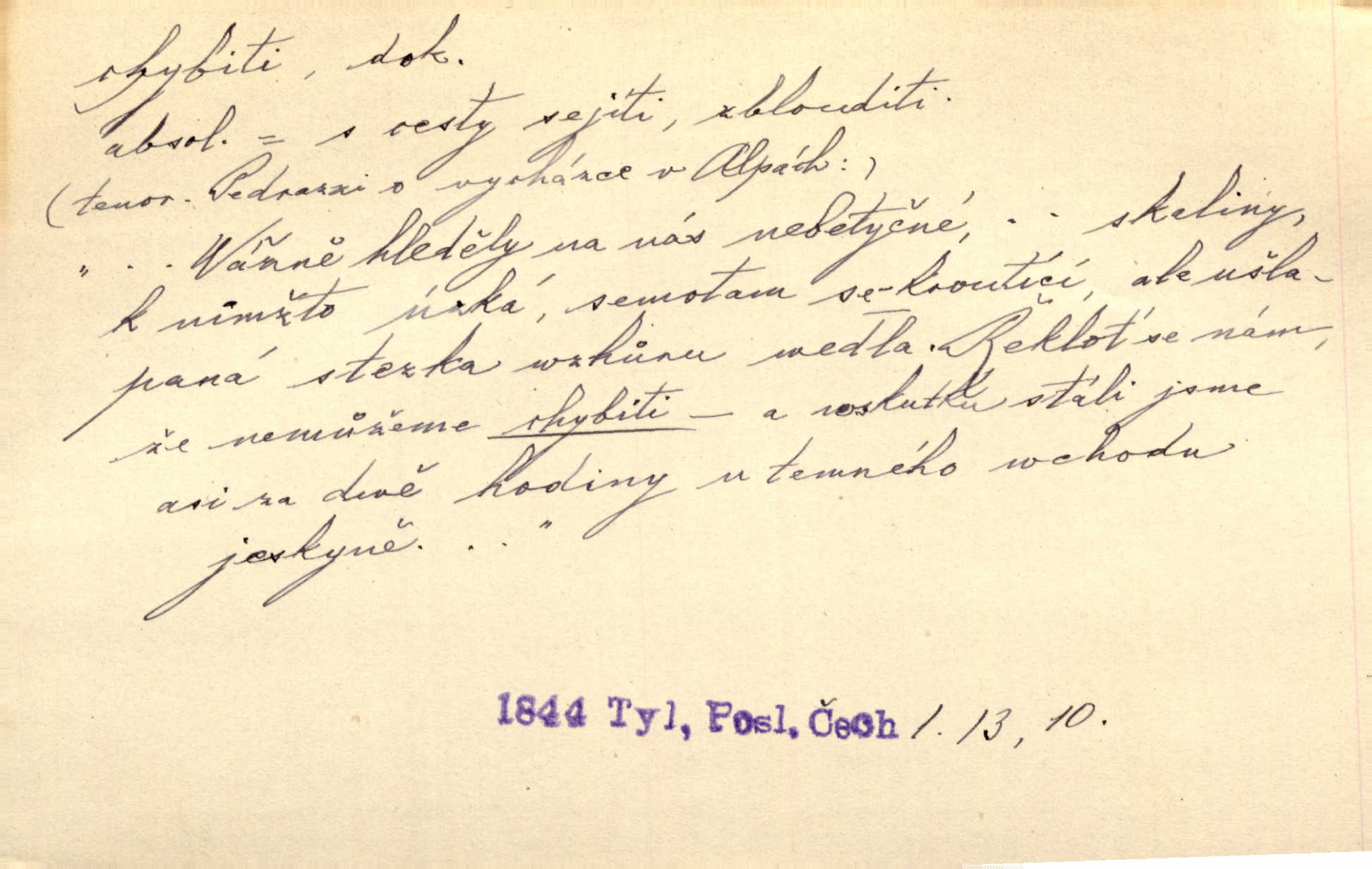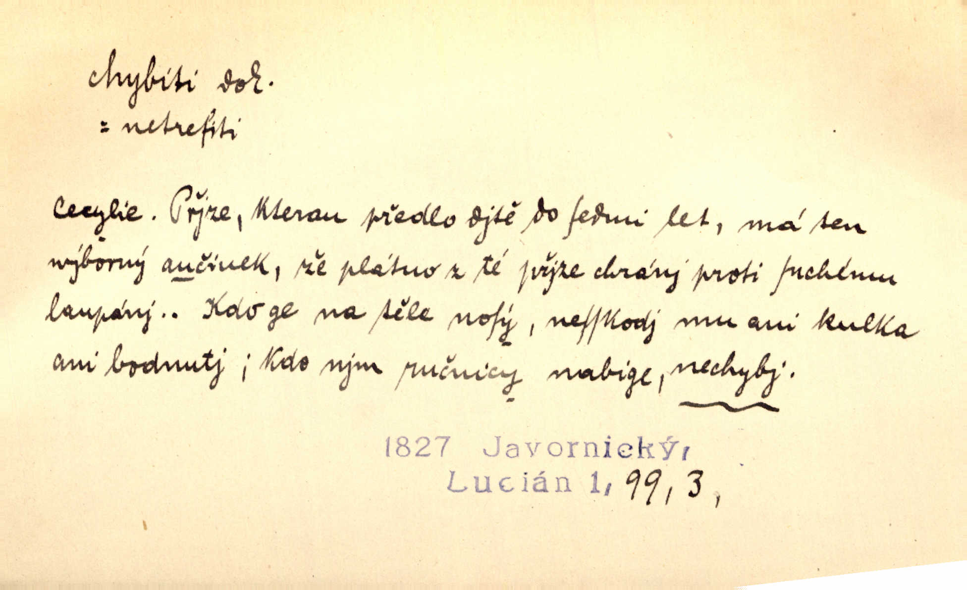 - chybiti dok. udělati chybu, zmýliti se. Chybil jsem, ale chci chybu svou napravit. Rad. I spravedlivý chybí denně sedmkrát. Ner. „Když chybí učený, chybí hodně!“ řekl pan Franc. Rub. Začala, že s tou holkou, myslím, chybila, že je způsobna, ochotna. Jir. D (co) minouti, nezasáhnouti, netrefiti něco. [Vojáci] vystrkují po odstřelu značky, zda střelec trefil či chybil. Marcha. Škoda každé rány, která chybí! Třeb. Srna píská, srnec říje: vystřelili, chybili je. Heyd. Výstřel houkl, ale chybená liška uháněla do selských lesů. Stráž mysl. Kdo může říc’, žes chybil cíle? F. S. Proch. D s cesty sejíti, zblouditi: (koho, co) minouti se s někým, s něčím. Řekloť se nám, že nemůžeme chybiti — a vskutku stáli jsme asi za dvě hodiny u temného vchodu jeskyně. Tyl. Aby sme ho pak byli chybili minuli se s ním. Kram. Chybila jsem cestičku, kde se křižovala. Krás. D Dial. chybilo mi uklouzl jsem. Chybilo mi, nohy mi ujely na hladké slámě a sletěl jsem do parní mlátičky. Baar. D chybiti se (koho, čeho) nezasáhnouti, netrefiti. Chybil se [myslivec] kachny o celý barák Něm. A jak šikovně hází [brambory], nechybil se ani jednou nádoby Baar. D (čeho, s čím, nespr. čím) minouti se. Vždy se cesty chybí, kdo bludičkou je zaveden Krás. Štolba chybil se brodu. Zey. Takovéto nakládání s muži někdy v národu váženými chybilo se dokonce s cílem svým. Pal. Řeči takové nechybily se s oučinkem. Pal. Zřejmě se tento lékař chybil svým povoláním. Nor.