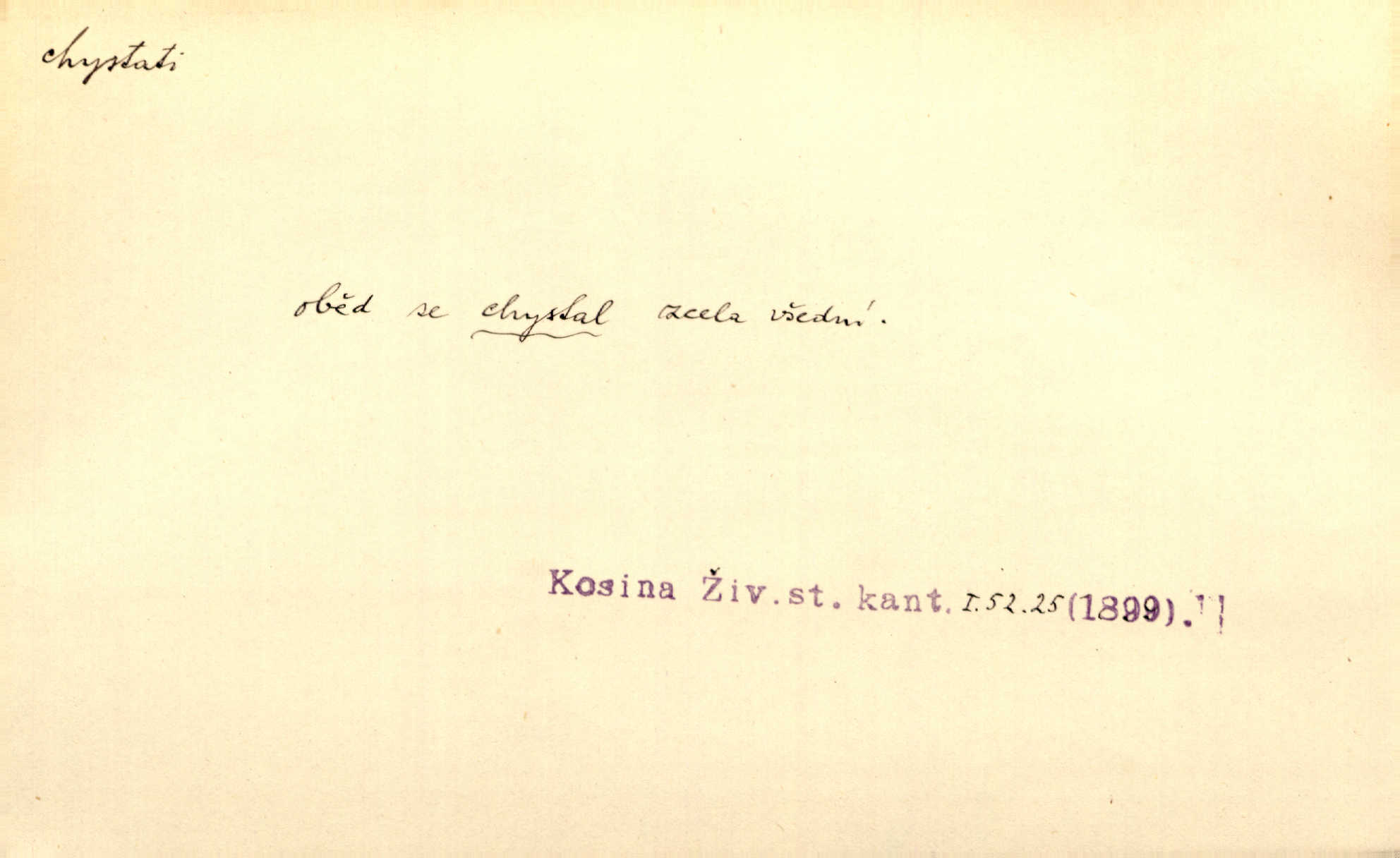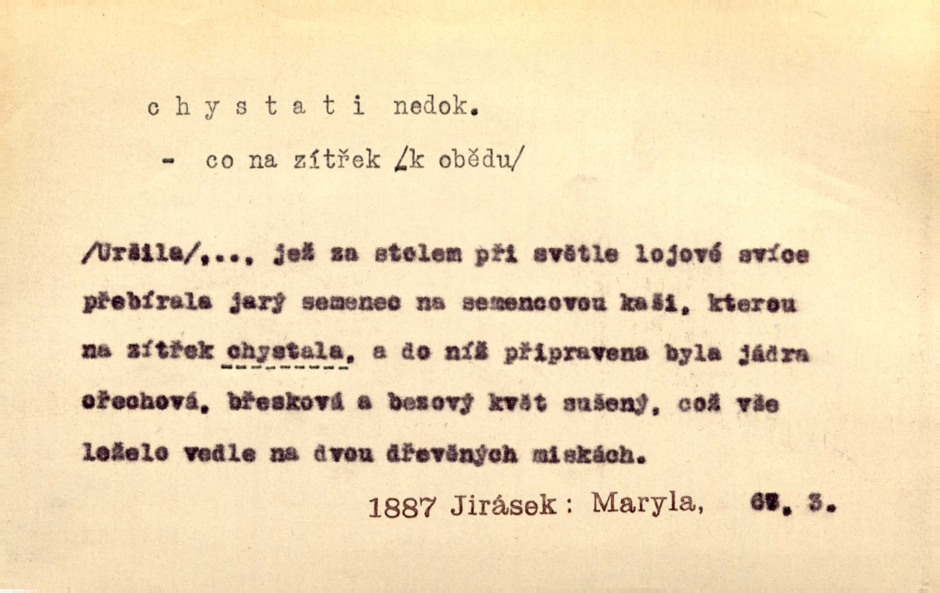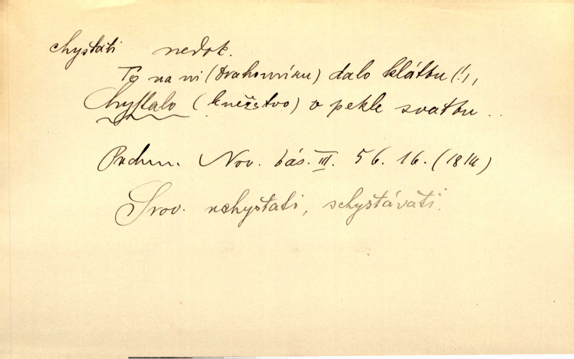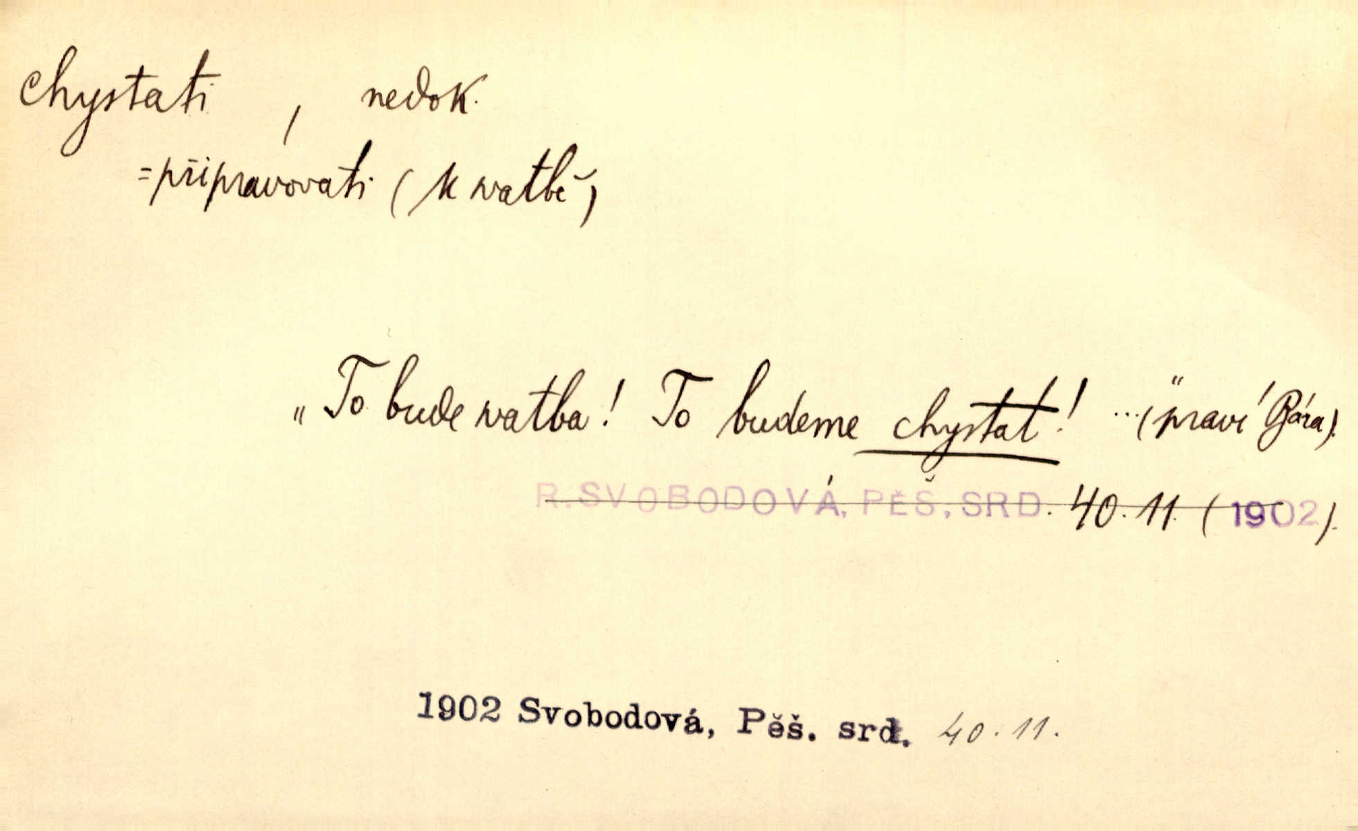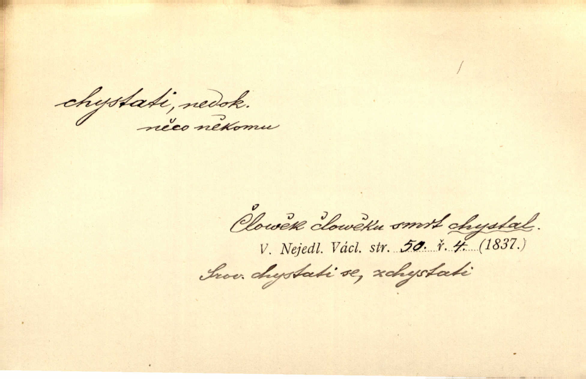 - chystati ned. (co) připravovati, strojiti. Matka chystala večeři. Jir. Chystám historické dílo o vládě Jiřího z Poděbrad. K. Čap. Chystal všechno k důstojnému uvítání nevěsty. Jir. Můžete si chystati vdovské šaty budete brzy vdovou. Jir. Kdo ví, co vše život tobě chystá. Kam. Vyšel do stodoly chystat kravám dáti krmení. D chystati se připravovati se, hotoviti se. Pan rada se chystá s neděle na delší dovolenou. Šim. Najednou začne chátrat — a bylo vidět, že se chystá na onen svět brzy zemře. Proč nám nepřišel nikdo říct, že se stařenka chystá k smrti? jde to s ní ke konci. A. Mrš. Chystal se do psaní. Jir. Celé okolí se chystalo podívat se na oddavky zemanovy. Svět. Otec se chystal, že si přistaví malou světničku pro výminek. Prav. Čeleď chystala se, aby vykonala rozkaz pana Jana. Třeb. Polní hejtman chystal se z tábora se svým houfem hned druhého dne. Jir. K vůli němu [oficíru] přišla o místo, nic teď nemá a v tuhle chvíli, když se chystá čeká se, je před porodem. Jir. Chystalo se na bouřku. Jir. Chystalo se k dešti. Zey.
