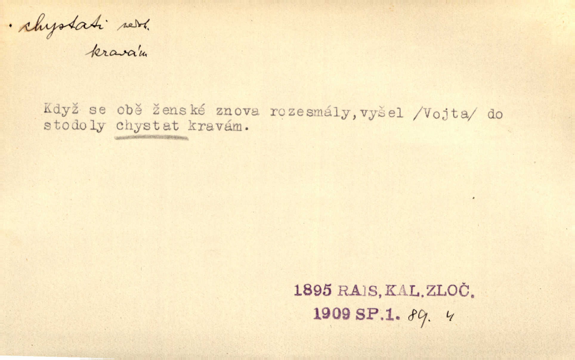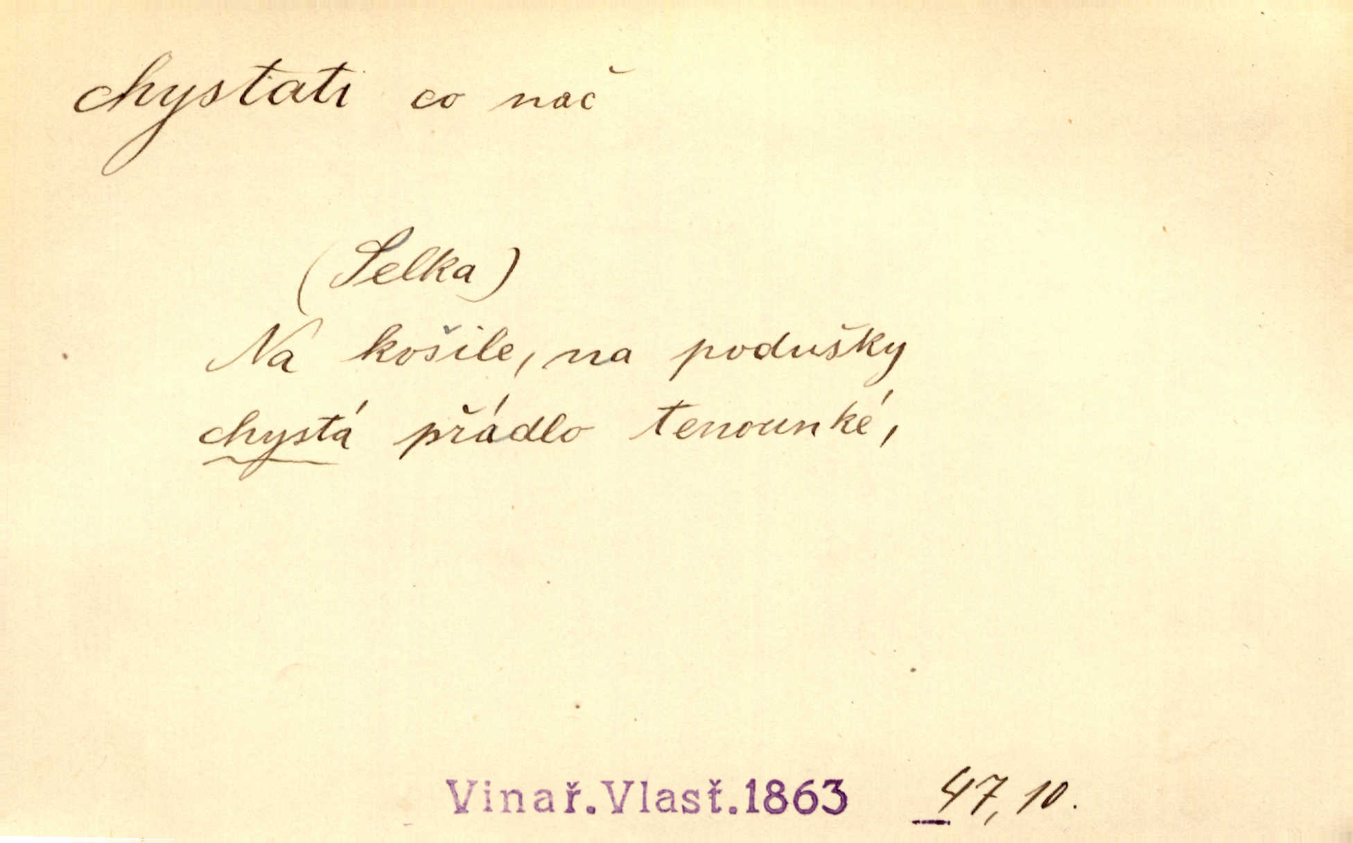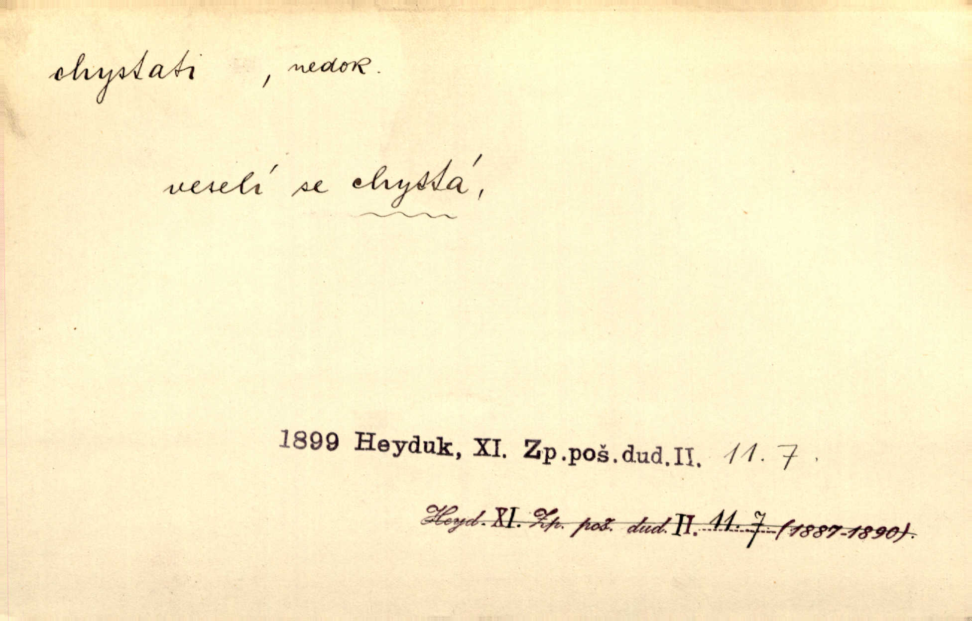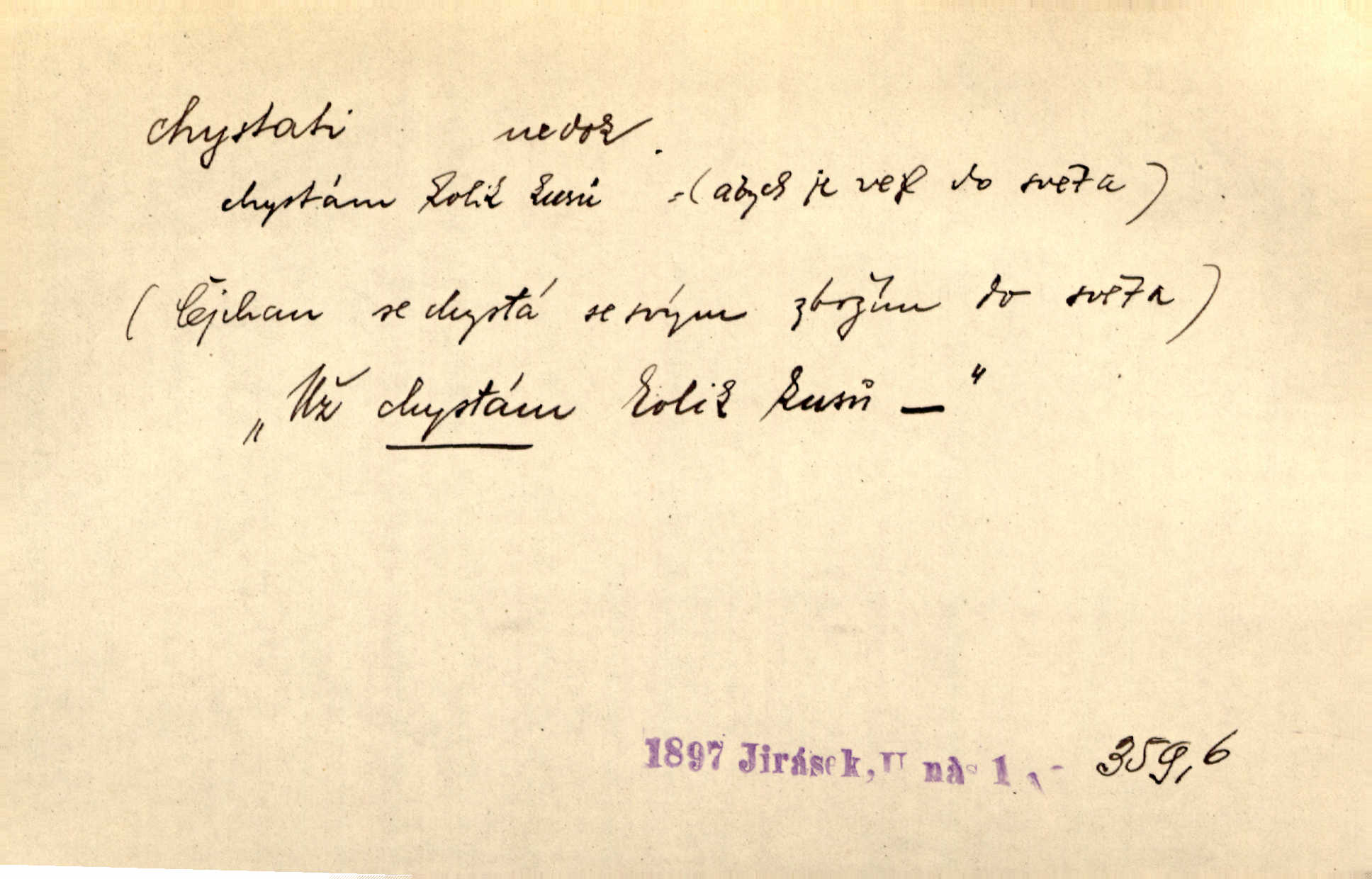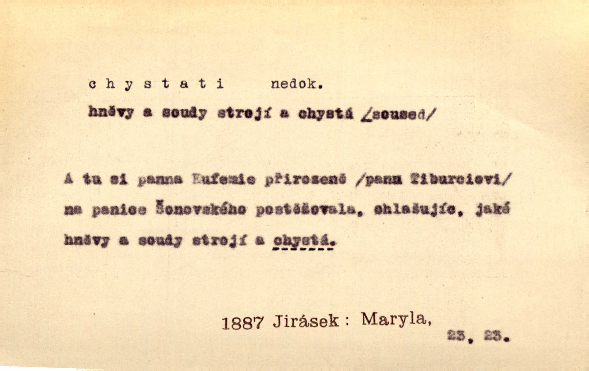 - chystati ned. (co) připravovati, strojiti. Matka chystala večeři. Jir. Chystám historické dílo o vládě Jiřího z Poděbrad. K. Čap. Chystal všechno k důstojnému uvítání nevěsty. Jir. Můžete si chystati vdovské šaty budete brzy vdovou. Jir. Kdo ví, co vše život tobě chystá. Kam. Vyšel do stodoly chystat kravám dáti krmení. D chystati se připravovati se, hotoviti se. Pan rada se chystá s neděle na delší dovolenou. Šim. Najednou začne chátrat — a bylo vidět, že se chystá na onen svět brzy zemře. Proč nám nepřišel nikdo říct, že se stařenka chystá k smrti? jde to s ní ke konci. A. Mrš. Chystal se do psaní. Jir. Celé okolí se chystalo podívat se na oddavky zemanovy. Svět. Otec se chystal, že si přistaví malou světničku pro výminek. Prav. Čeleď chystala se, aby vykonala rozkaz pana Jana. Třeb. Polní hejtman chystal se z tábora se svým houfem hned druhého dne. Jir. K vůli němu [oficíru] přišla o místo, nic teď nemá a v tuhle chvíli, když se chystá čeká se, je před porodem. Jir. Chystalo se na bouřku. Jir. Chystalo se k dešti. Zey.