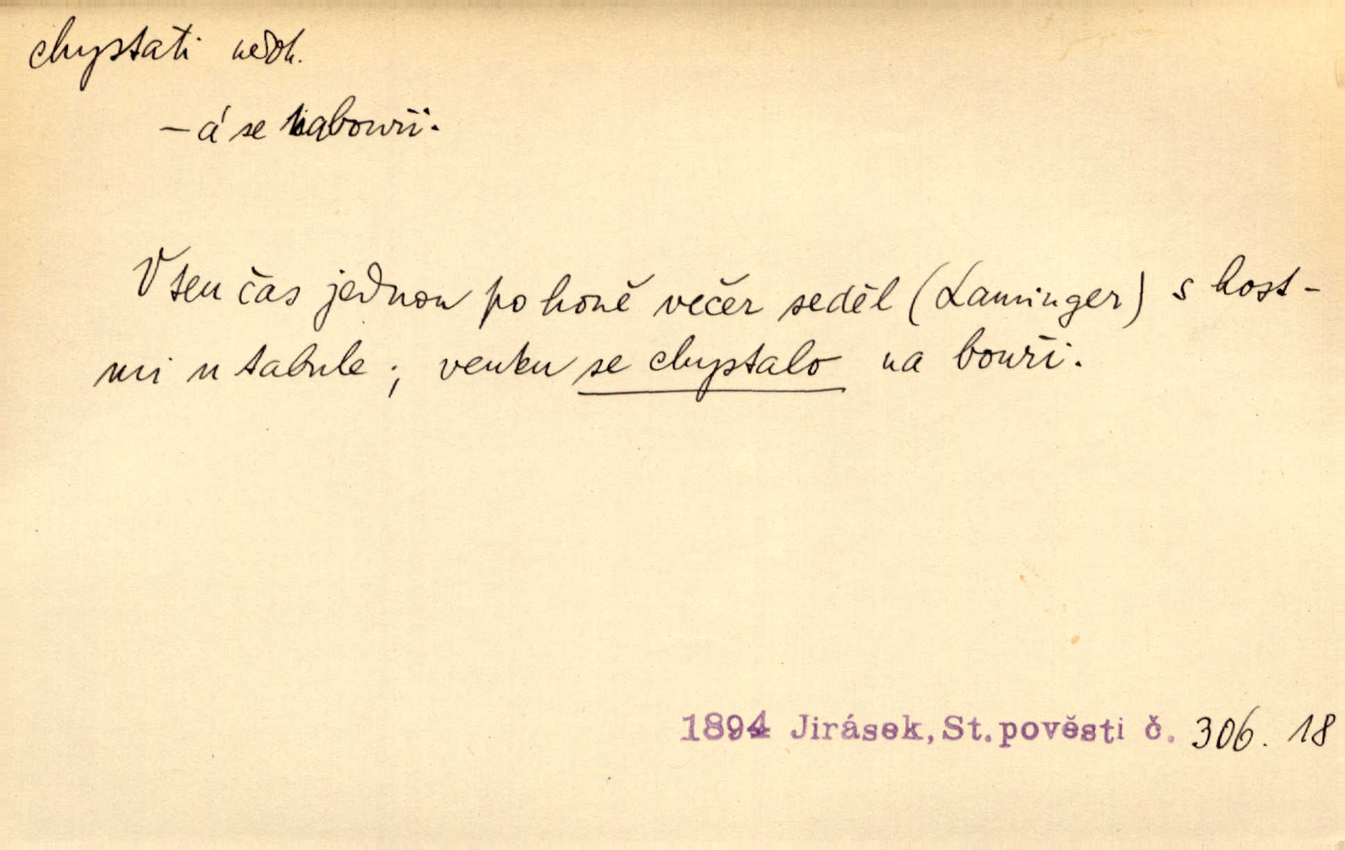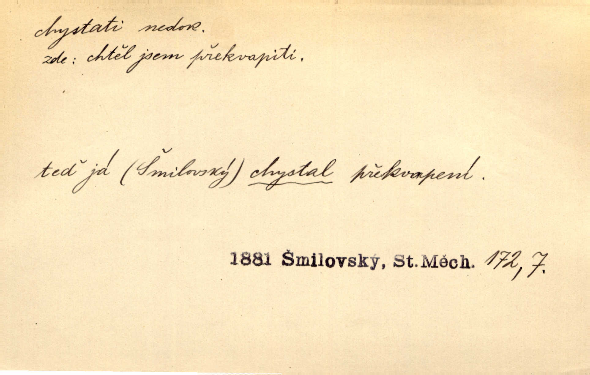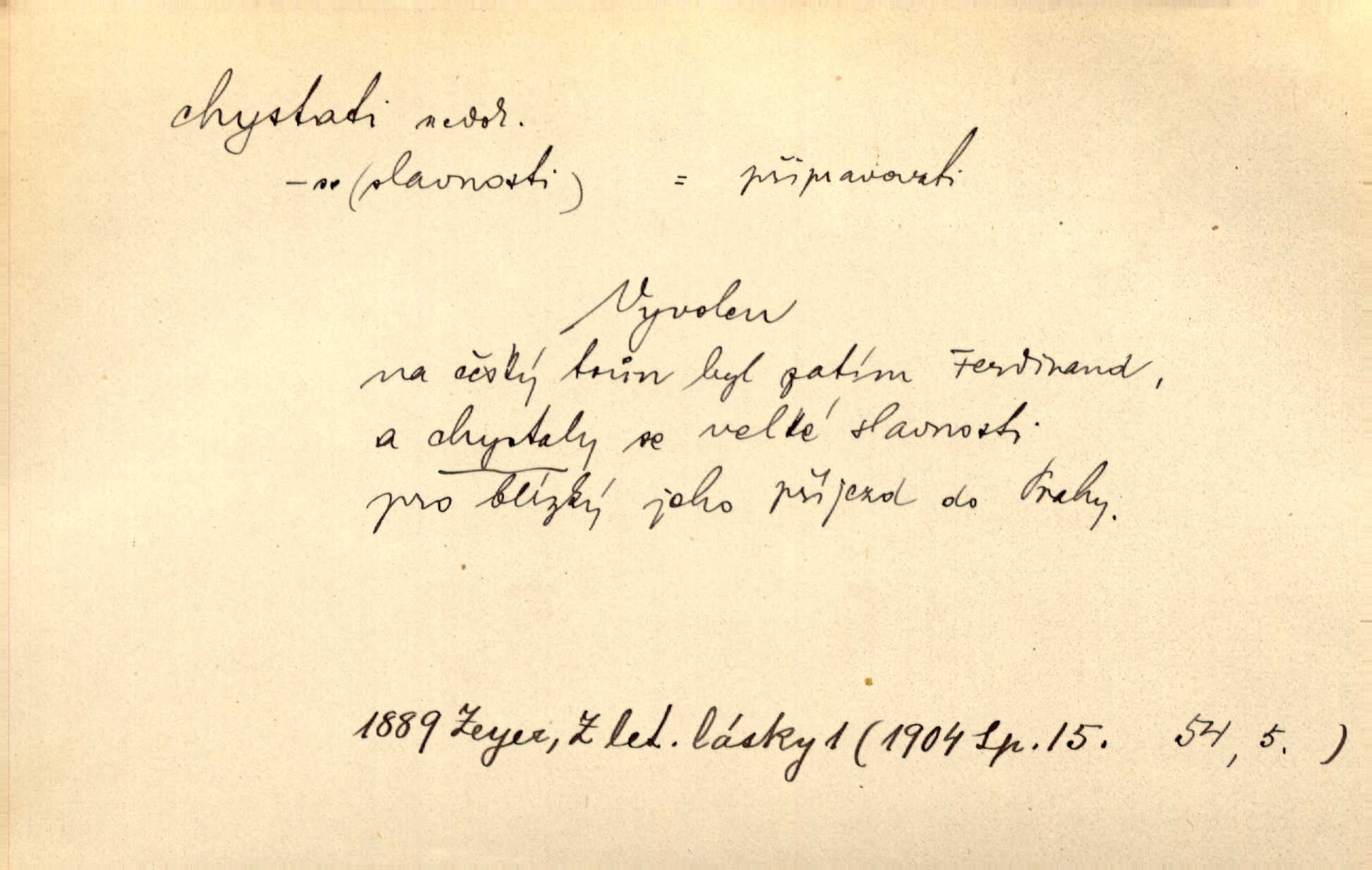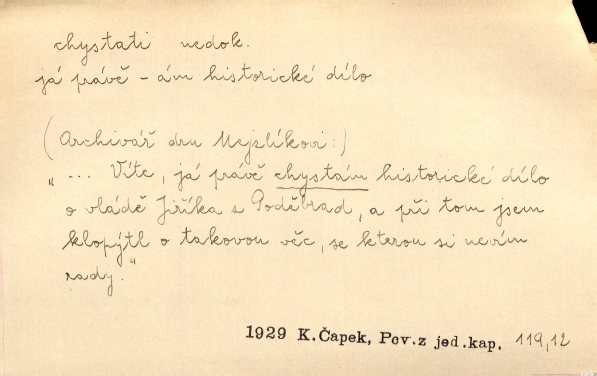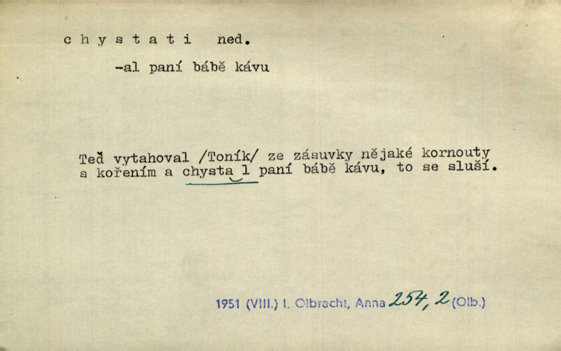 - chystati ned. (co) připravovati, strojiti. Matka chystala večeři. Jir. Chystám historické dílo o vládě Jiřího z Poděbrad. K. Čap. Chystal všechno k důstojnému uvítání nevěsty. Jir. Můžete si chystati vdovské šaty budete brzy vdovou. Jir. Kdo ví, co vše život tobě chystá. Kam. Vyšel do stodoly chystat kravám dáti krmení. D chystati se připravovati se, hotoviti se. Pan rada se chystá s neděle na delší dovolenou. Šim. Najednou začne chátrat — a bylo vidět, že se chystá na onen svět brzy zemře. Proč nám nepřišel nikdo říct, že se stařenka chystá k smrti? jde to s ní ke konci. A. Mrš. Chystal se do psaní. Jir. Celé okolí se chystalo podívat se na oddavky zemanovy. Svět. Otec se chystal, že si přistaví malou světničku pro výminek. Prav. Čeleď chystala se, aby vykonala rozkaz pana Jana. Třeb. Polní hejtman chystal se z tábora se svým houfem hned druhého dne. Jir. K vůli němu [oficíru] přišla o místo, nic teď nemá a v tuhle chvíli, když se chystá čeká se, je před porodem. Jir. Chystalo se na bouřku. Jir. Chystalo se k dešti. Zey.