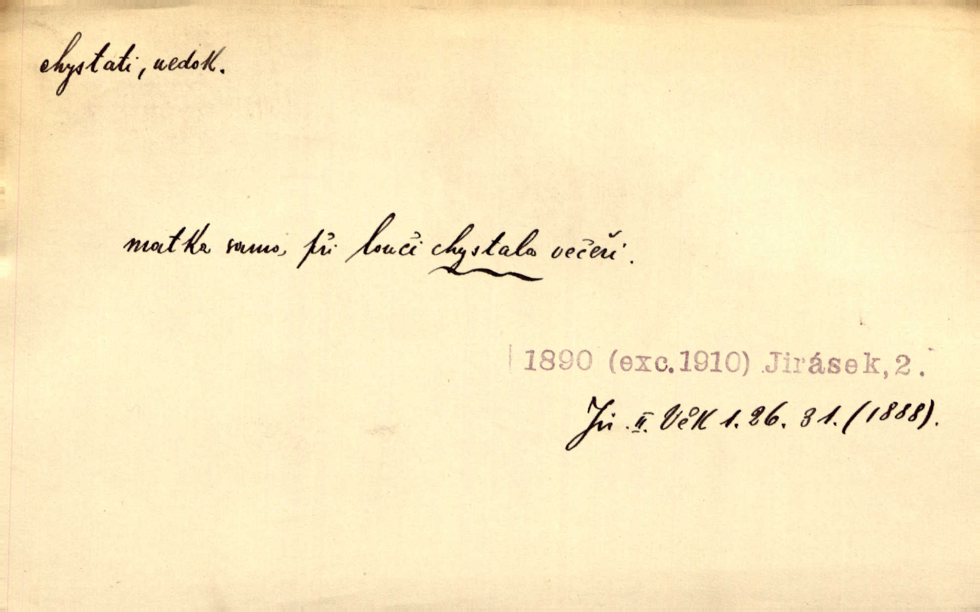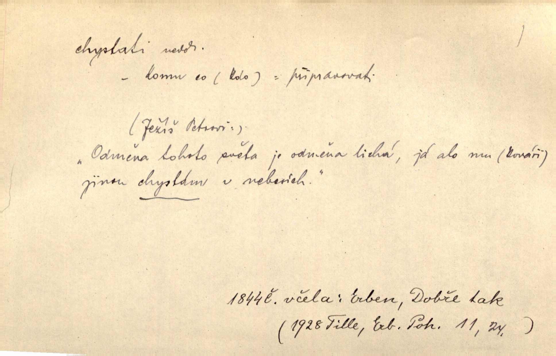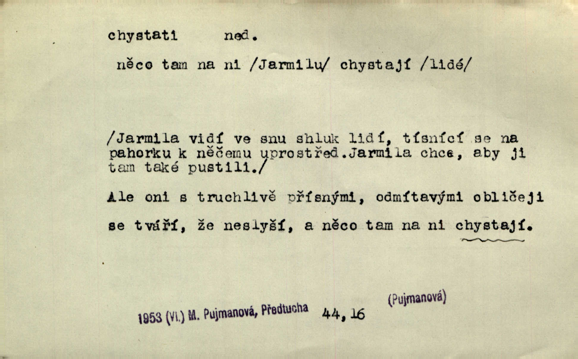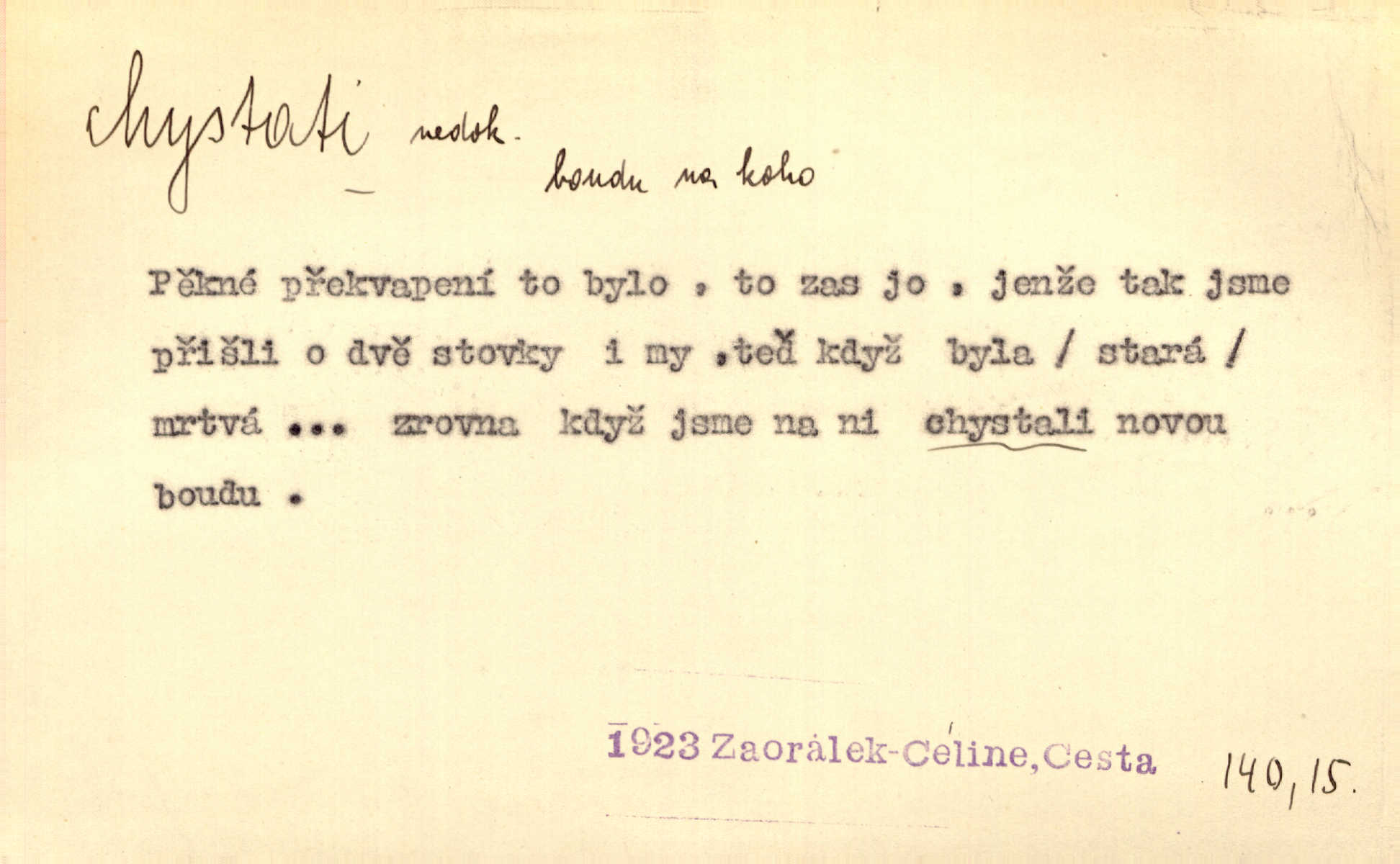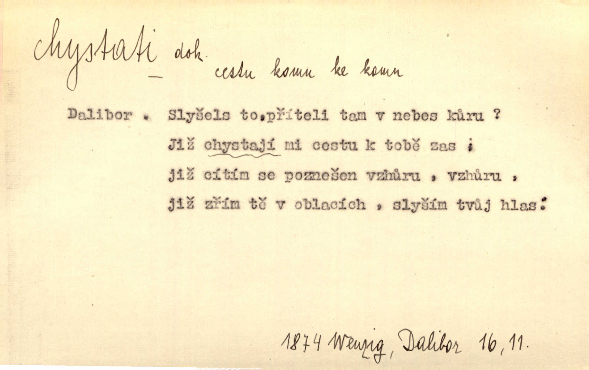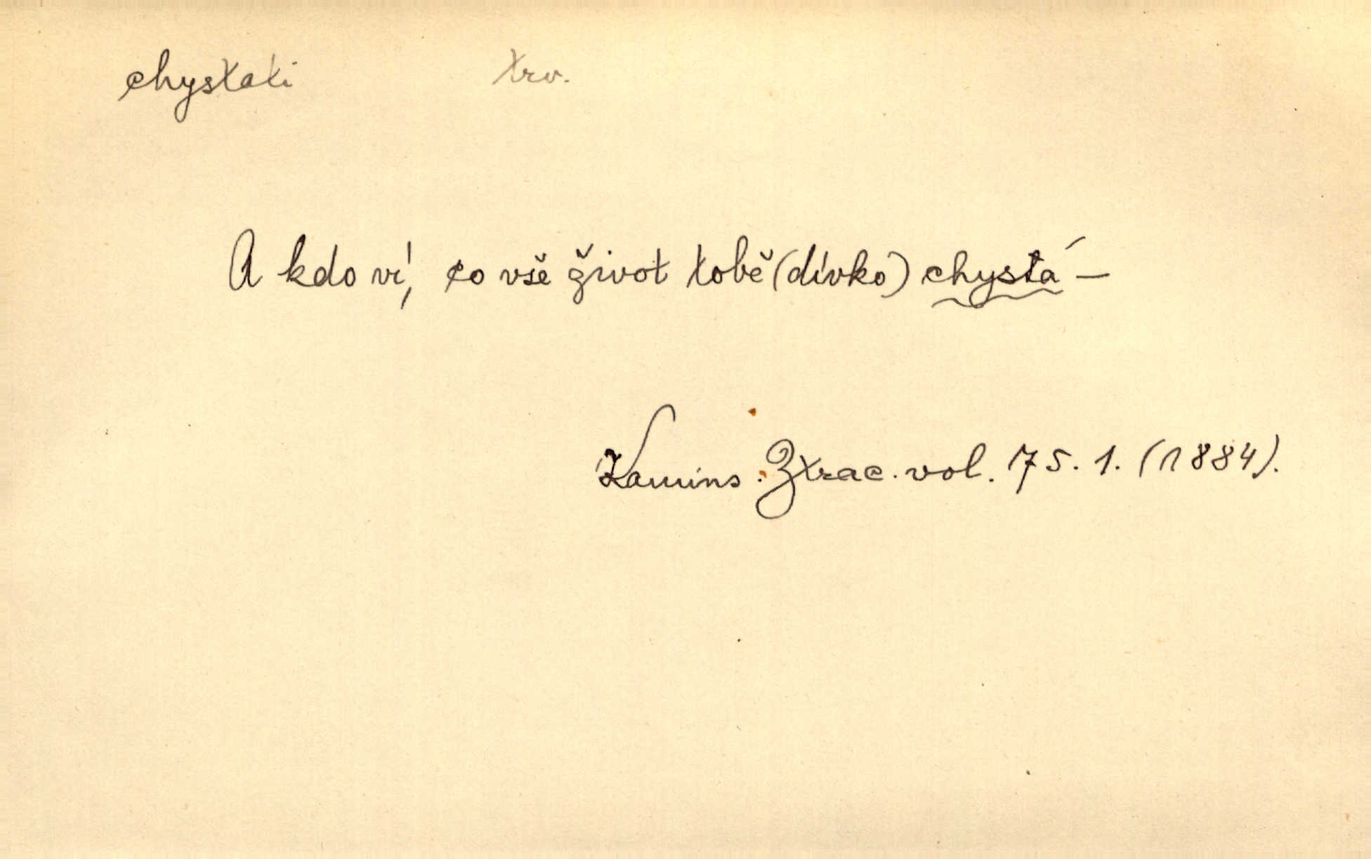 - chystati ned. (co) připravovati, strojiti. Matka chystala večeři. Jir. Chystám historické dílo o vládě Jiřího z Poděbrad. K. Čap. Chystal všechno k důstojnému uvítání nevěsty. Jir. Můžete si chystati vdovské šaty budete brzy vdovou. Jir. Kdo ví, co vše život tobě chystá. Kam. Vyšel do stodoly chystat kravám dáti krmení. D chystati se připravovati se, hotoviti se. Pan rada se chystá s neděle na delší dovolenou. Šim. Najednou začne chátrat — a bylo vidět, že se chystá na onen svět brzy zemře. Proč nám nepřišel nikdo říct, že se stařenka chystá k smrti? jde to s ní ke konci. A. Mrš. Chystal se do psaní. Jir. Celé okolí se chystalo podívat se na oddavky zemanovy. Svět. Otec se chystal, že si přistaví malou světničku pro výminek. Prav. Čeleď chystala se, aby vykonala rozkaz pana Jana. Třeb. Polní hejtman chystal se z tábora se svým houfem hned druhého dne. Jir. K vůli němu [oficíru] přišla o místo, nic teď nemá a v tuhle chvíli, když se chystá čeká se, je před porodem. Jir. Chystalo se na bouřku. Jir. Chystalo se k dešti. Zey.