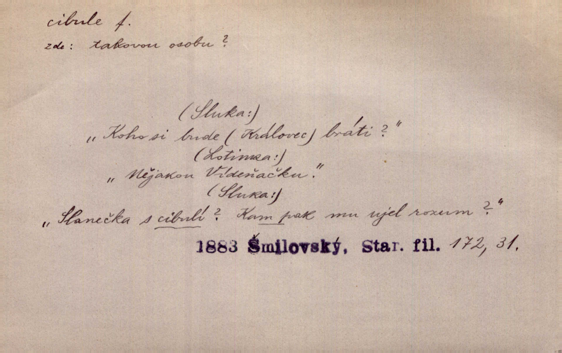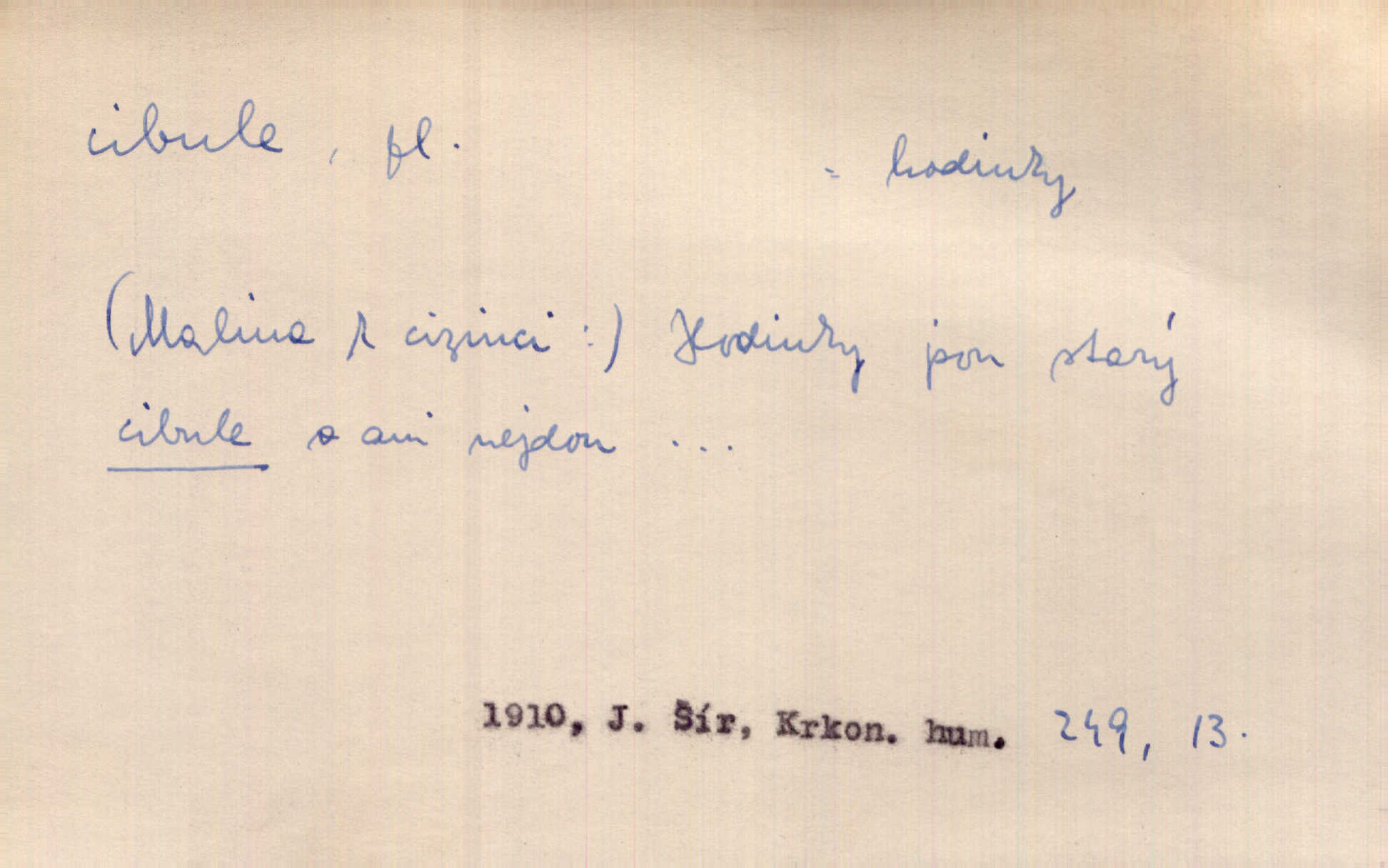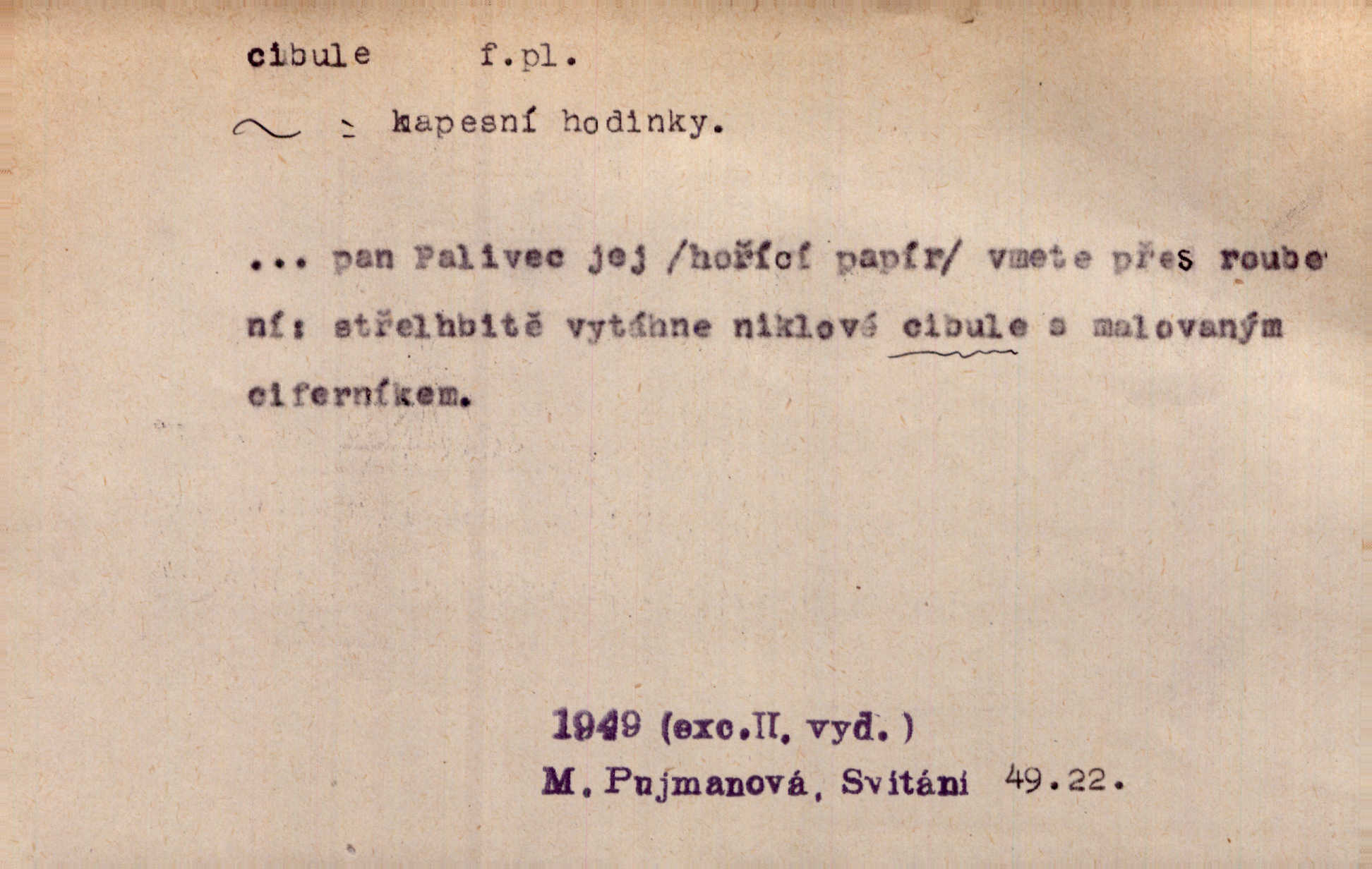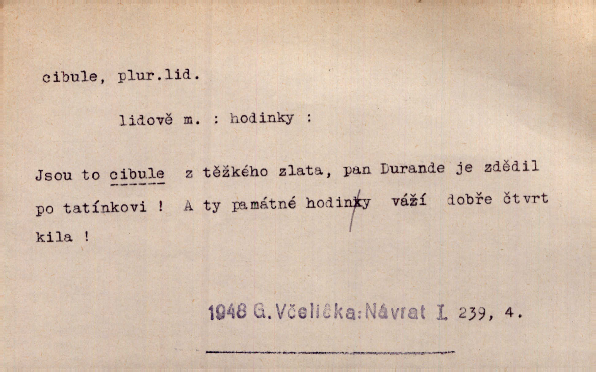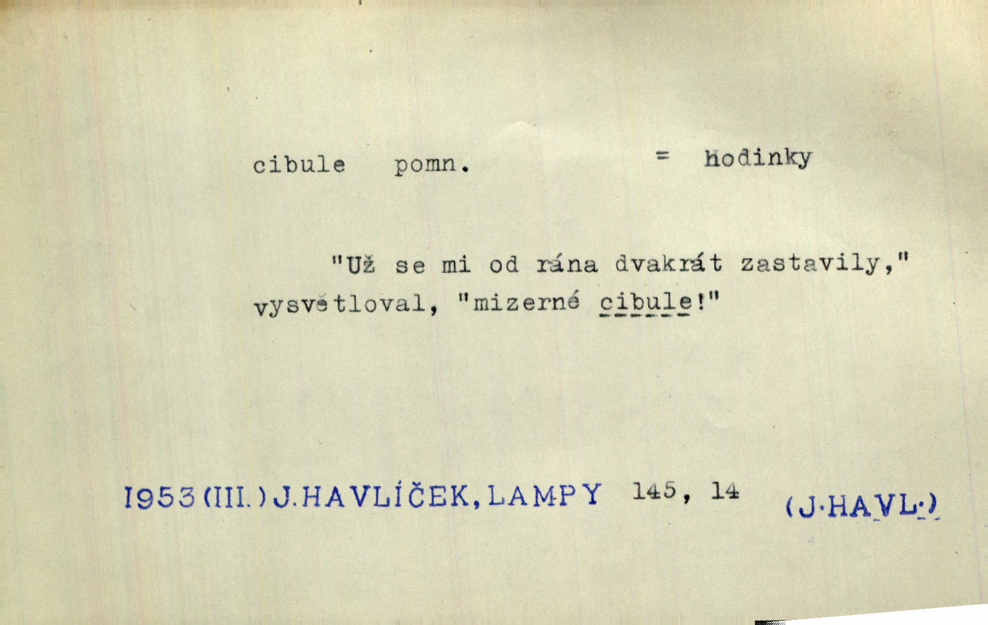 - cibule, -e f. zeleninová rostlina (Allium cepa). Mořská cibule pokojová rostlina (Scilla maritima). D podzemní kulovitá, loupavá část některých bylin. Cibule hyacintové, tulipánové, liliové, narcisové a p. D předmět cibulovitého, baňatého tvaru, zejm. věžní báň. Štíhlá věž chrámu a dvě cibule na radnici vyhlížely již přes vršky. Rais. Lid. cibule pomn. baňaté kapesní hodinky, vulg. hodinky vůbec. Byly to bachraté „cibule“, vřetenky. Herrm. Jedeme z města přes hodinu, dotvrzoval mladík, zíraje na veliké cibule. Rais.