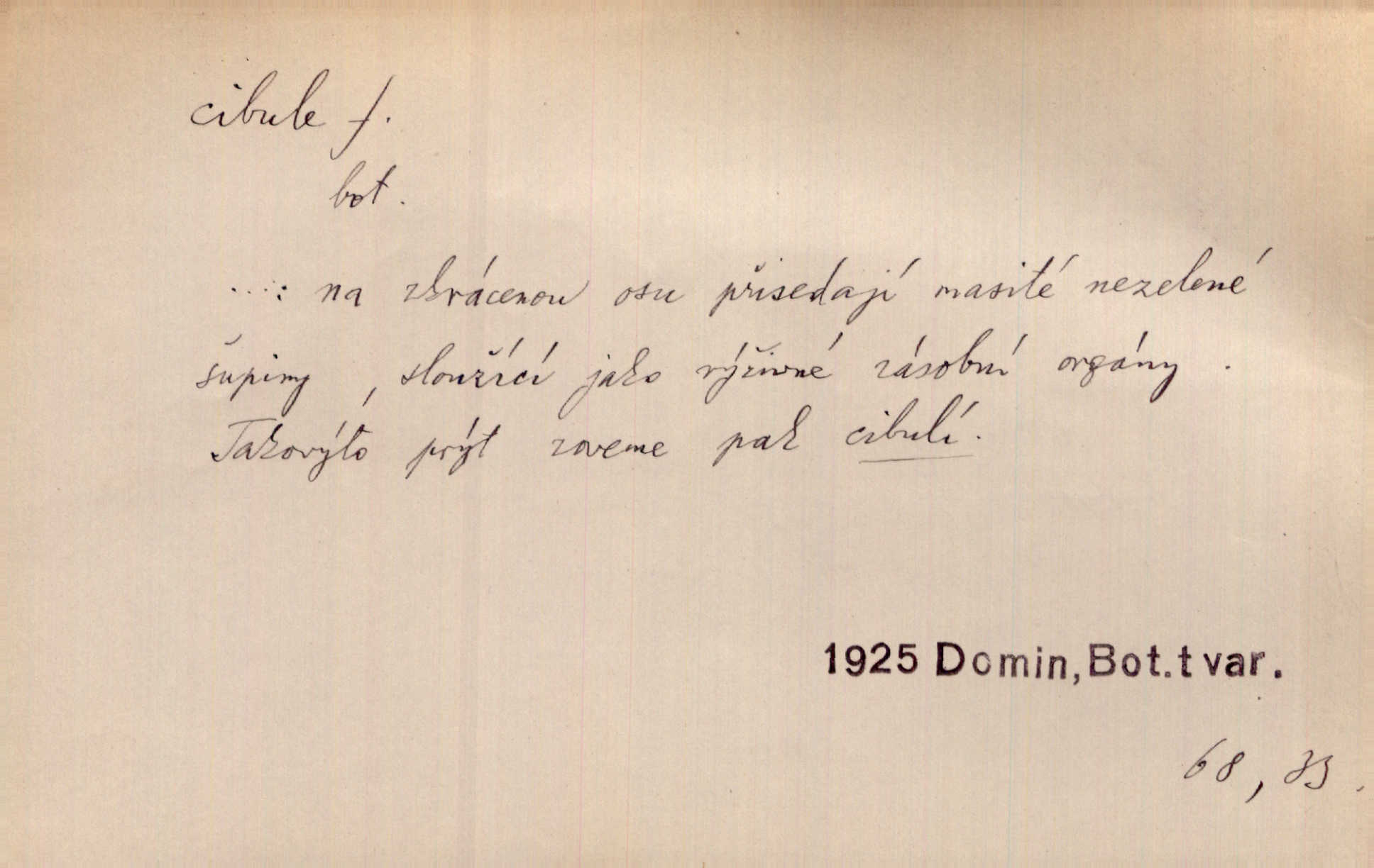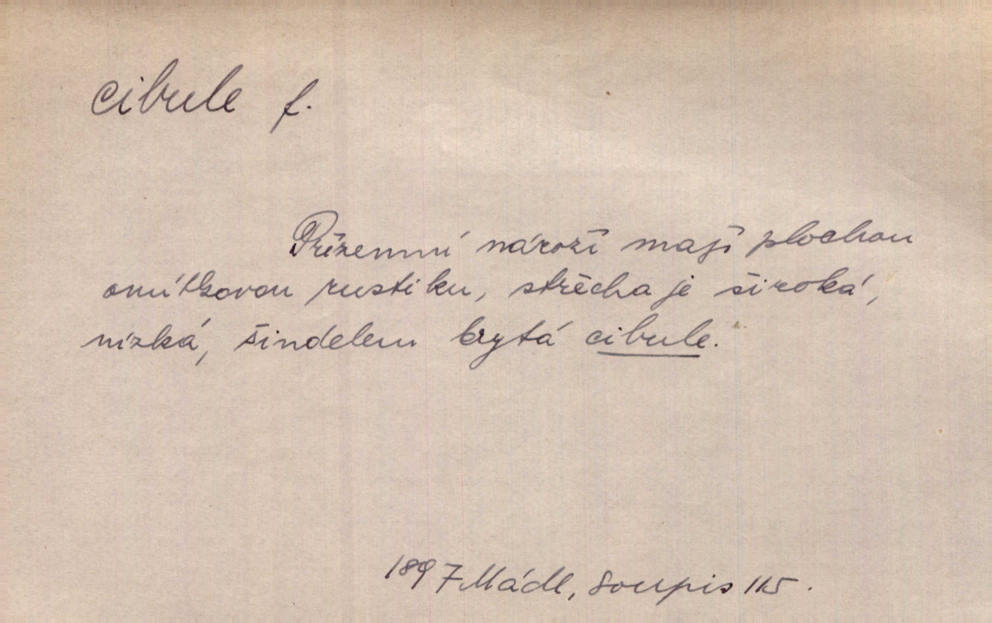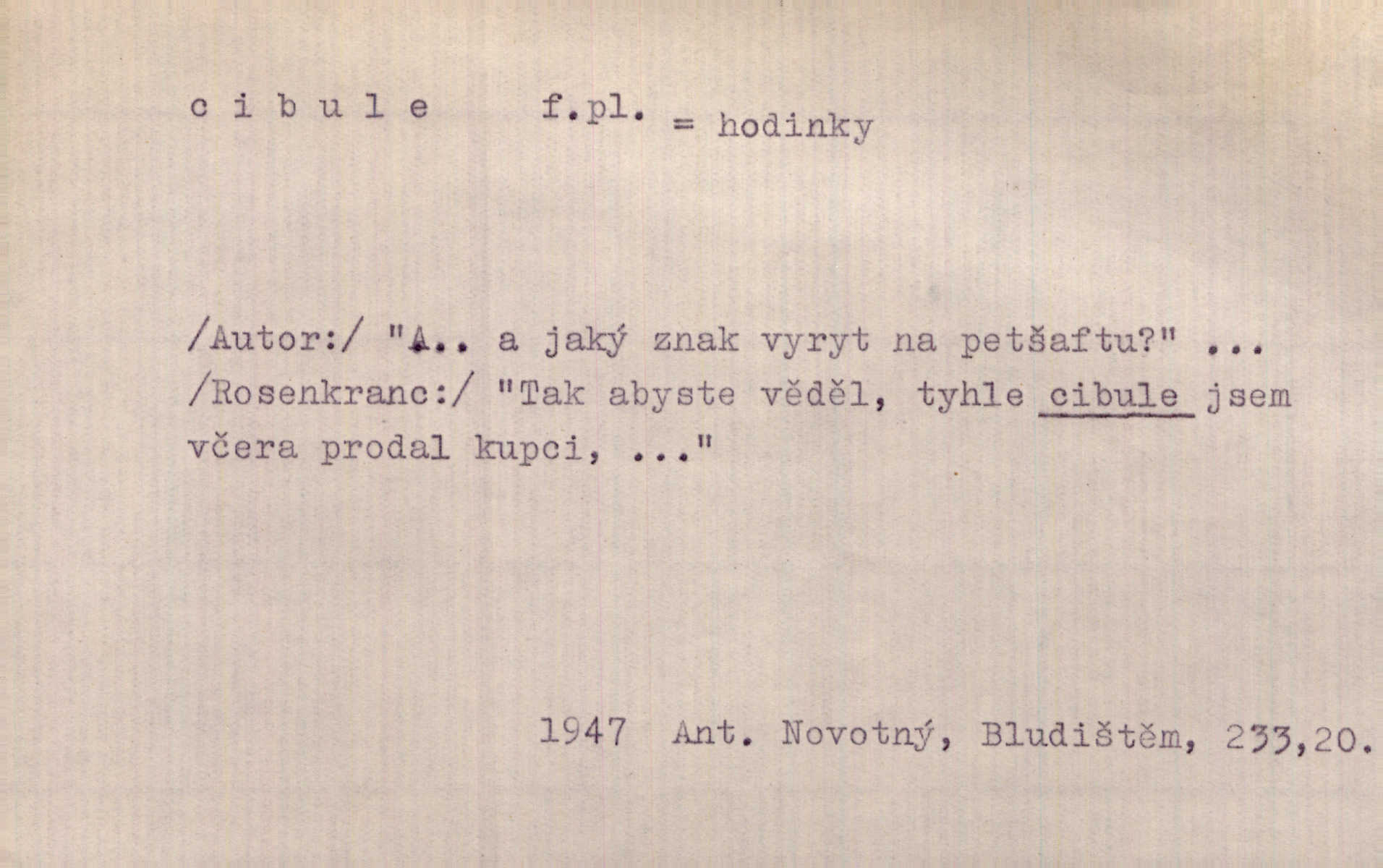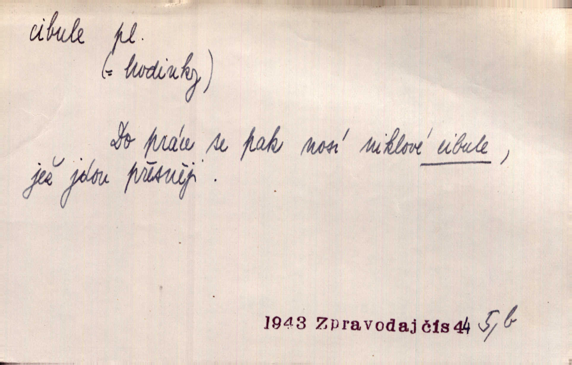 - cibule, -e f. zeleninová rostlina (Allium cepa). Mořská cibule pokojová rostlina (Scilla maritima). D podzemní kulovitá, loupavá část některých bylin. Cibule hyacintové, tulipánové, liliové, narcisové a p. D předmět cibulovitého, baňatého tvaru, zejm. věžní báň. Štíhlá věž chrámu a dvě cibule na radnici vyhlížely již přes vršky. Rais. Lid. cibule pomn. baňaté kapesní hodinky, vulg. hodinky vůbec. Byly to bachraté „cibule“, vřetenky. Herrm. Jedeme z města přes hodinu, dotvrzoval mladík, zíraje na veliké cibule. Rais.