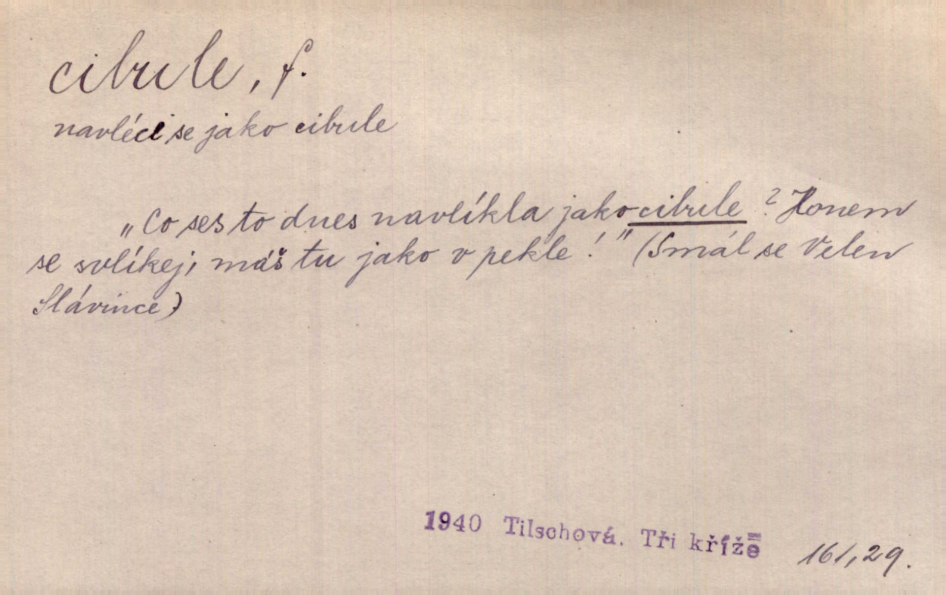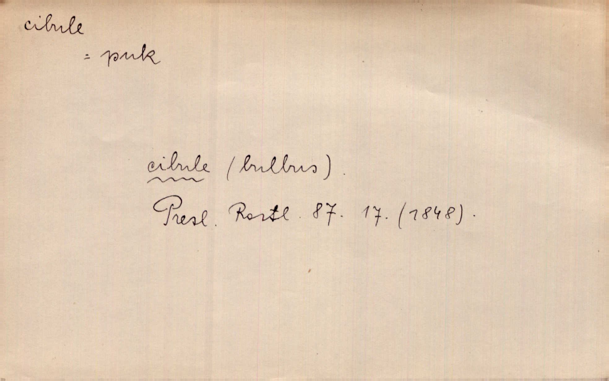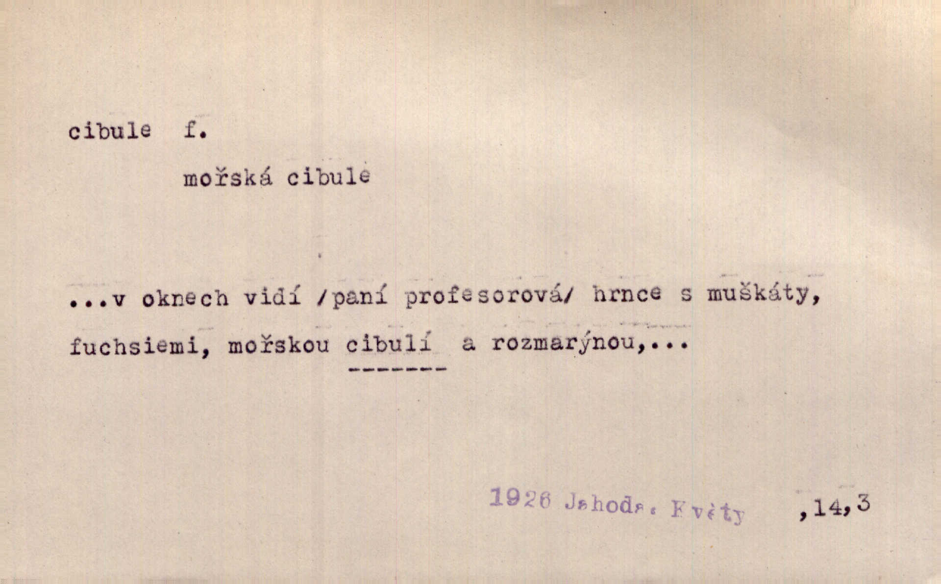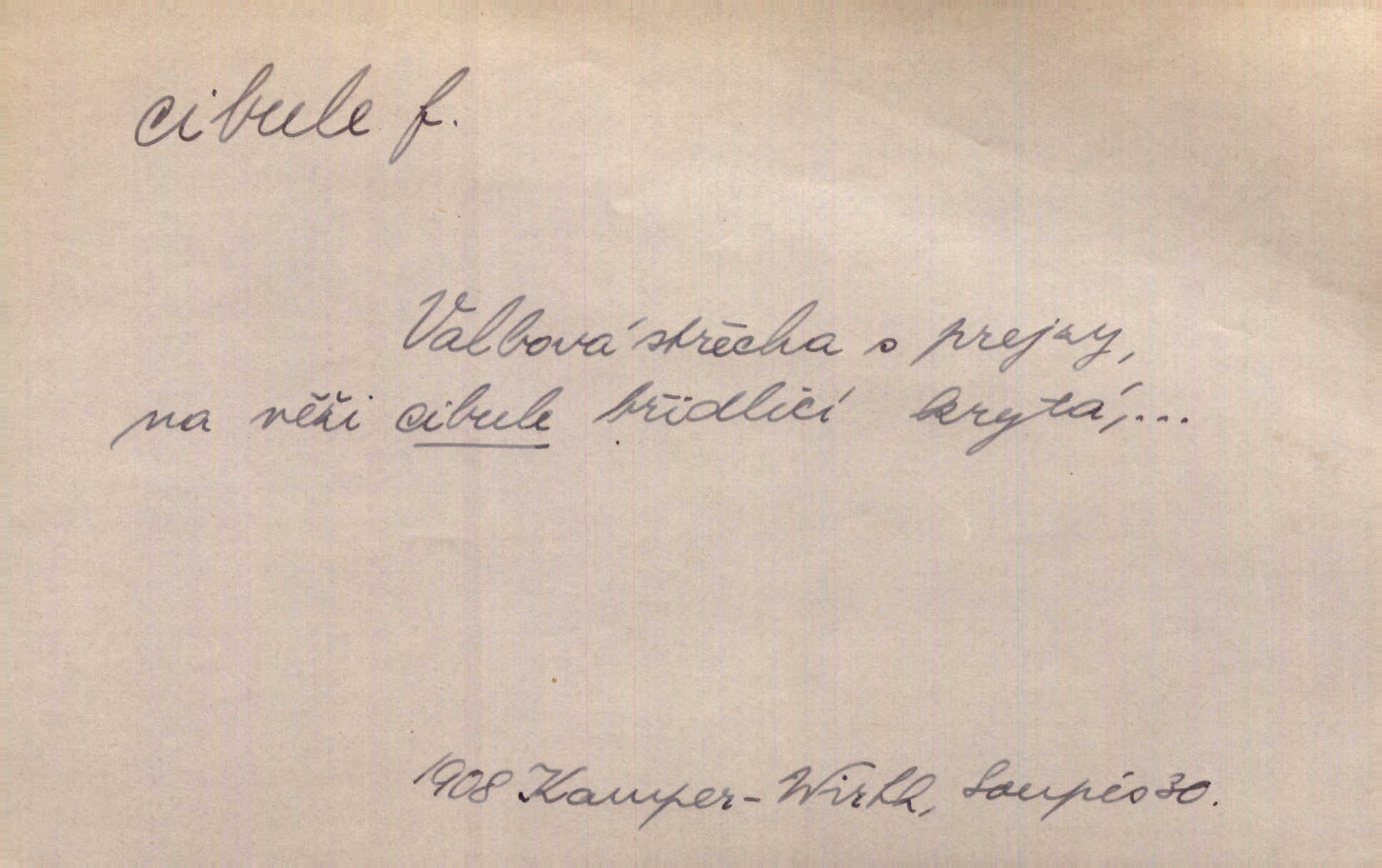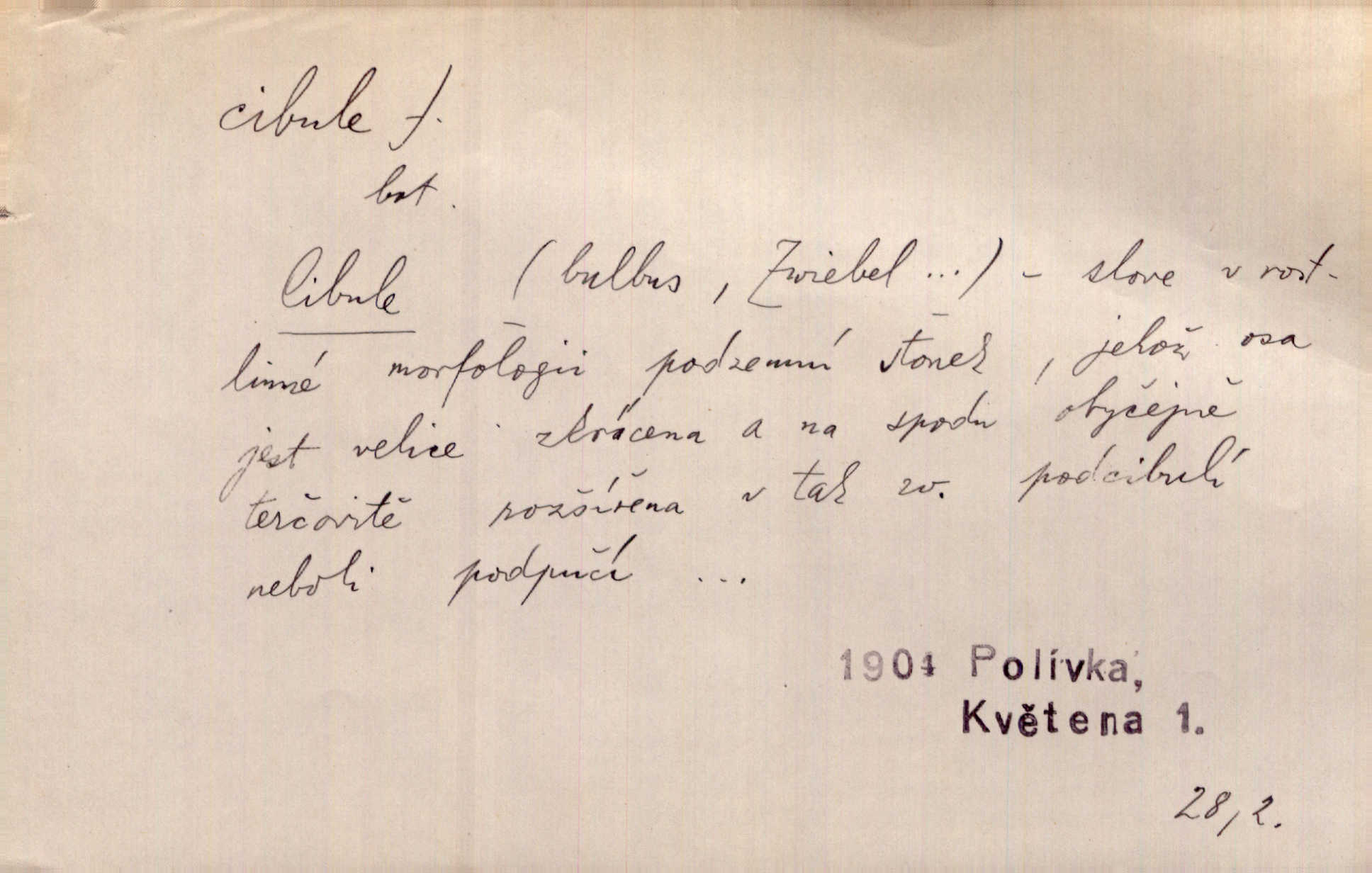 - cibule, -e f. zeleninová rostlina (Allium cepa). Mořská cibule pokojová rostlina (Scilla maritima). D podzemní kulovitá, loupavá část některých bylin. Cibule hyacintové, tulipánové, liliové, narcisové a p. D předmět cibulovitého, baňatého tvaru, zejm. věžní báň. Štíhlá věž chrámu a dvě cibule na radnici vyhlížely již přes vršky. Rais. Lid. cibule pomn. baňaté kapesní hodinky, vulg. hodinky vůbec. Byly to bachraté „cibule“, vřetenky. Herrm. Jedeme z města přes hodinu, dotvrzoval mladík, zíraje na veliké cibule. Rais.