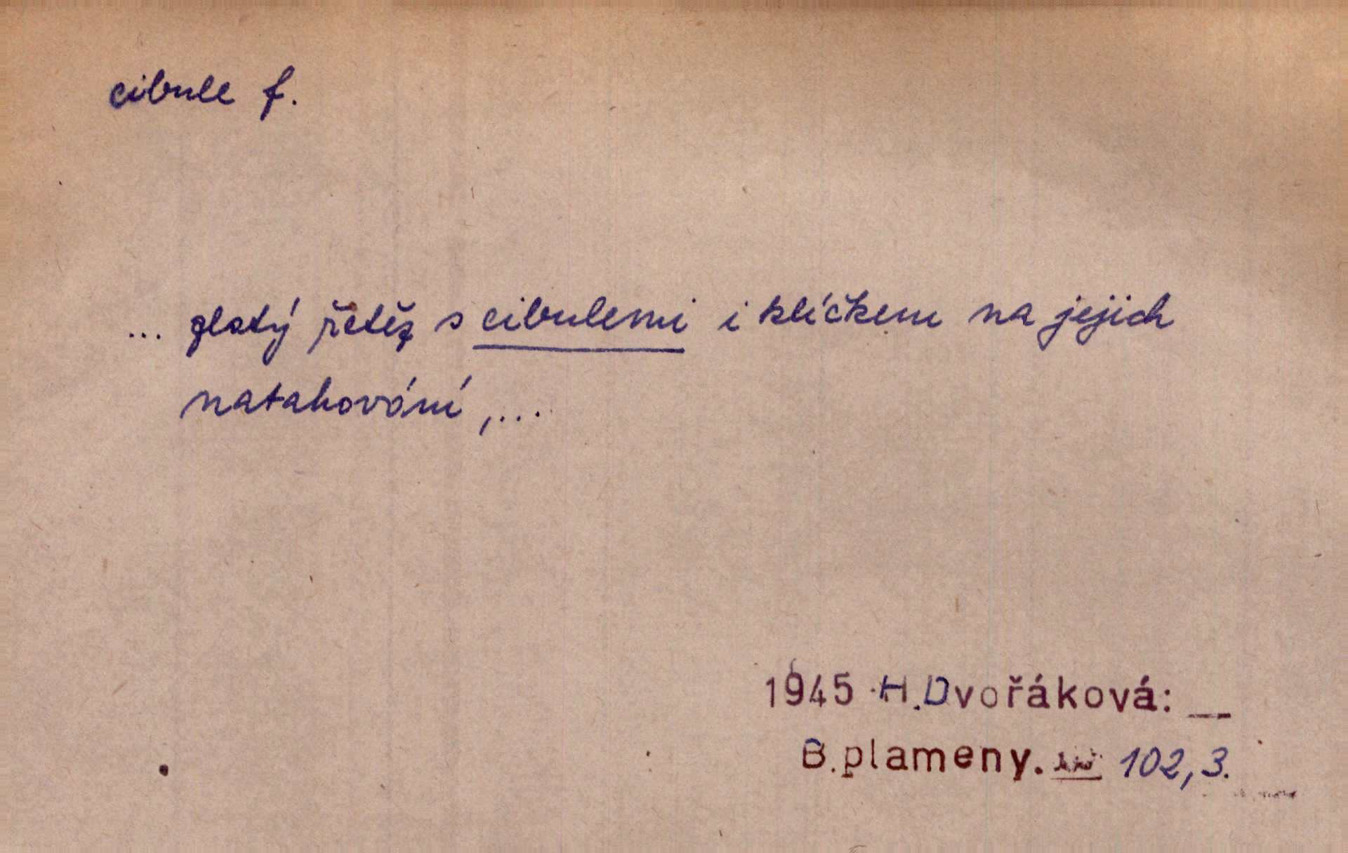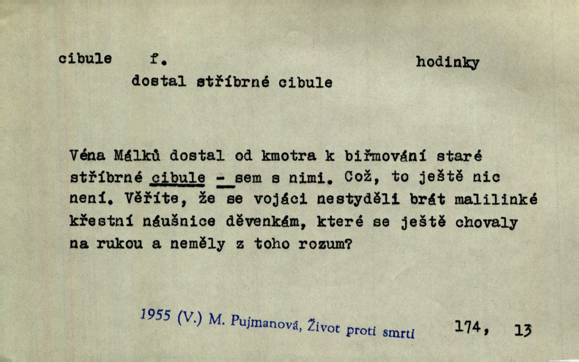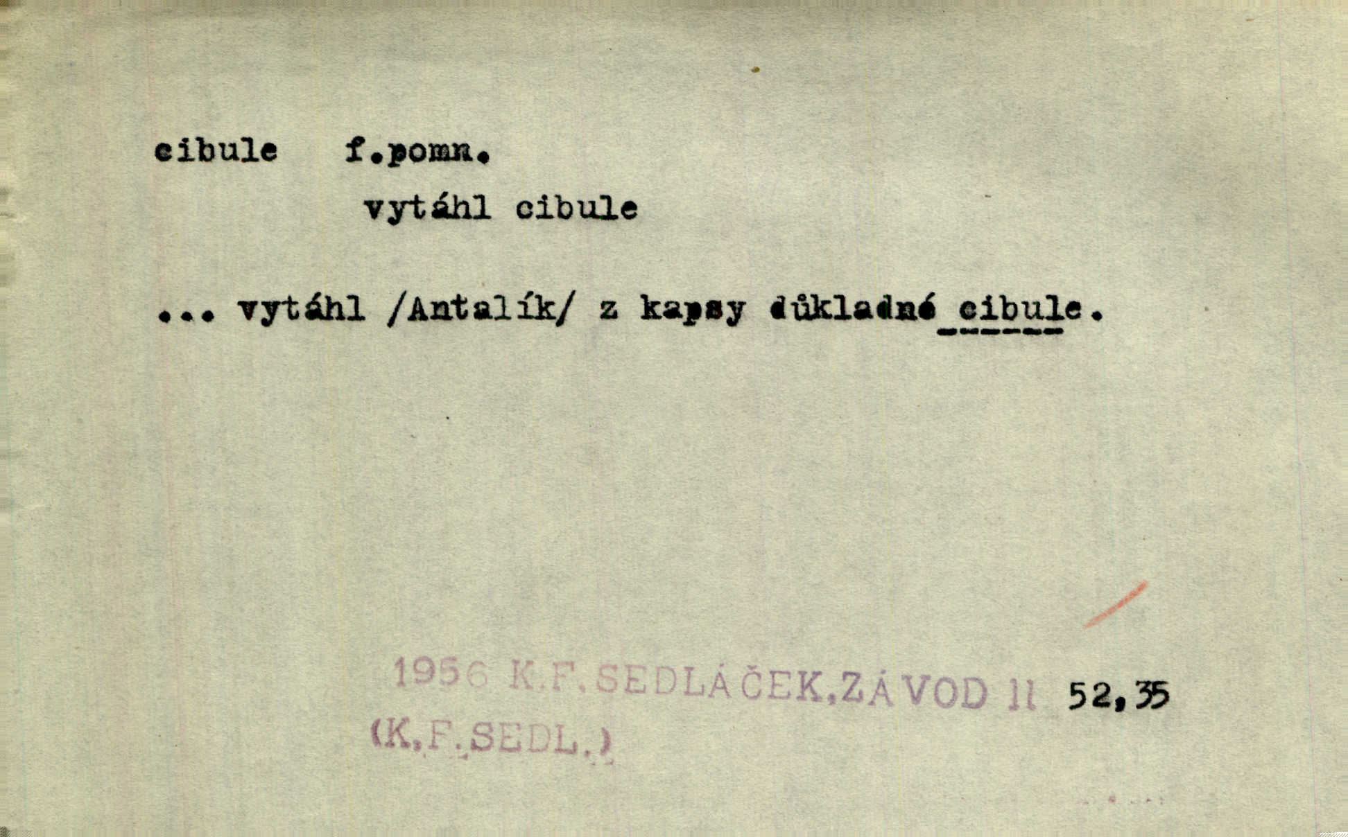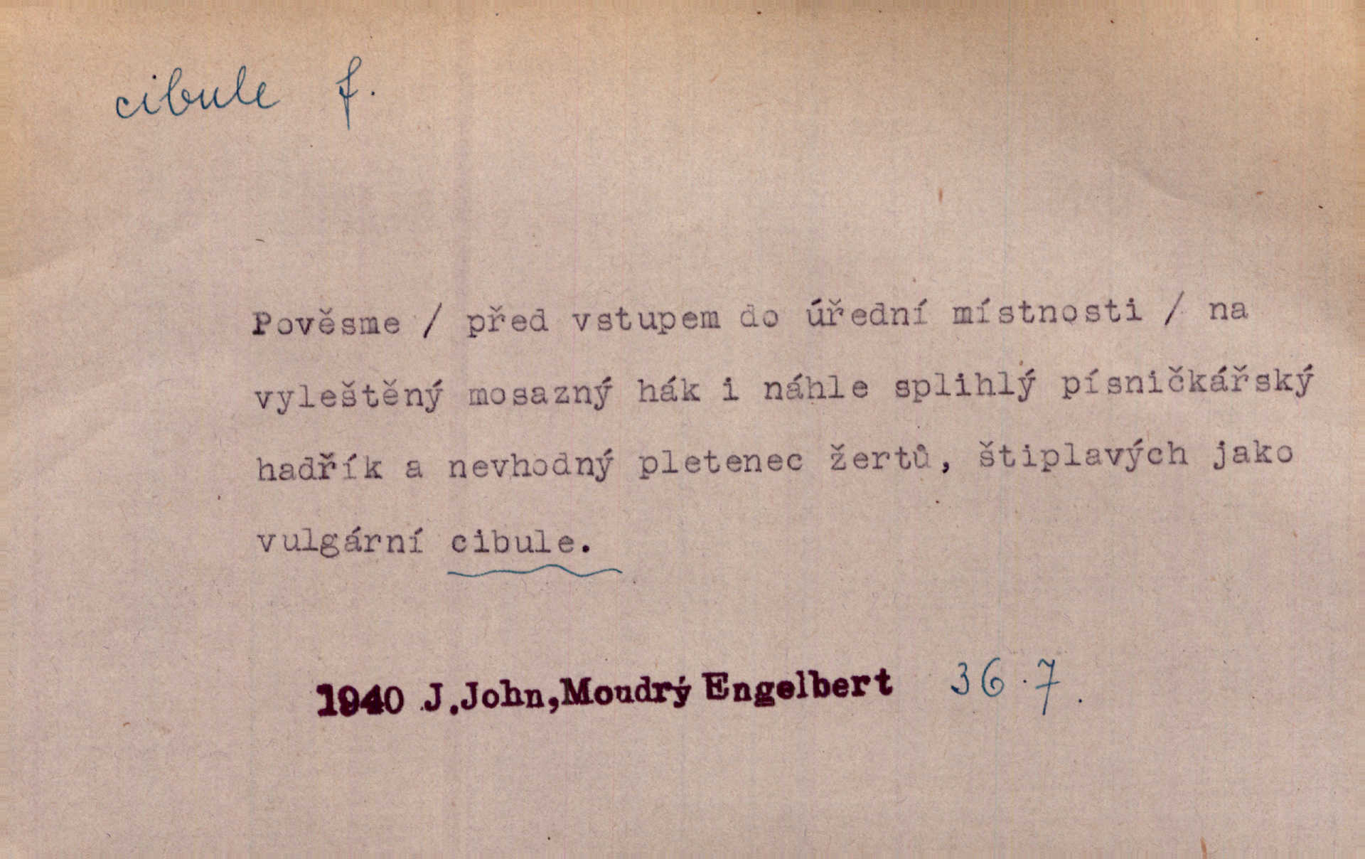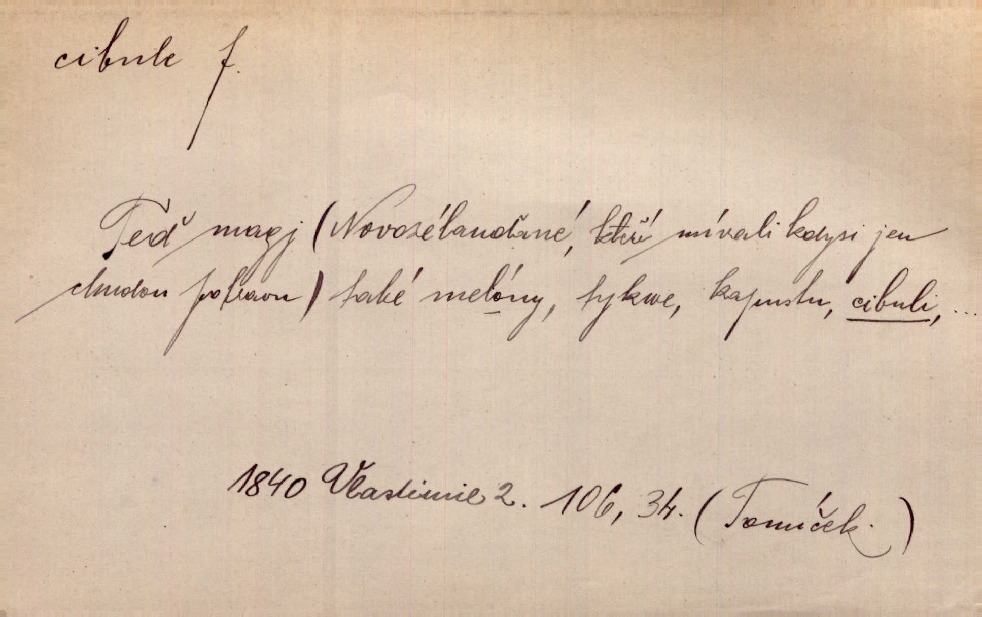- cibule, -e f. zeleninová rostlina (Allium cepa). Mořská cibule pokojová rostlina (Scilla maritima). D podzemní kulovitá, loupavá část některých bylin. Cibule hyacintové, tulipánové, liliové, narcisové a p. D předmět cibulovitého, baňatého tvaru, zejm. věžní báň. Štíhlá věž chrámu a dvě cibule na radnici vyhlížely již přes vršky. Rais. Lid. cibule pomn. baňaté kapesní hodinky, vulg. hodinky vůbec. Byly to bachraté „cibule“, vřetenky. Herrm. Jedeme z města přes hodinu, dotvrzoval mladík, zíraje na veliké cibule. Rais.