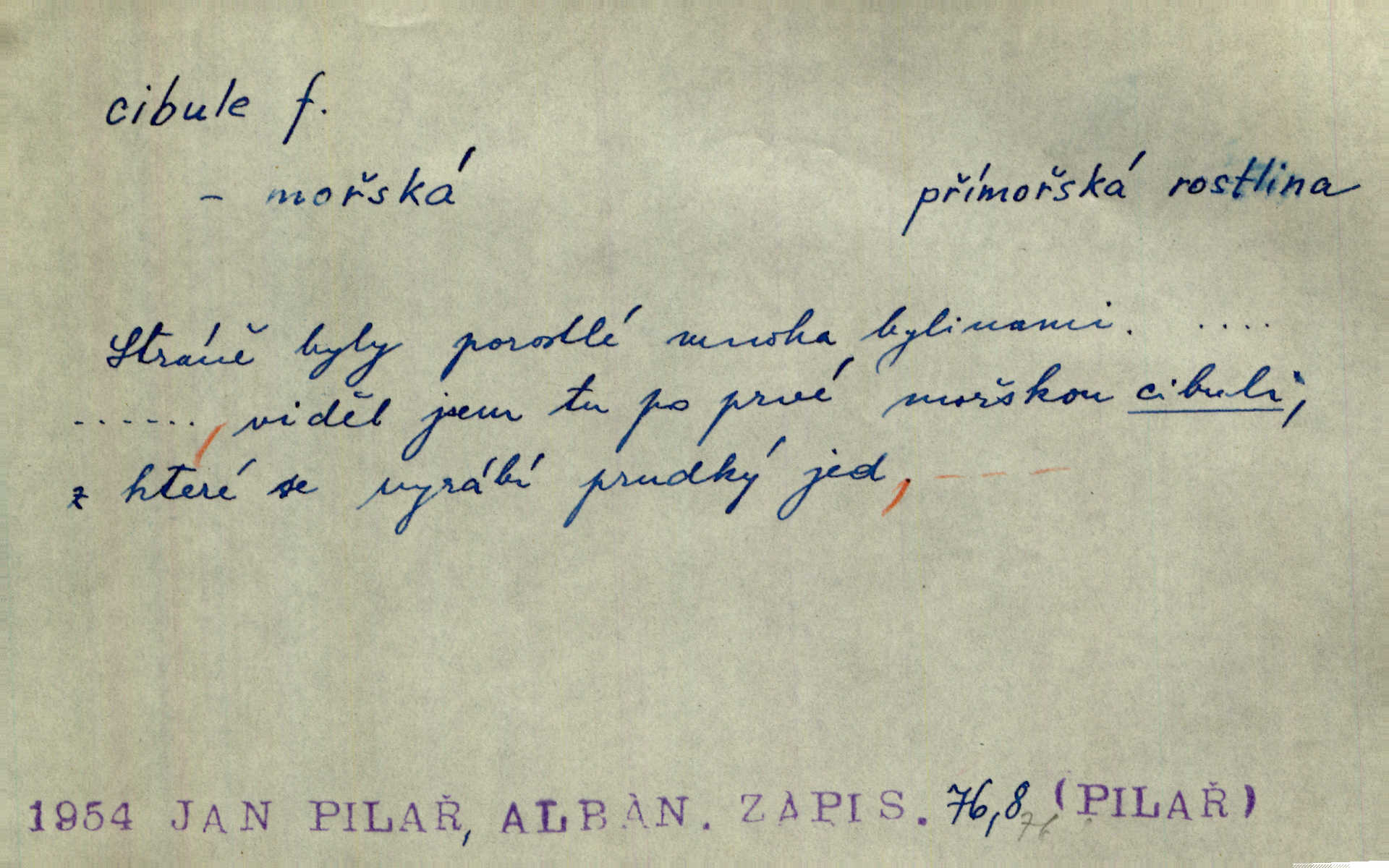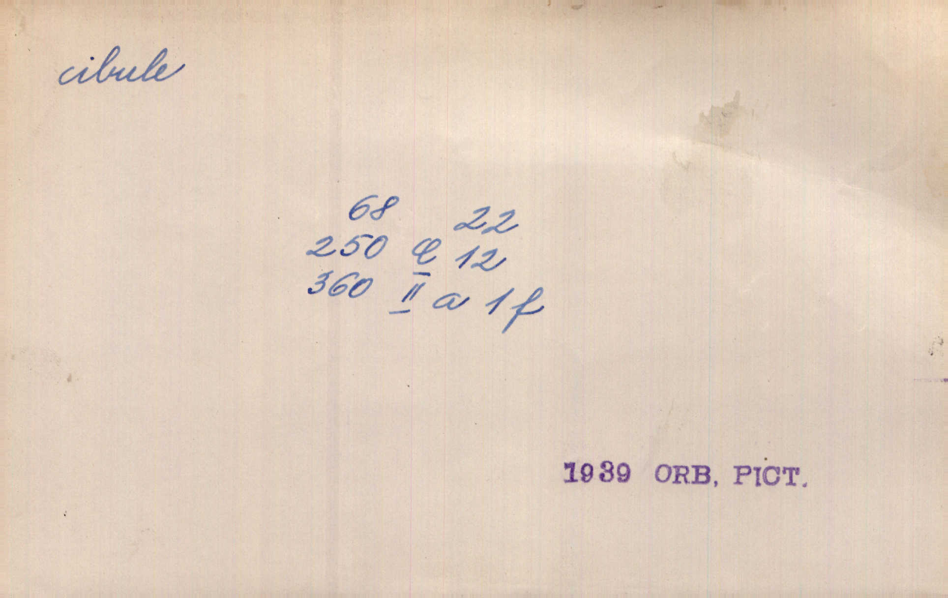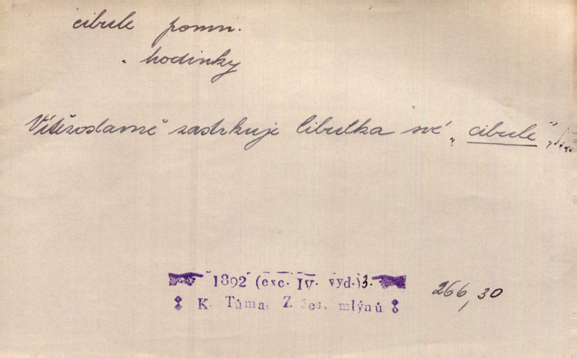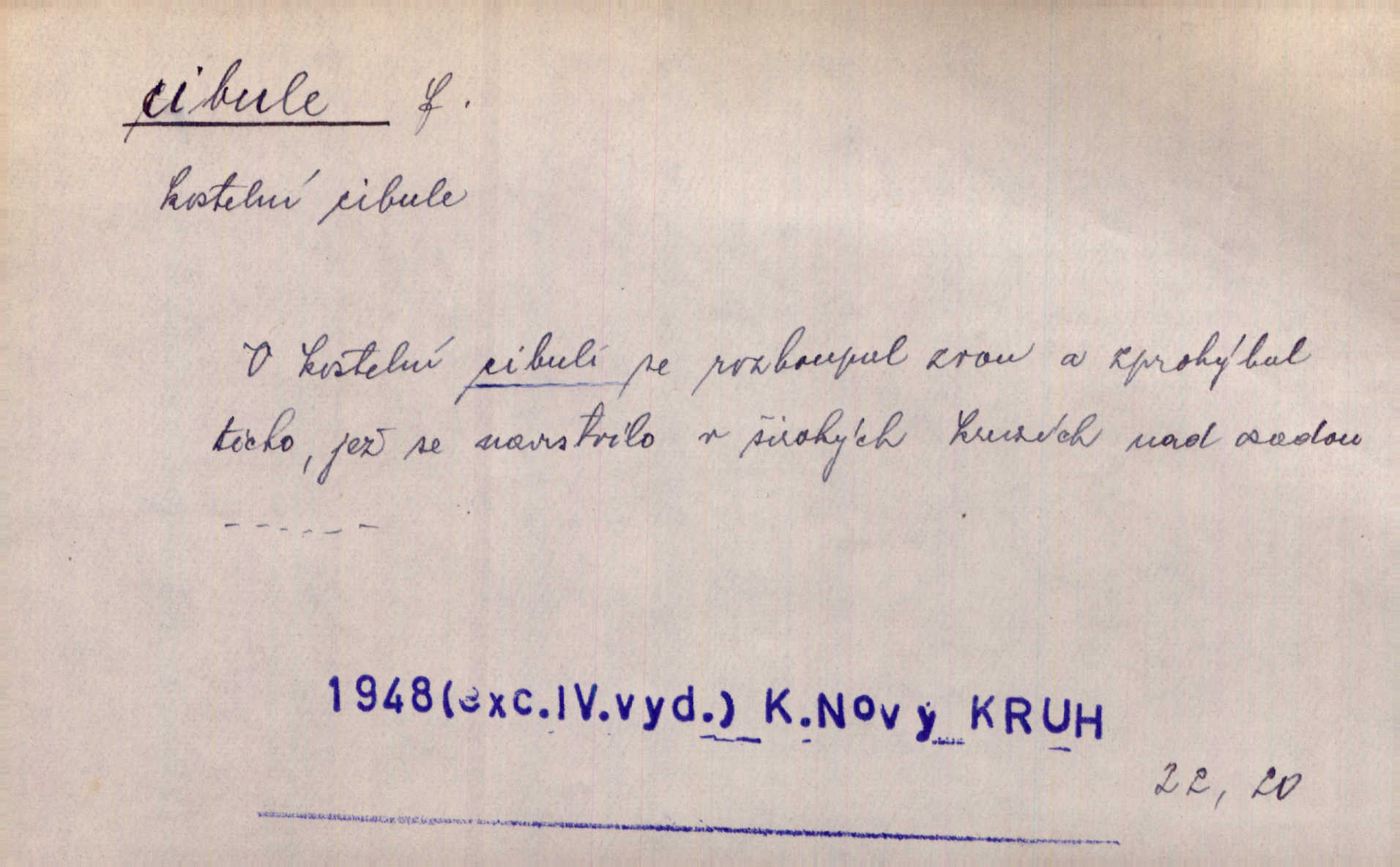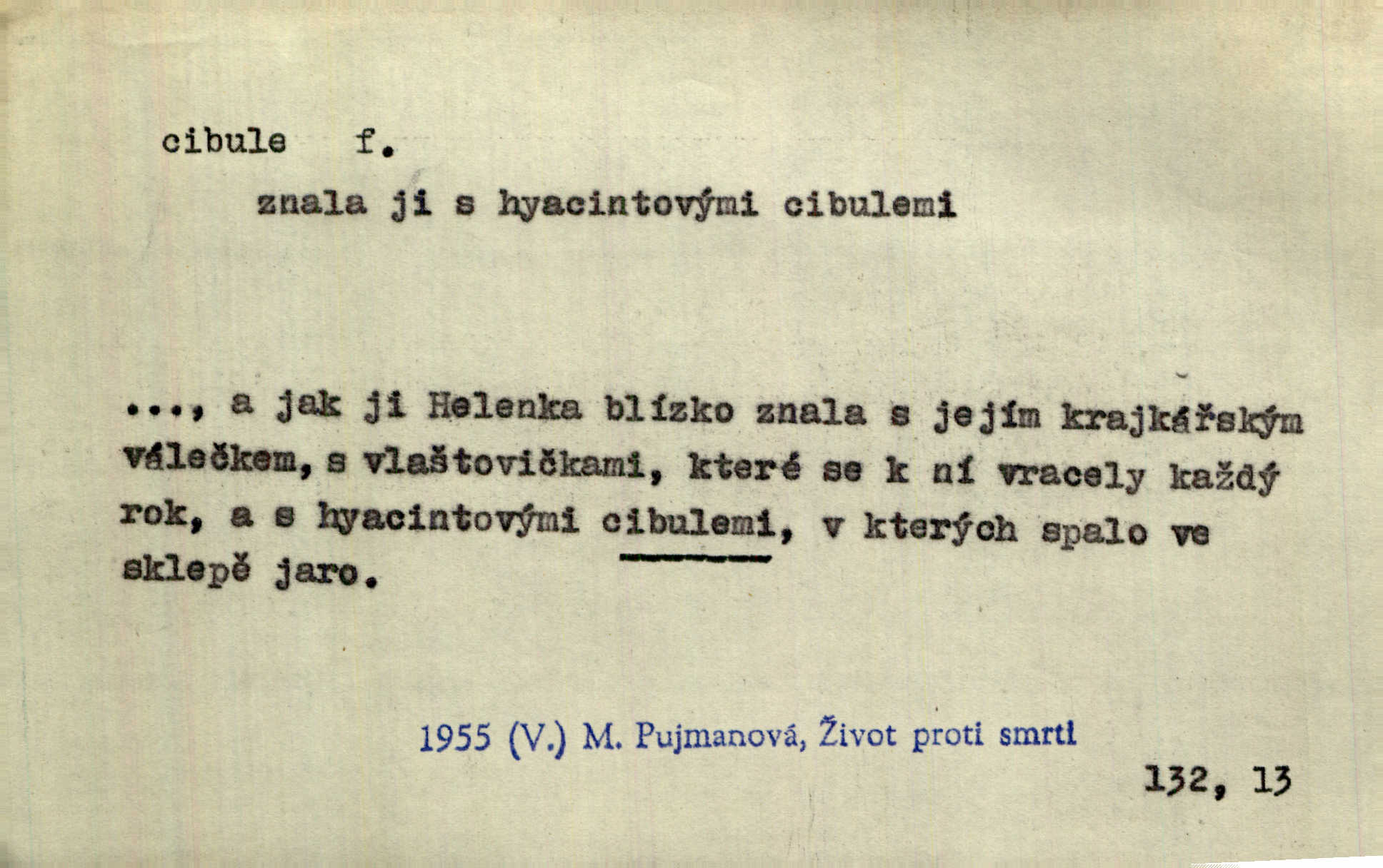 - cibule, -e f. zeleninová rostlina (Allium cepa). Mořská cibule pokojová rostlina (Scilla maritima). D podzemní kulovitá, loupavá část některých bylin. Cibule hyacintové, tulipánové, liliové, narcisové a p. D předmět cibulovitého, baňatého tvaru, zejm. věžní báň. Štíhlá věž chrámu a dvě cibule na radnici vyhlížely již přes vršky. Rais. Lid. cibule pomn. baňaté kapesní hodinky, vulg. hodinky vůbec. Byly to bachraté „cibule“, vřetenky. Herrm. Jedeme z města přes hodinu, dotvrzoval mladík, zíraje na veliké cibule. Rais.