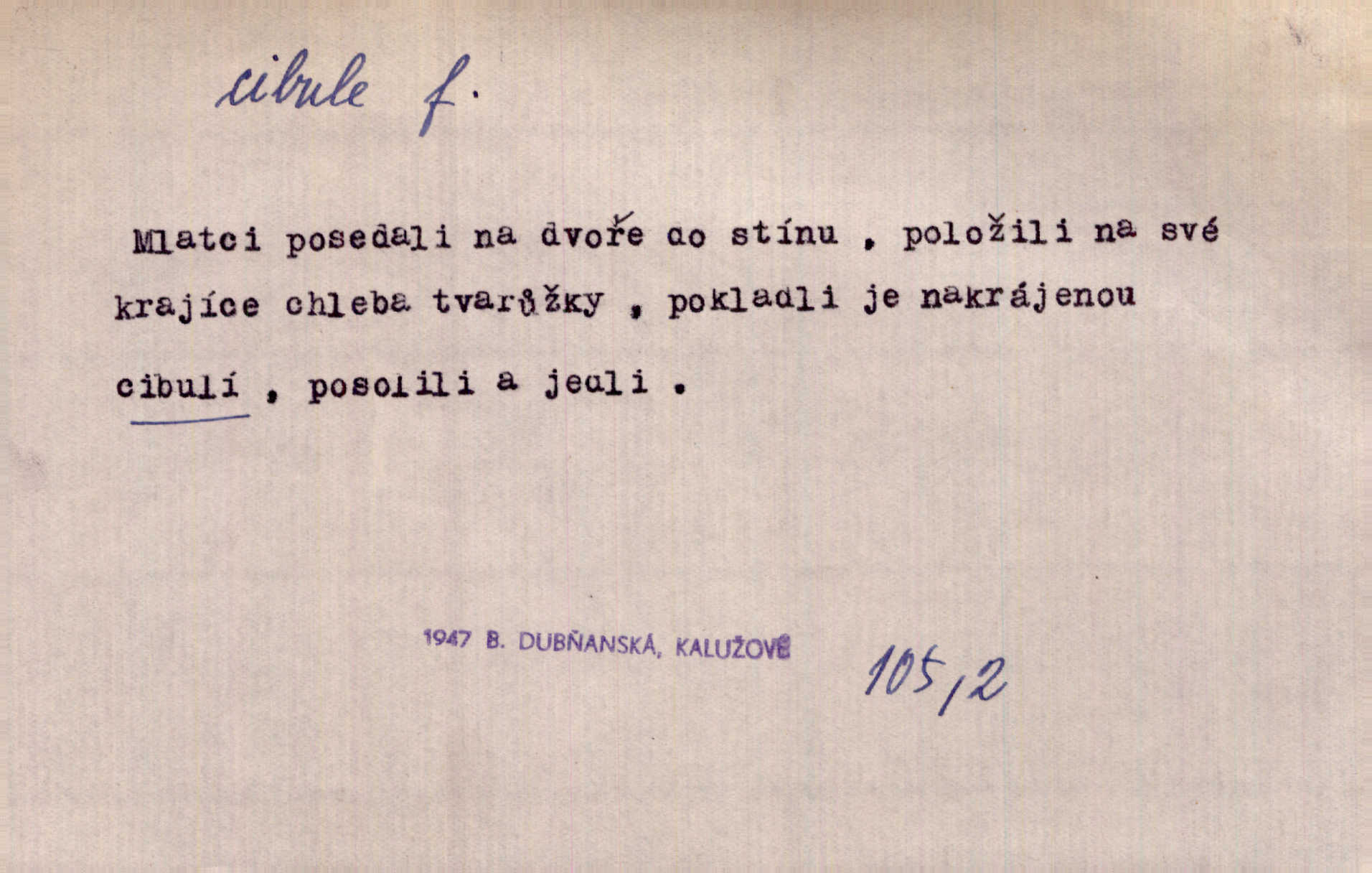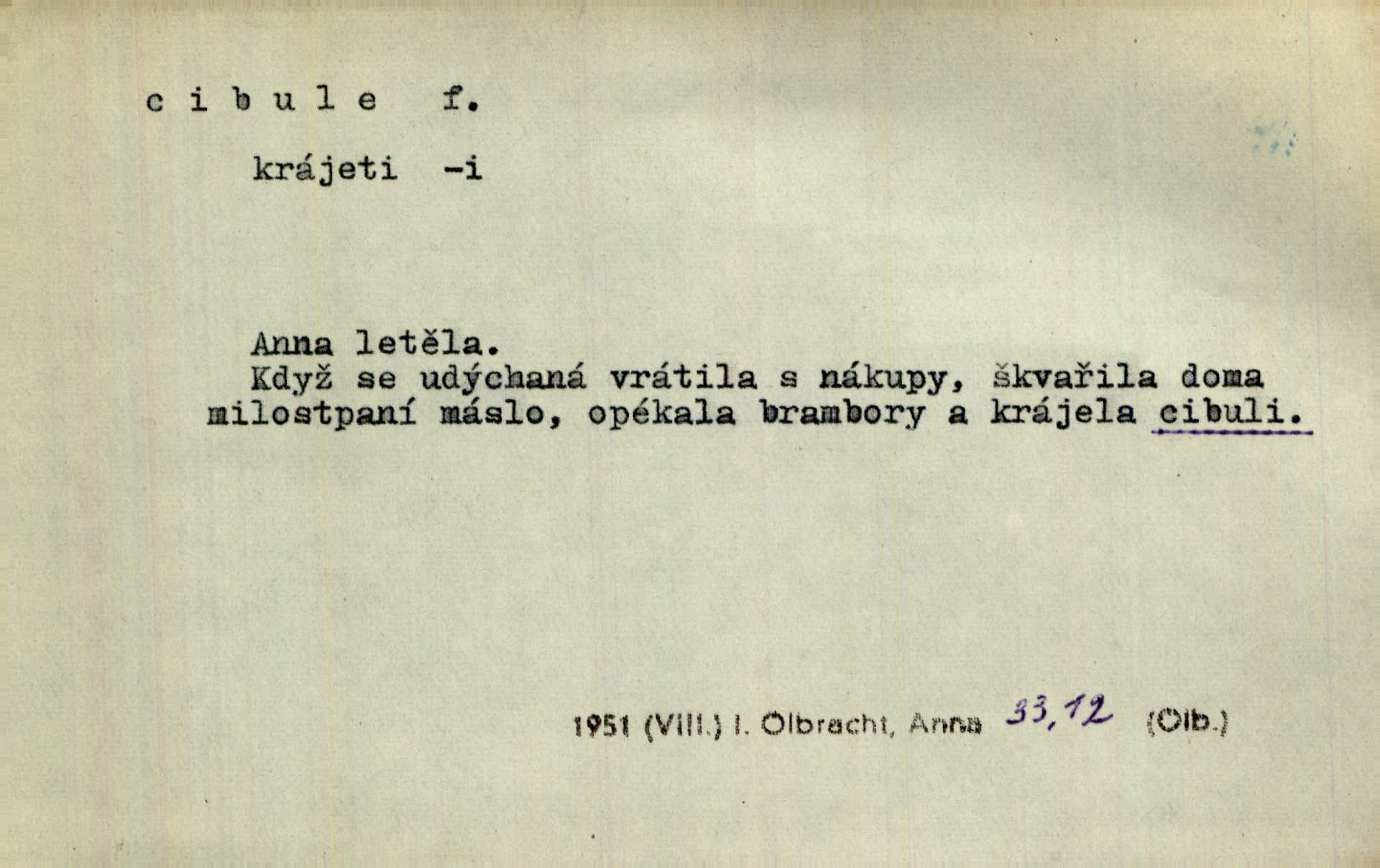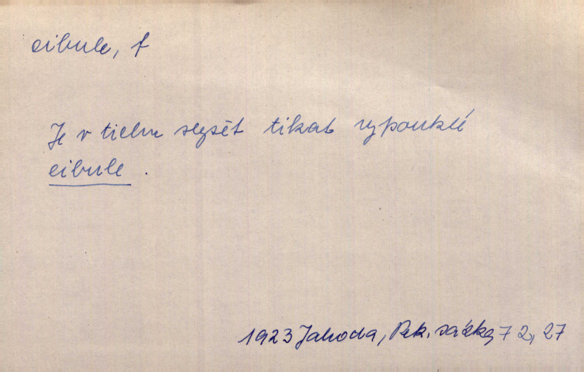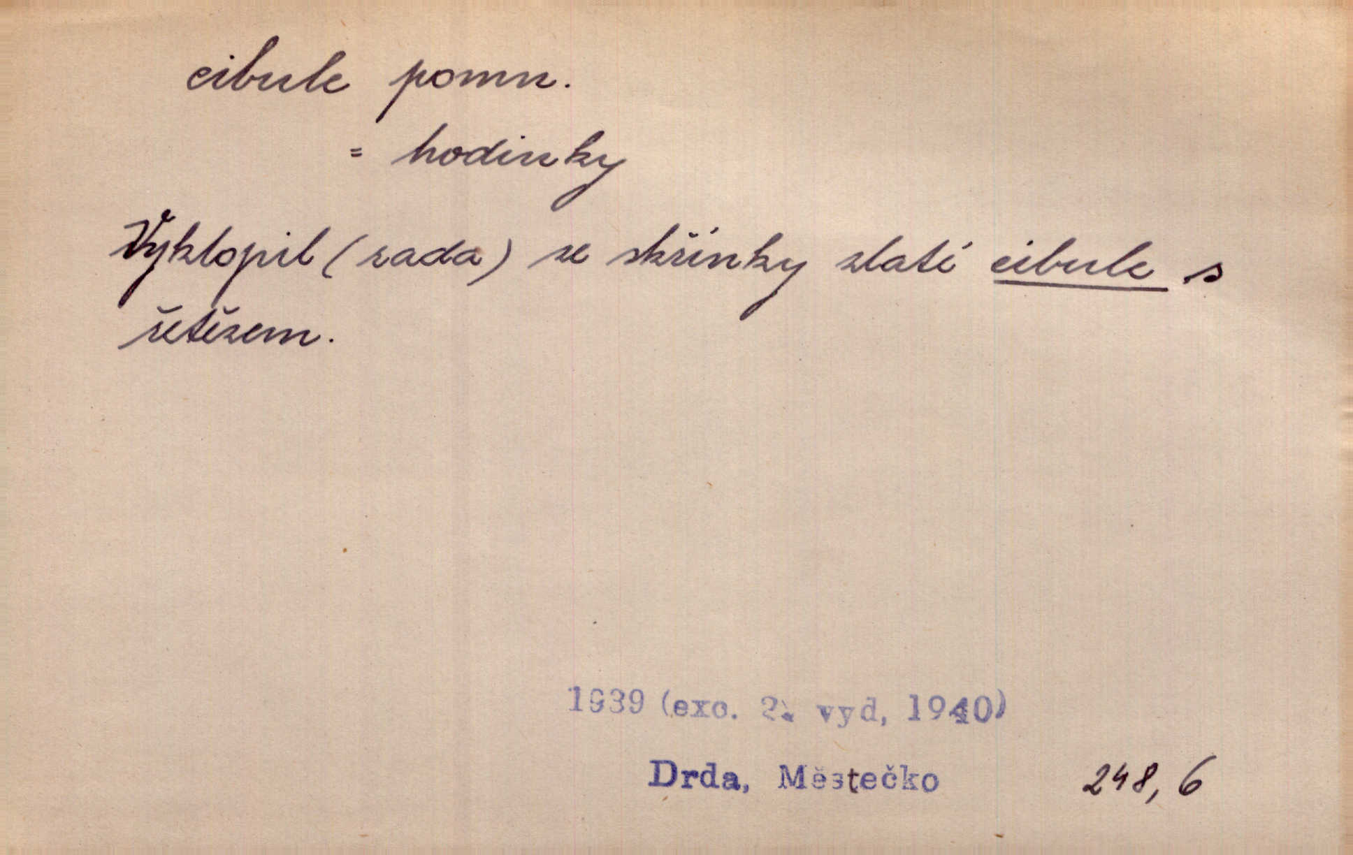 - cibule, -e f. zeleninová rostlina (Allium cepa). Mořská cibule pokojová rostlina (Scilla maritima). D podzemní kulovitá, loupavá část některých bylin. Cibule hyacintové, tulipánové, liliové, narcisové a p. D předmět cibulovitého, baňatého tvaru, zejm. věžní báň. Štíhlá věž chrámu a dvě cibule na radnici vyhlížely již přes vršky. Rais. Lid. cibule pomn. baňaté kapesní hodinky, vulg. hodinky vůbec. Byly to bachraté „cibule“, vřetenky. Herrm. Jedeme z města přes hodinu, dotvrzoval mladík, zíraje na veliké cibule. Rais.