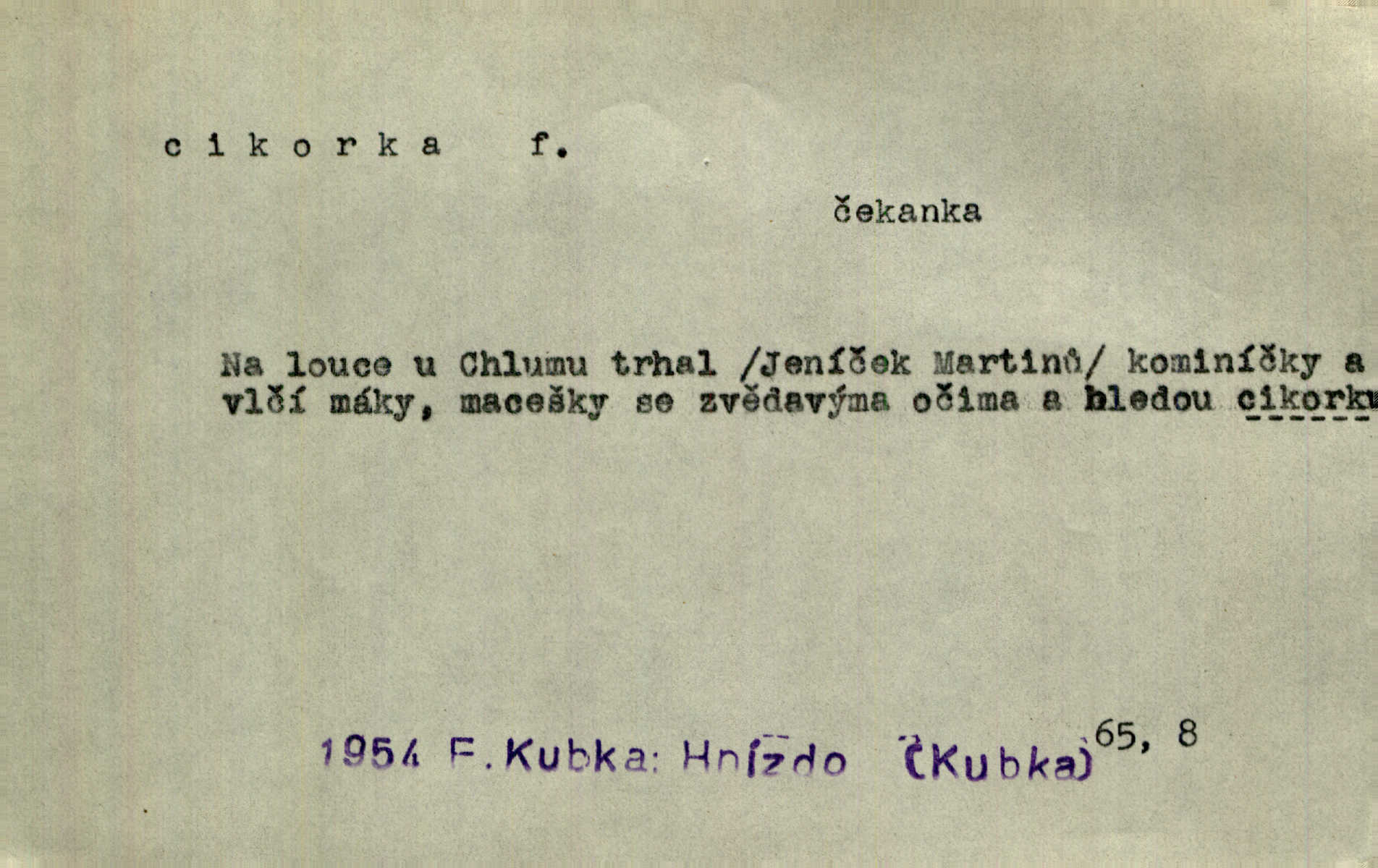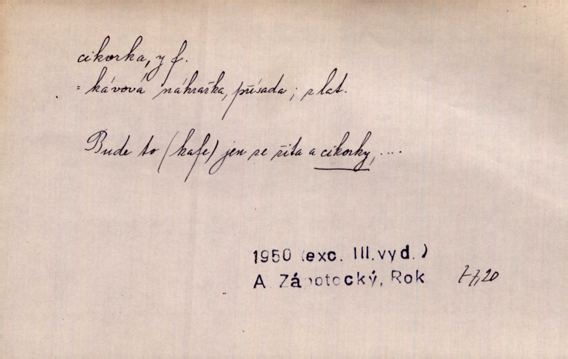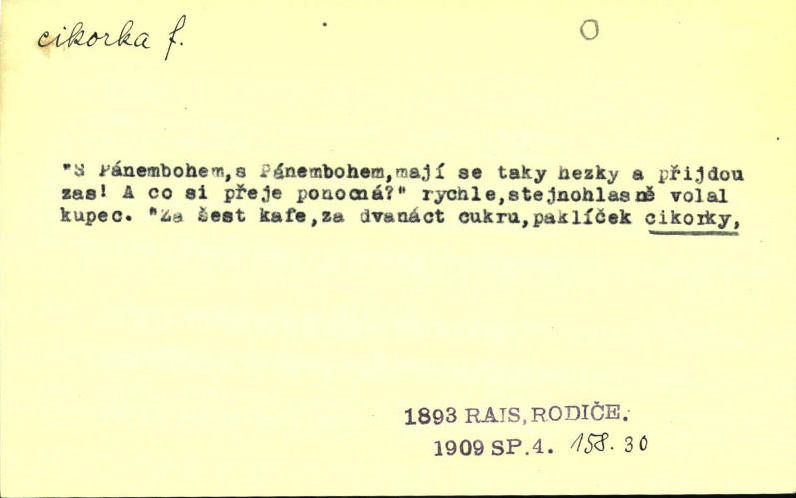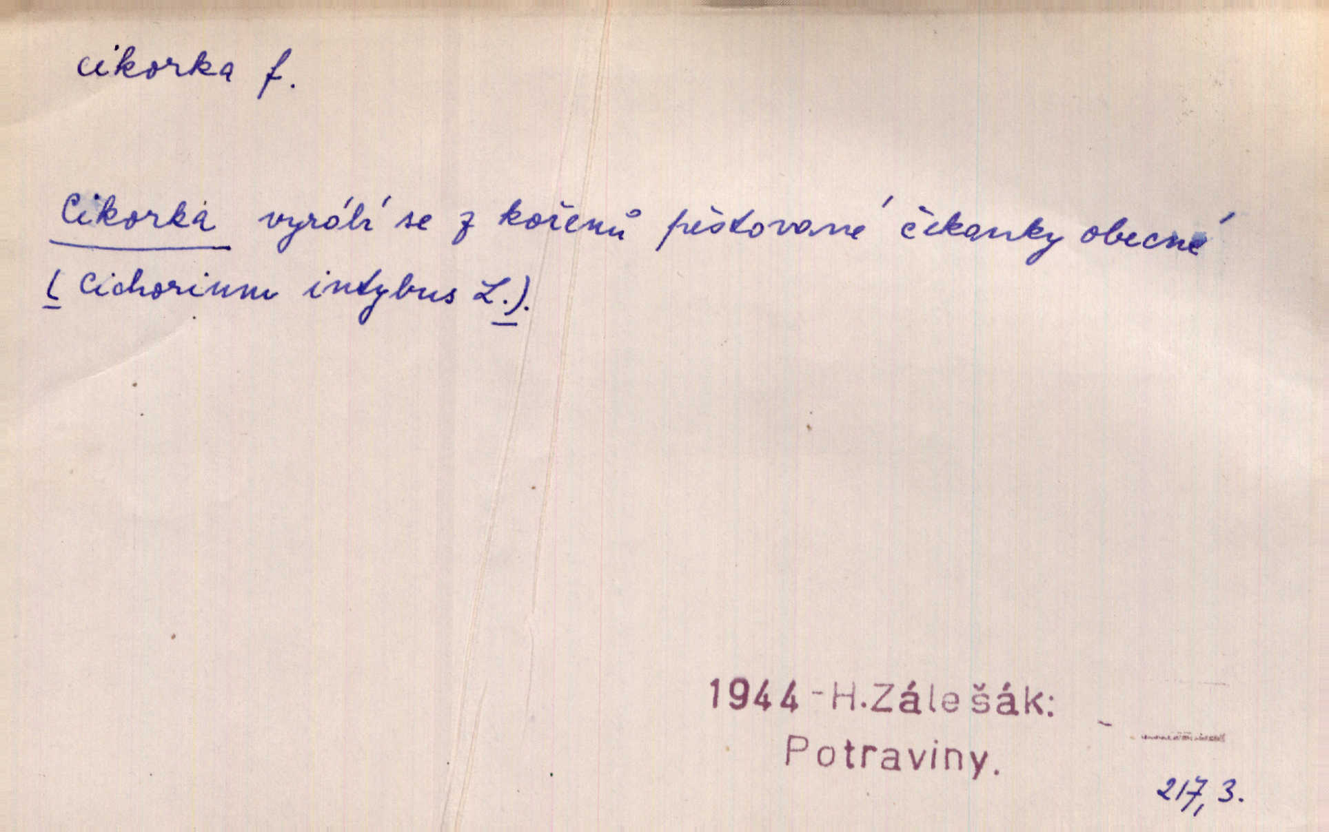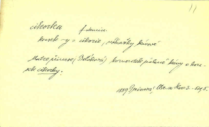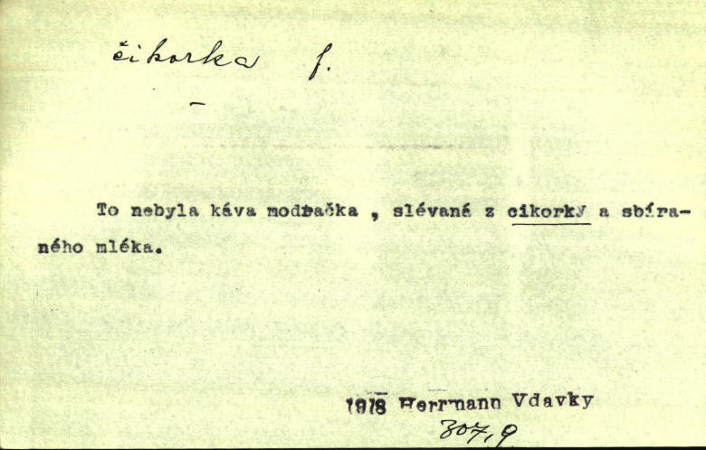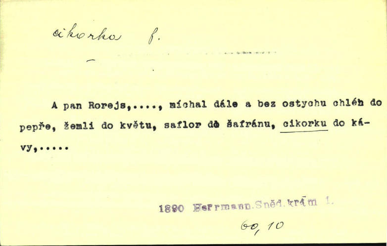 - cikorka, -y f. ob. cikorie. Odměřovala na ráno kávu a cikorku. Šim. D Lid. čekanka. Letos tam nasel žito, na jeden [kus pole] pšenici. Cikorku a oves mají na protější straně vesnice. Rudlová.