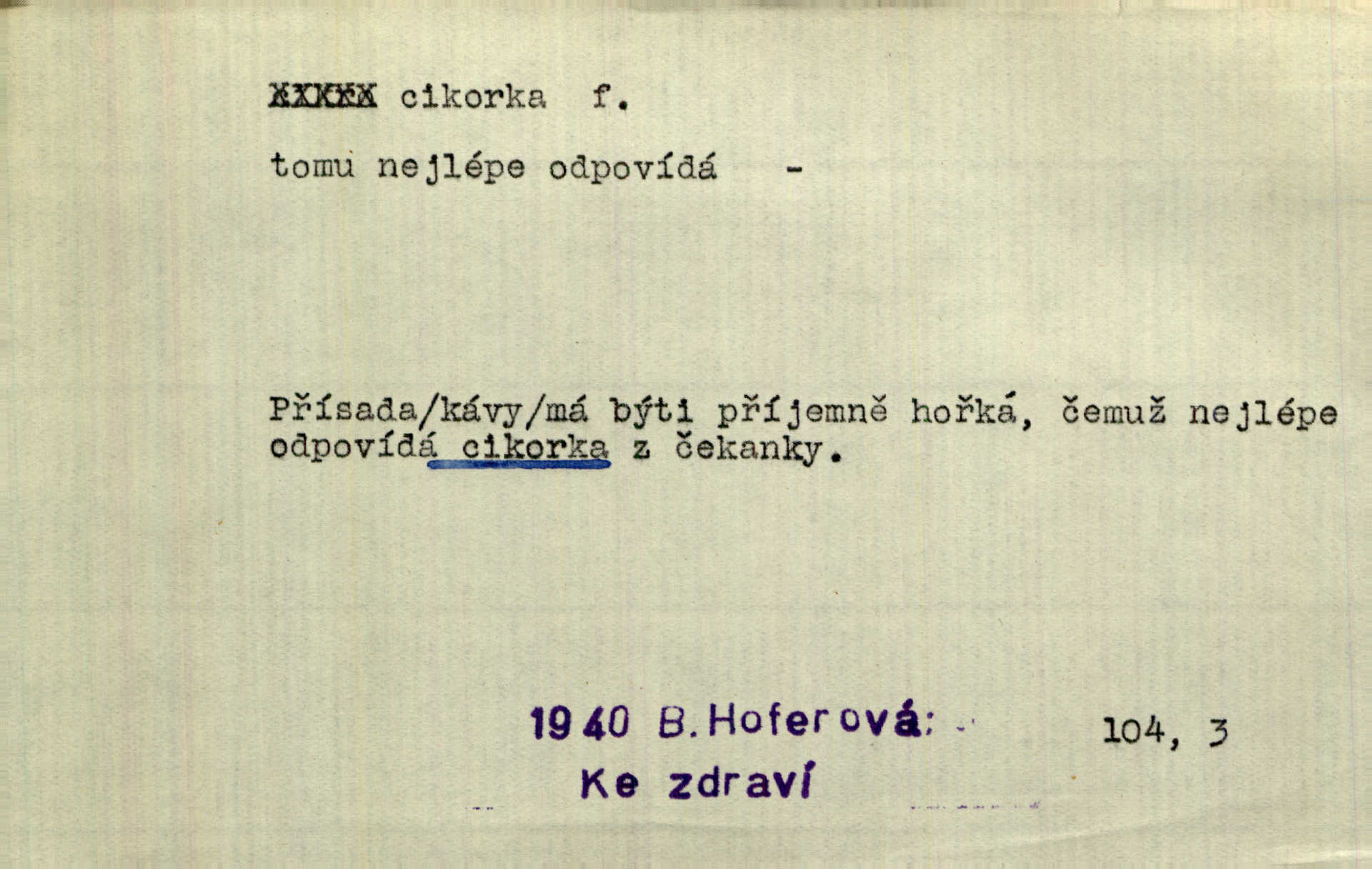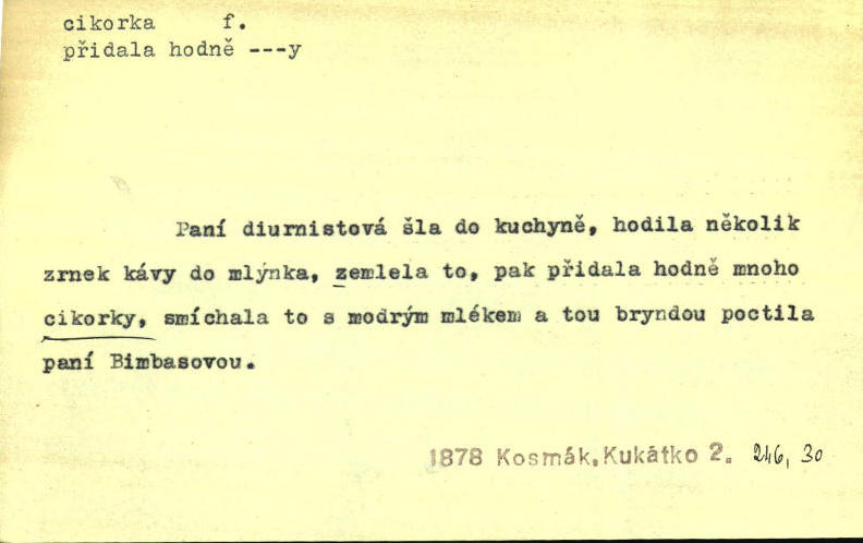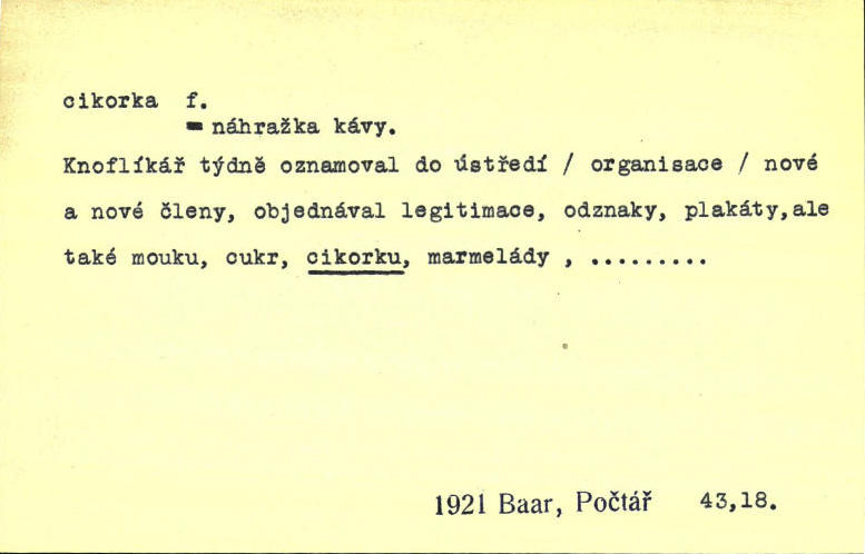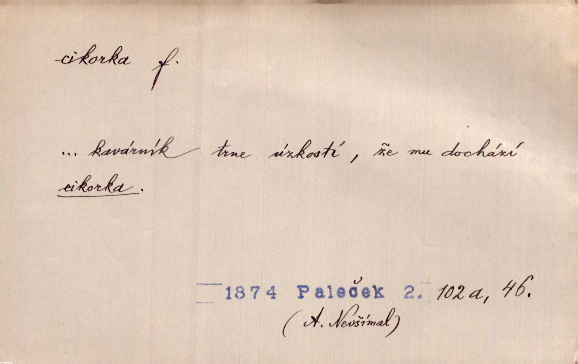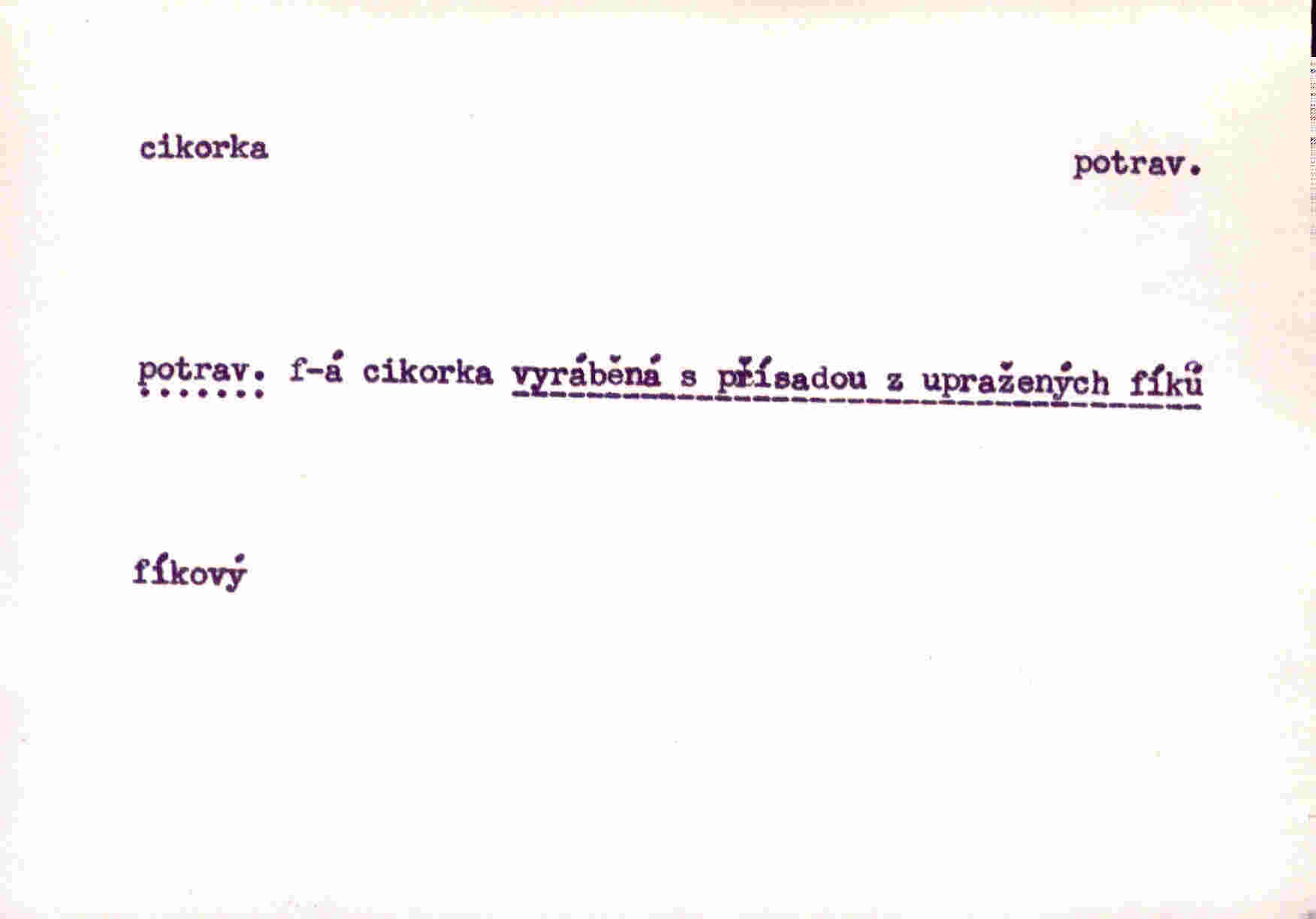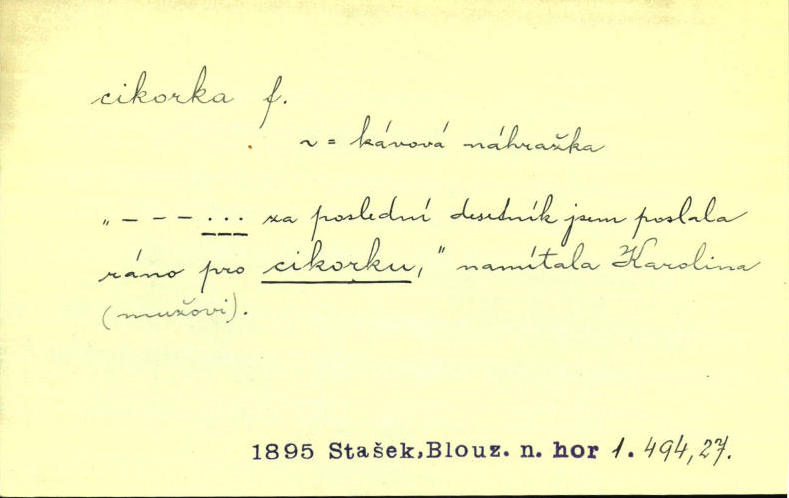 - cikorka, -y f. ob. cikorie. Odměřovala na ráno kávu a cikorku. Šim. D Lid. čekanka. Letos tam nasel žito, na jeden [kus pole] pšenici. Cikorku a oves mají na protější straně vesnice. Rudlová.
