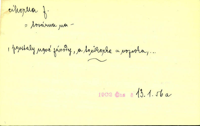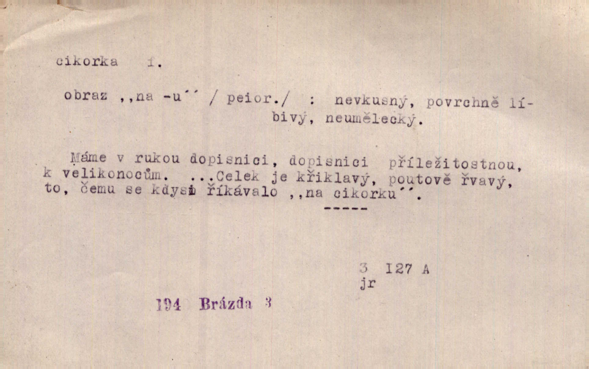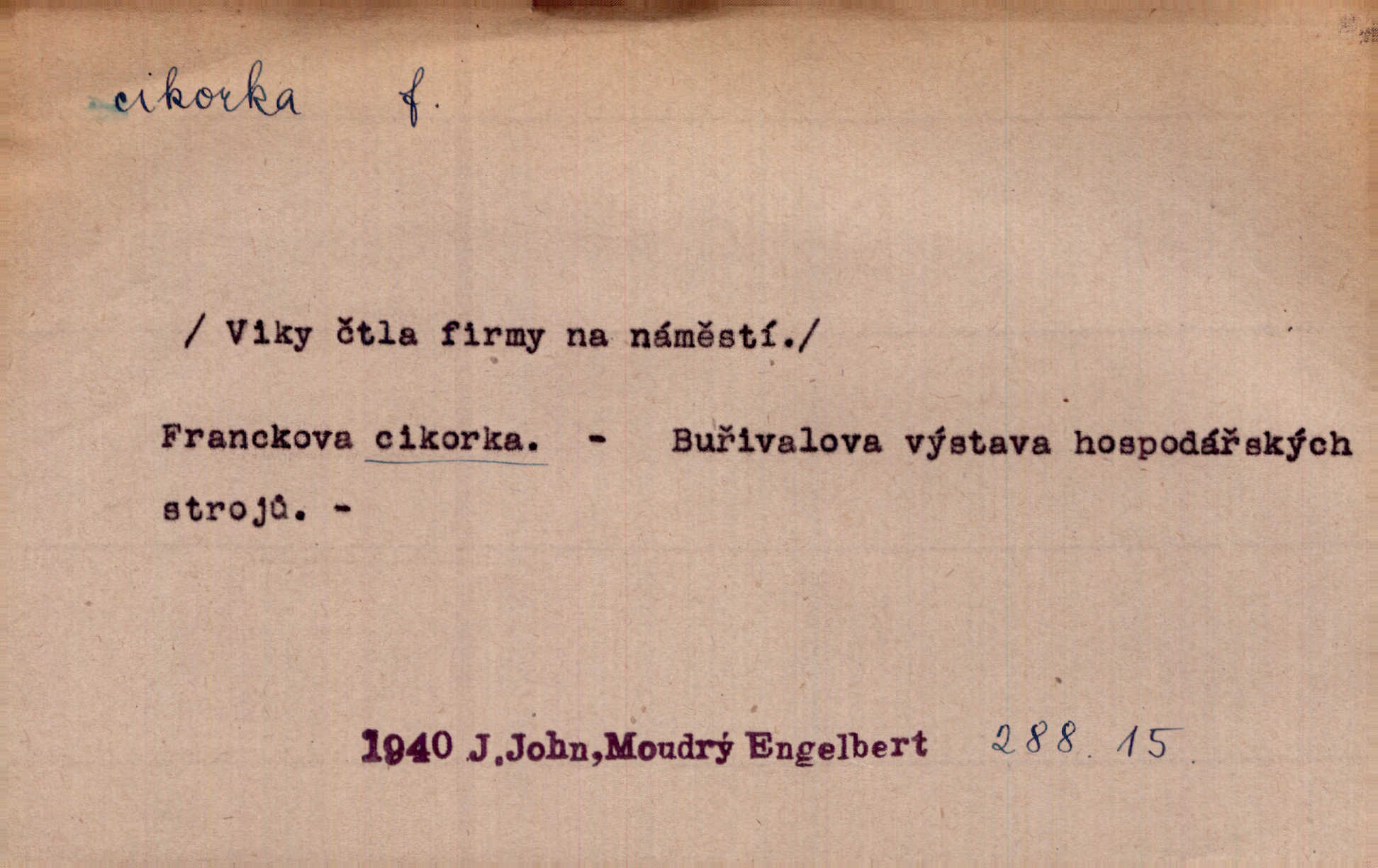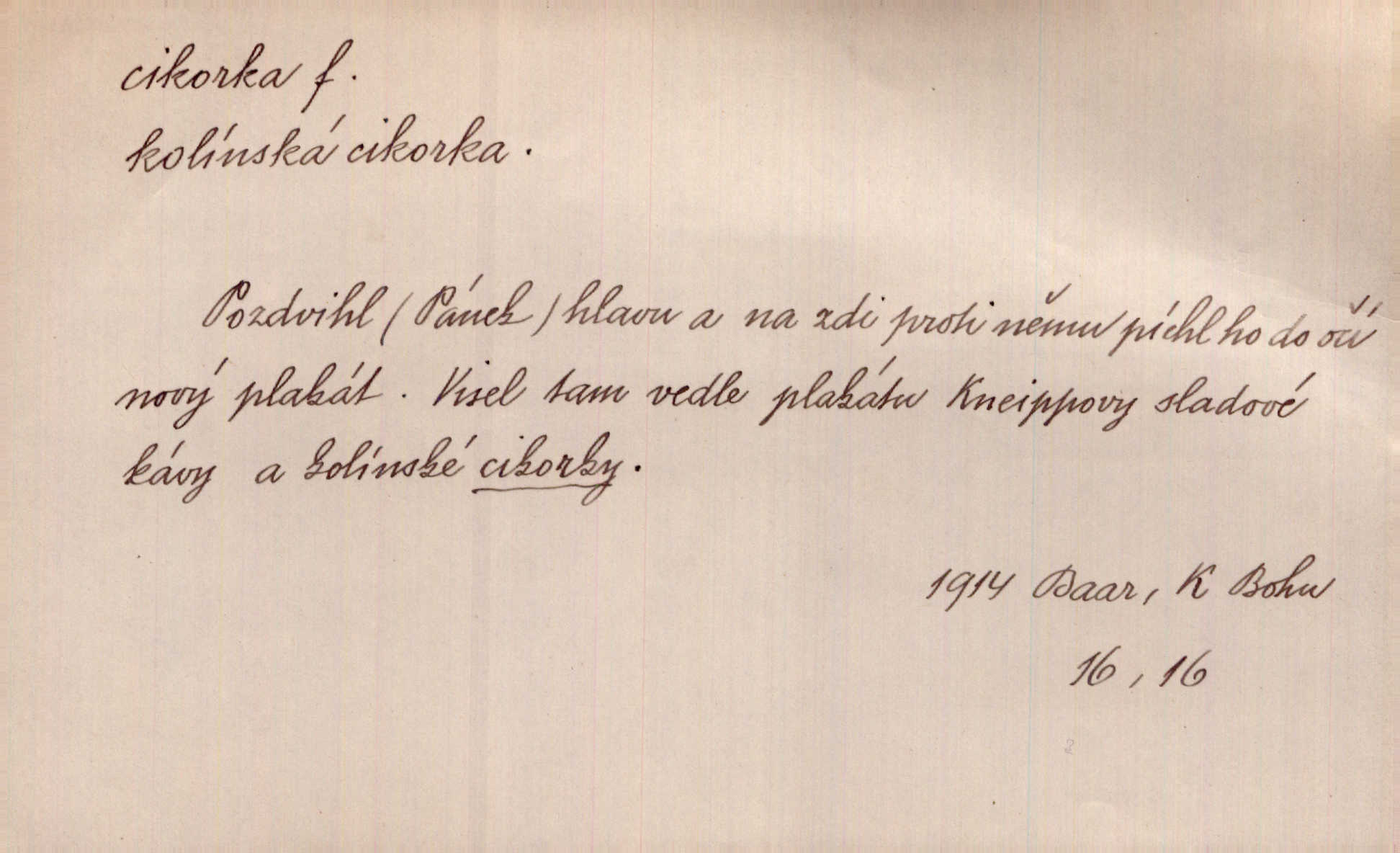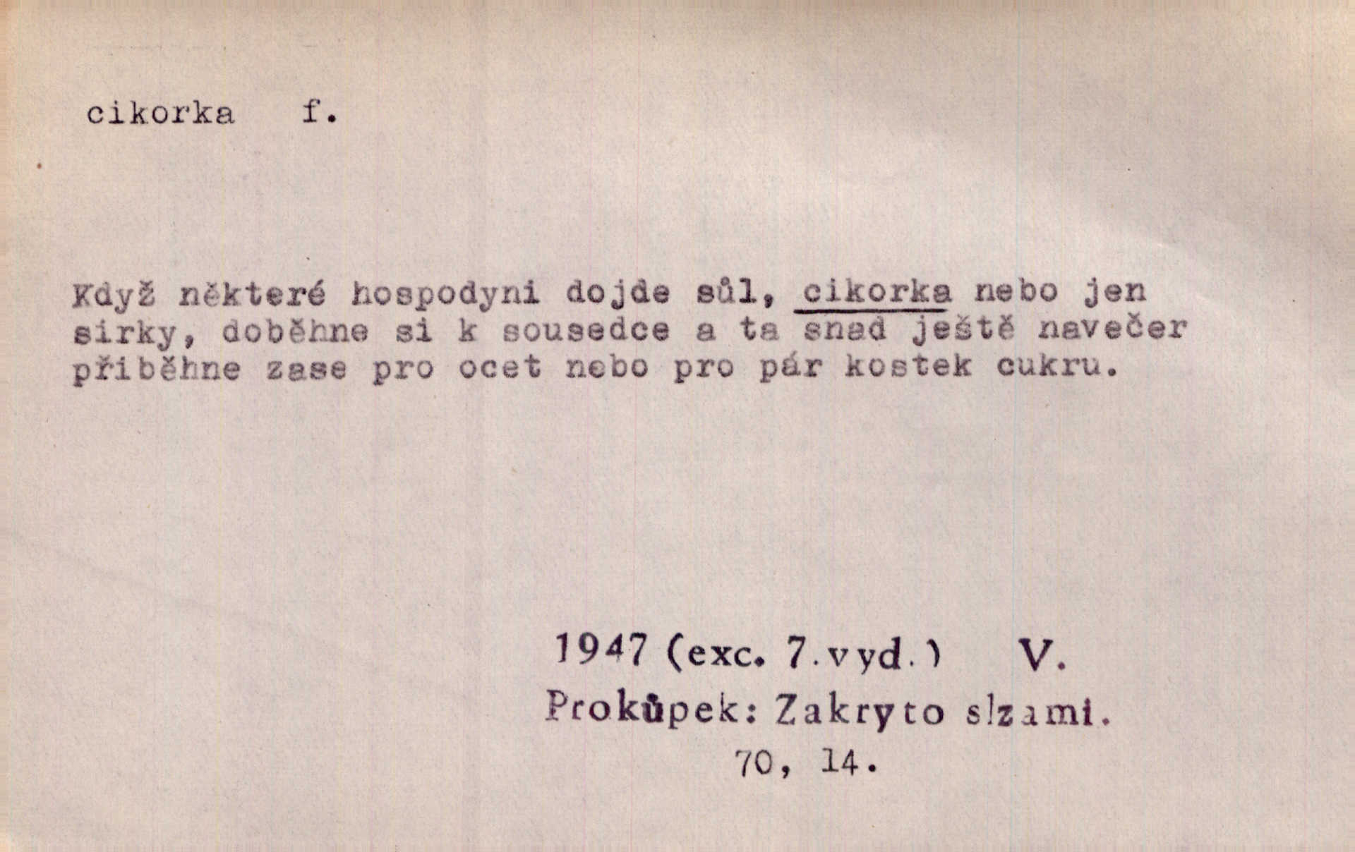 - cikorka, -y f. ob. cikorie. Odměřovala na ráno kávu a cikorku. Šim. D Lid. čekanka. Letos tam nasel žito, na jeden [kus pole] pšenici. Cikorku a oves mají na protější straně vesnice. Rudlová.