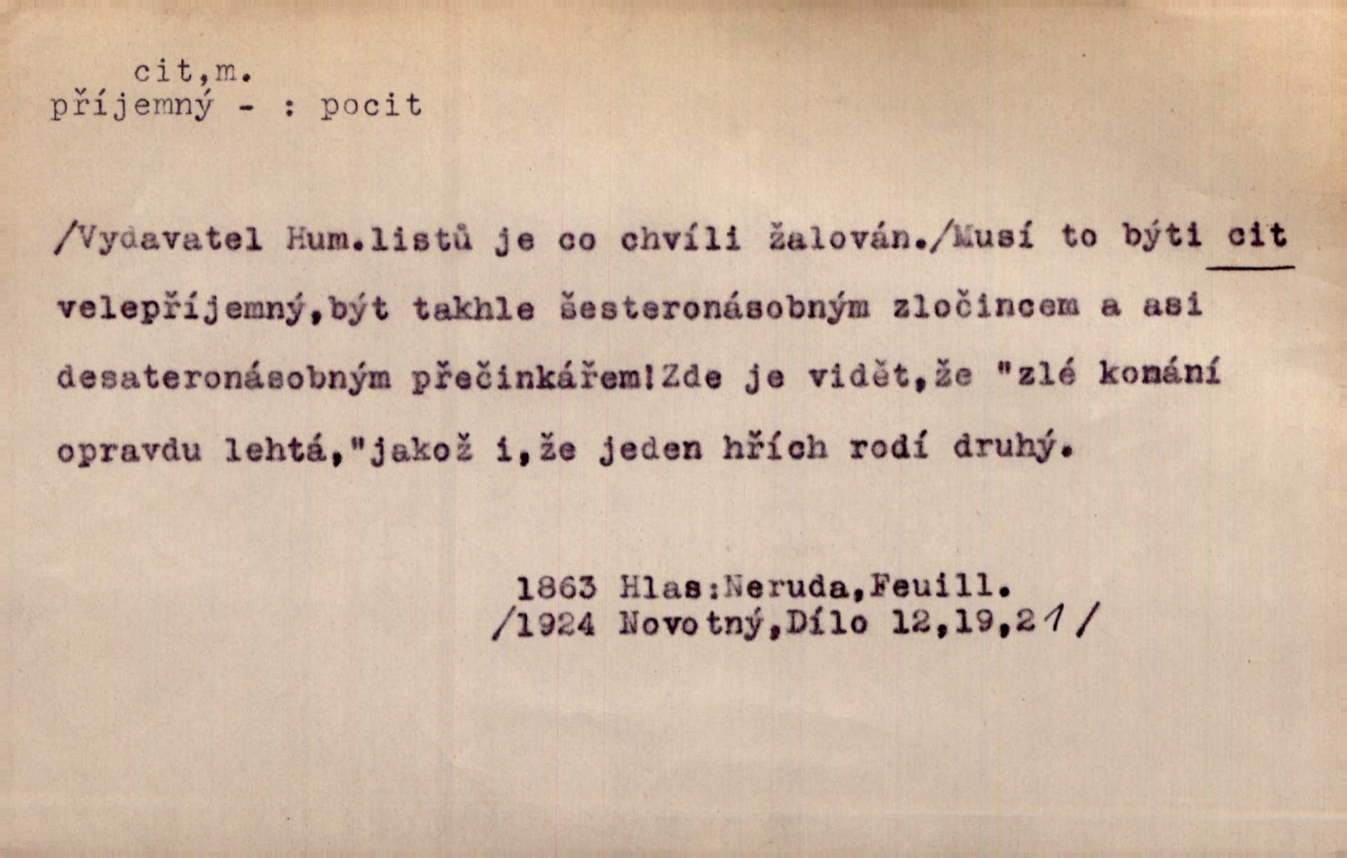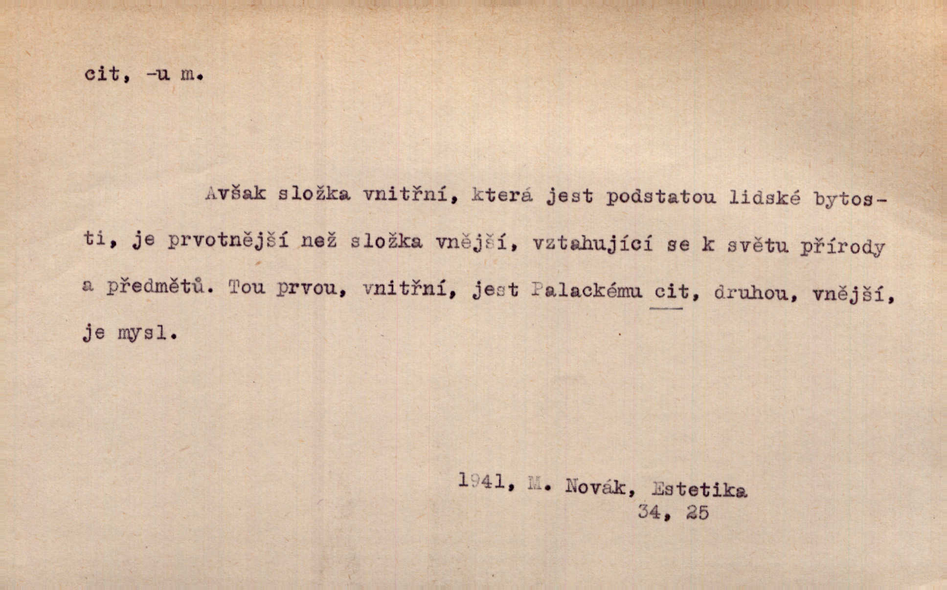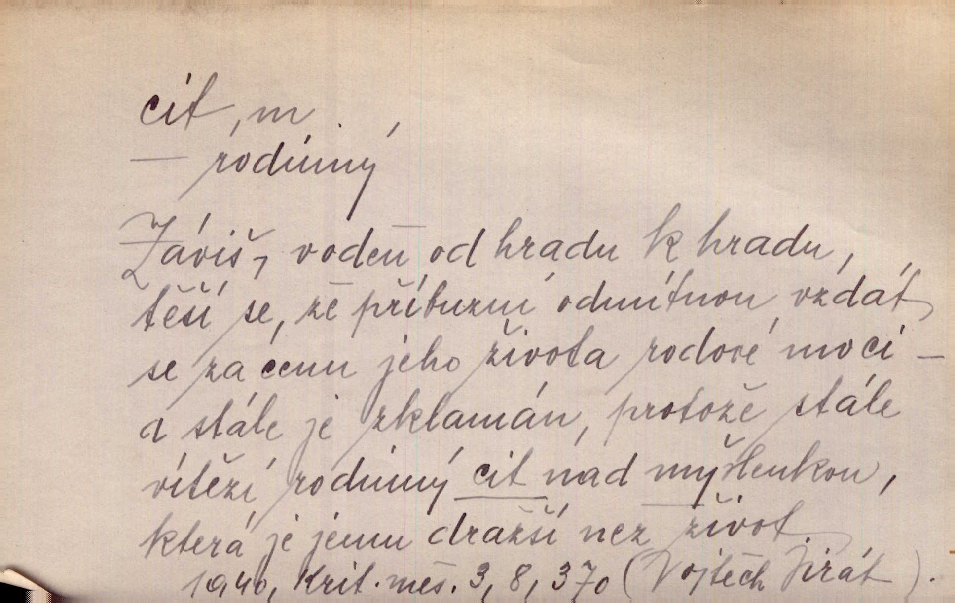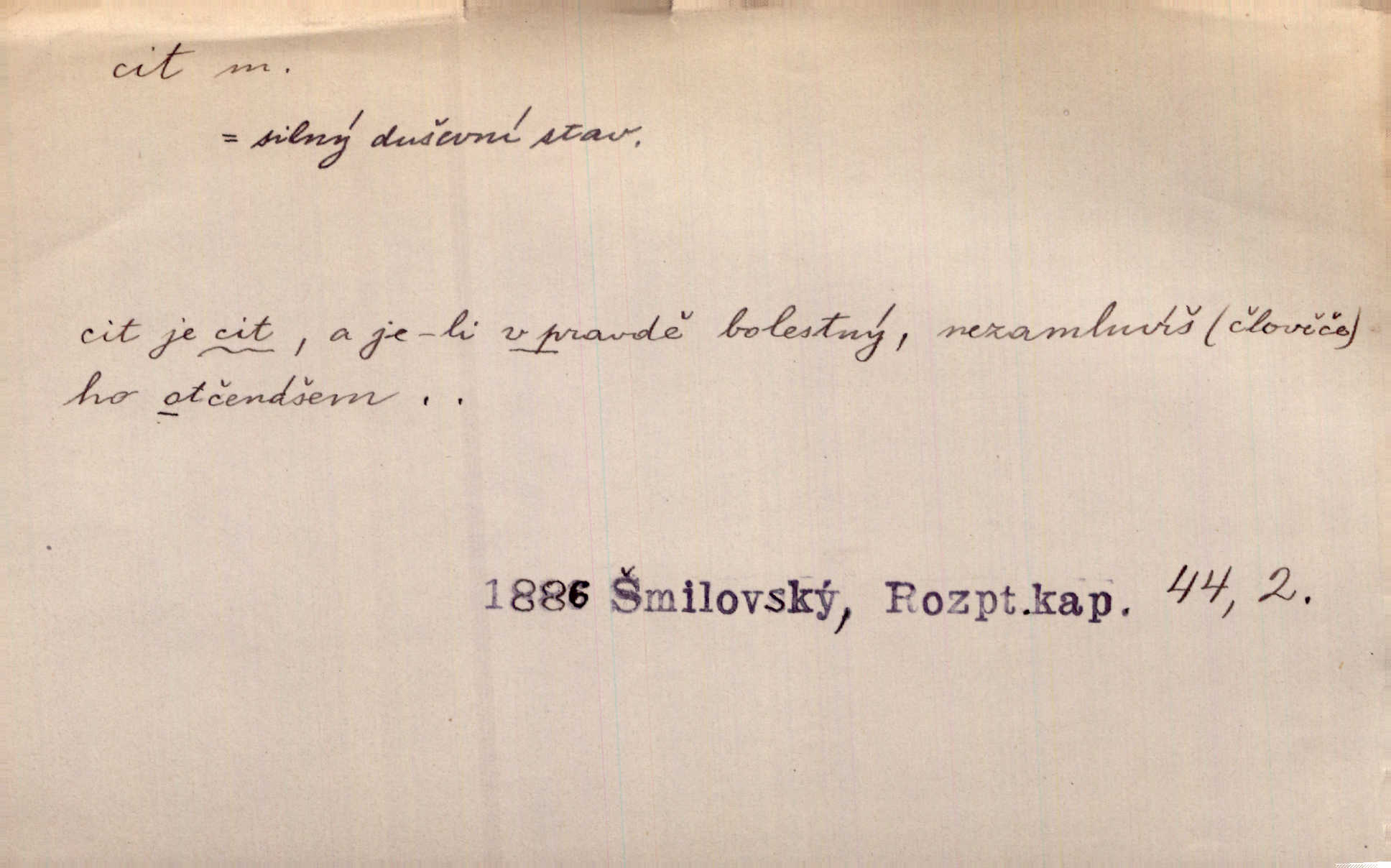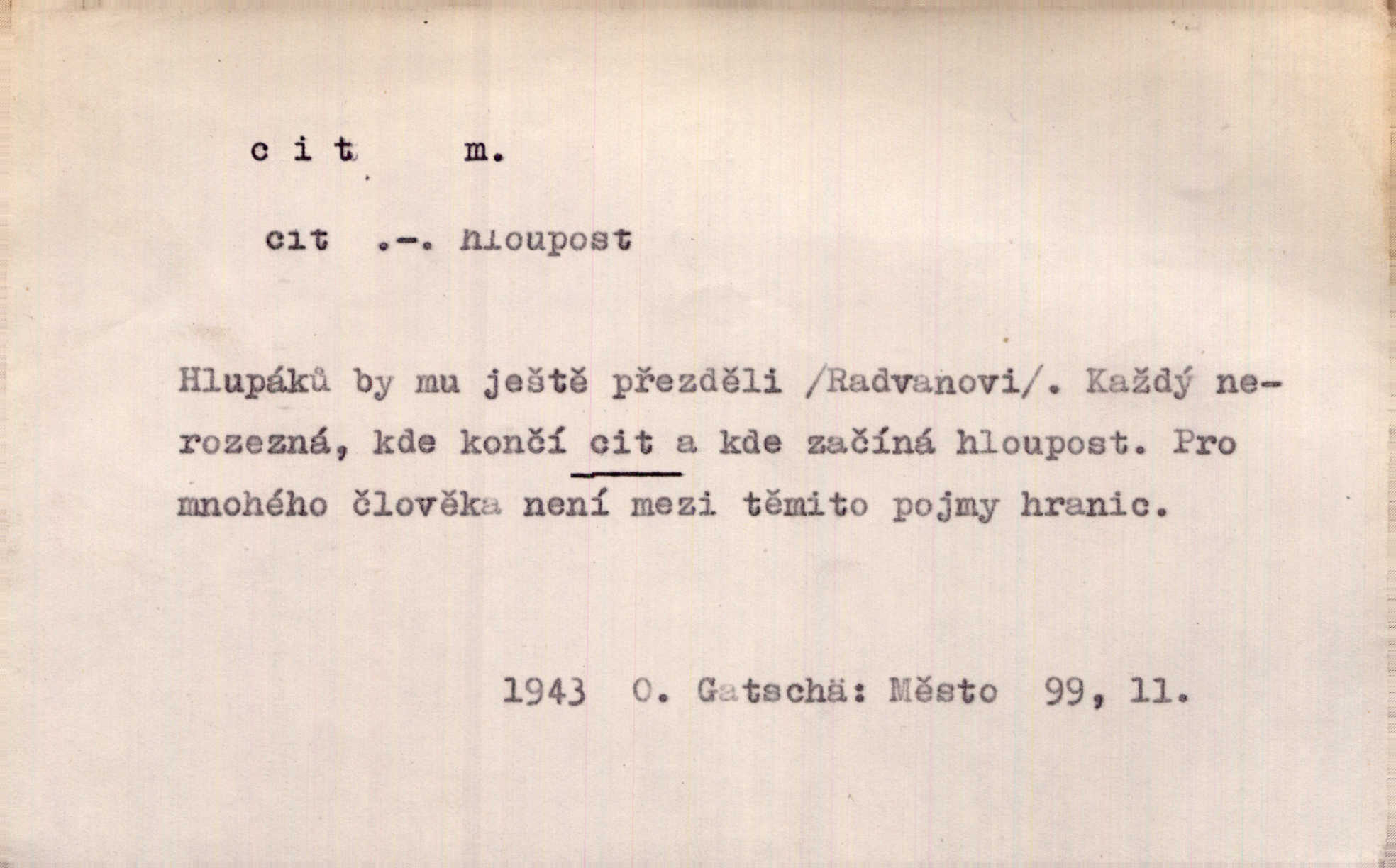- cit, -u m. stránka duševního dění, při níž převládá libost n. nelibost. Mladou svou ženu dosud stejně miloval, cit jeho k ní neslábl. Svět. Zpíval s takovým citem, až mu oči zvlhly. Zey. Jsou chvíle, kdy nás zchvátí cit zoufalého prázdna. Mach. Cit nutil ústa k vzlyku bolestnému. Mach. Vykládala s citem, každé slovo protahovala. Rais. D porozumění, pochopení, vnímavost. Kdo nemá cit se zvířaty, takový sedlák nemůže a nesmí chtít, aby jej měl Pán Bůh s ním. Baar. On by také musel být pro čistotu v bytě cit. Šim. Černohorci zachovali svěží cit pro vše dobré i ušlechtilé. Hol. D schopnost těla číti dojmy příjemné n. nepříjemné, zvl. hmatový smysl. Raněný netrpí bolestí, protože má všechny čivy citu umrtveny. Čap. Ch. Cit v prstech vynahrazuje slepci zrak. Něm.