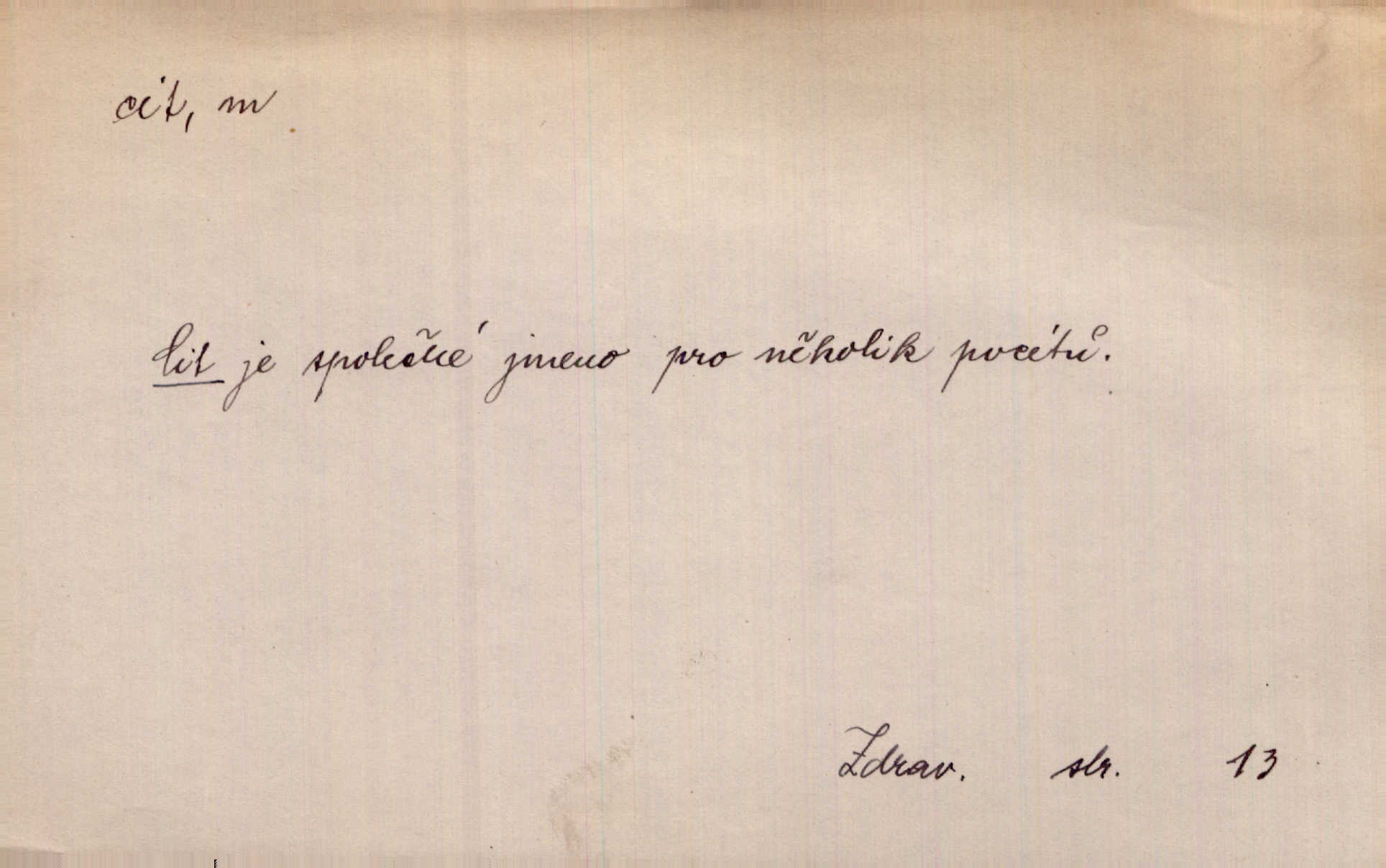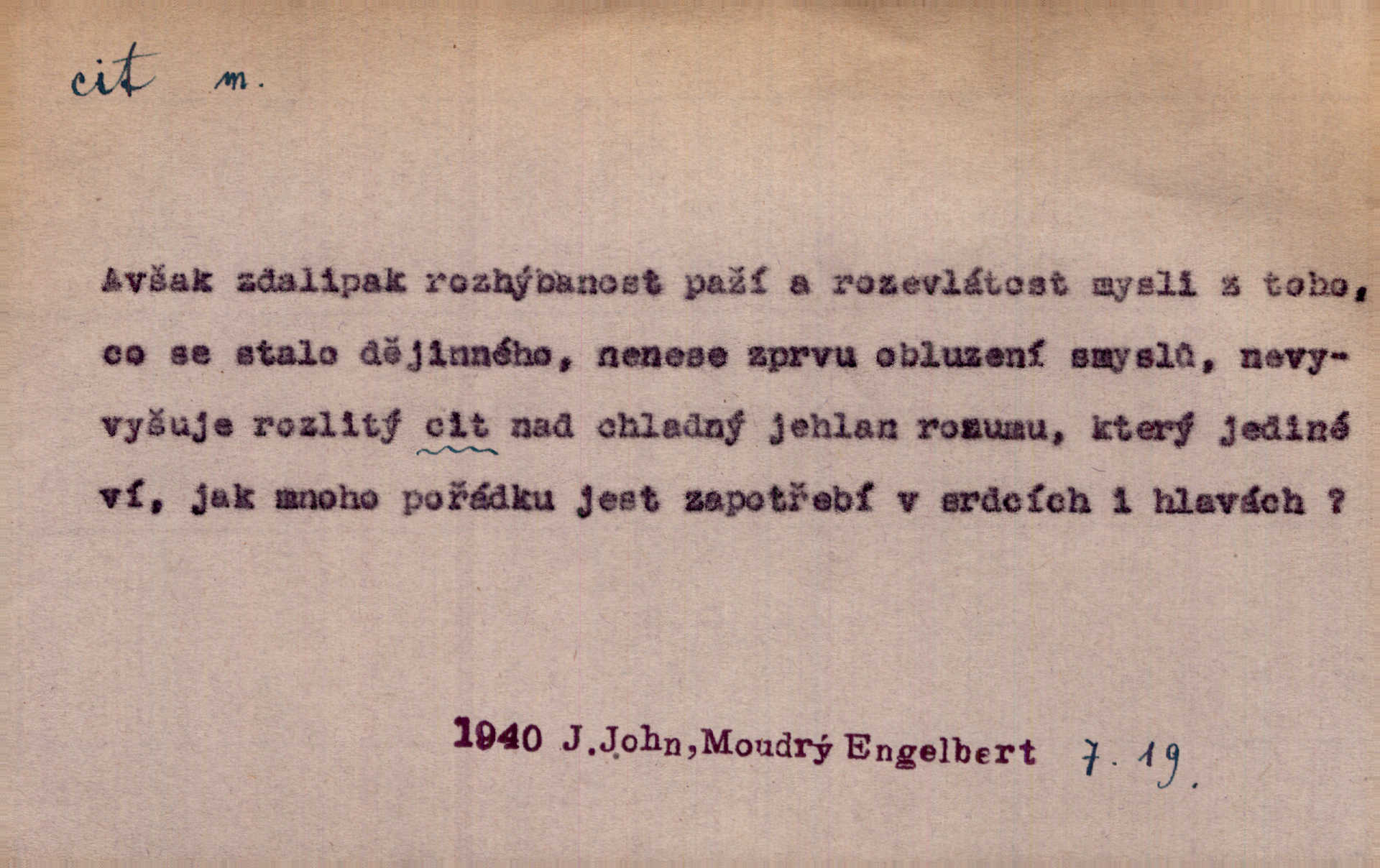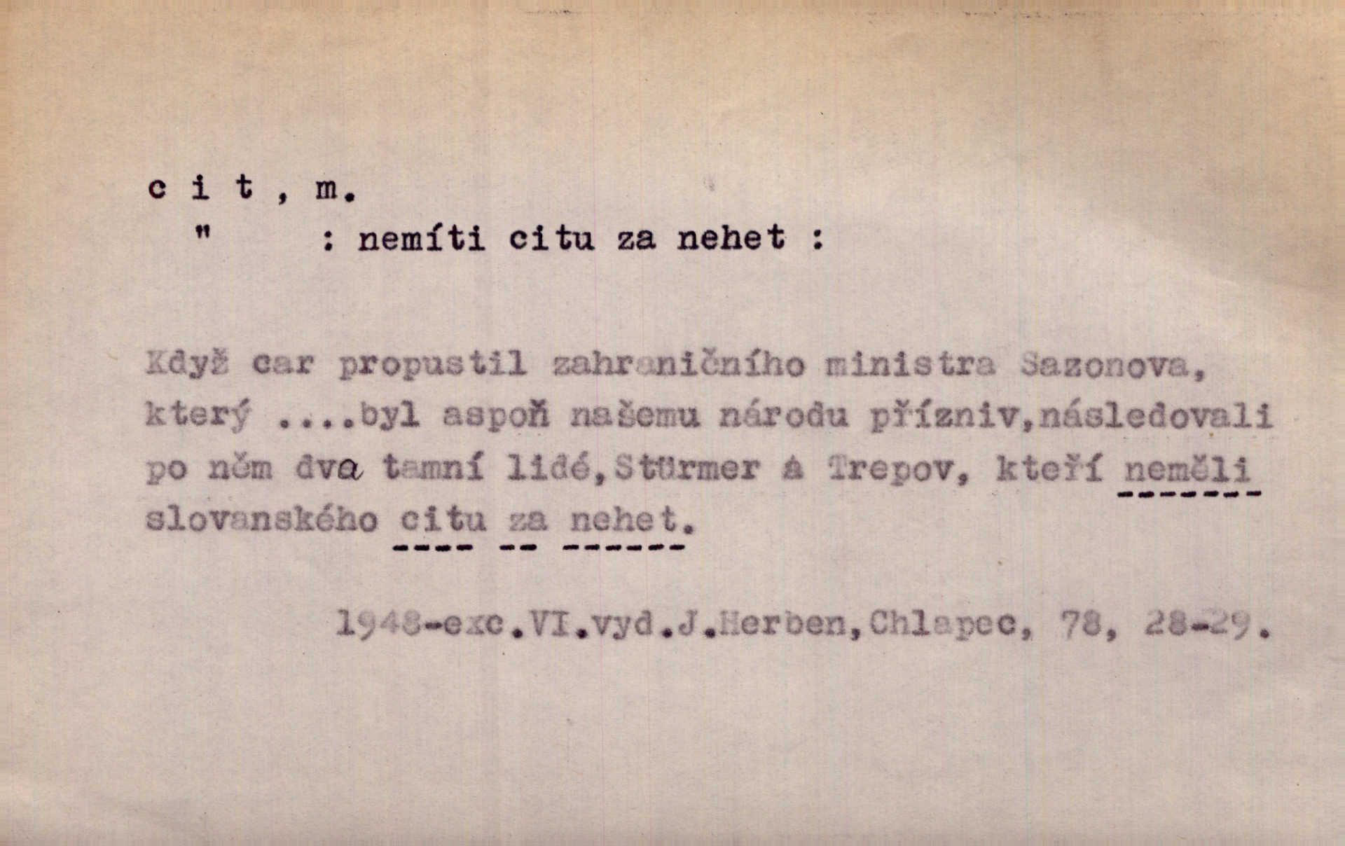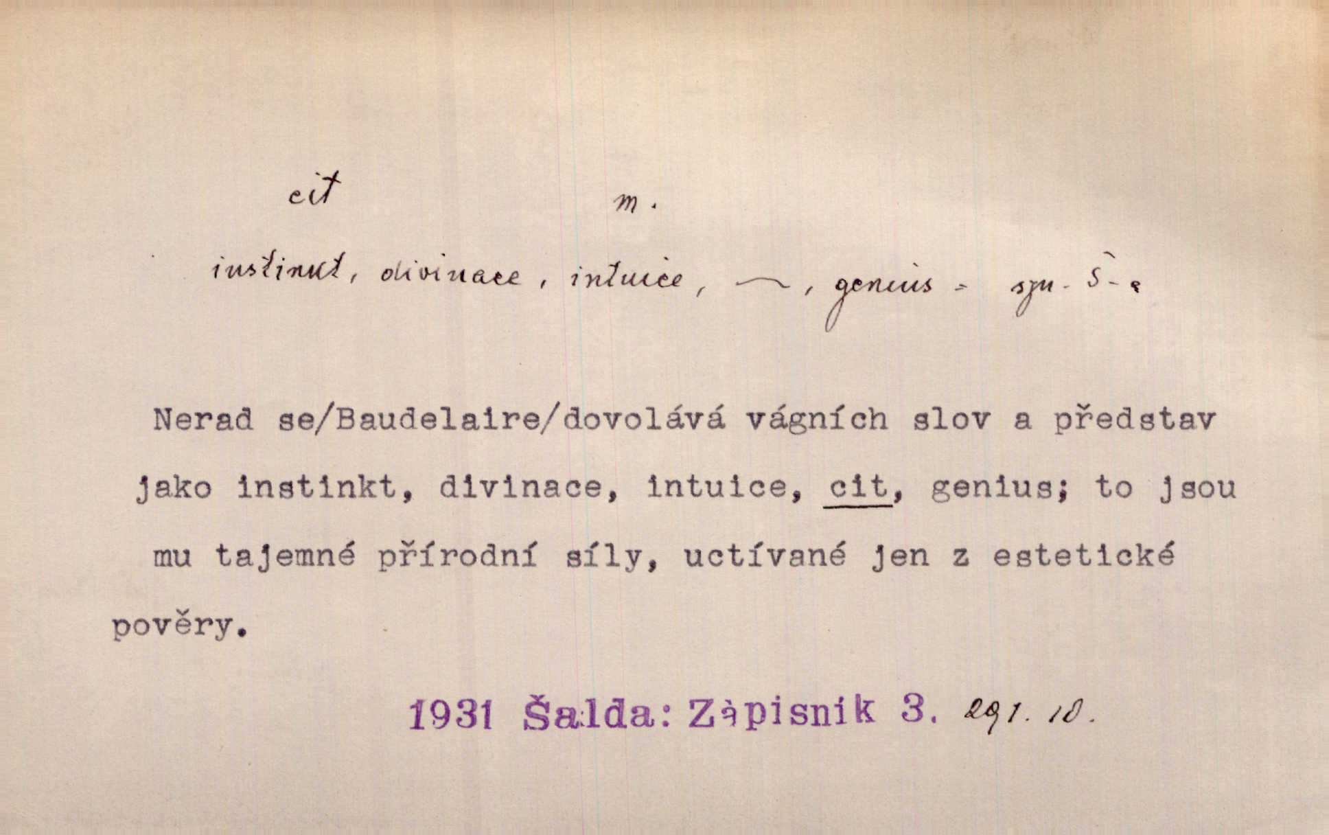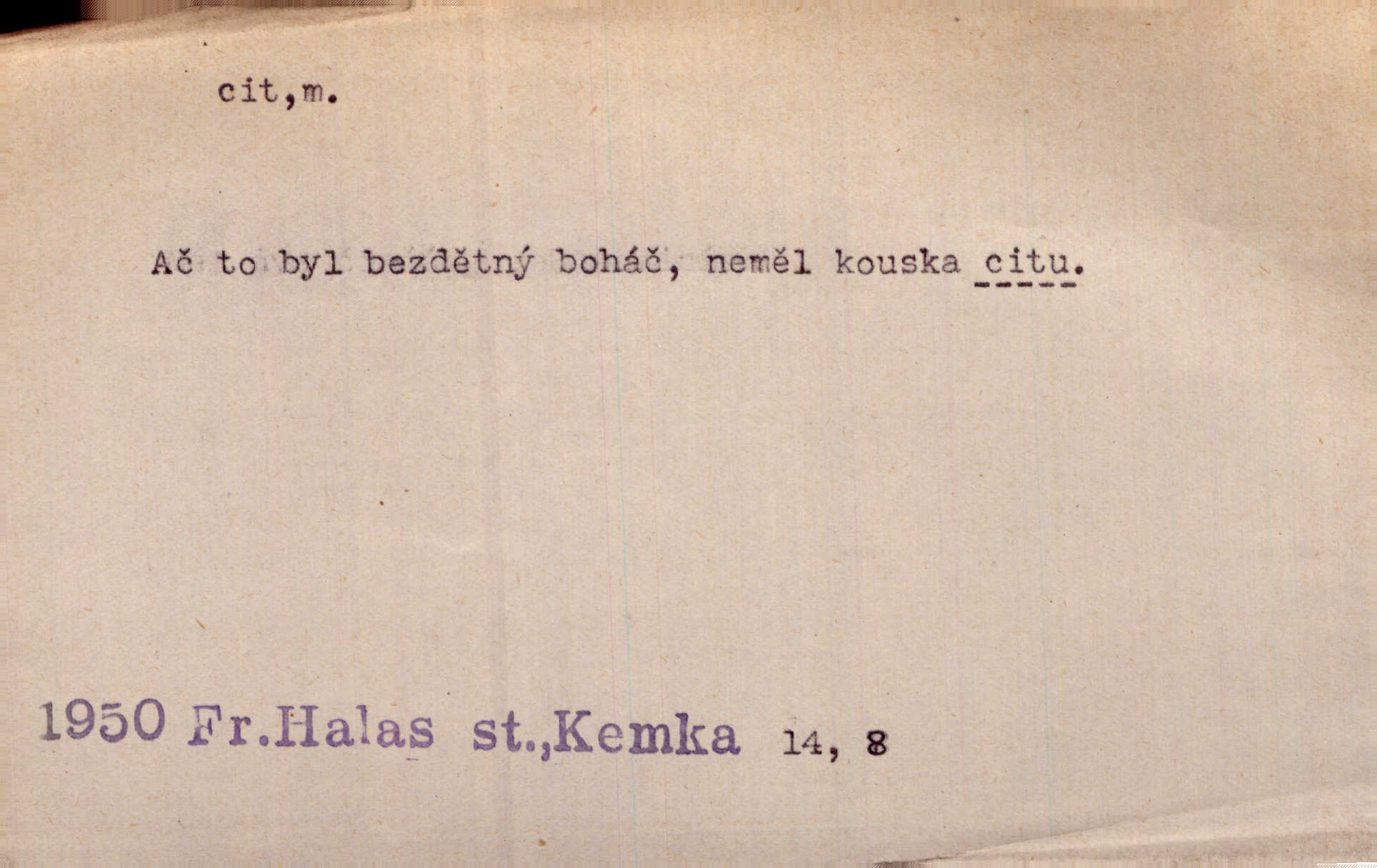- cit, -u m. stránka duševního dění, při níž převládá libost n. nelibost. Mladou svou ženu dosud stejně miloval, cit jeho k ní neslábl. Svět. Zpíval s takovým citem, až mu oči zvlhly. Zey. Jsou chvíle, kdy nás zchvátí cit zoufalého prázdna. Mach. Cit nutil ústa k vzlyku bolestnému. Mach. Vykládala s citem, každé slovo protahovala. Rais. D porozumění, pochopení, vnímavost. Kdo nemá cit se zvířaty, takový sedlák nemůže a nesmí chtít, aby jej měl Pán Bůh s ním. Baar. On by také musel být pro čistotu v bytě cit. Šim. Černohorci zachovali svěží cit pro vše dobré i ušlechtilé. Hol. D schopnost těla číti dojmy příjemné n. nepříjemné, zvl. hmatový smysl. Raněný netrpí bolestí, protože má všechny čivy citu umrtveny. Čap. Ch. Cit v prstech vynahrazuje slepci zrak. Něm.