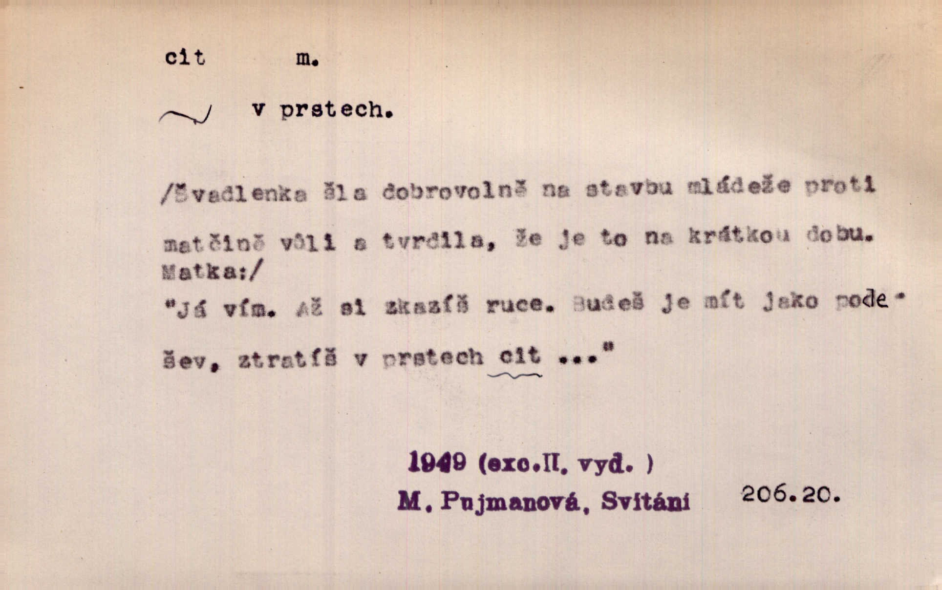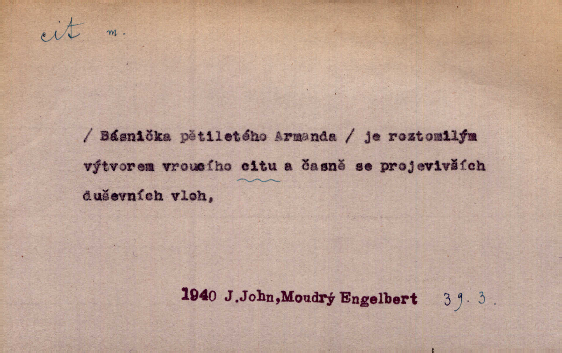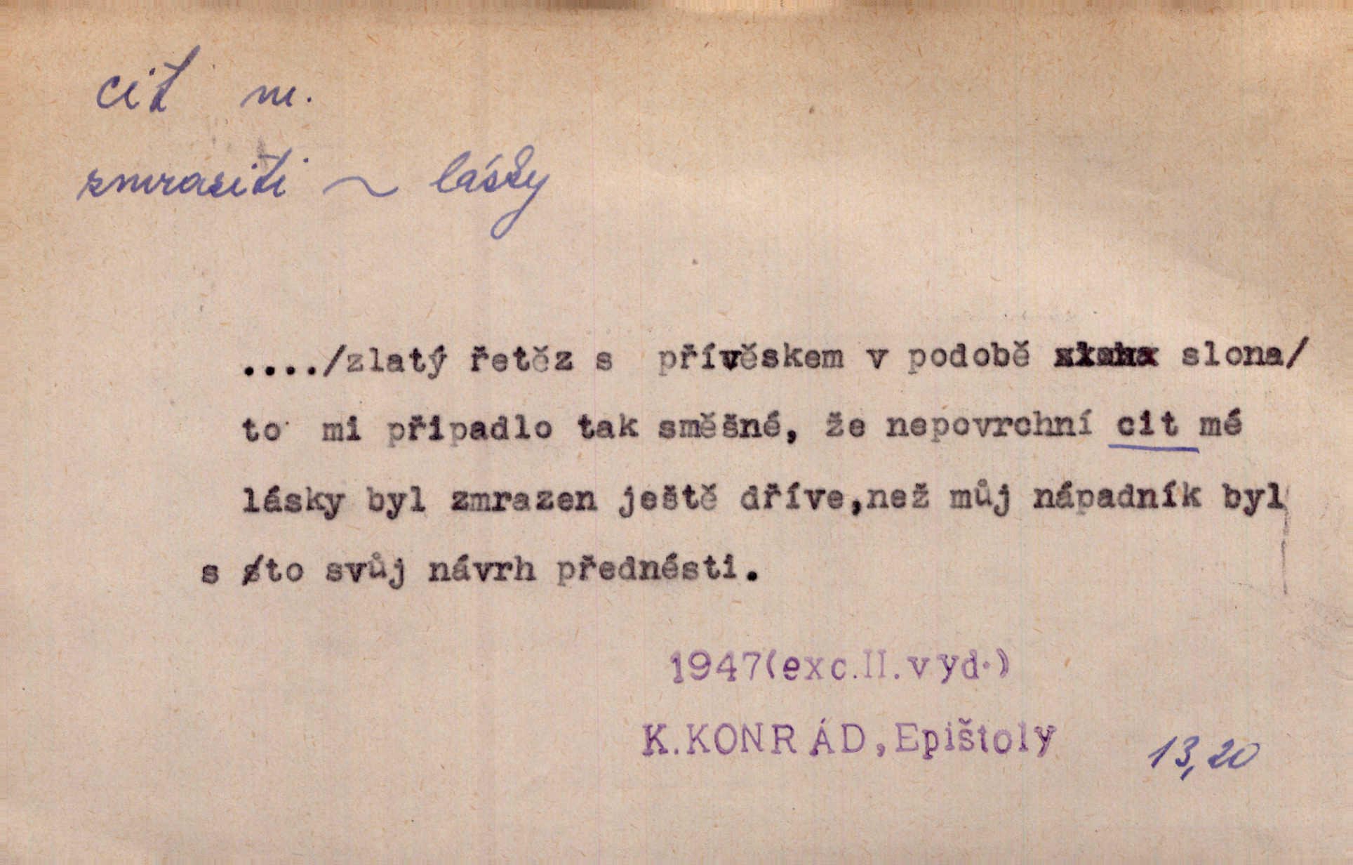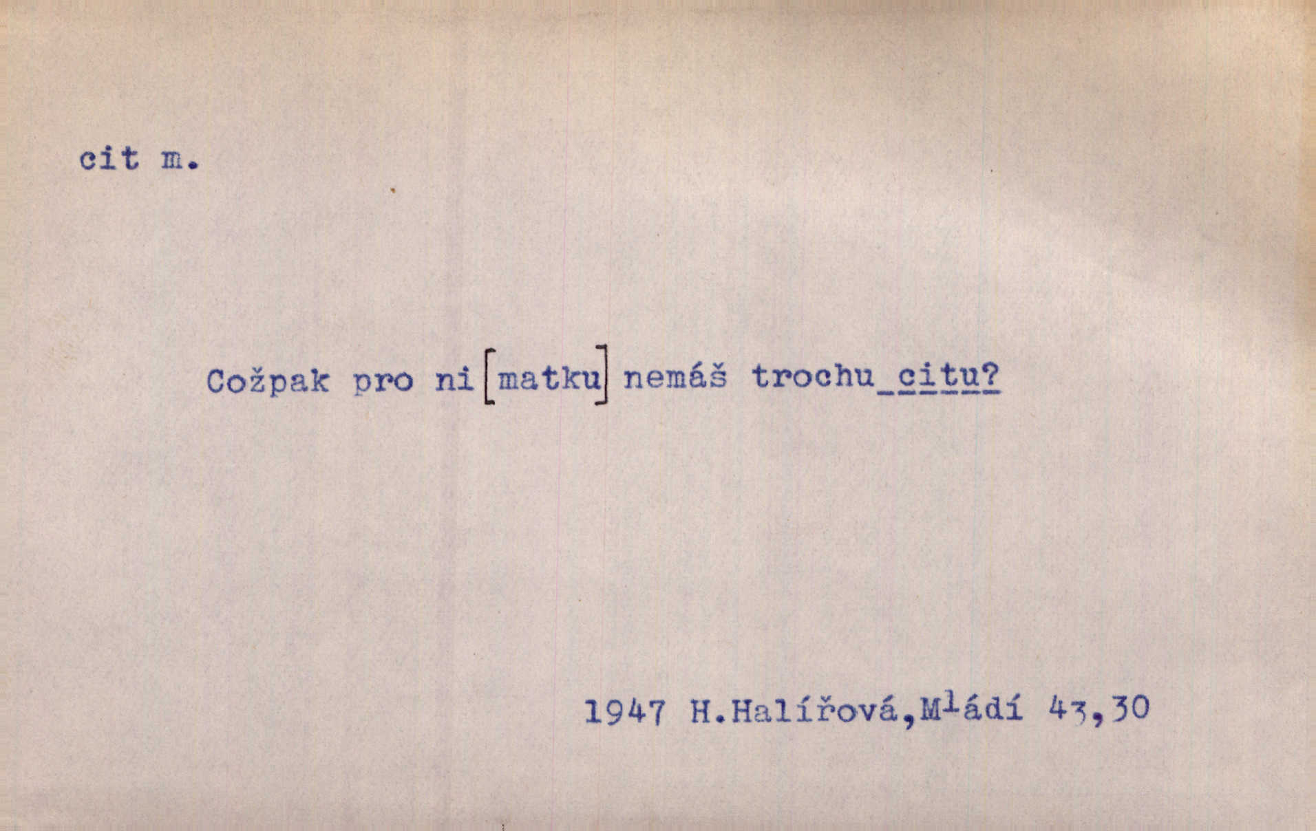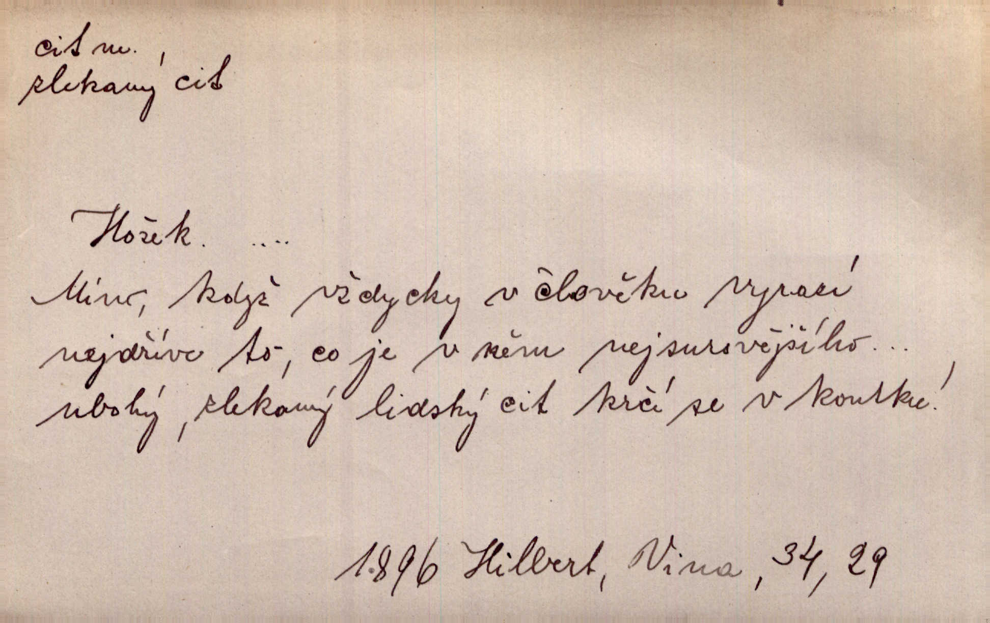 - cit, -u m. stránka duševního dění, při níž převládá libost n. nelibost. Mladou svou ženu dosud stejně miloval, cit jeho k ní neslábl. Svět. Zpíval s takovým citem, až mu oči zvlhly. Zey. Jsou chvíle, kdy nás zchvátí cit zoufalého prázdna. Mach. Cit nutil ústa k vzlyku bolestnému. Mach. Vykládala s citem, každé slovo protahovala. Rais. D porozumění, pochopení, vnímavost. Kdo nemá cit se zvířaty, takový sedlák nemůže a nesmí chtít, aby jej měl Pán Bůh s ním. Baar. On by také musel být pro čistotu v bytě cit. Šim. Černohorci zachovali svěží cit pro vše dobré i ušlechtilé. Hol. D schopnost těla číti dojmy příjemné n. nepříjemné, zvl. hmatový smysl. Raněný netrpí bolestí, protože má všechny čivy citu umrtveny. Čap. Ch. Cit v prstech vynahrazuje slepci zrak. Něm.
