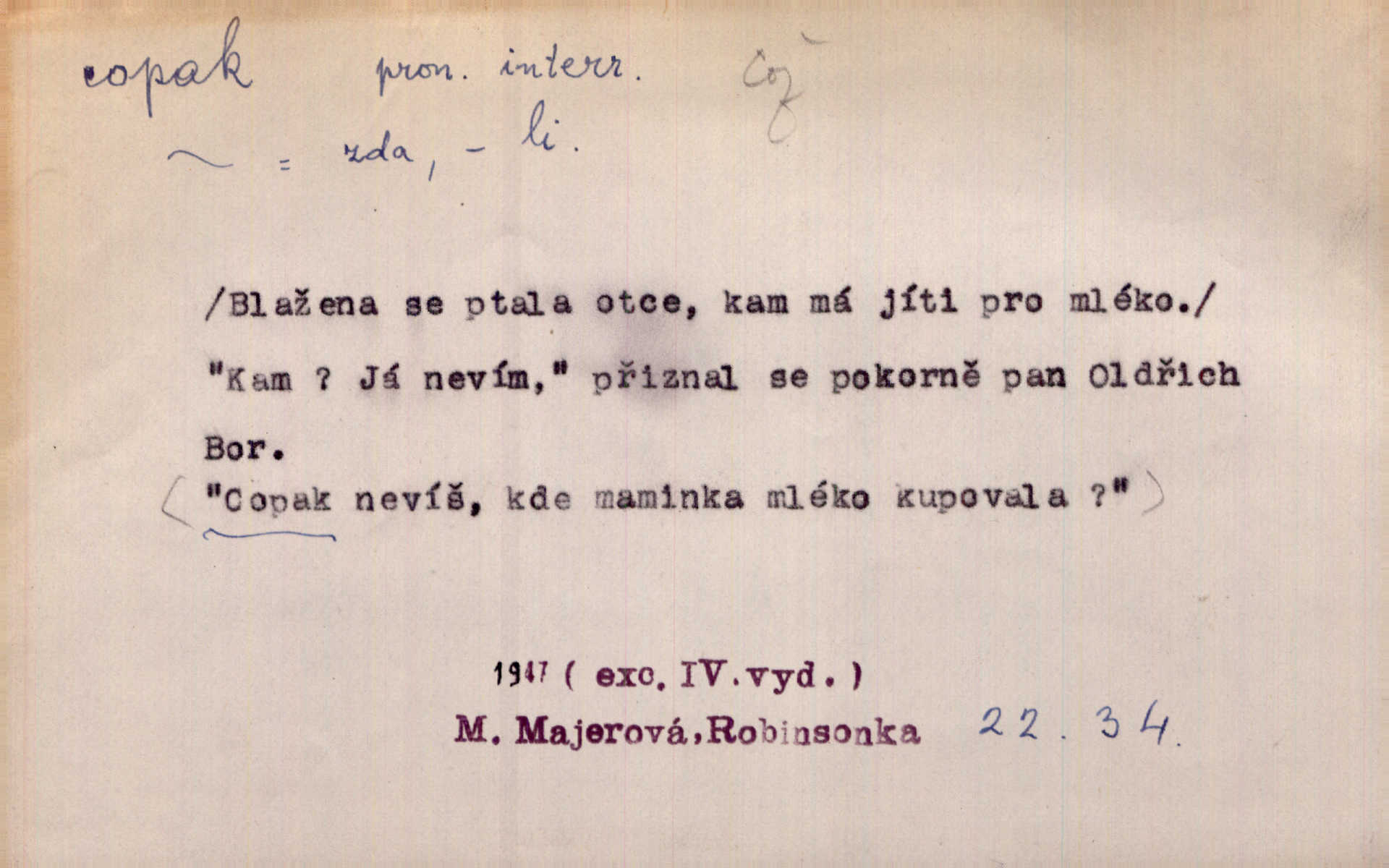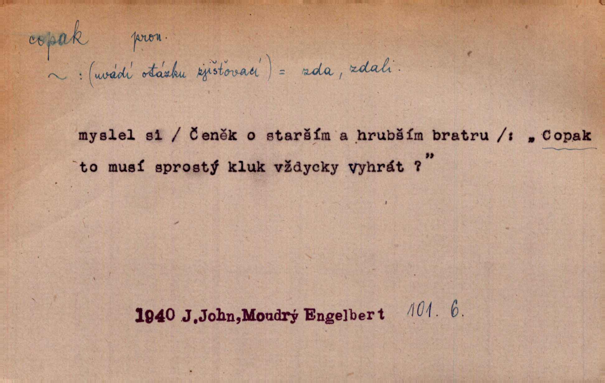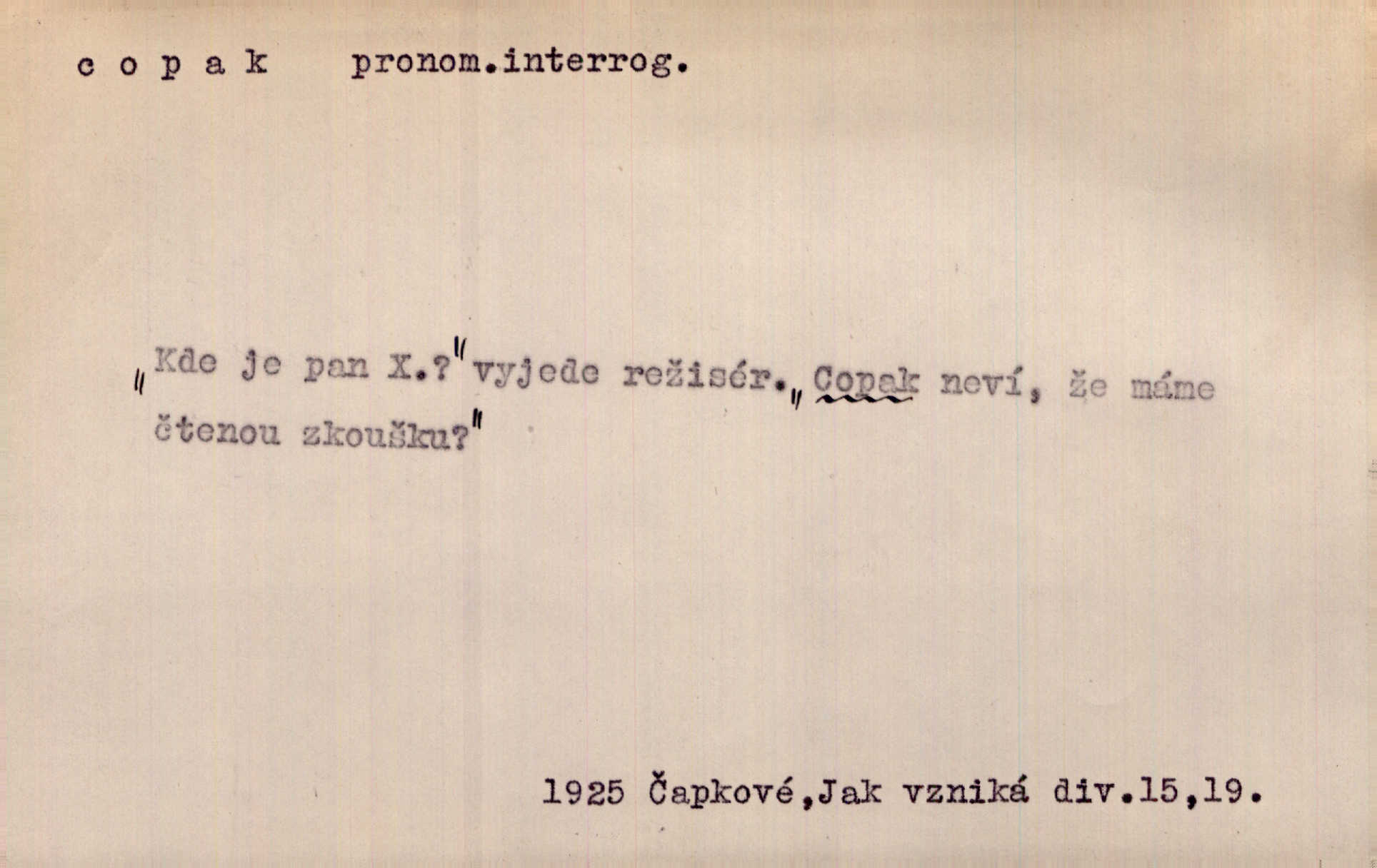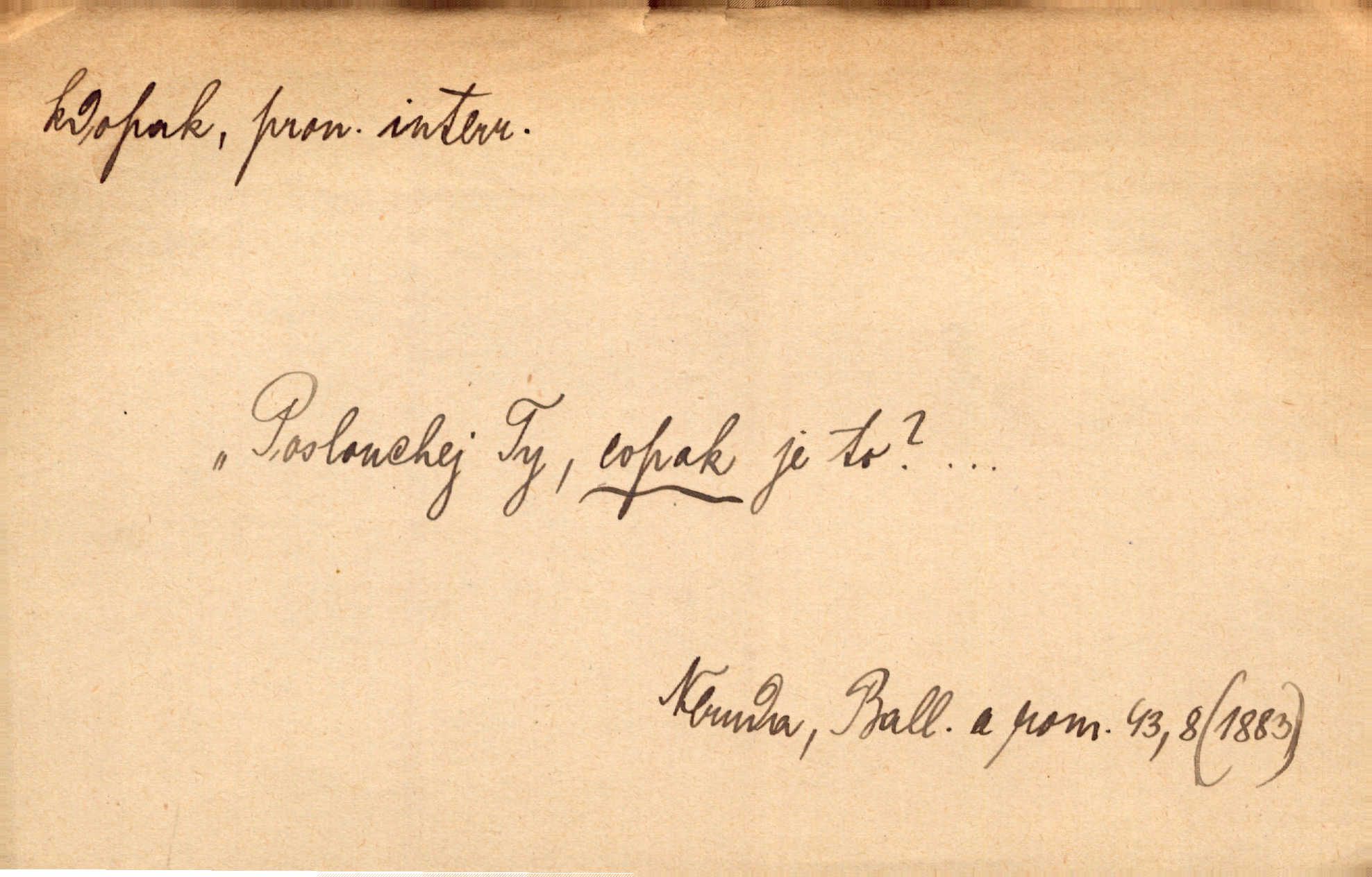 - copak zájm. a adv. táz. co, což. Copak ti je, mé zlaté dítě? Erb. Copak se v Písmě o takových věcech nedočítáme? Rais. D Copak za jaký pak. Copak jste to dnes vzal za pluviál? Baar. D při zvolání ovšem, arci. Copak náš milostpán, ten je jako čečetka. Baar.