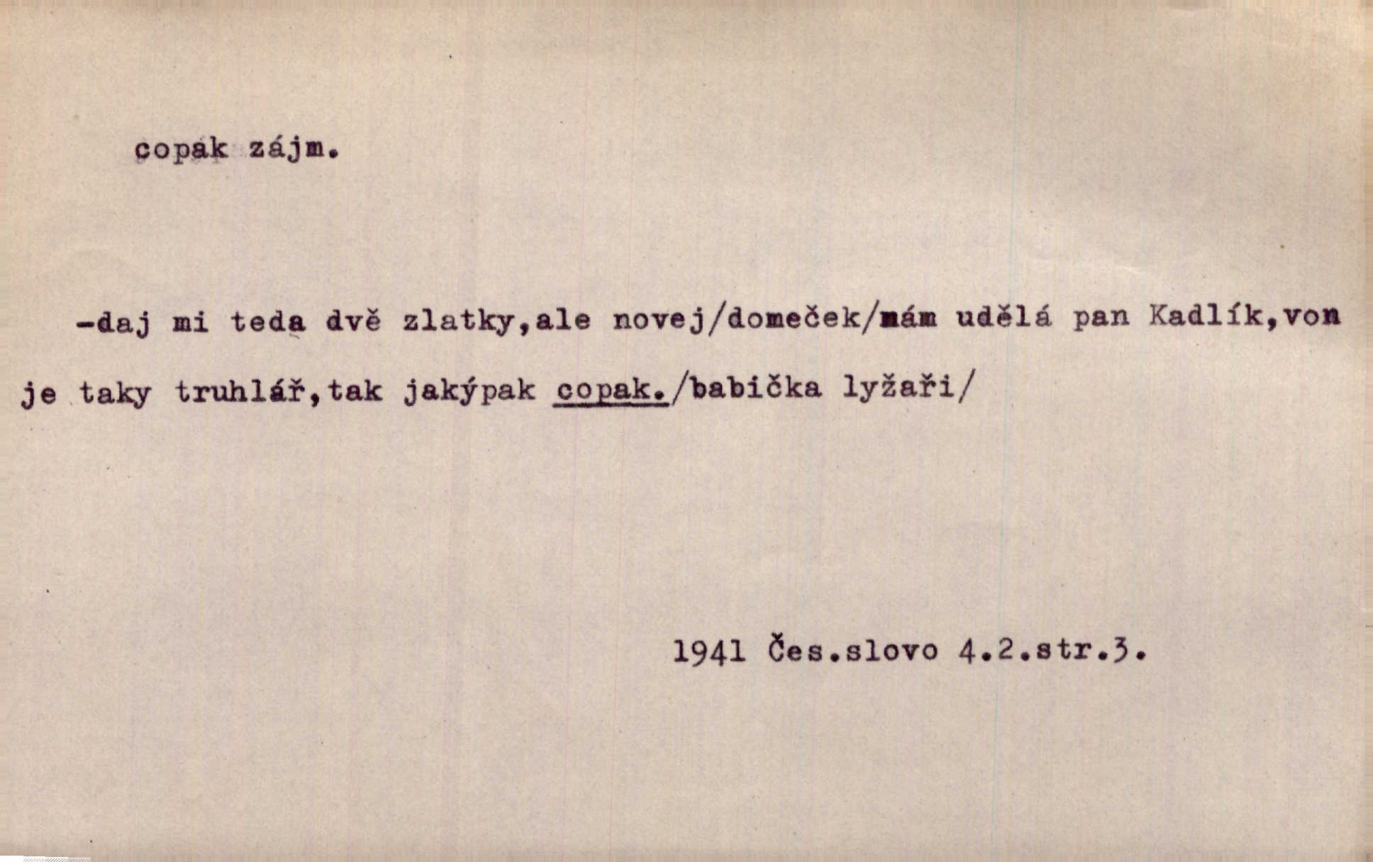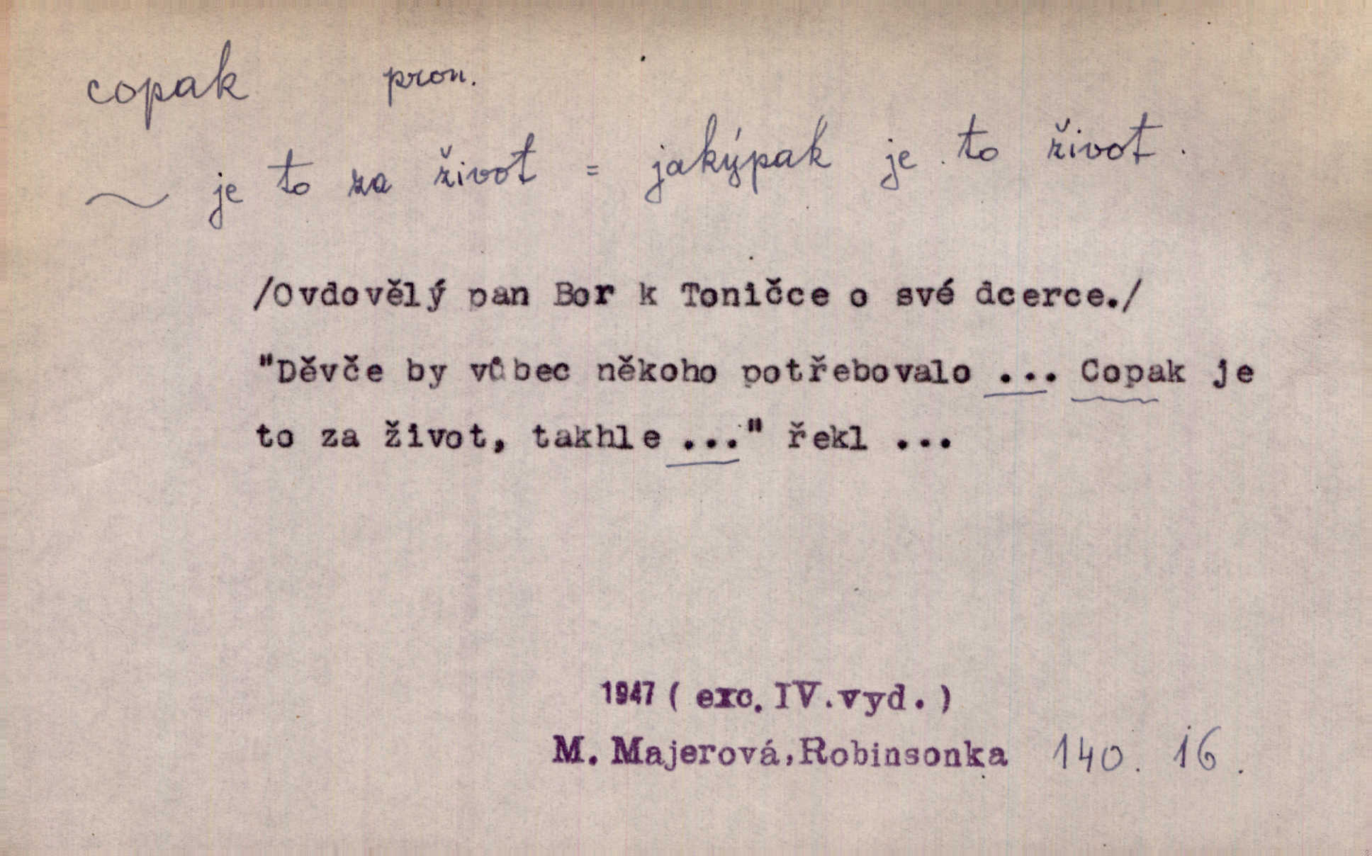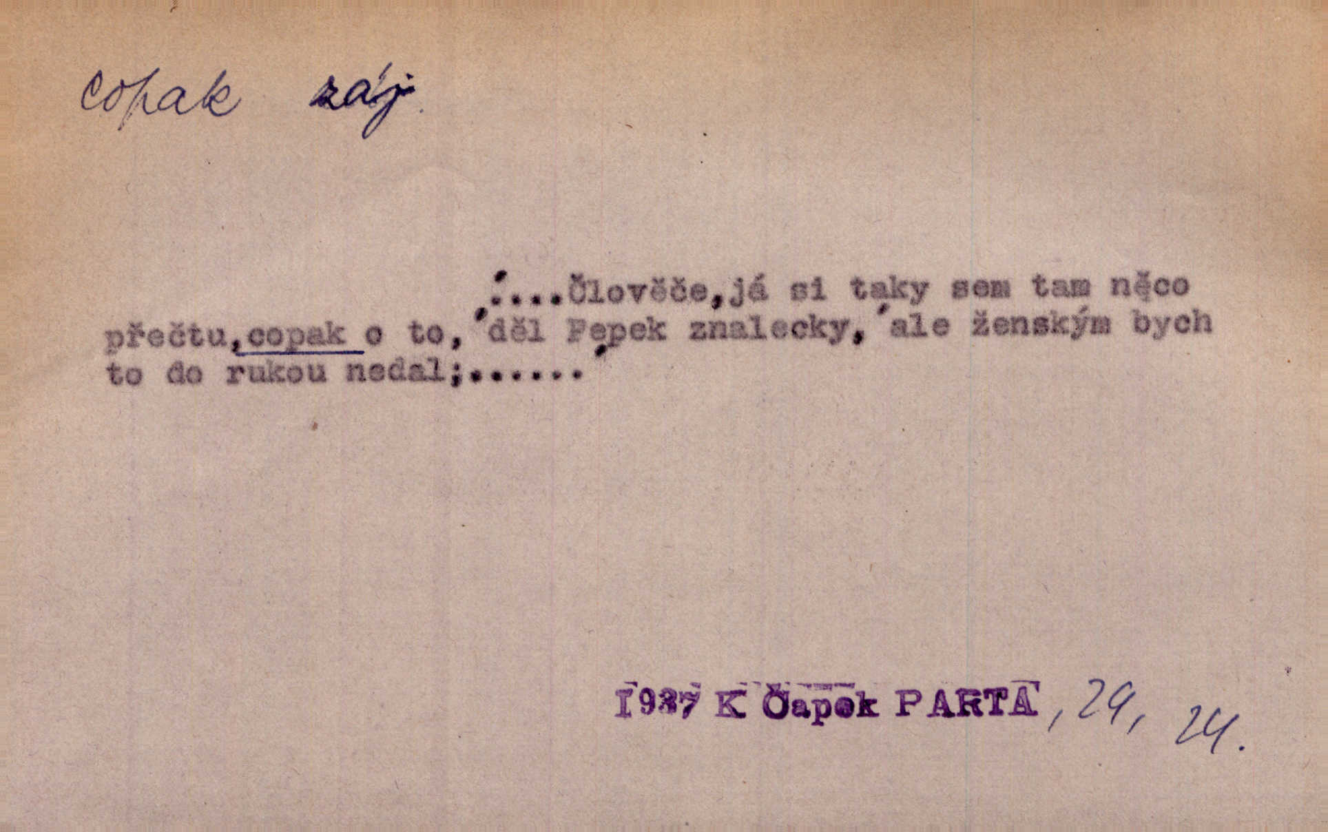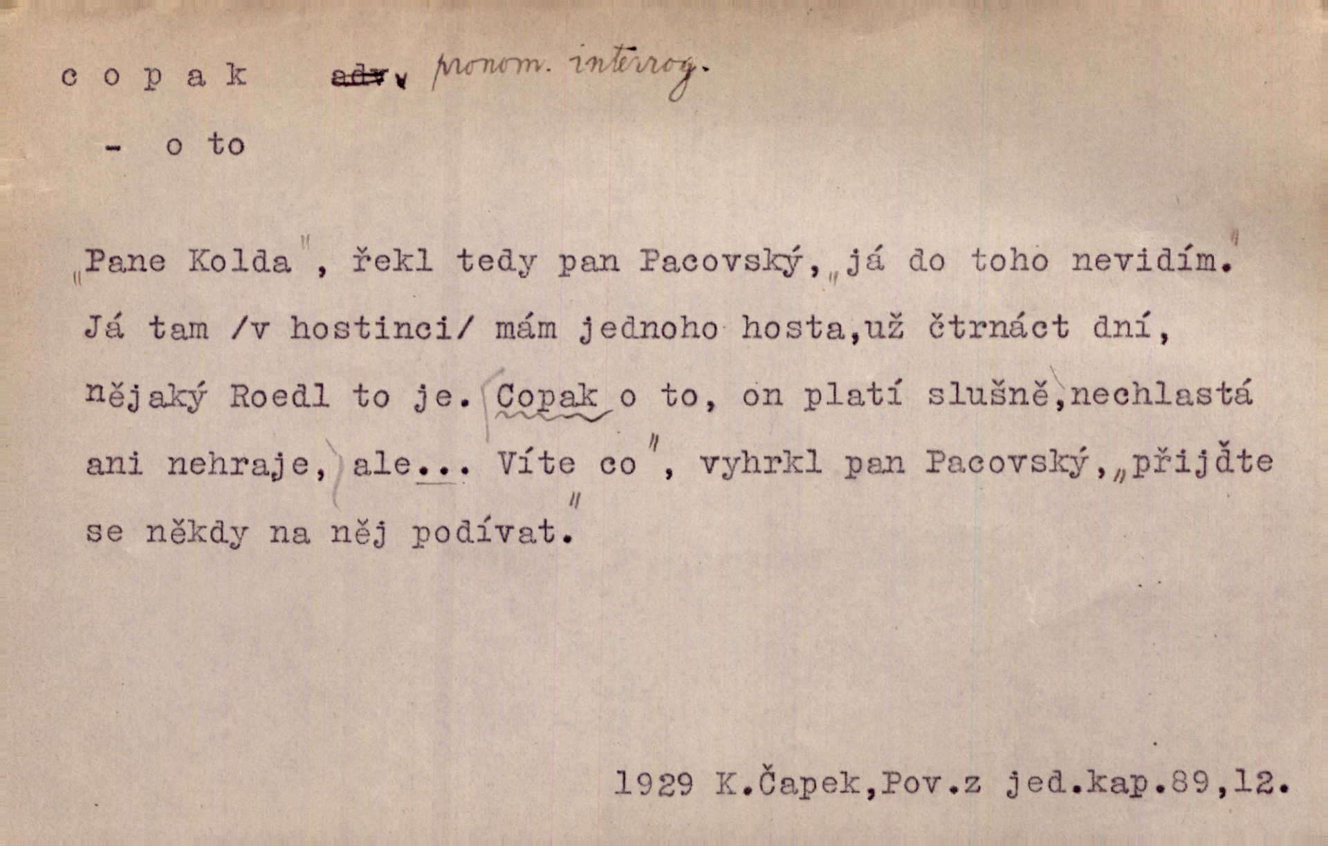 - copak zájm. a adv. táz. co, což. Copak ti je, mé zlaté dítě? Erb. Copak se v Písmě o takových věcech nedočítáme? Rais. D Copak za jaký pak. Copak jste to dnes vzal za pluviál? Baar. D při zvolání ovšem, arci. Copak náš milostpán, ten je jako čečetka. Baar.