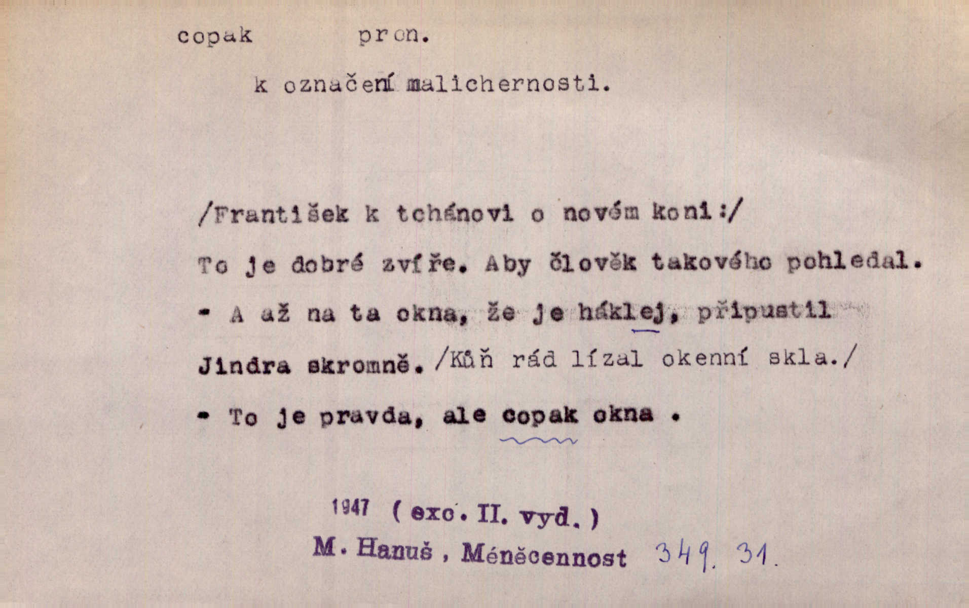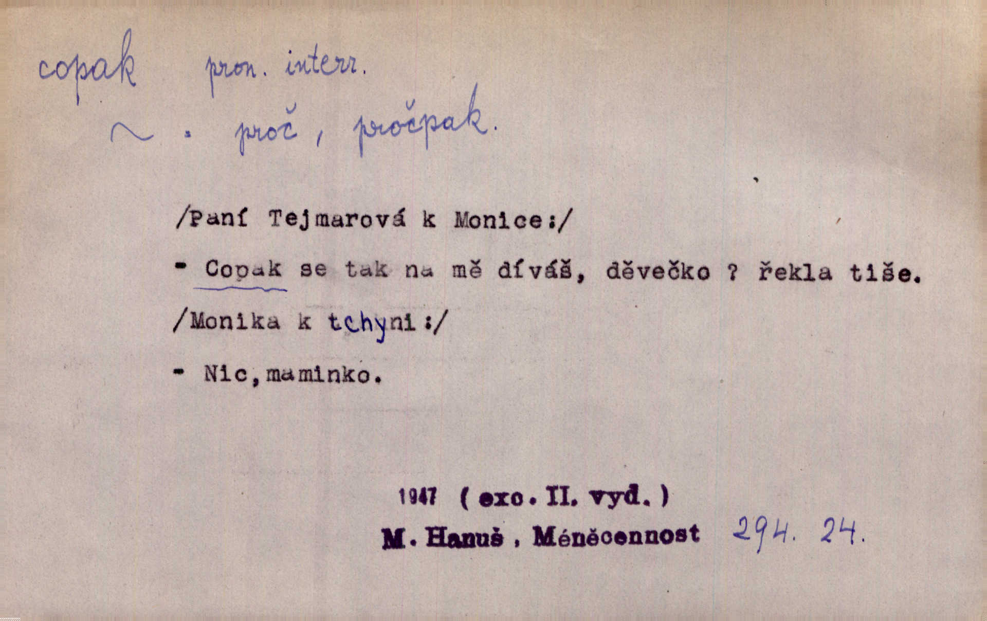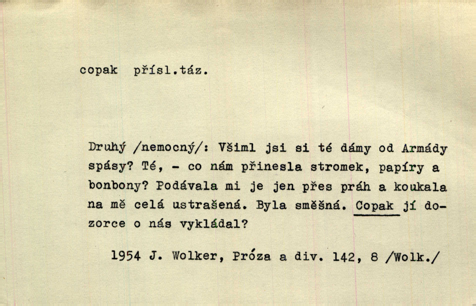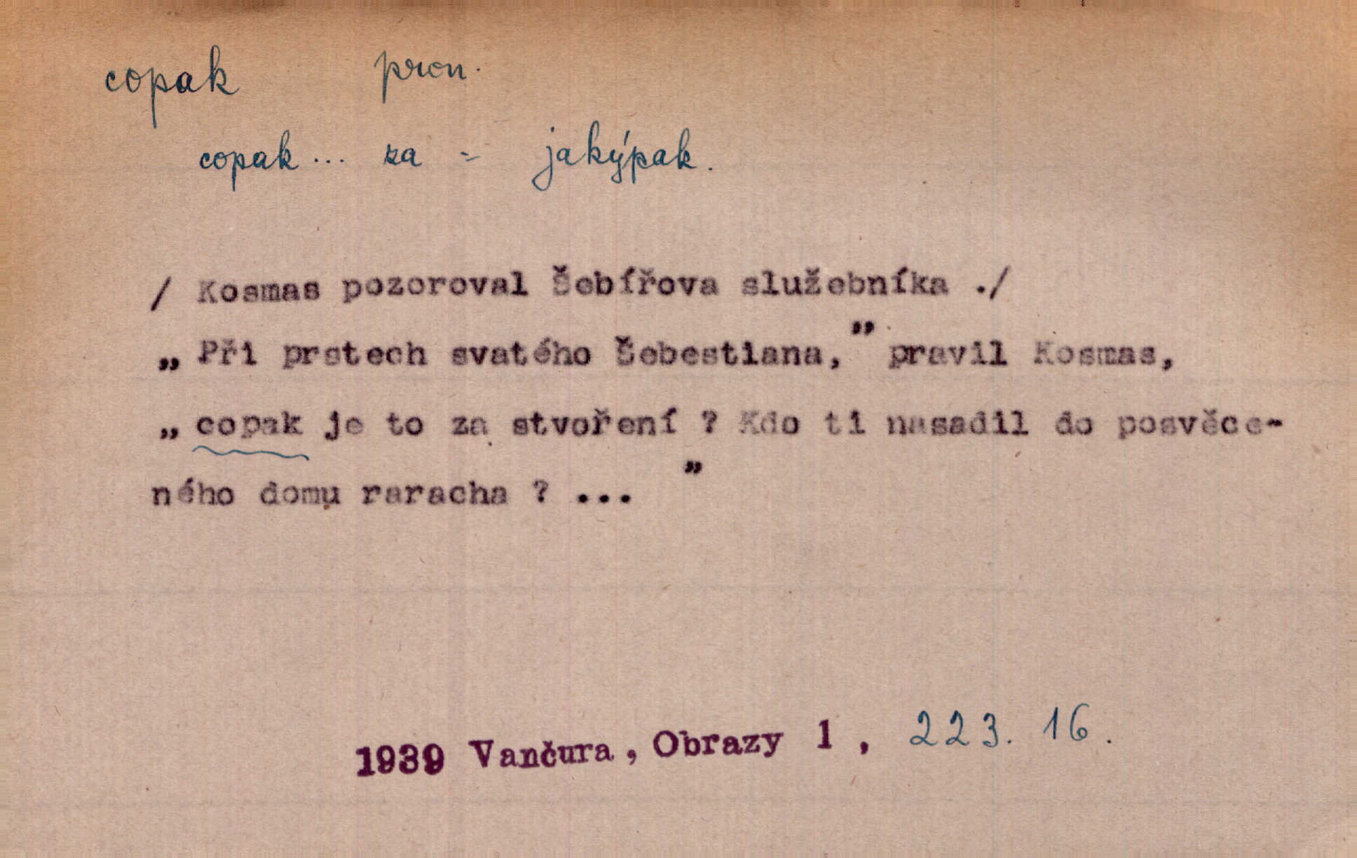 - copak zájm. a adv. táz. co, což. Copak ti je, mé zlaté dítě? Erb. Copak se v Písmě o takových věcech nedočítáme? Rais. D Copak za jaký pak. Copak jste to dnes vzal za pluviál? Baar. D při zvolání ovšem, arci. Copak náš milostpán, ten je jako čečetka. Baar.